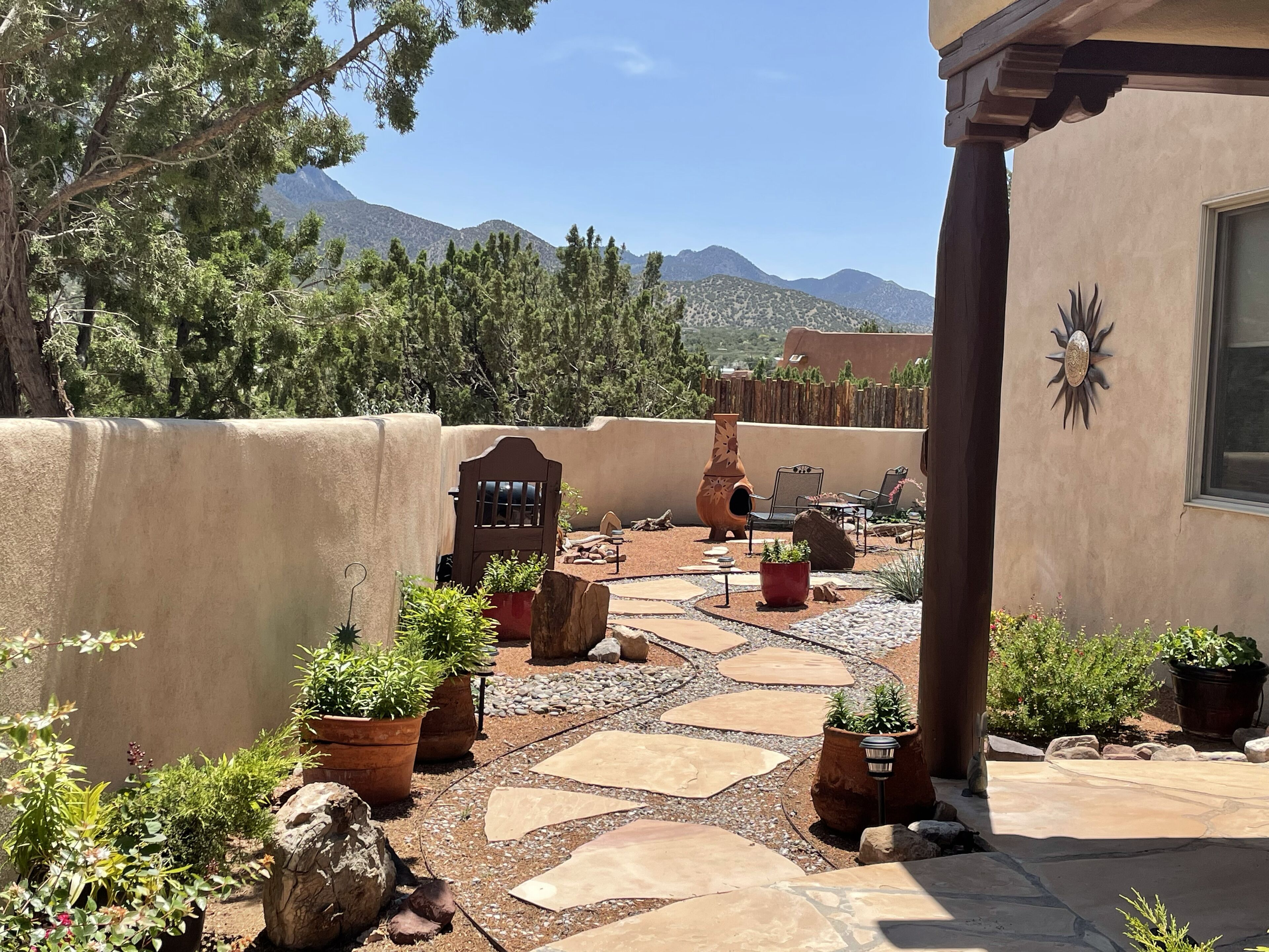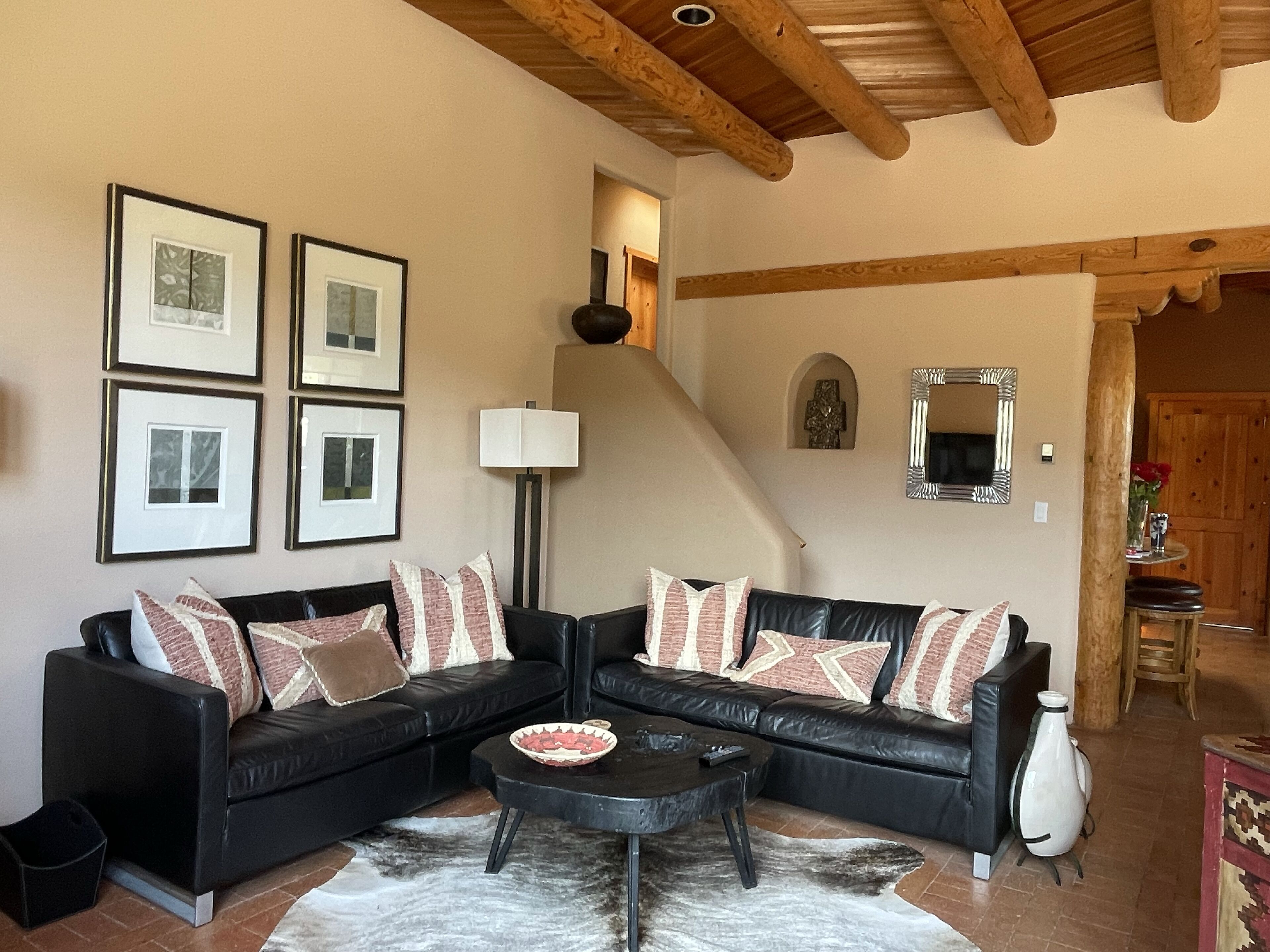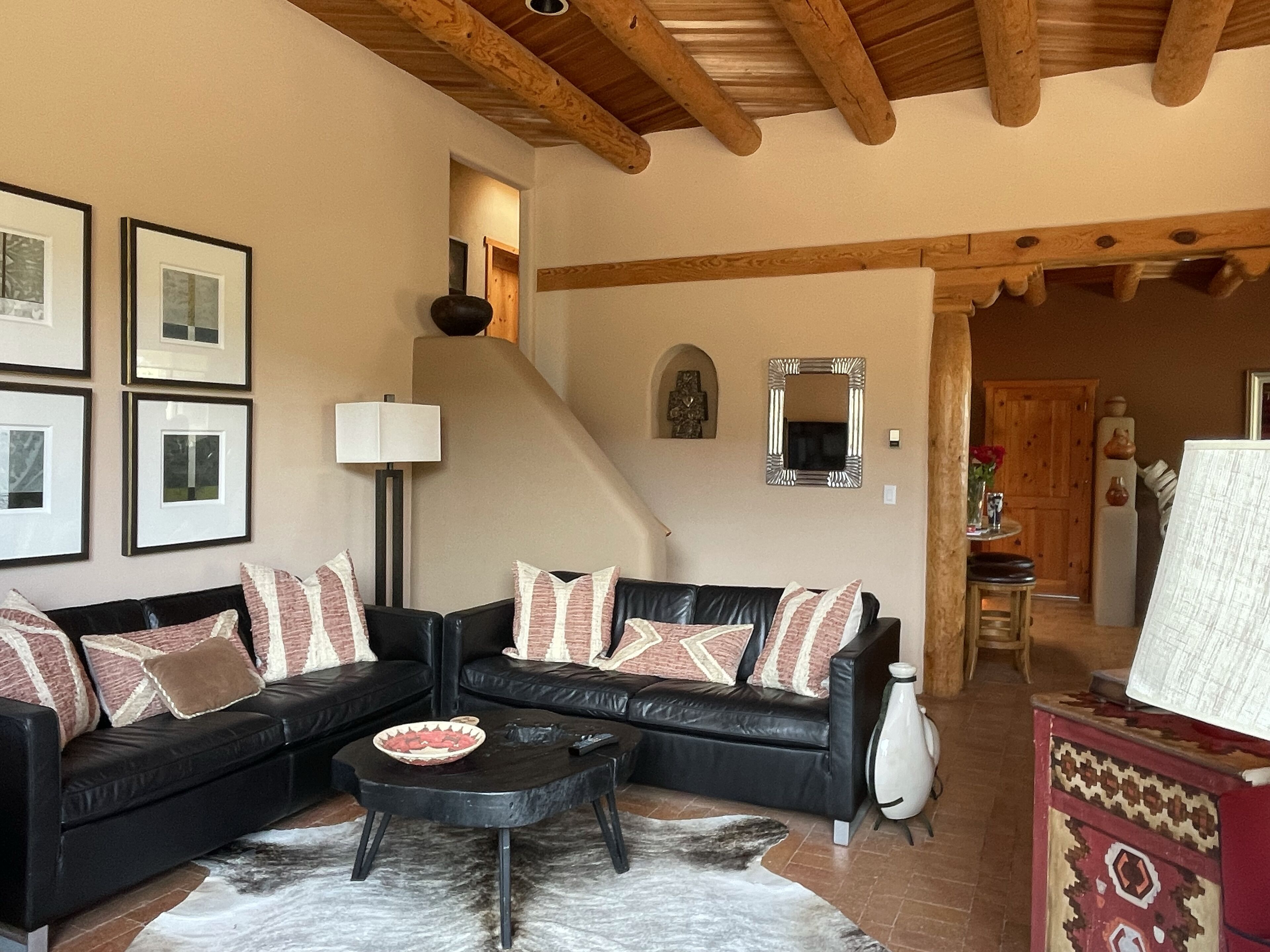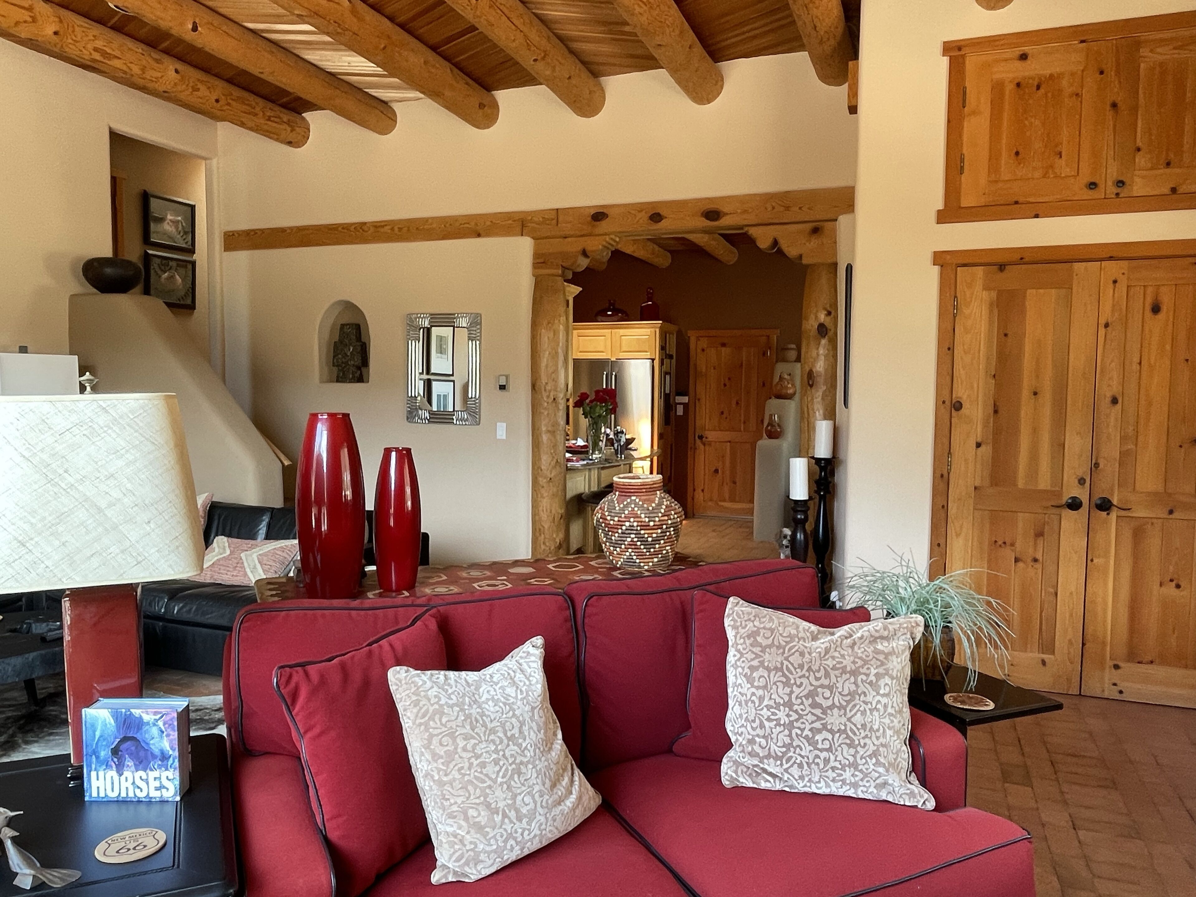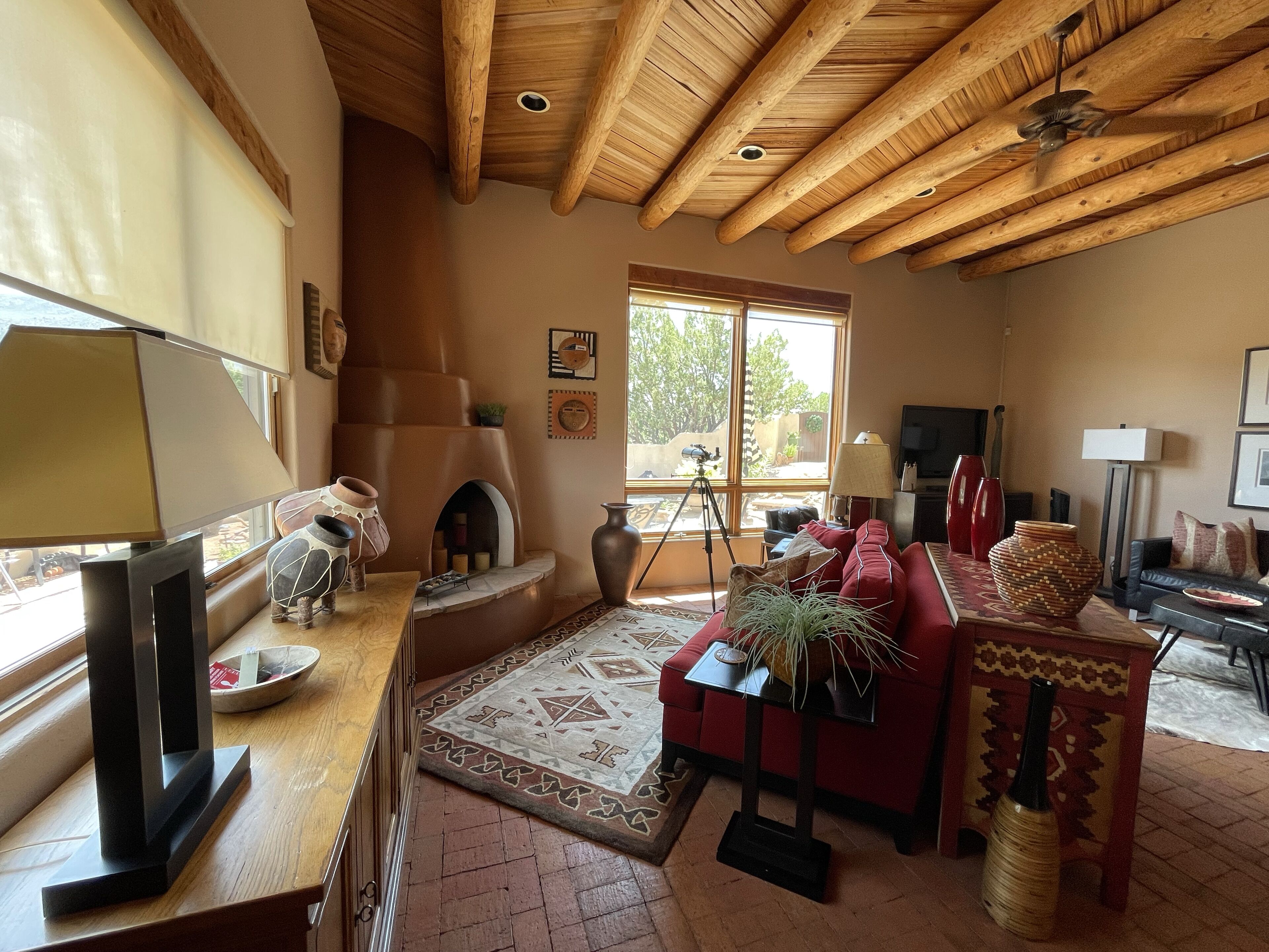 Placitas Magic-2 Bed/1 Bath Custom Santa Fe Home The home is a custom built, split-level Santa Fe Style home with 12 foot latillas & vigas ceilings, kiva fireplace, and saltillo tile and brick floors throughout. There is a covered Portal for relaxing, outdoor fire pit, and huge windows for taking in the big mountain views. The home has an open plan with contemporary furnishings and outstanding art and sculptures purchased from local artists and galleries. This is no ordinary rental, but a stylish, beautifully furnished personal home filled with quality furnishings, art, and treasures The spaceI have a 6 acre property at the end of a single lane road where my custom built, split-level Santa Fe home is nestled into the mountainside. There is a separate 1000 sq. ft. casita behind the house on the 6 acre property with its own private road. There is a wrap around courtyard around the home and stone staircases built into the terrain which makes the property interesting to explore. The home is built into the hill which makes it extra quiet and helps to keep it cool in the summer and warm in the winter months.