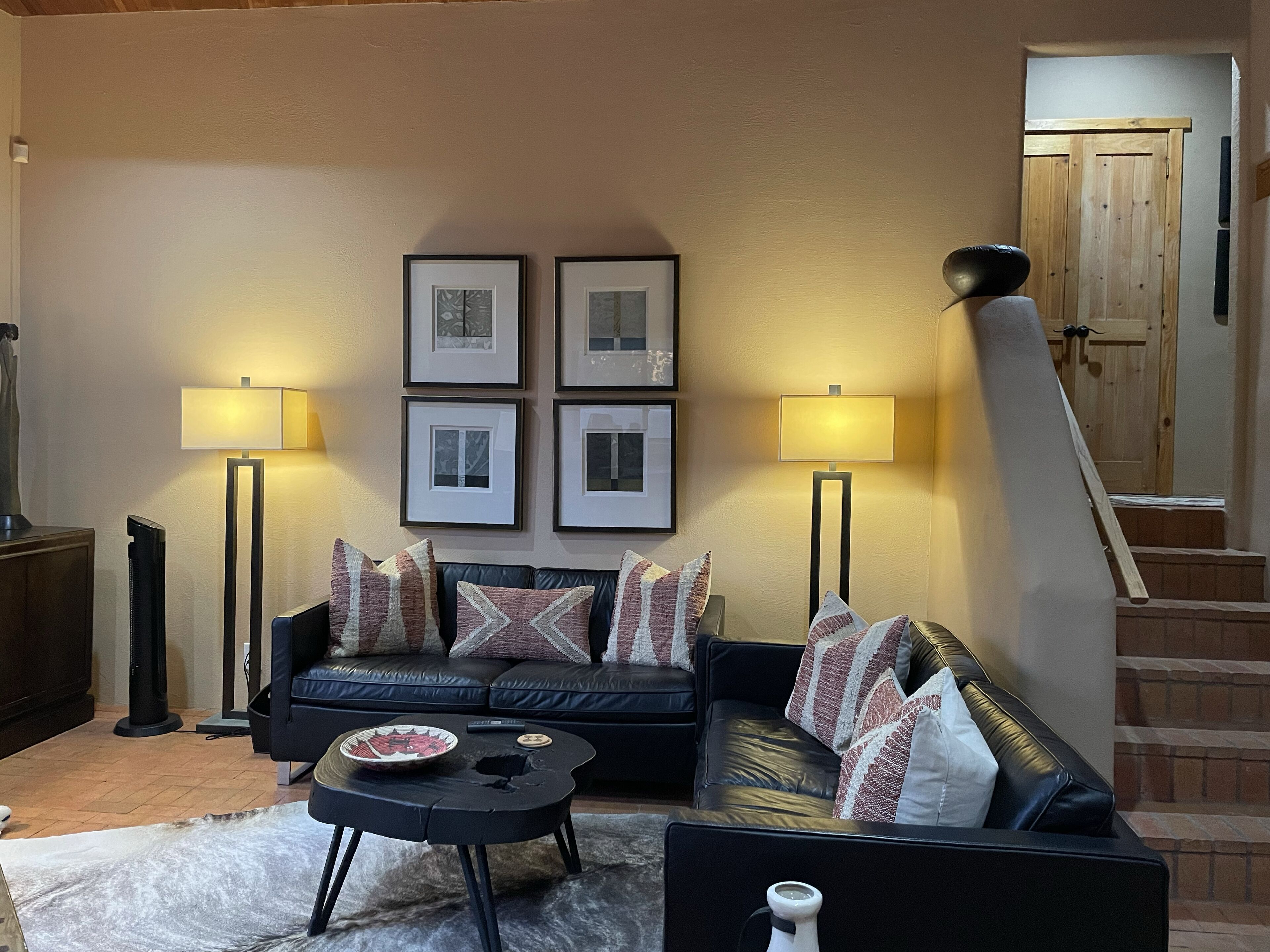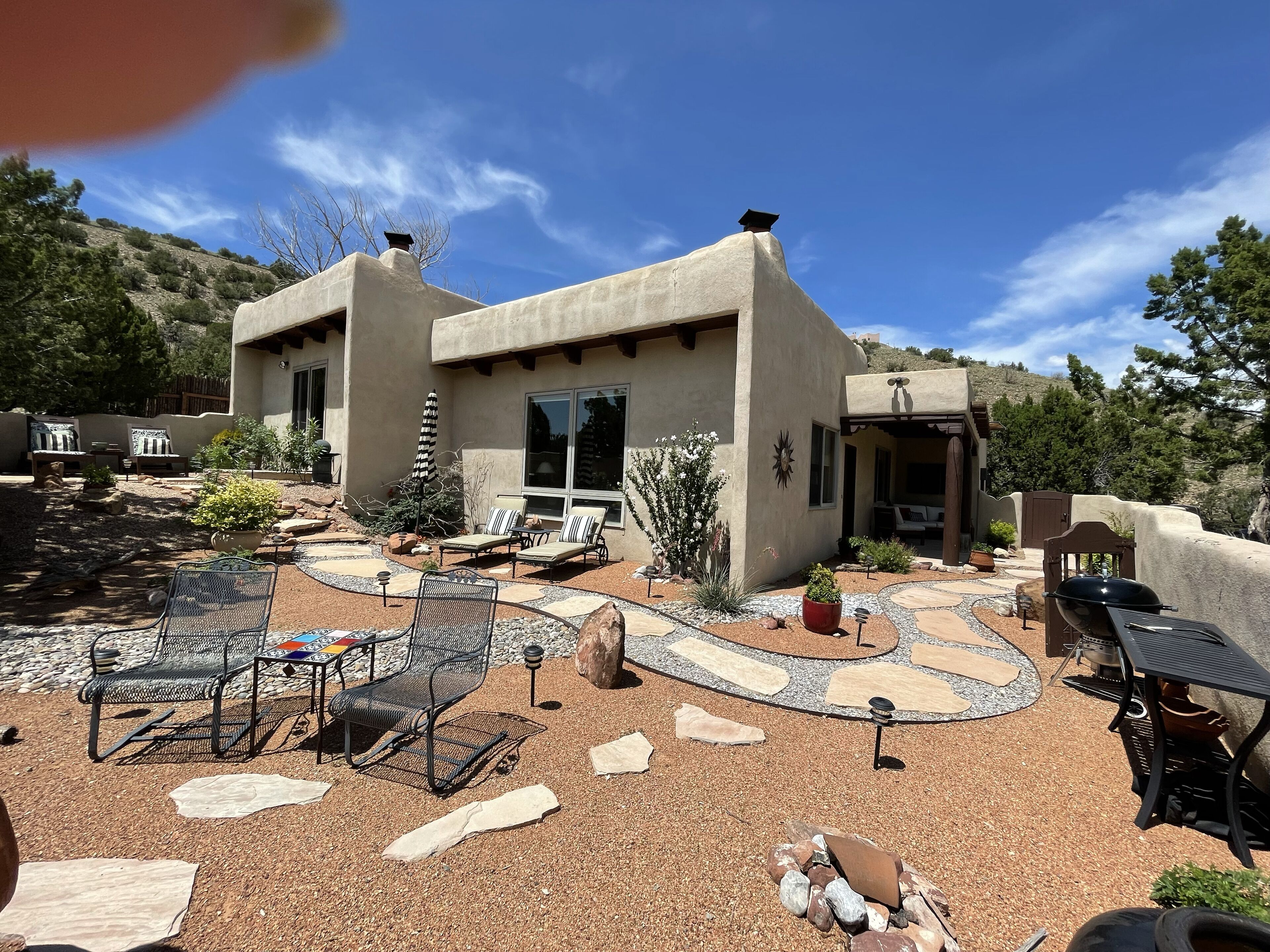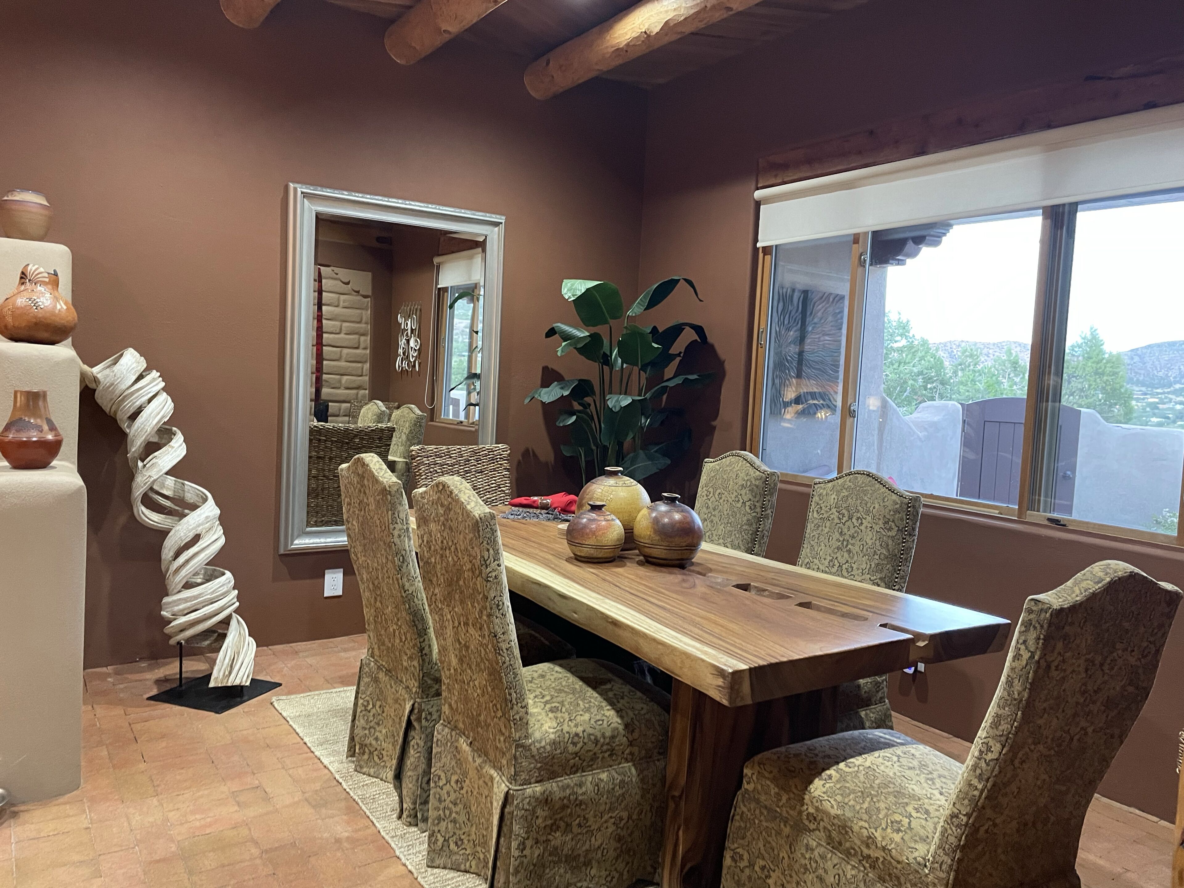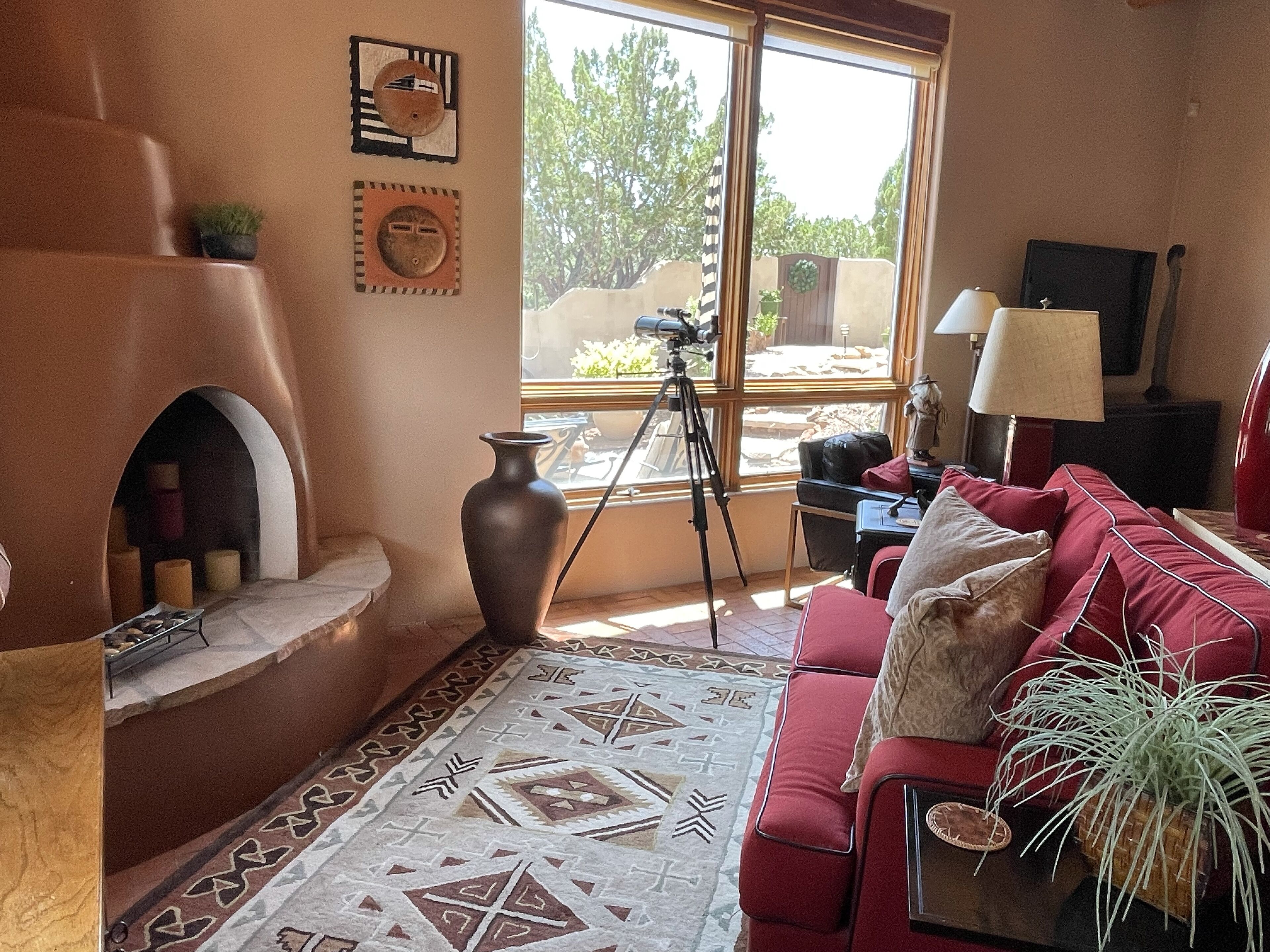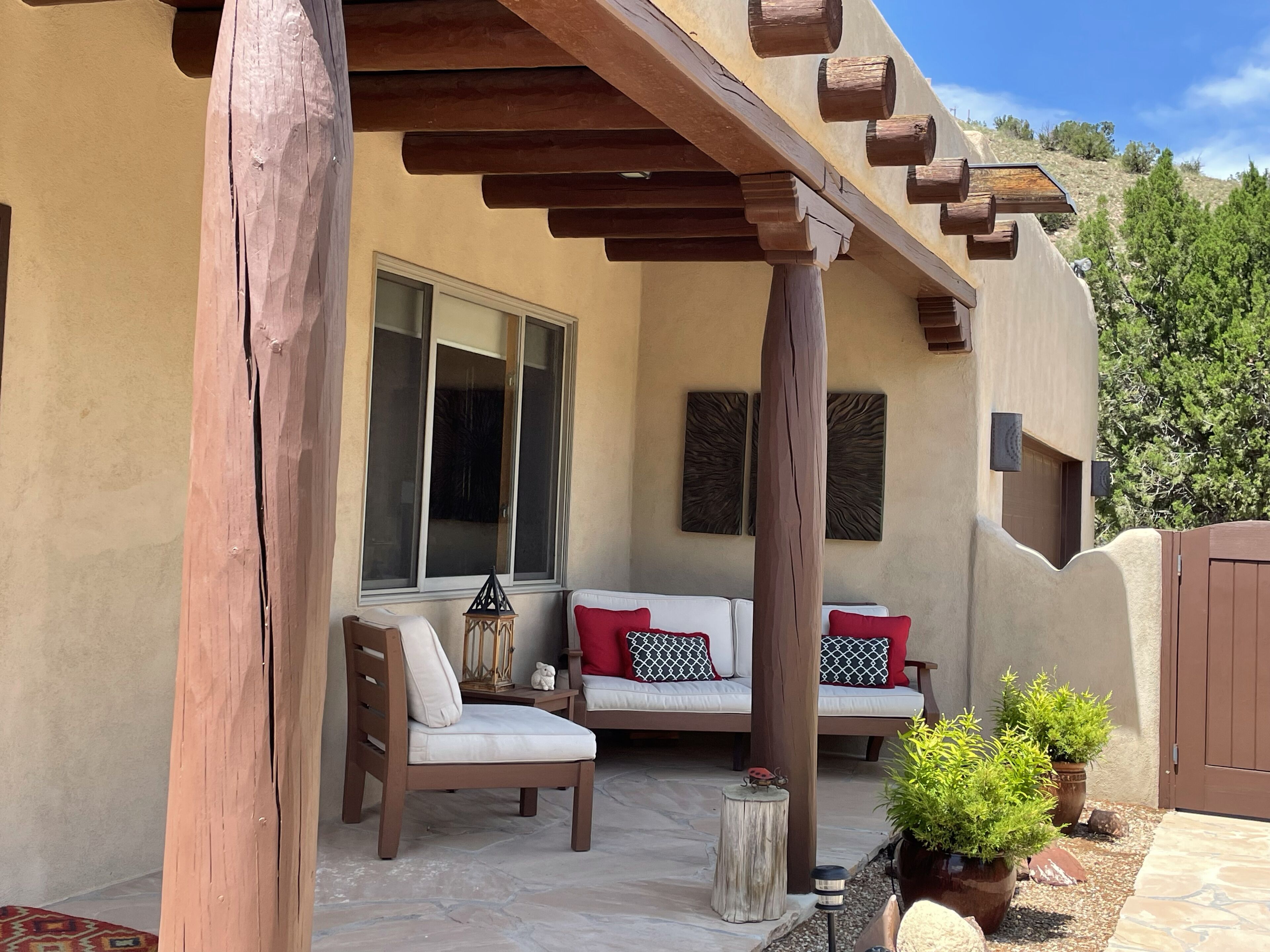 Placitas Magic-2 Bed/1 Bath Custom Santa Fe Home The home is a custom built, split-level Santa Fe Style home with 12 foot latillas & vigas ceilings, kiva fireplace, and saltillo tile and brick floors throughout. There is a covered Portal for relaxing, outdoor fire pit, and huge windows for taking in the big mountain views. The home has an open plan with contemporary furnishings and outstanding art and sculptures purchased from local artists and galleries. This is no ordinary rental, but a stylish, beautifully furnished personal home filled with quality furnishings, art, and treasures The spaceI have a 6 acre property at the end of a single lane road where my custom built, split-level Santa Fe home is nestled into the mountainside. There is a separate 1000 sq. ft. casita behind the house on the 6 acre property with its own private road. There is a wrap around courtyard around the home and stone staircases built into the terrain which makes the property interesting to explore. The home is built into the hill which makes it extra quiet and helps to keep it cool in the summer and warm in the winter months.
