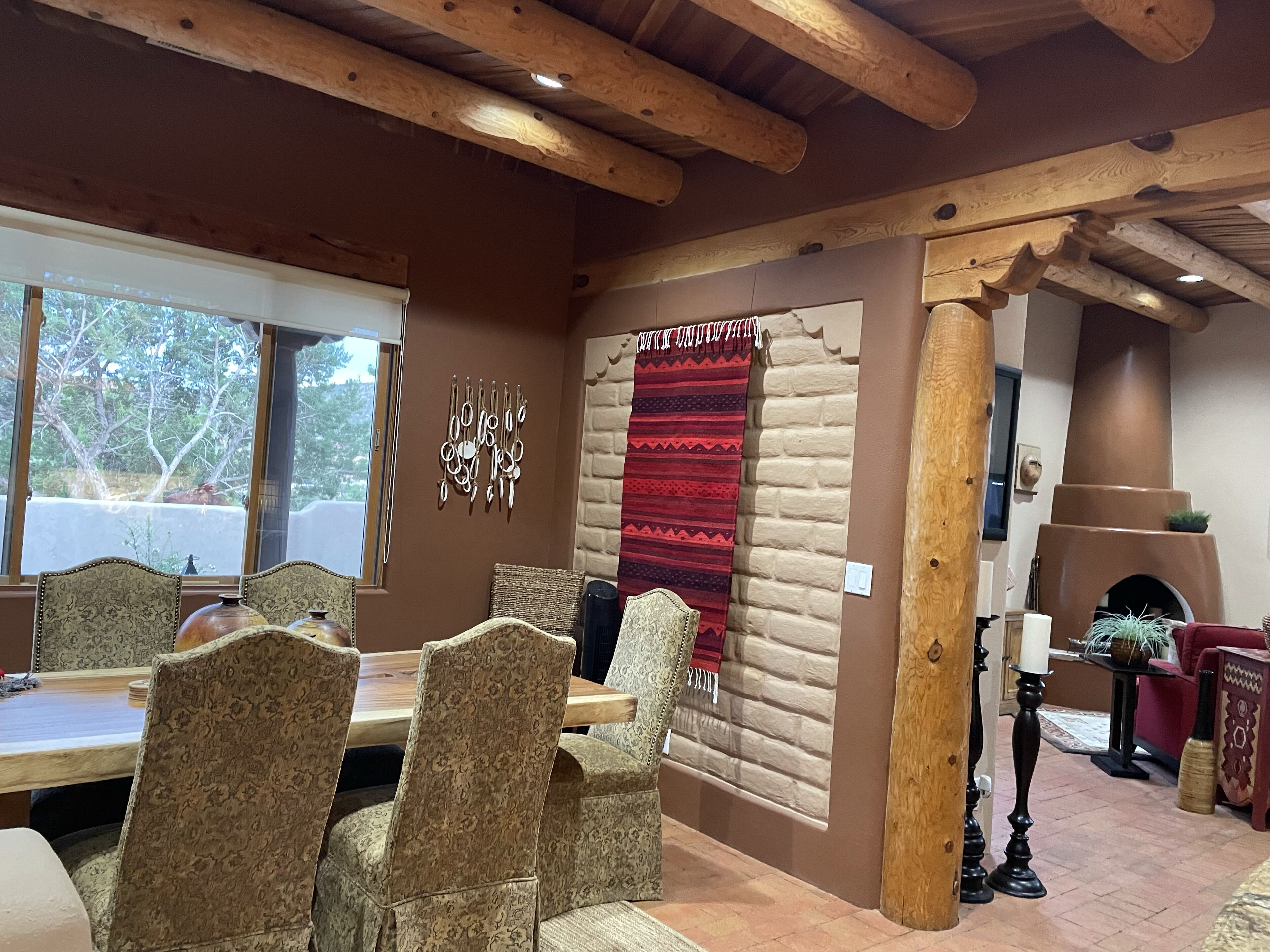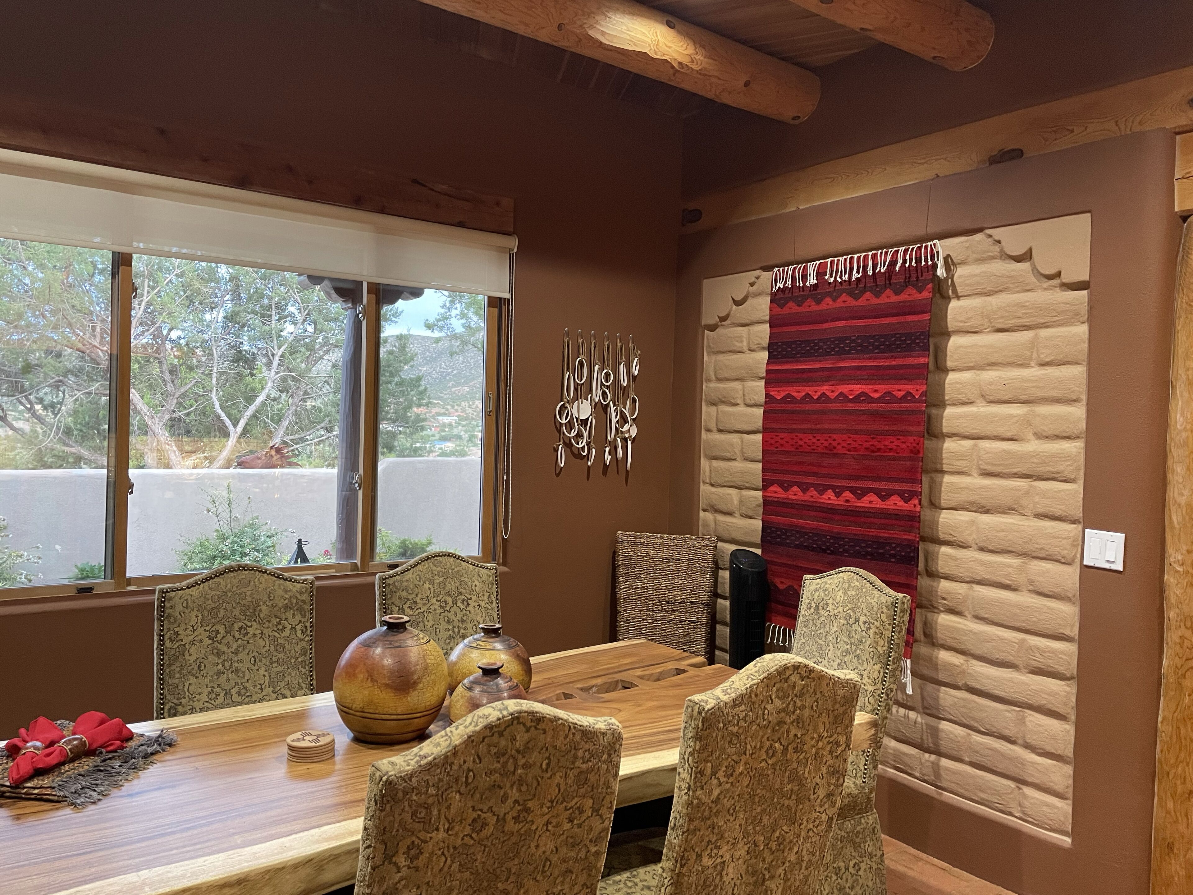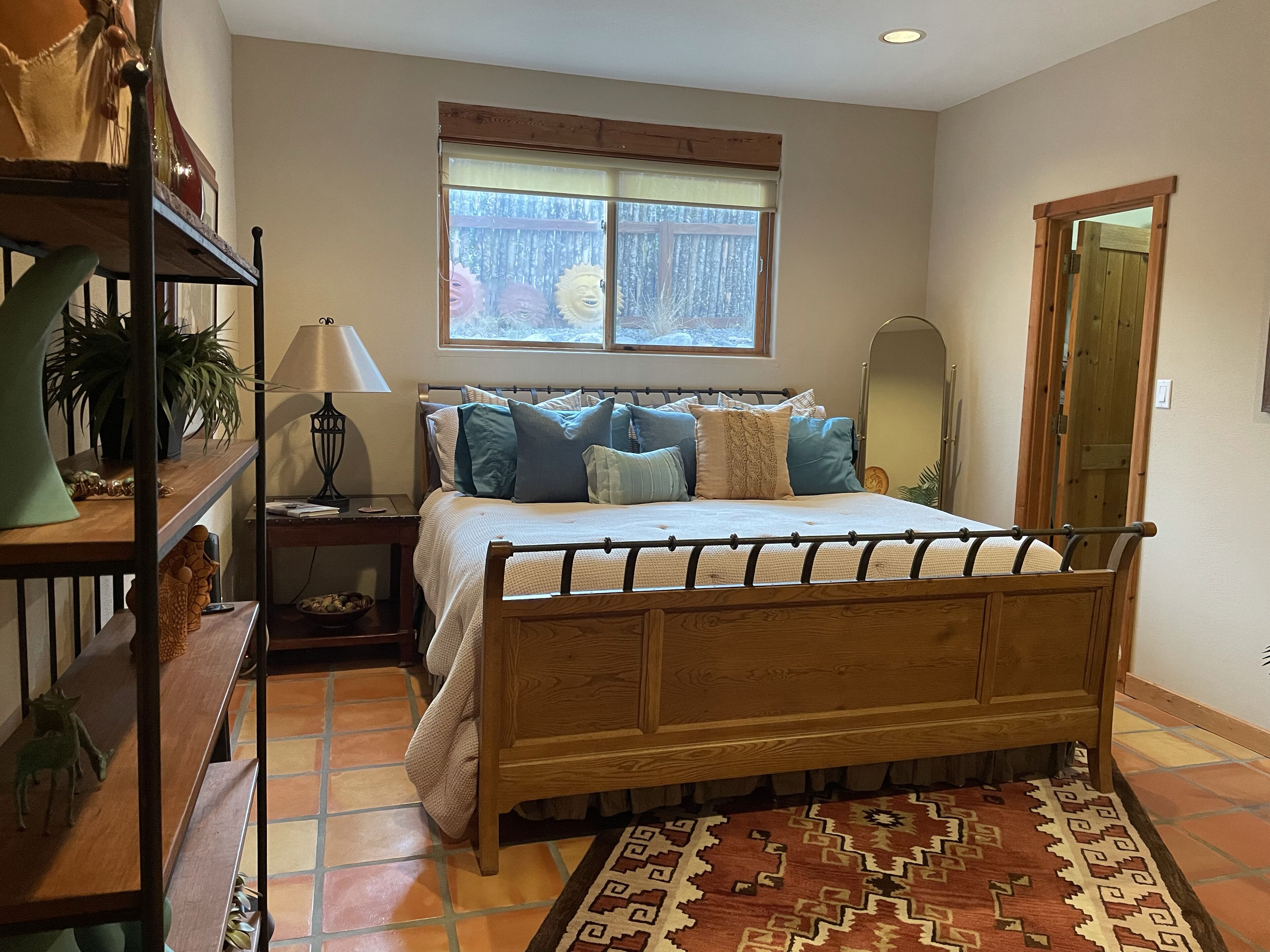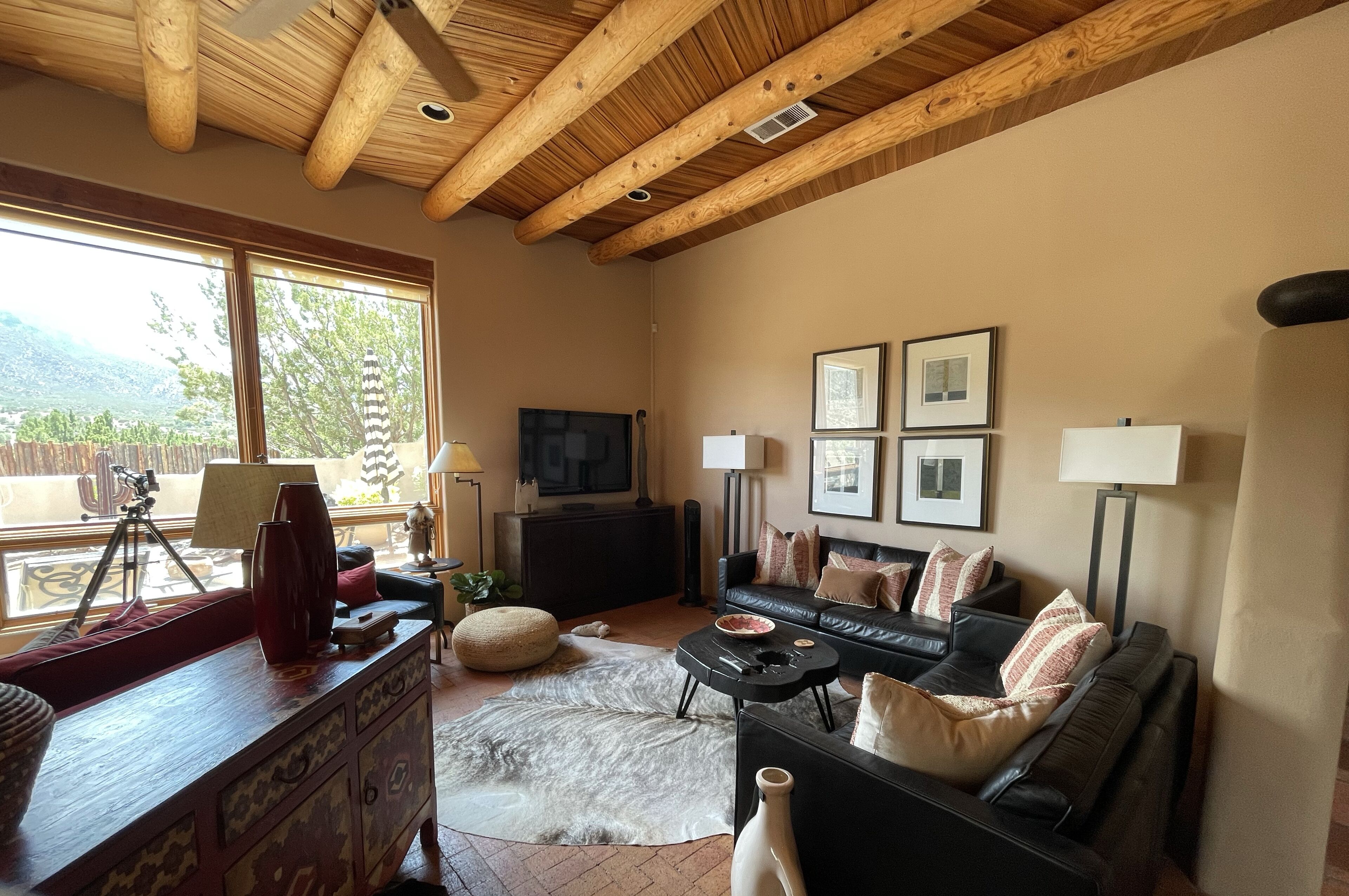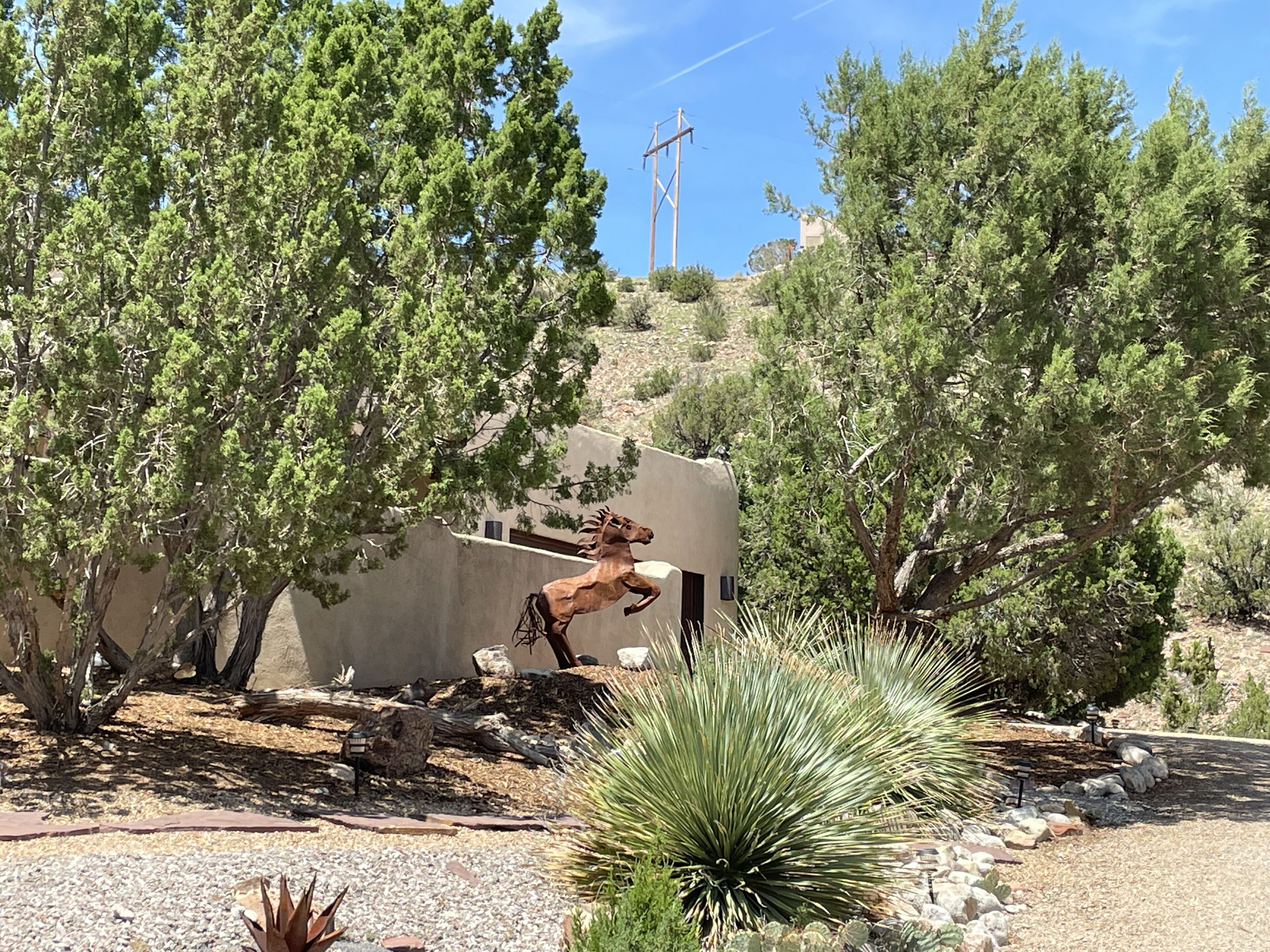 Placitas Magic-2 Bed/1 Bath Custom Santa Fe Home The home is a custom built, split-level Santa Fe Style home with 12 foot latillas & vigas ceilings, kiva fireplace, and saltillo tile and brick floors throughout. There is a covered Portal for relaxing, outdoor fire pit, and huge windows for taking in the big mountain views. The home has an open plan with contemporary furnishings and outstanding art and sculptures purchased from local artists and galleries. This is no ordinary rental, but a stylish, beautifully furnished personal home filled with quality furnishings, art, and treasures The spaceI have a 6 acre property at the end of a single lane road where my custom built, split-level Santa Fe home is nestled into the mountainside. There is a separate 1000 sq. ft. casita behind the house on the 6 acre property with its own private road. There is a wrap around courtyard around the home and stone staircases built into the terrain which makes the property interesting to explore. The home is built into the hill which makes it extra quiet and helps to keep it cool in the summer and warm in the winter months.