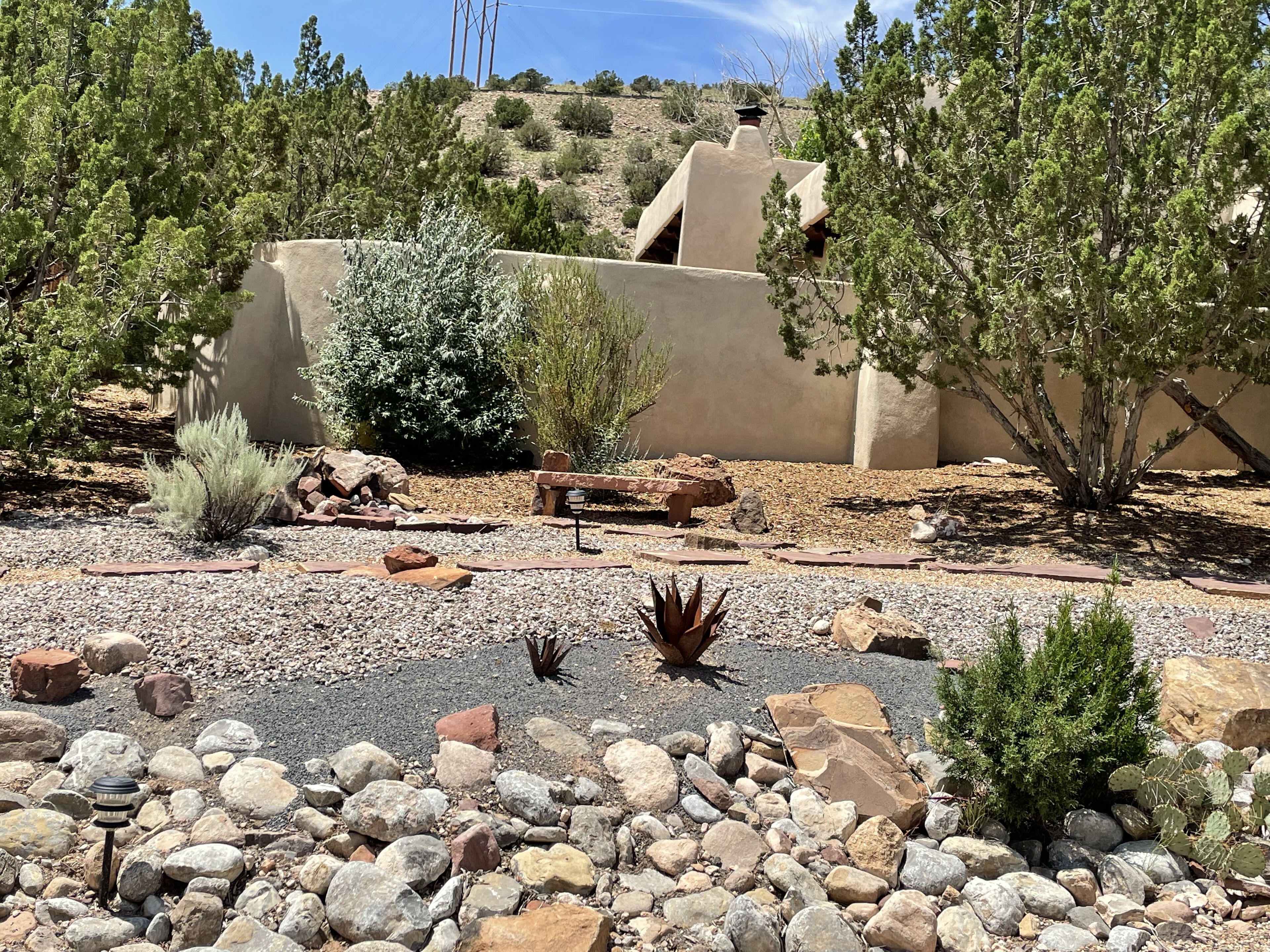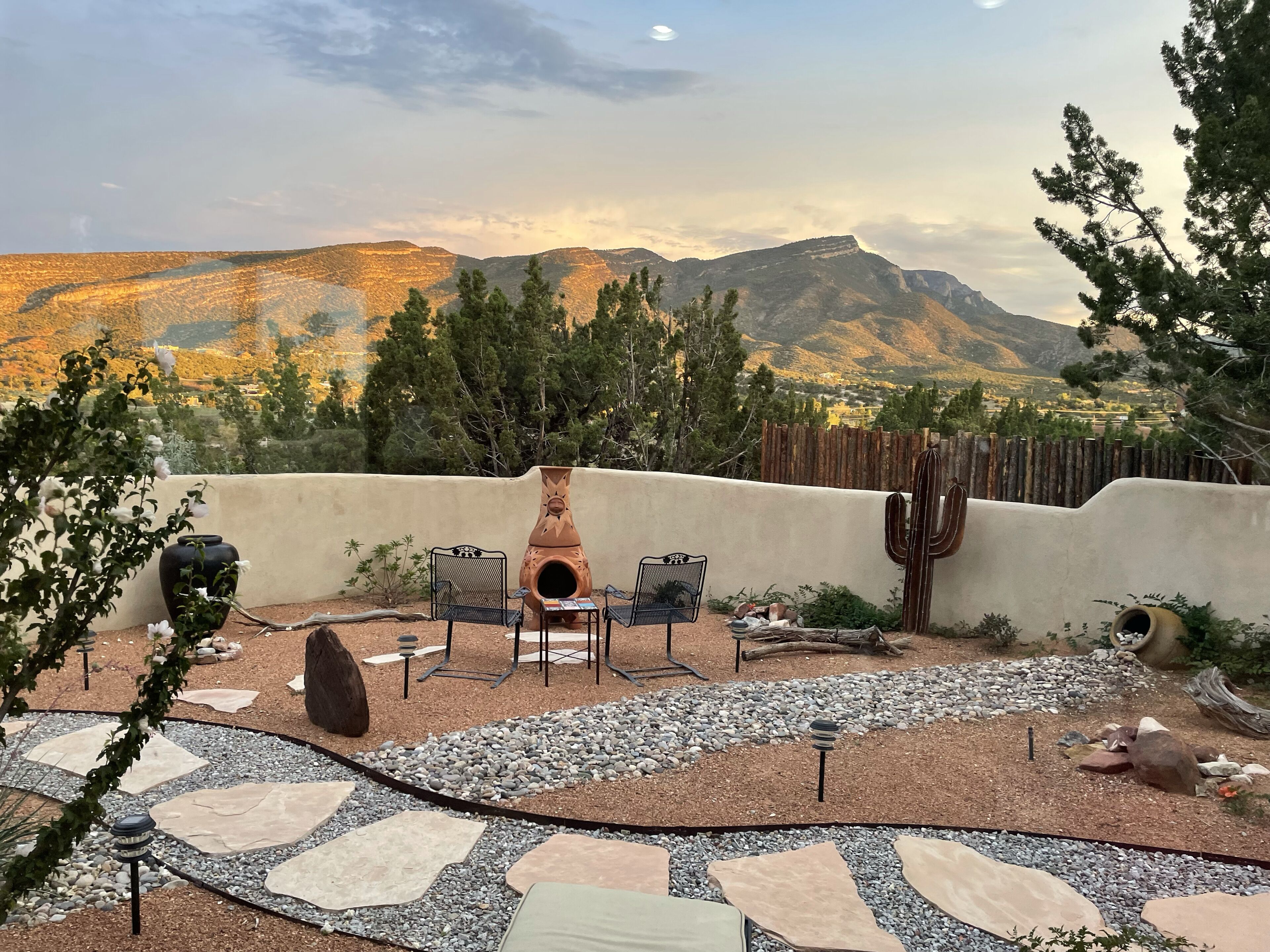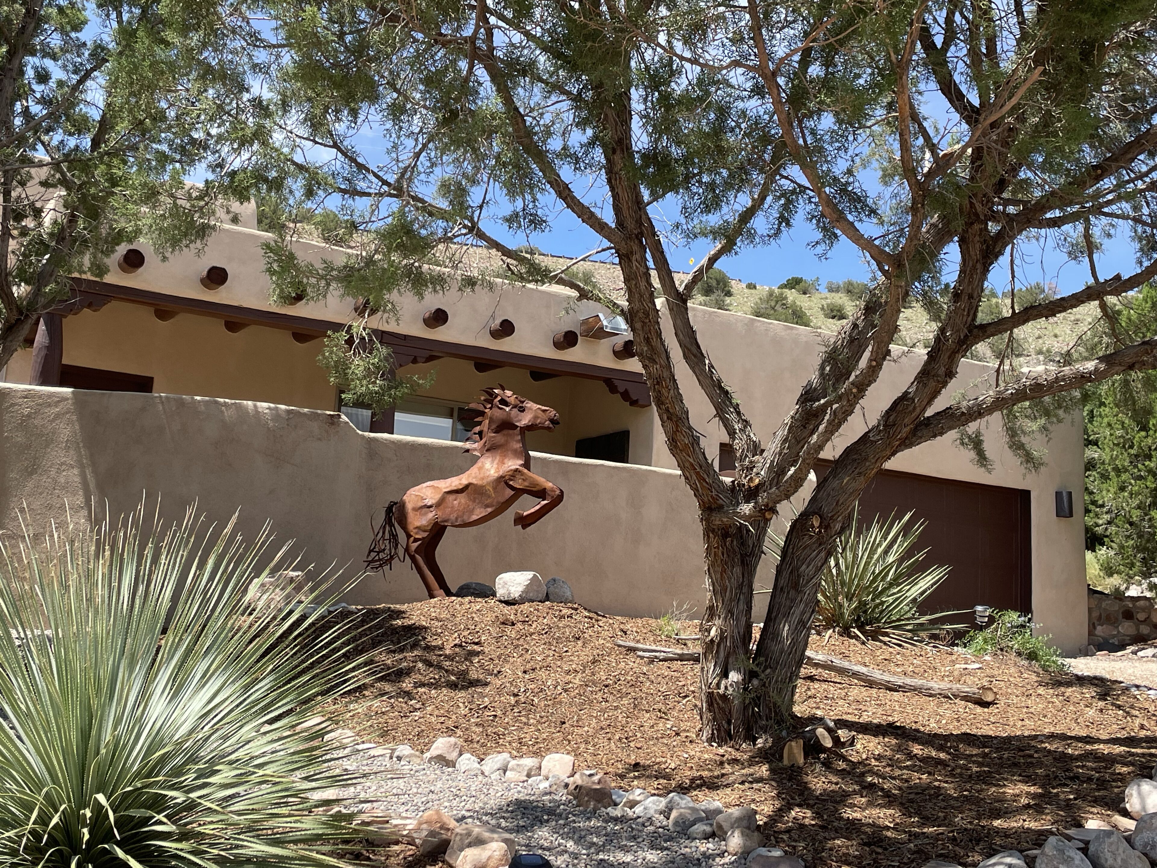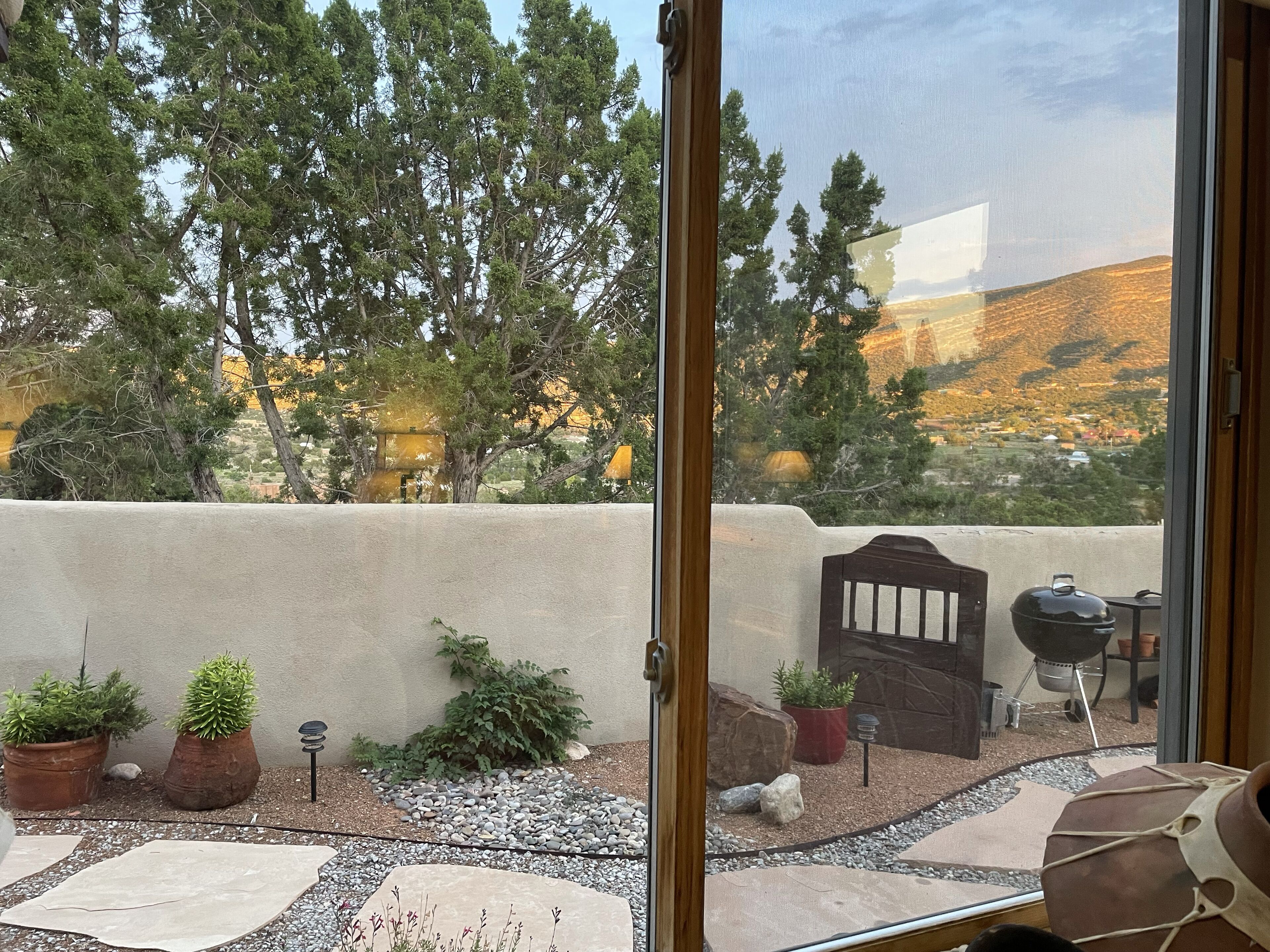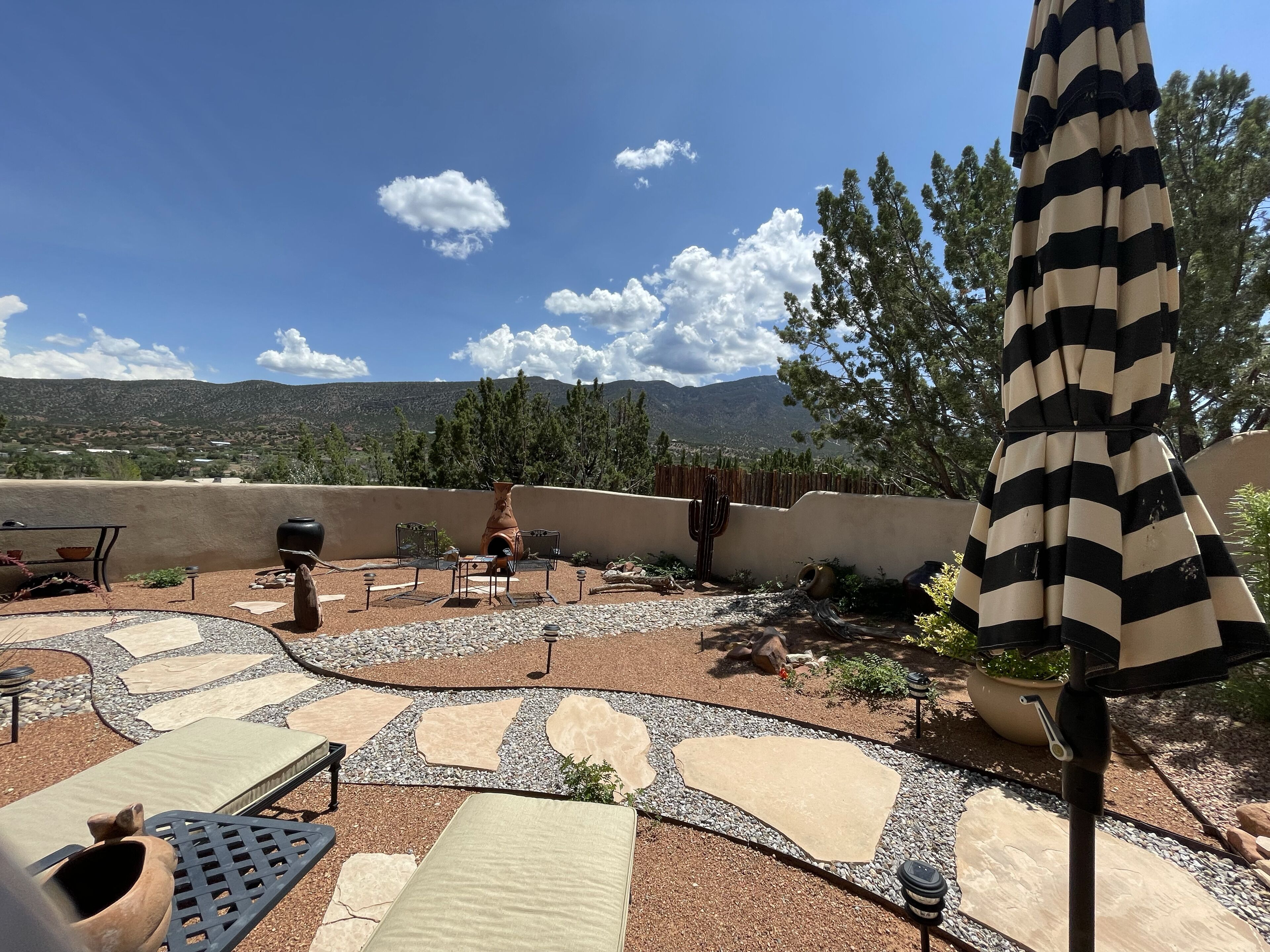 Placitas Magic-2 Bed/1 Bath Custom Santa Fe Home The home is a custom built, split-level Santa Fe Style home with 12 foot latillas & vigas ceilings, kiva fireplace, and saltillo tile and brick floors throughout. There is a covered Portal for relaxing, outdoor fire pit, and huge windows for taking in the big mountain views. The home has an open plan with contemporary furnishings and outstanding art and sculptures purchased from local artists and galleries. This is no ordinary rental, but a stylish, beautifully furnished personal home filled with quality furnishings, art, and treasures The spaceI have a 6 acre property at the end of a single lane road where my custom built, split-level Santa Fe home is nestled into the mountainside. There is a separate 1000 sq. ft. casita behind the house on the 6 acre property with its own private road. There is a wrap around courtyard around the home and stone staircases built into the terrain which makes the property interesting to explore. The home is built into the hill which makes it extra quiet and helps to keep it cool in the summer and warm in the winter months.