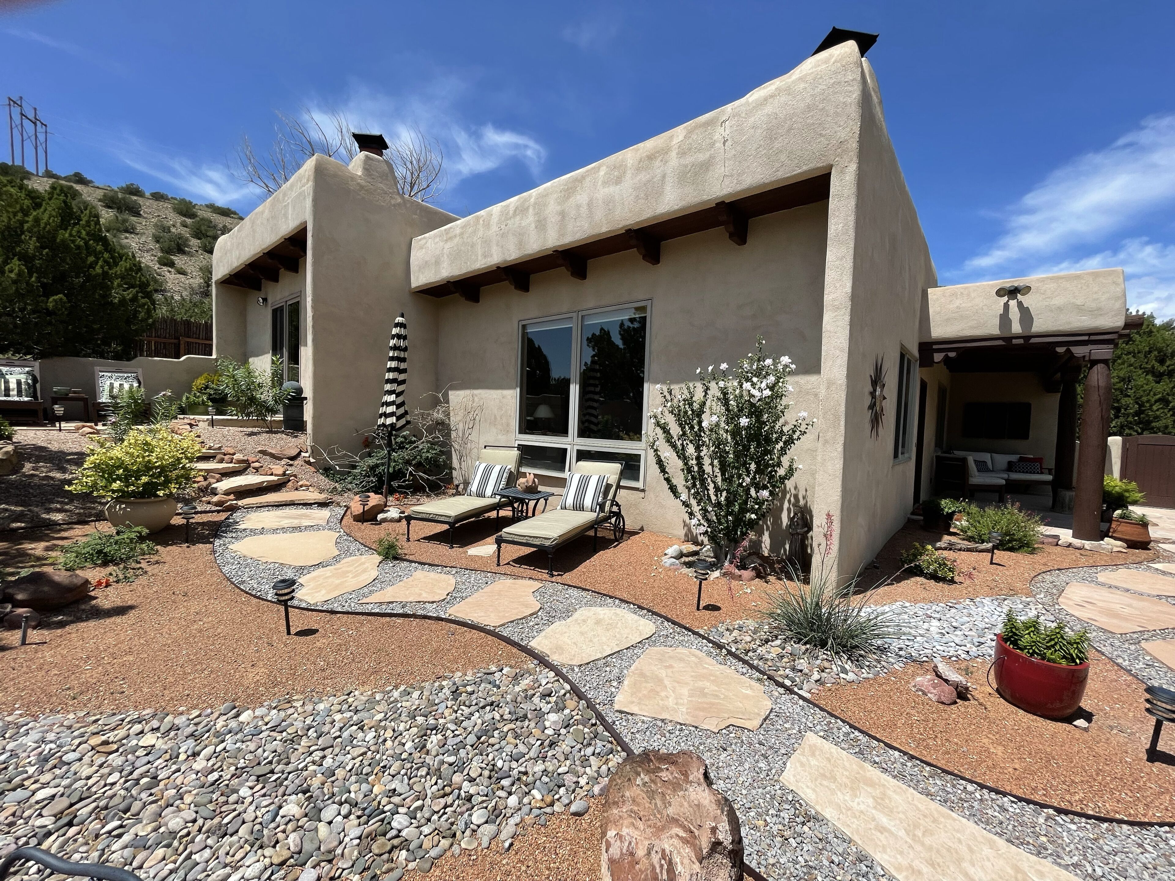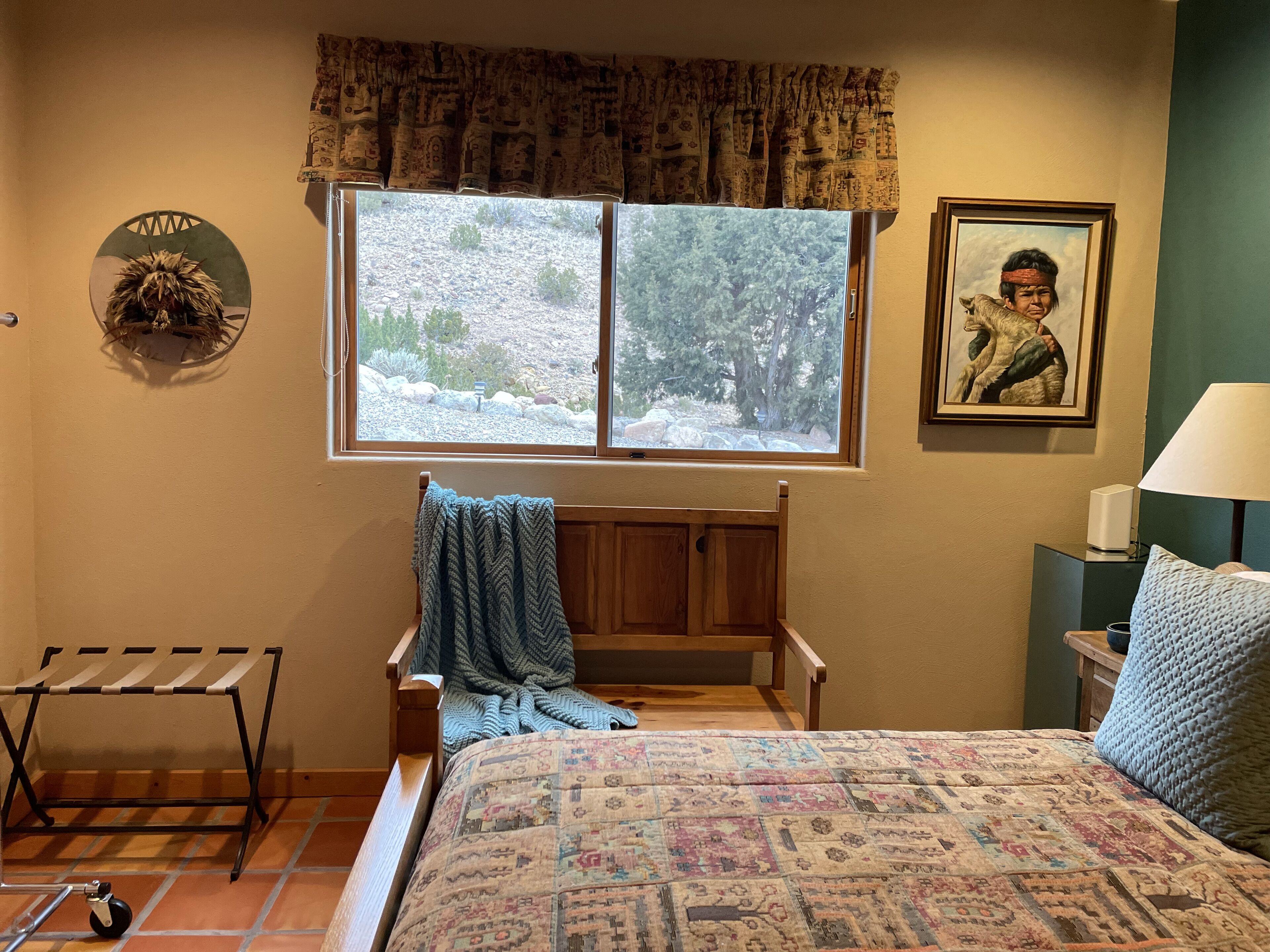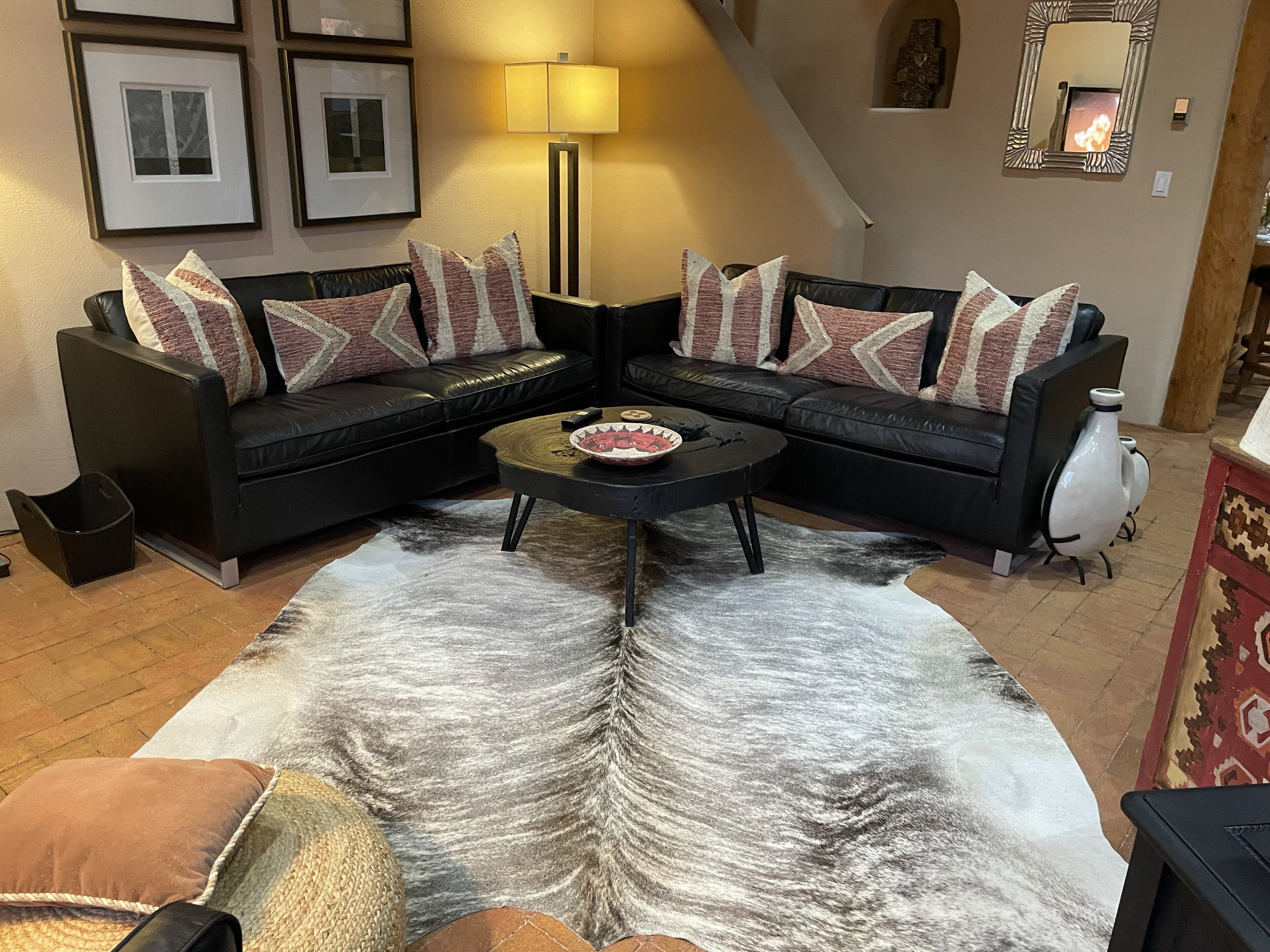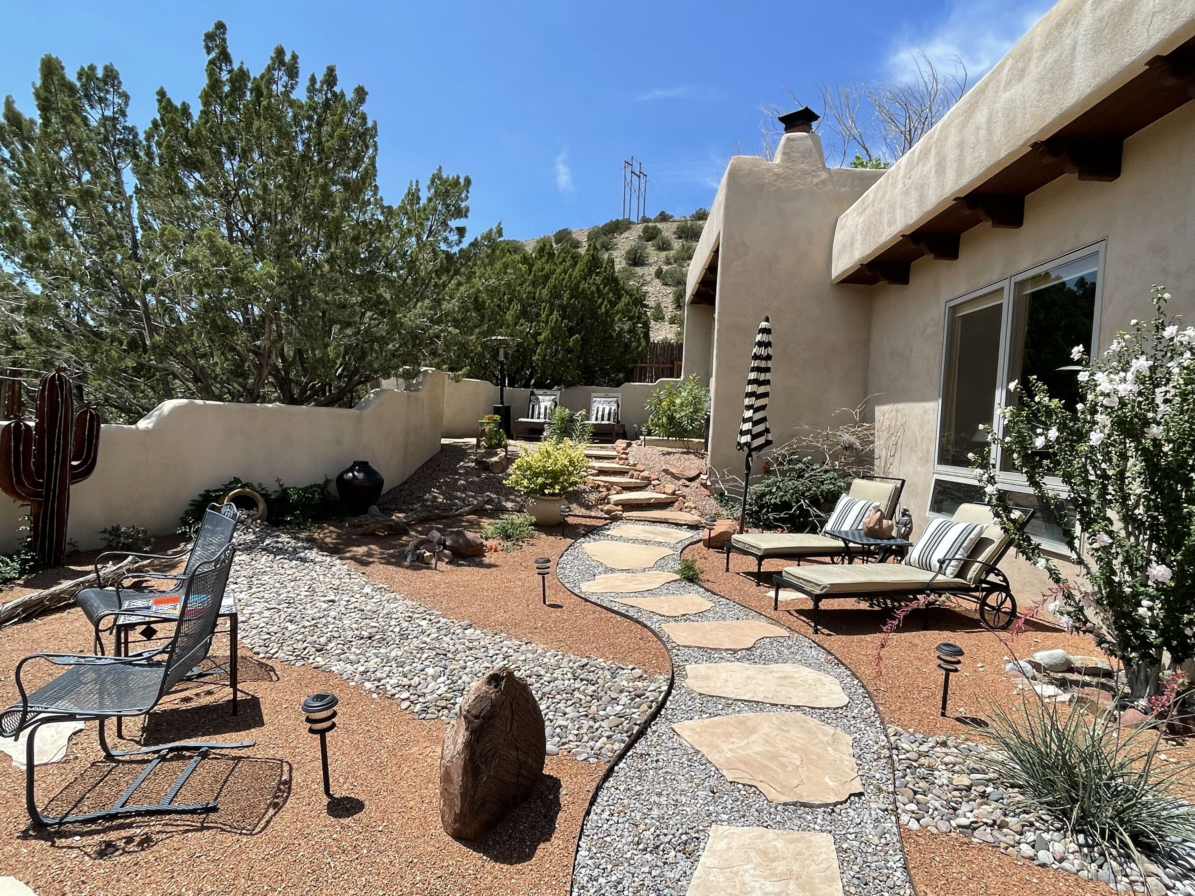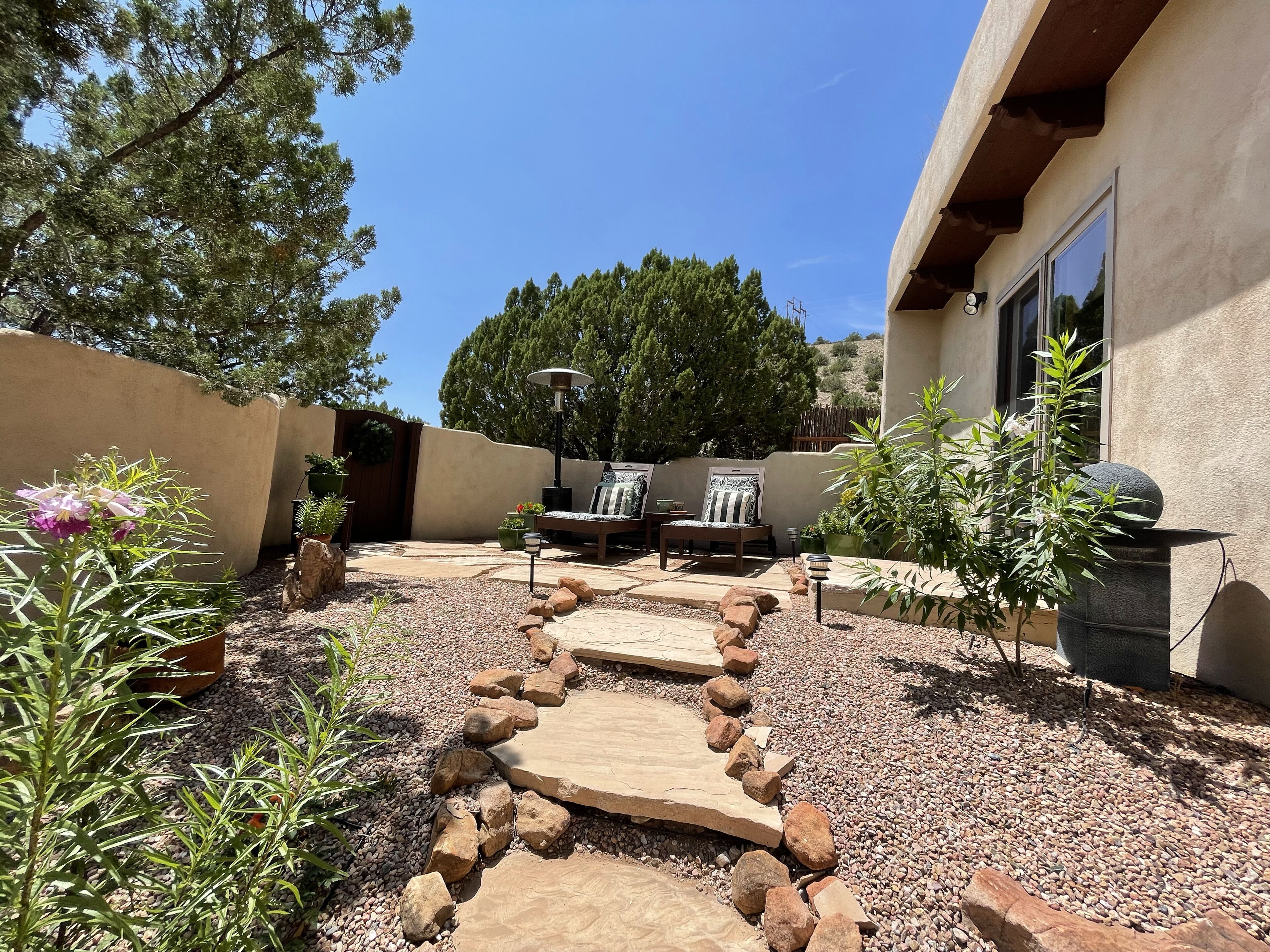 Placitas Magic-2 Bed/1 Bath Custom Santa Fe Home The home is a custom built, split-level Santa Fe Style home with 12 foot latillas & vigas ceilings, kiva fireplace, and saltillo tile and brick floors throughout. There is a covered Portal for relaxing, outdoor fire pit, and huge windows for taking in the big mountain views. The home has an open plan with contemporary furnishings and outstanding art and sculptures purchased from local artists and galleries. This is no ordinary rental, but a stylish, beautifully furnished personal home filled with quality furnishings, art, and treasures The spaceI have a 6 acre property at the end of a single lane road where my custom built, split-level Santa Fe home is nestled into the mountainside. There is a separate 1000 sq. ft. casita behind the house on the 6 acre property with its own private road. There is a wrap around courtyard around the home and stone staircases built into the terrain which makes the property interesting to explore. The home is built into the hill which makes it extra quiet and helps to keep it cool in the summer and warm in the winter months.