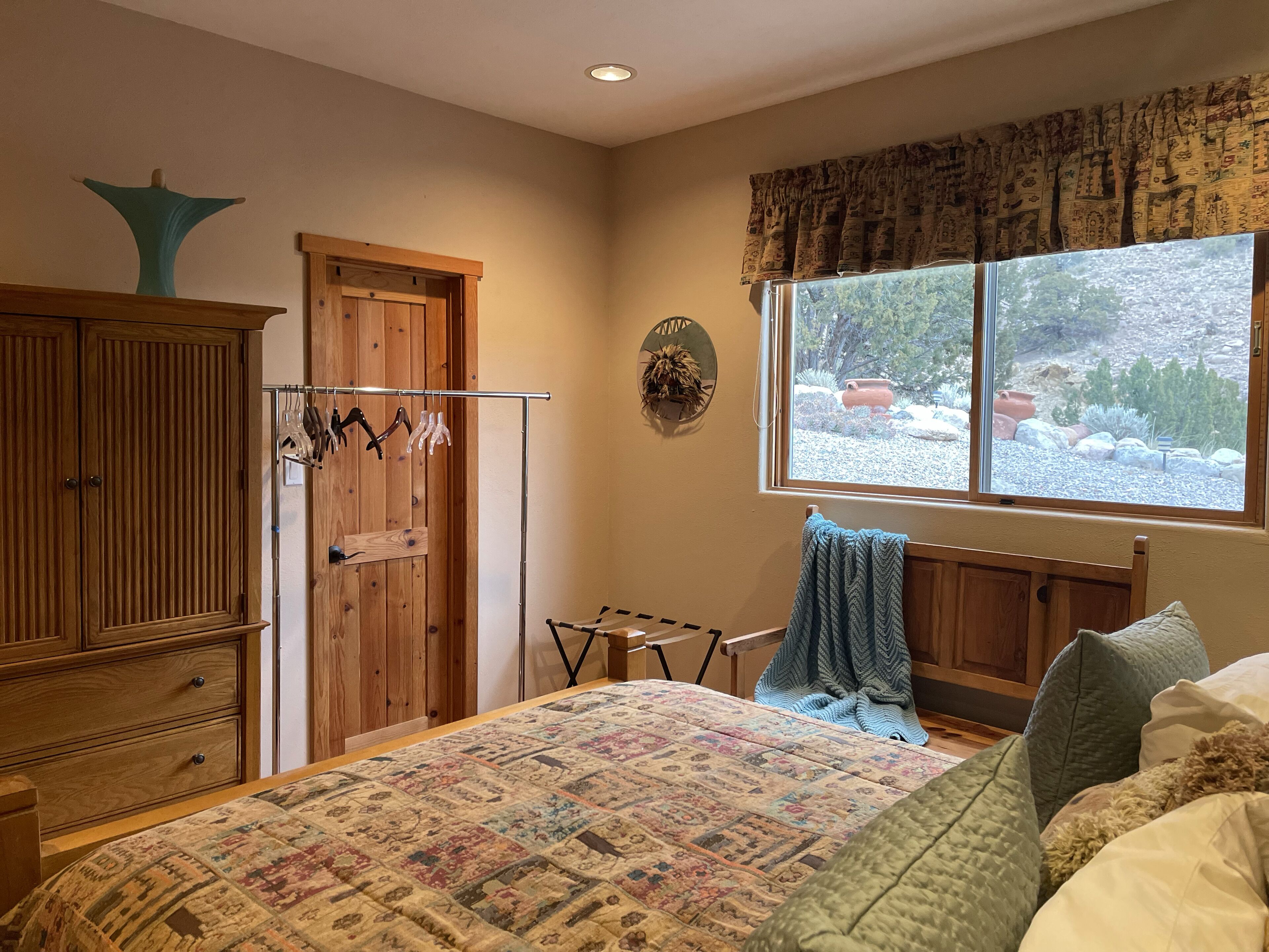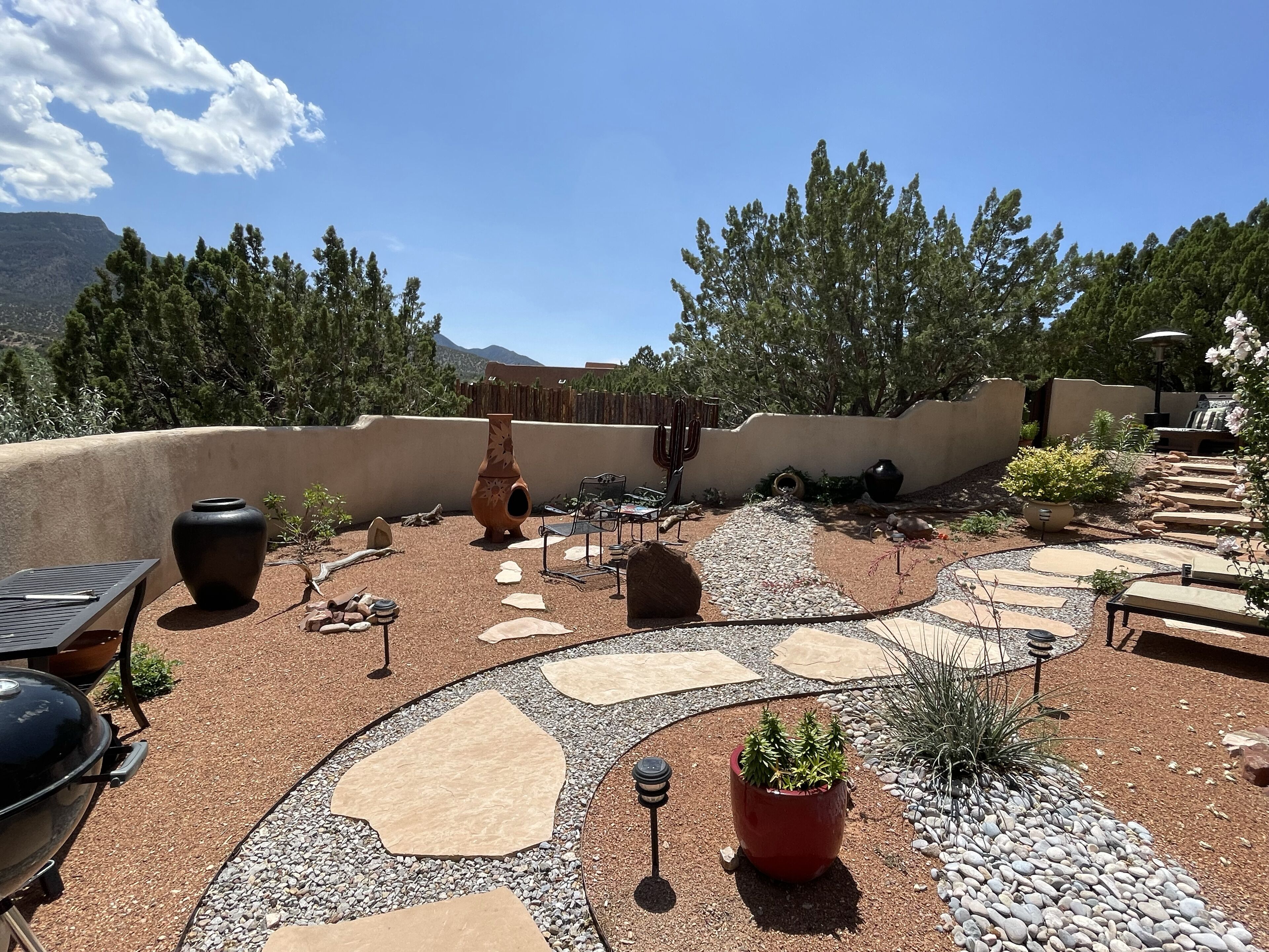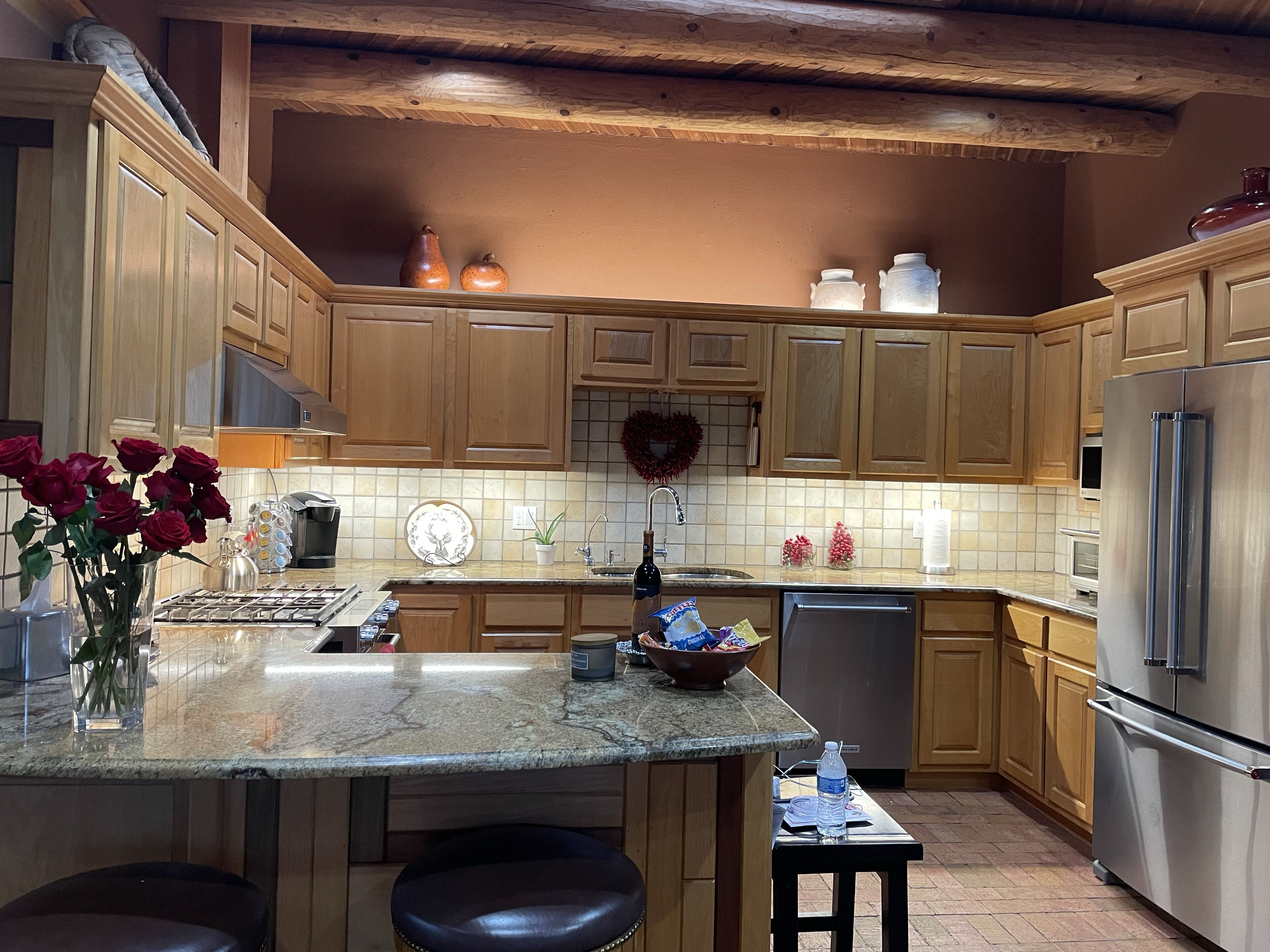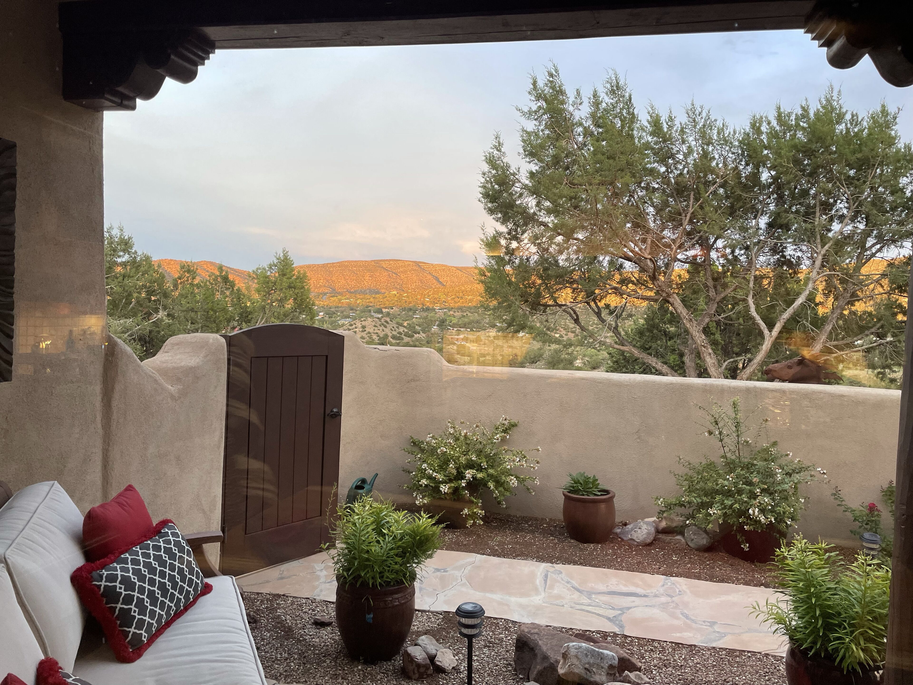 Placitas Magic-2 Bed/1 Bath Custom Santa Fe Home The home is a custom built, split-level Santa Fe Style home with 12 foot latillas & vigas ceilings, kiva fireplace, and saltillo tile and brick floors throughout. There is a covered Portal for relaxing, outdoor fire pit, and huge windows for taking in the big mountain views. The home has an open plan with contemporary furnishings and outstanding art and sculptures purchased from local artists and galleries. This is no ordinary rental, but a stylish, beautifully furnished personal home filled with quality furnishings, art, and treasures The spaceI have a 6 acre property at the end of a single lane road where my custom built, split-level Santa Fe home is nestled into the mountainside. There is a separate 1000 sq. ft. casita behind the house on the 6 acre property with its own private road. There is a wrap around courtyard around the home and stone staircases built into the terrain which makes the property interesting to explore. The home is built into the hill which makes it extra quiet and helps to keep it cool in the summer and warm in the winter months.