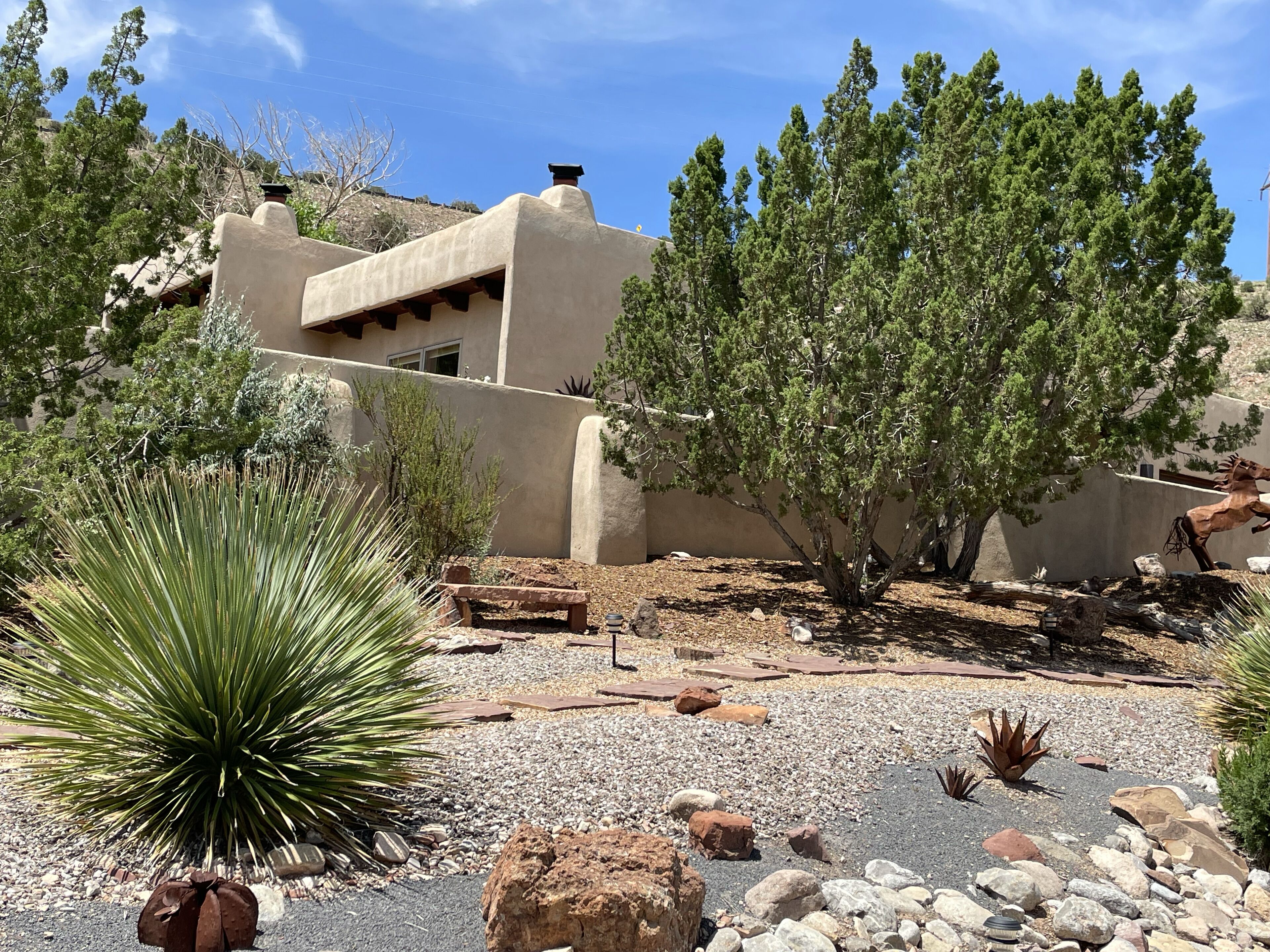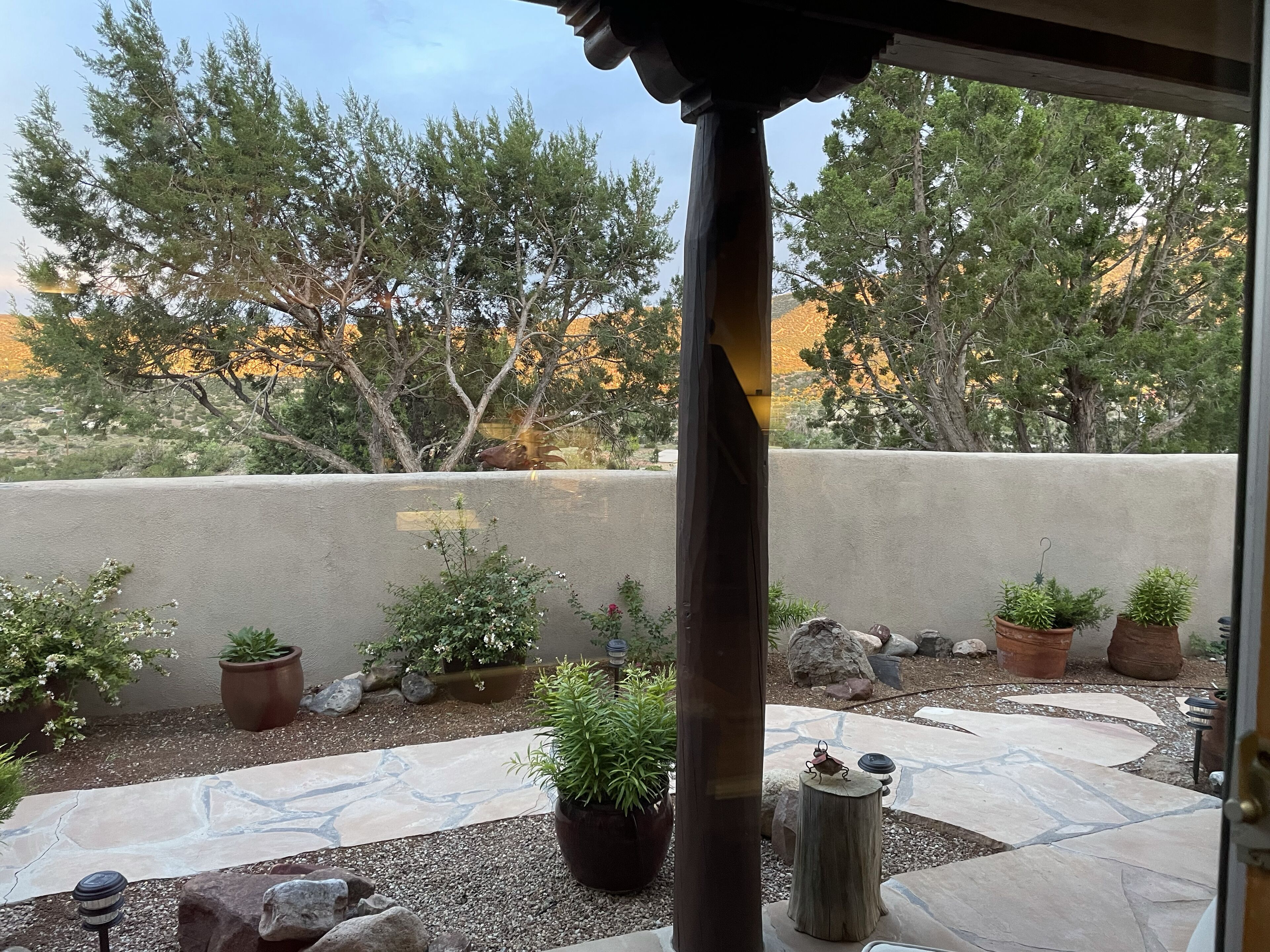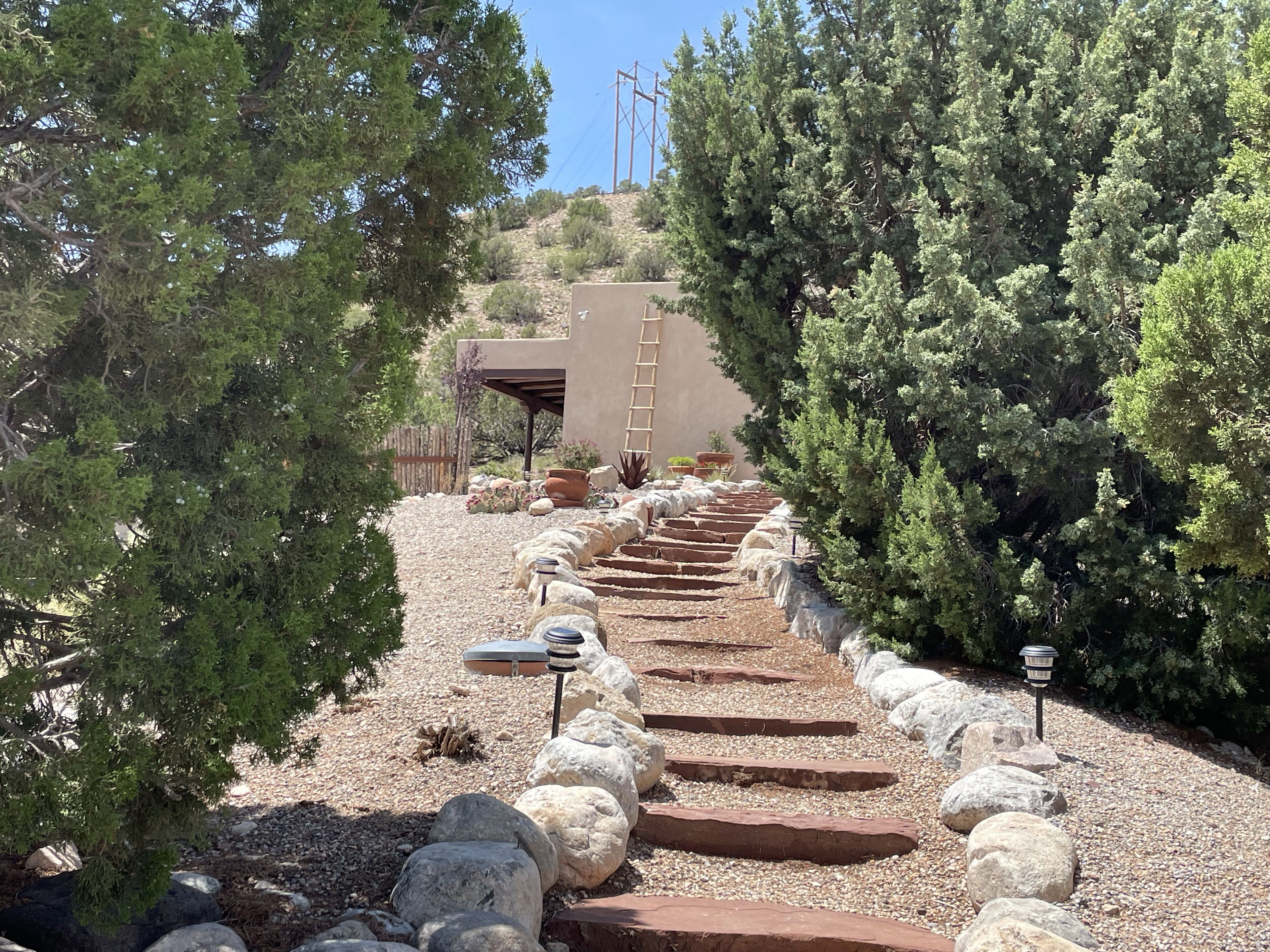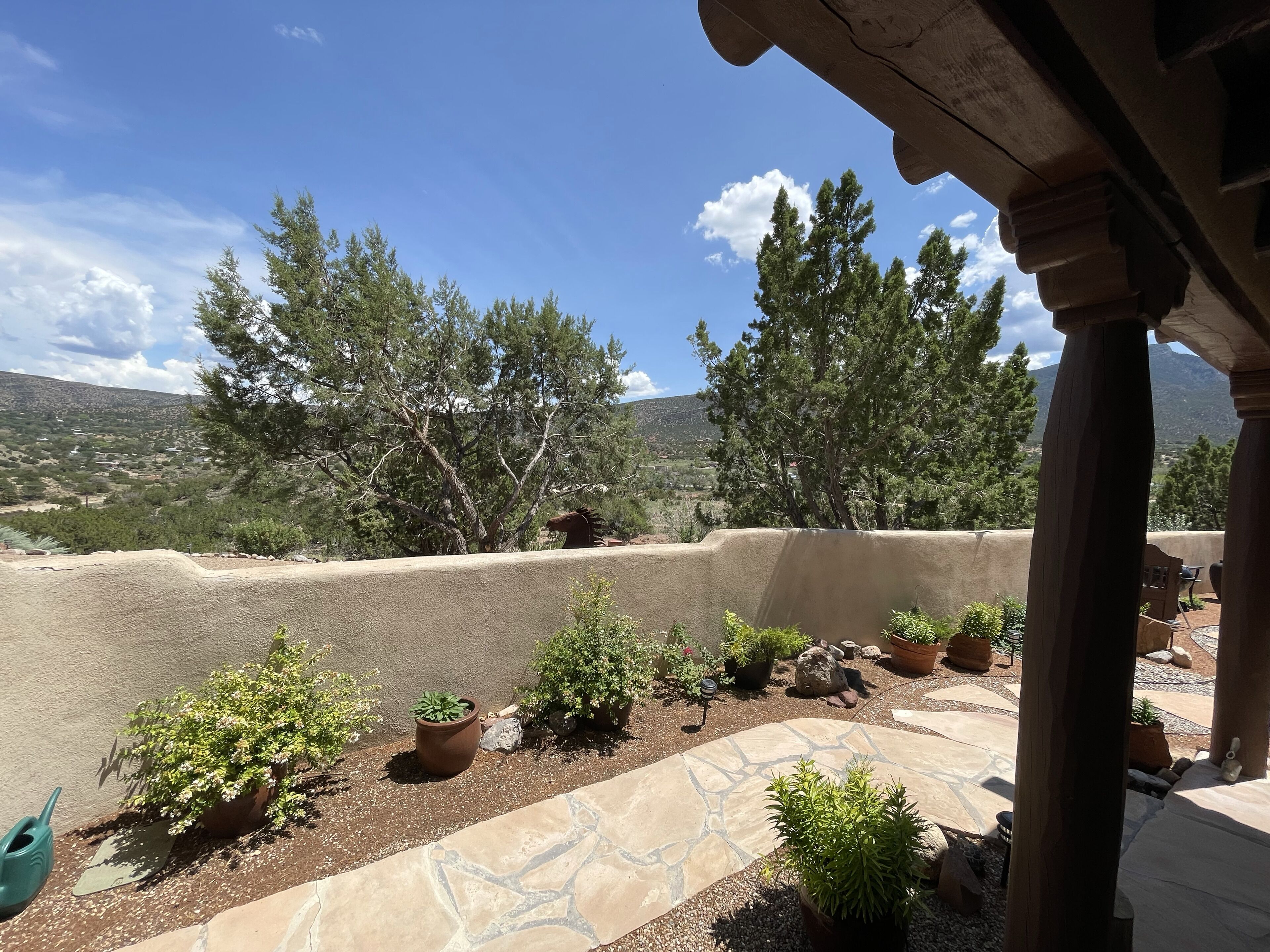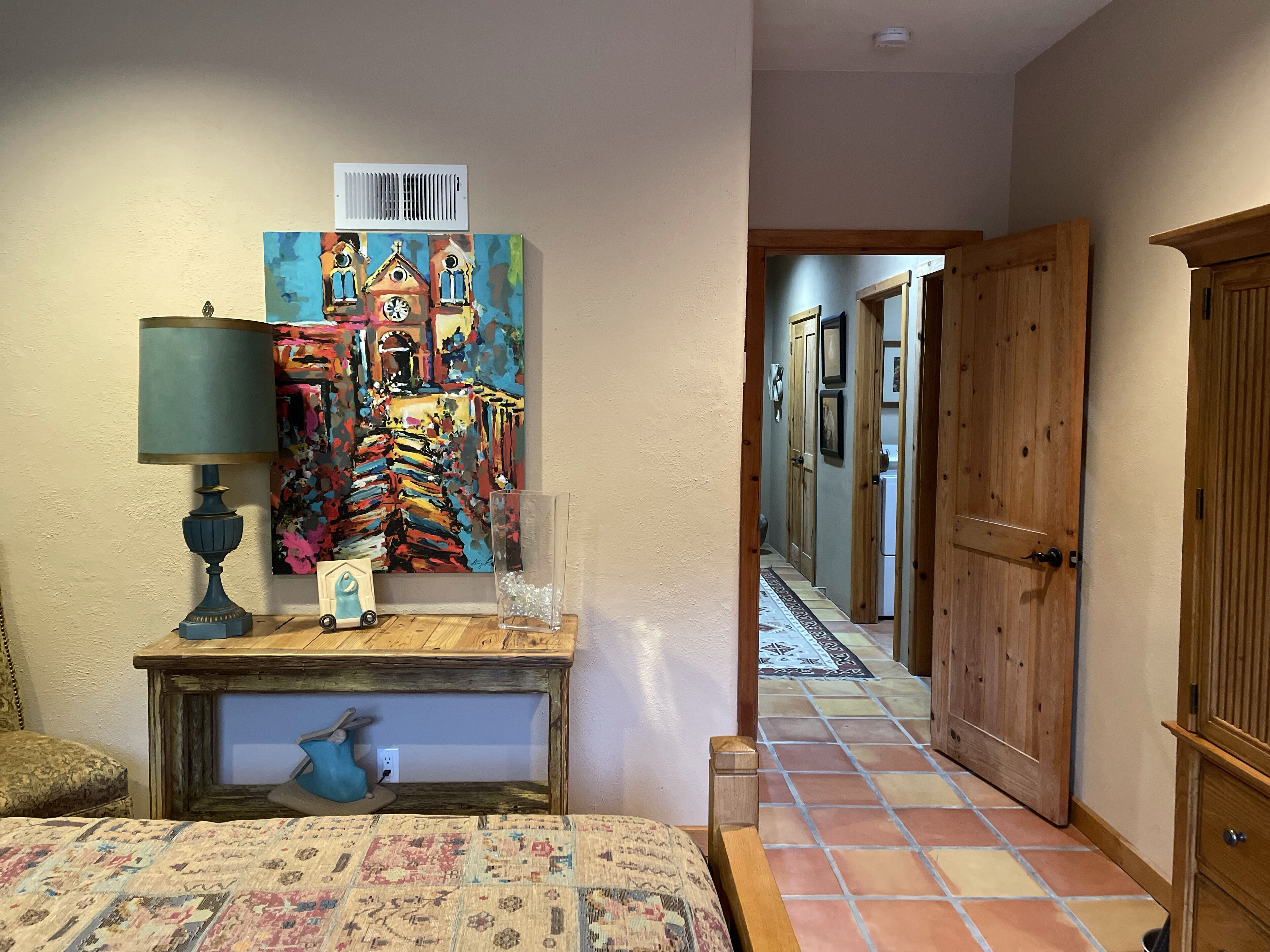 Placitas Magic-2 Bed/1 Bath Custom Santa Fe Home The home is a custom built, split-level Santa Fe Style home with 12 foot latillas & vigas ceilings, kiva fireplace, and saltillo tile and brick floors throughout. There is a covered Portal for relaxing, outdoor fire pit, and huge windows for taking in the big mountain views. The home has an open plan with contemporary furnishings and outstanding art and sculptures purchased from local artists and galleries. This is no ordinary rental, but a stylish, beautifully furnished personal home filled with quality furnishings, art, and treasures The spaceI have a 6 acre property at the end of a single lane road where my custom built, split-level Santa Fe home is nestled into the mountainside. There is a separate 1000 sq. ft. casita behind the house on the 6 acre property with its own private road. There is a wrap around courtyard around the home and stone staircases built into the terrain which makes the property interesting to explore. The home is built into the hill which makes it extra quiet and helps to keep it cool in the summer and warm in the winter months.