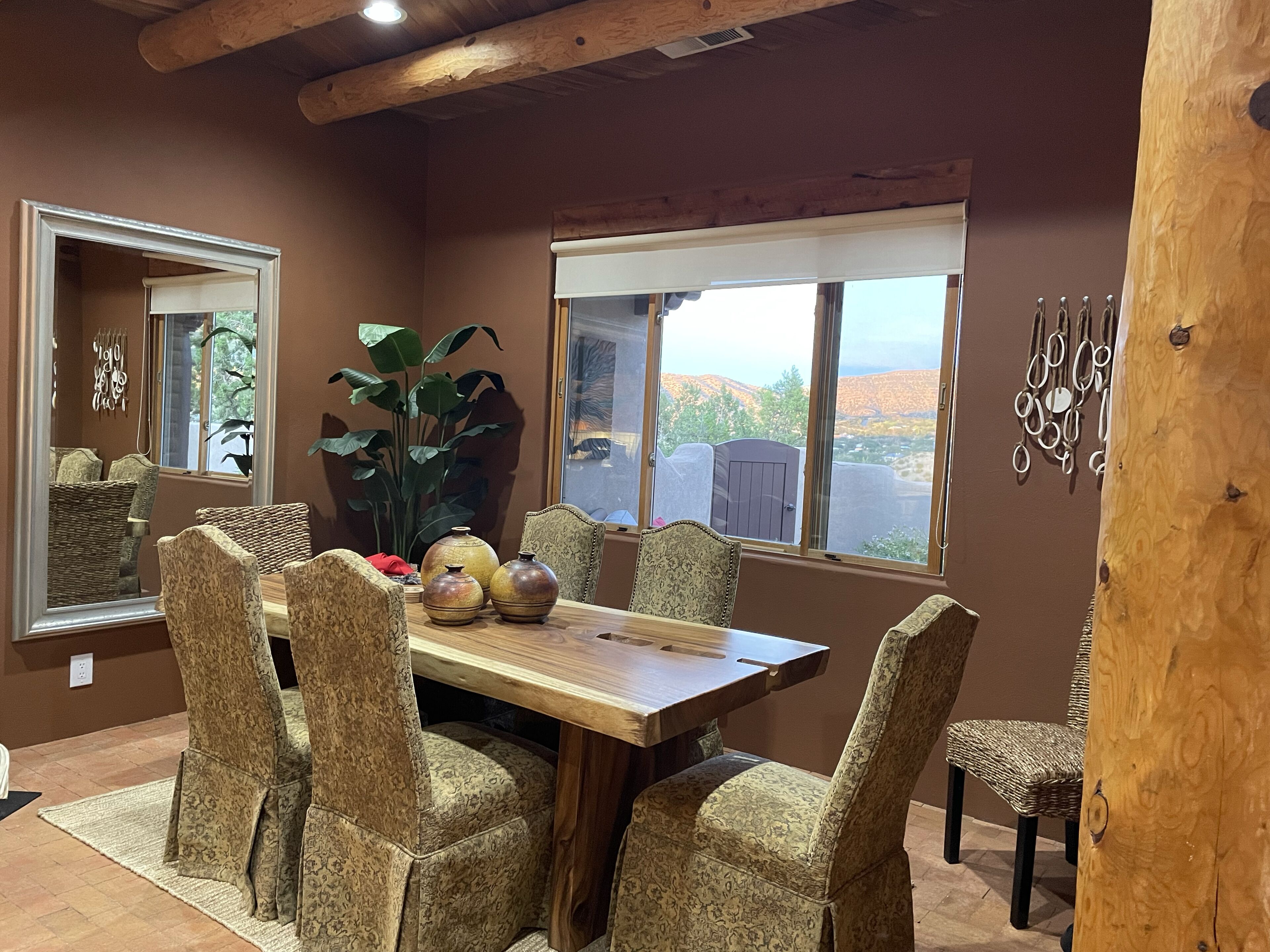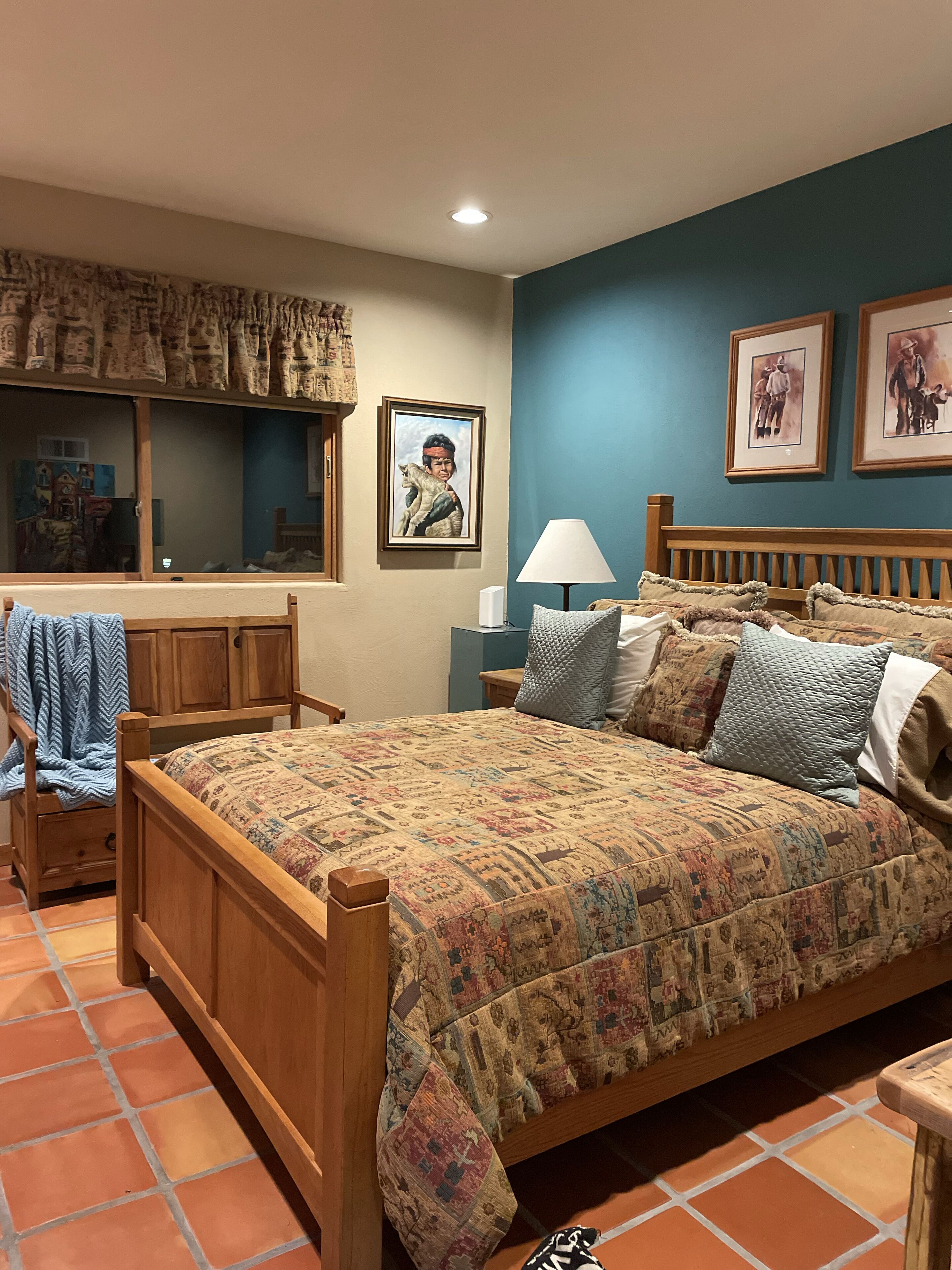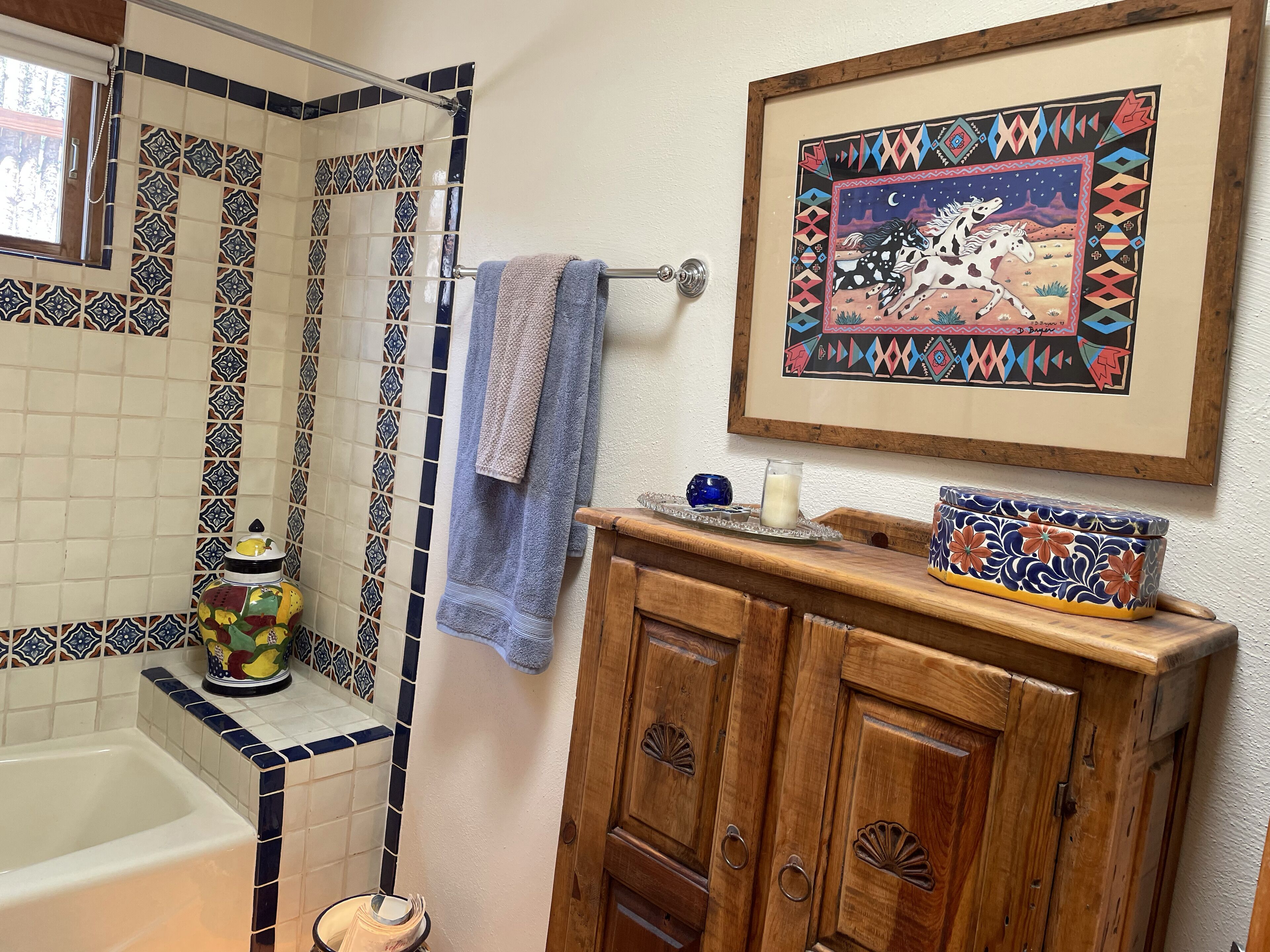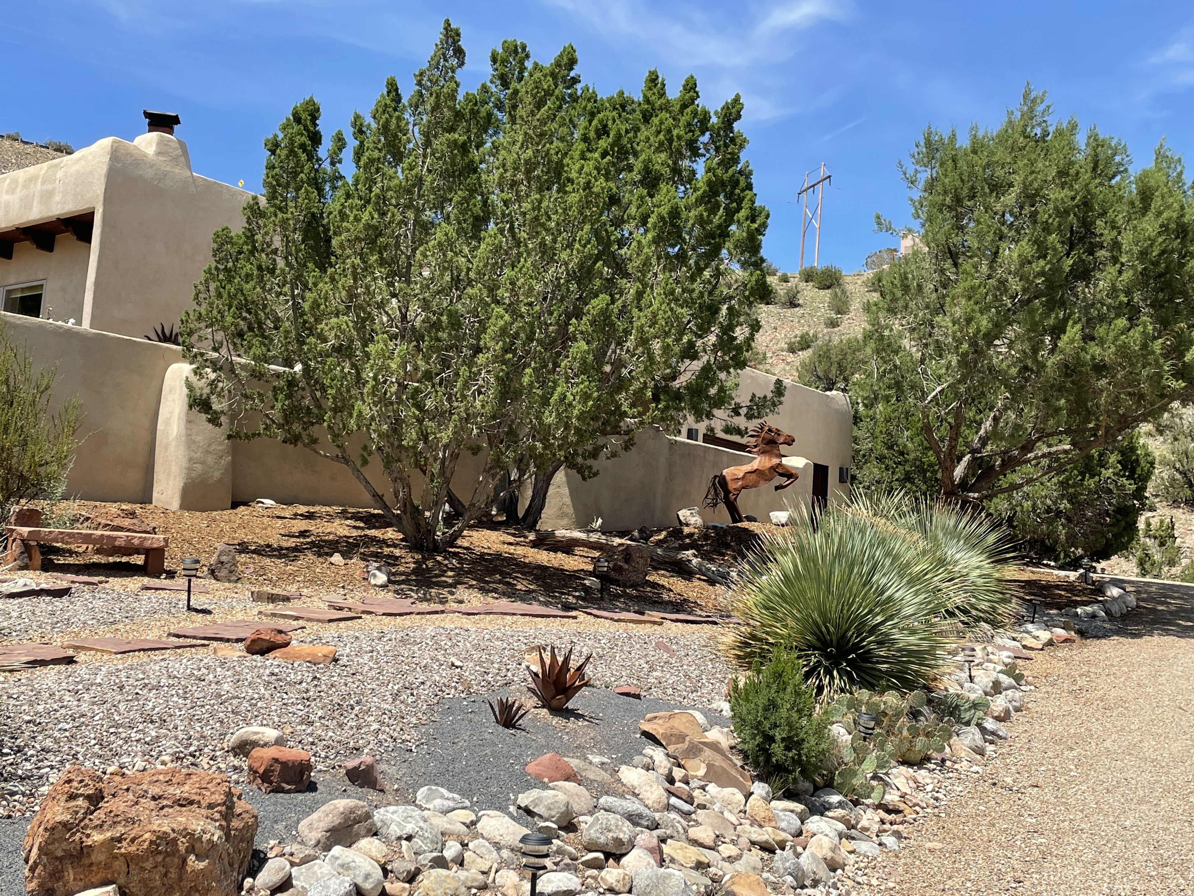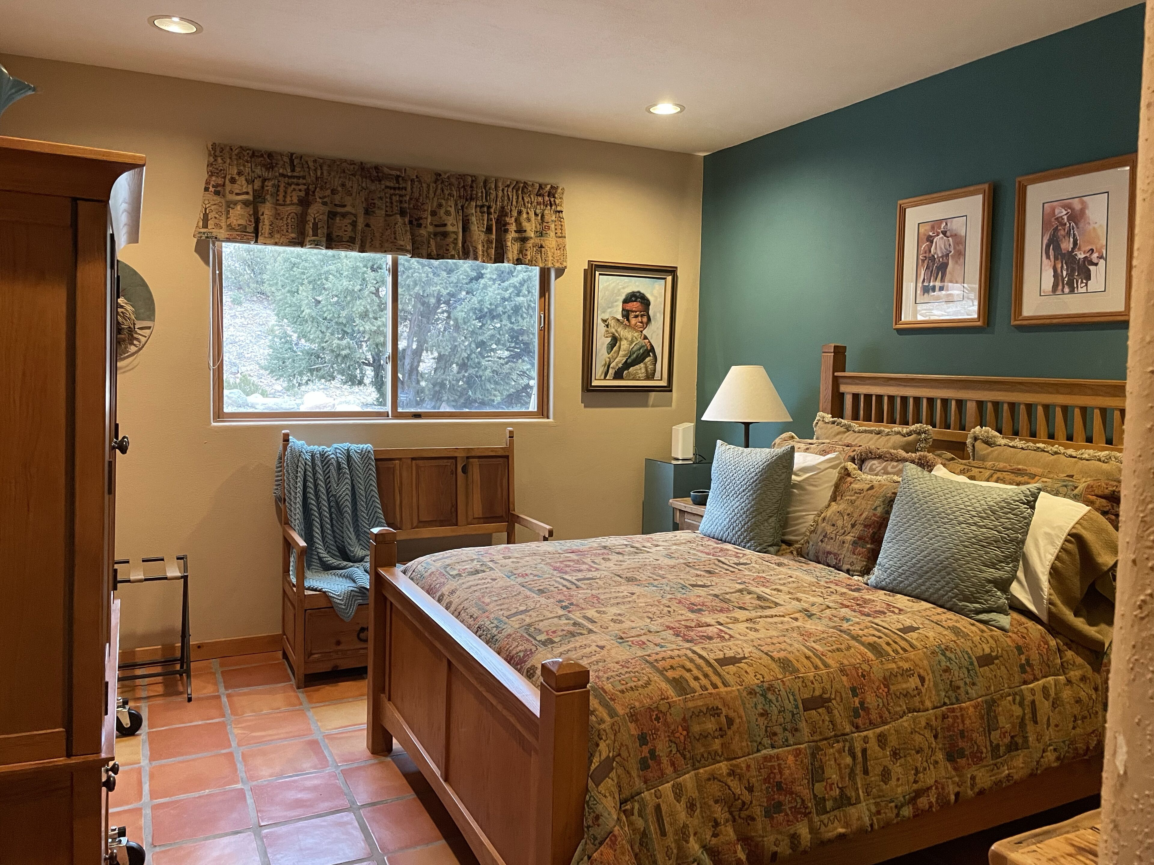Placitas Magic-2 Bed/1 Bath Custom Santa Fe Home The home is a custom built, split-level Santa Fe Style home with 12 foot latillas & vigas ceilings, kiva fireplace, and saltillo tile and brick floors throughout. There is a covered Portal for relaxing, outdoor fire pit, and huge windows for taking in the big mountain views. The home has an open plan with contemporary furnishings and outstanding art and sculptures purchased from local artists and galleries. This is no ordinary rental, but a stylish, beautifully furnished personal home filled with quality furnishings, art, and treasures The spaceI have a 6 acre property at the end of a single lane road where my custom built, split-level Santa Fe home is nestled into the mountainside. There is a separate 1000 sq. ft. casita behind the house on the 6 acre property with its own private road. There is a wrap around courtyard around the home and stone staircases built into the terrain which makes the property interesting to explore. The home is built into the hill which makes it extra quiet and helps to keep it cool in the summer and warm in the winter months.