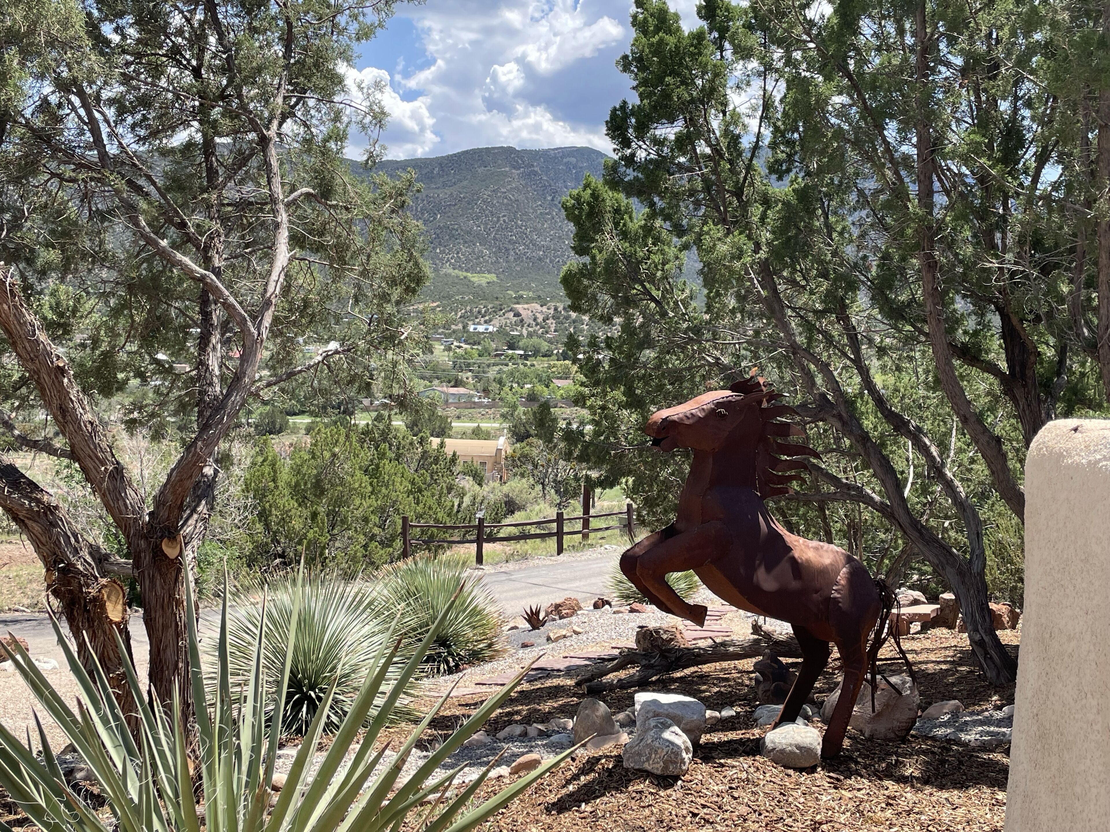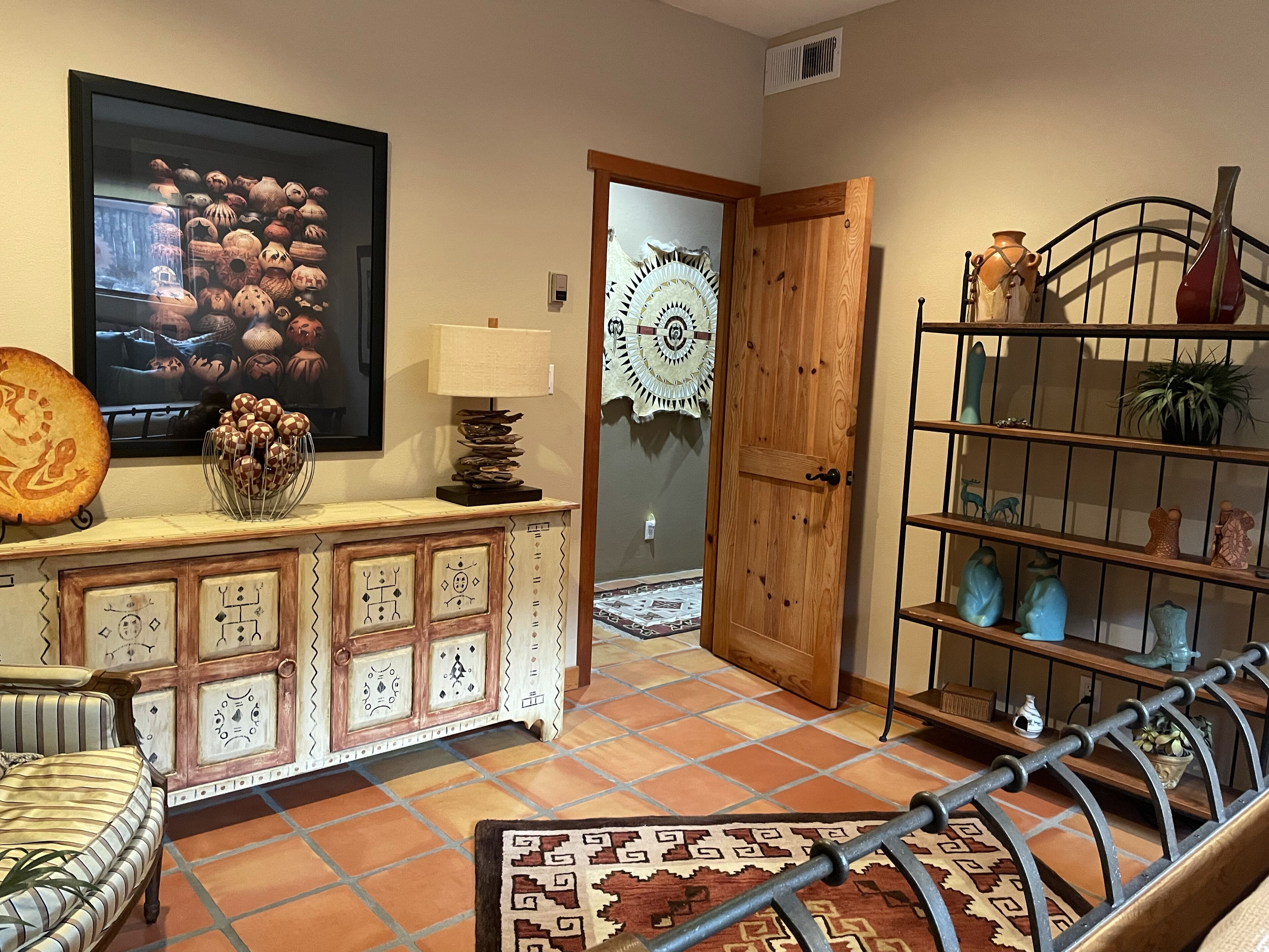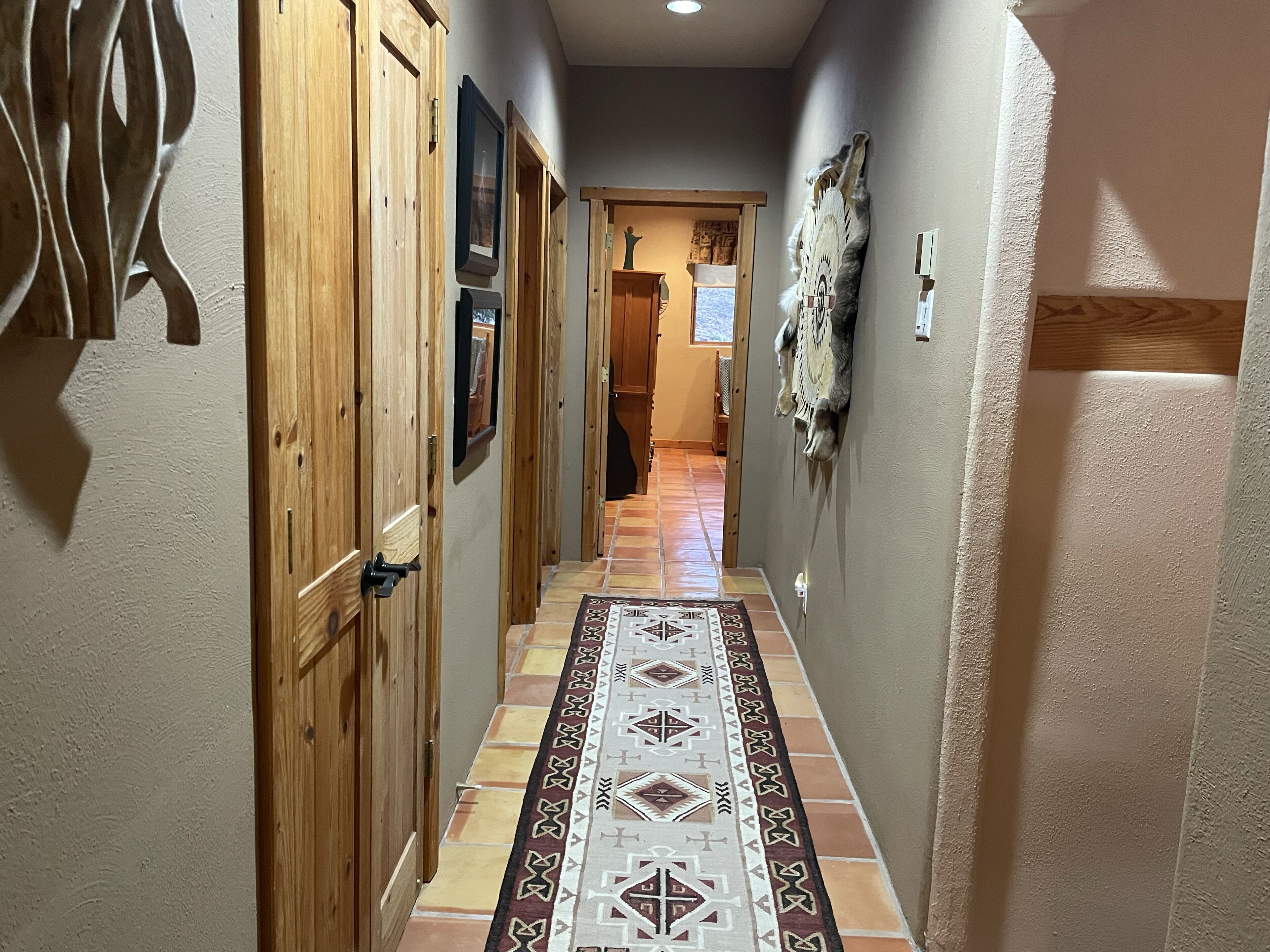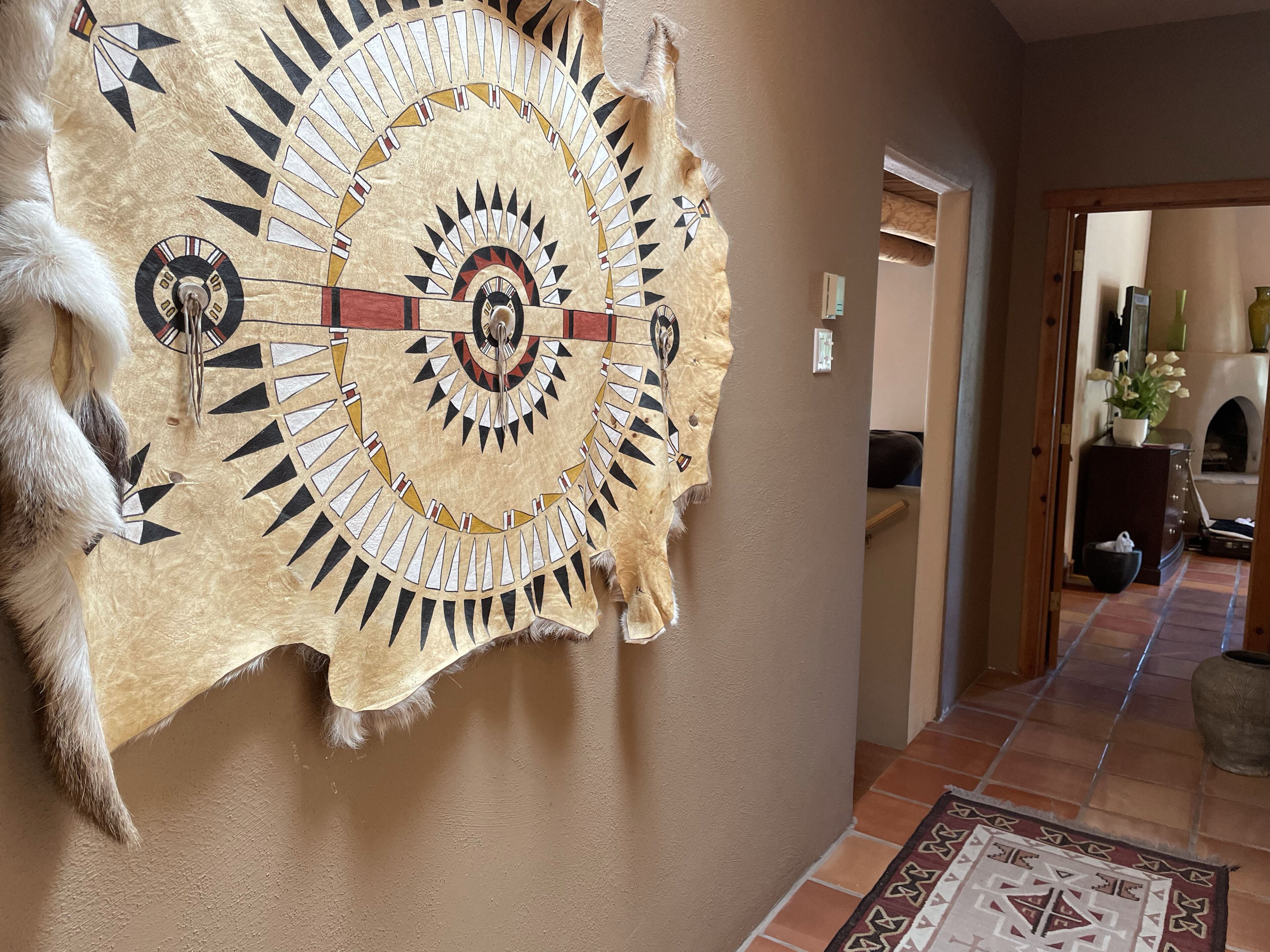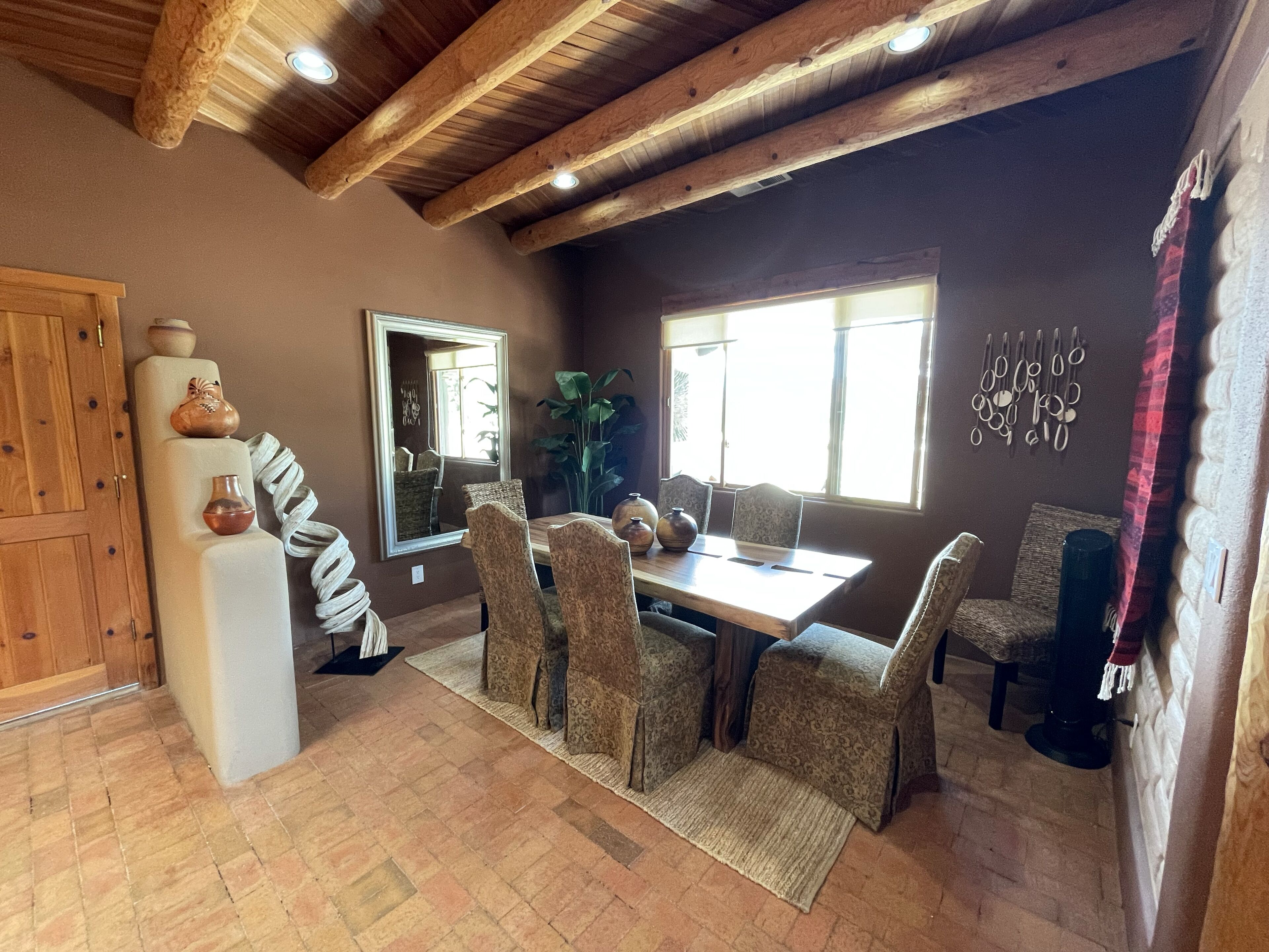 Placitas Magic-2 Bed/1 Bath Custom Santa Fe Home The home is a custom built, split-level Santa Fe Style home with 12 foot latillas & vigas ceilings, kiva fireplace, and saltillo tile and brick floors throughout. There is a covered Portal for relaxing, outdoor fire pit, and huge windows for taking in the big mountain views. The home has an open plan with contemporary furnishings and outstanding art and sculptures purchased from local artists and galleries. This is no ordinary rental, but a stylish, beautifully furnished personal home filled with quality furnishings, art, and treasures The spaceI have a 6 acre property at the end of a single lane road where my custom built, split-level Santa Fe home is nestled into the mountainside. There is a separate 1000 sq. ft. casita behind the house on the 6 acre property with its own private road. There is a wrap around courtyard around the home and stone staircases built into the terrain which makes the property interesting to explore. The home is built into the hill which makes it extra quiet and helps to keep it cool in the summer and warm in the winter months.