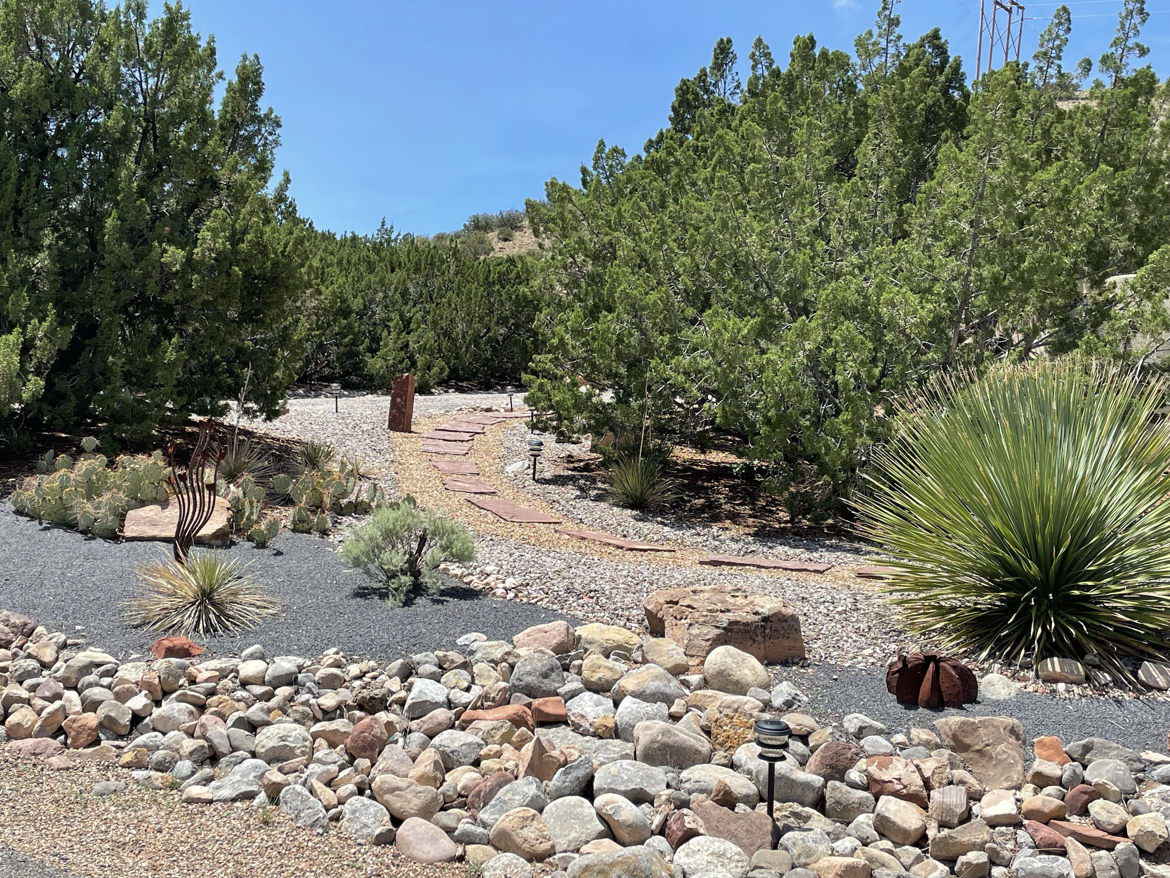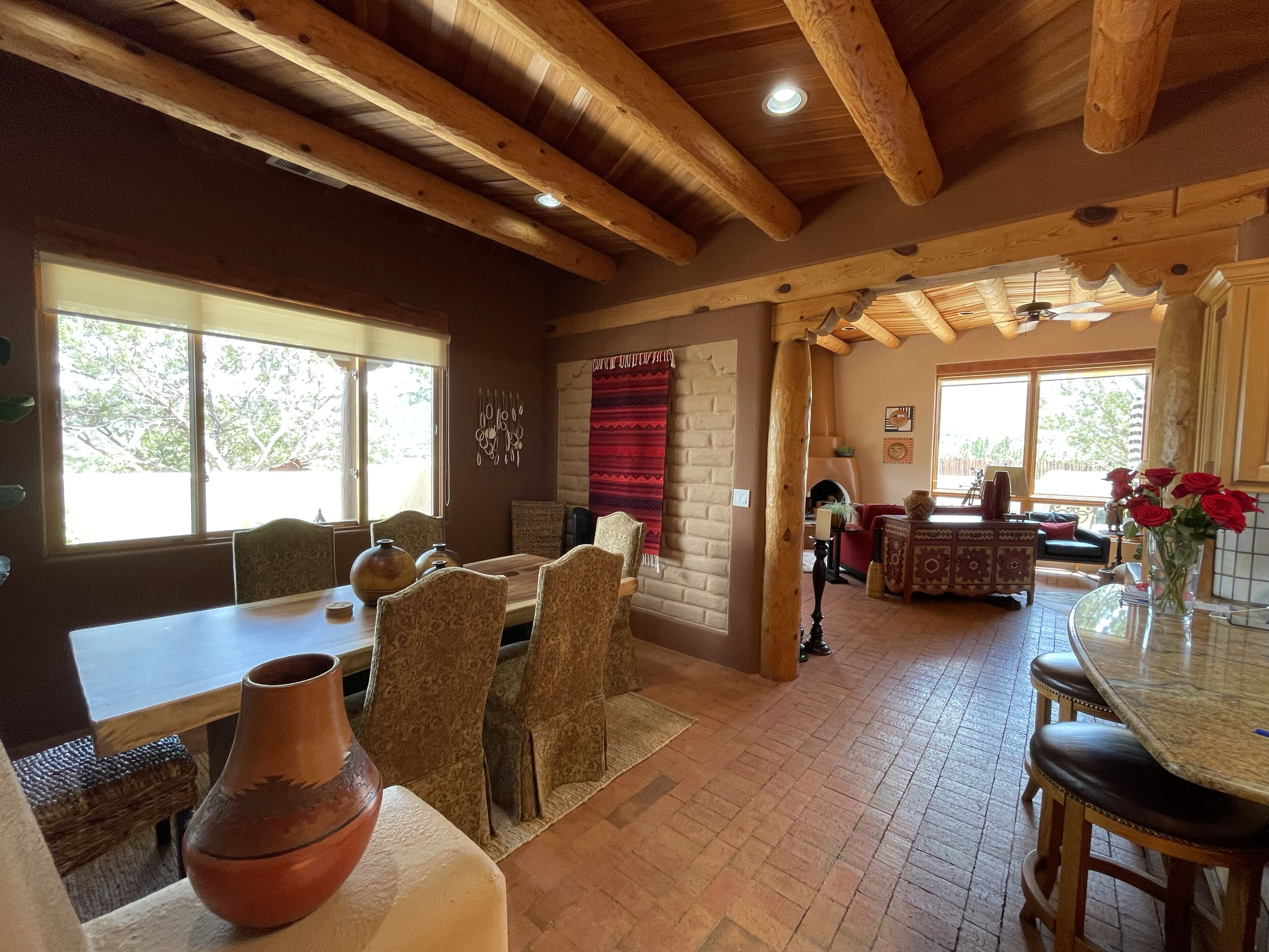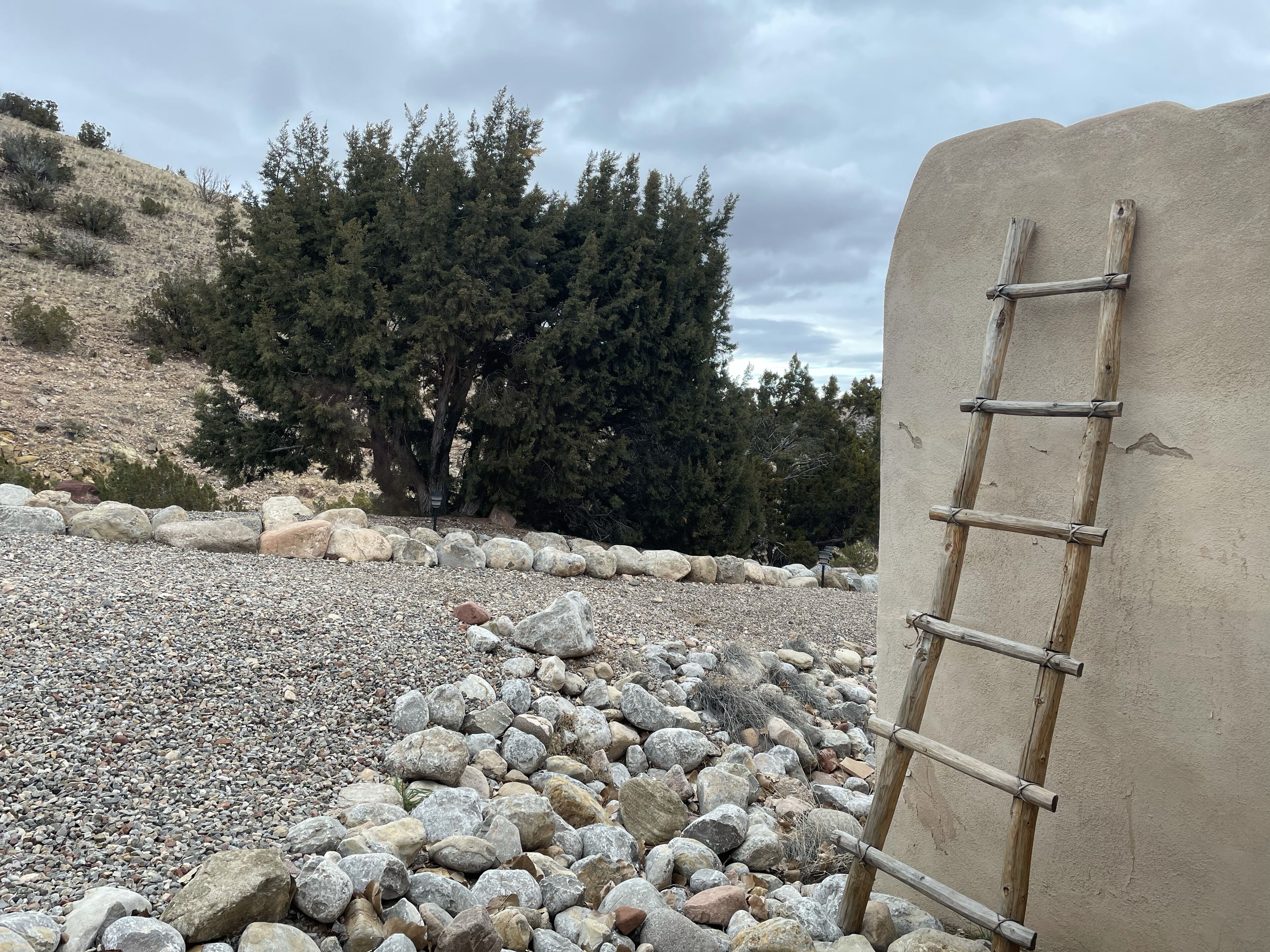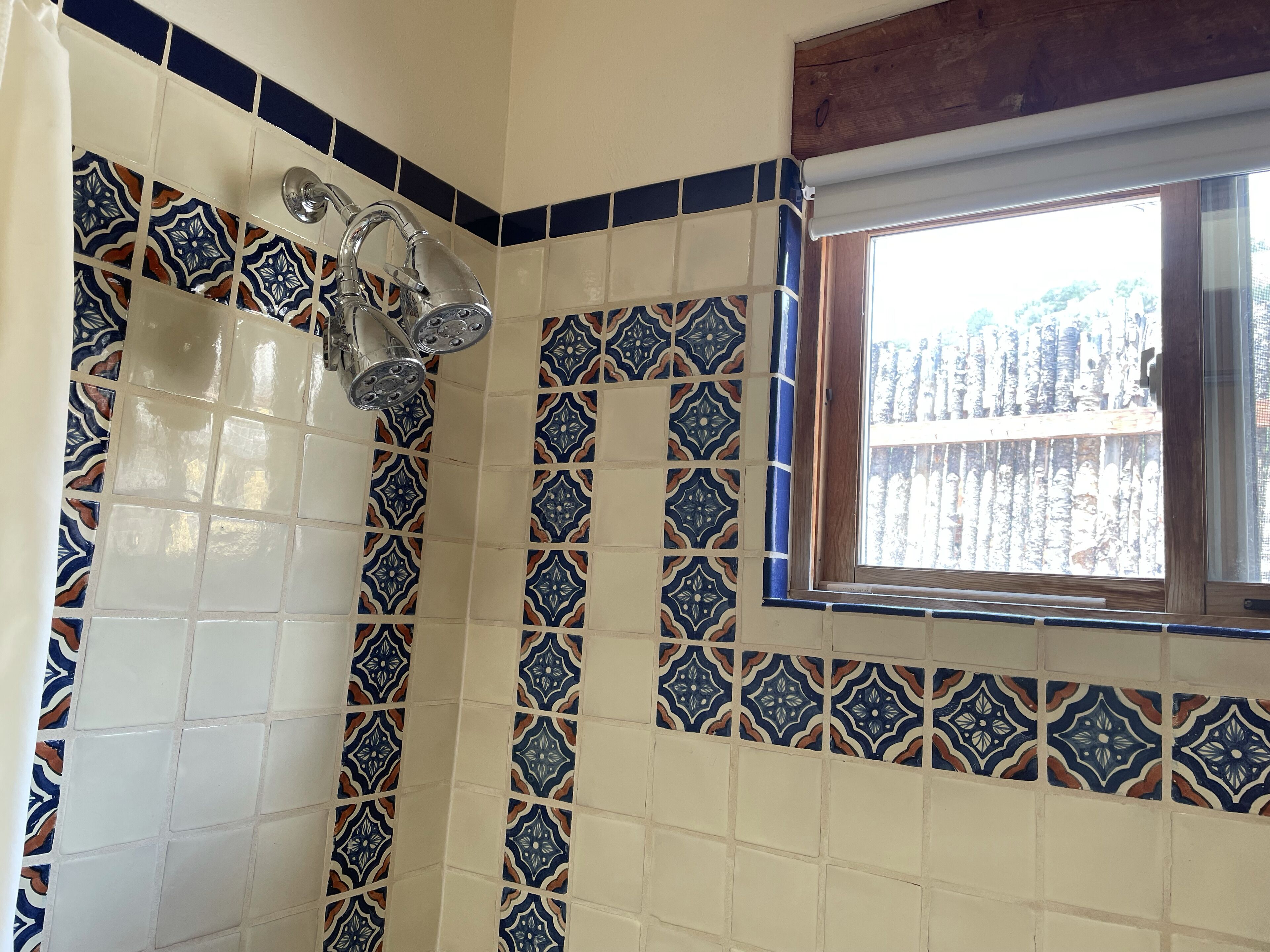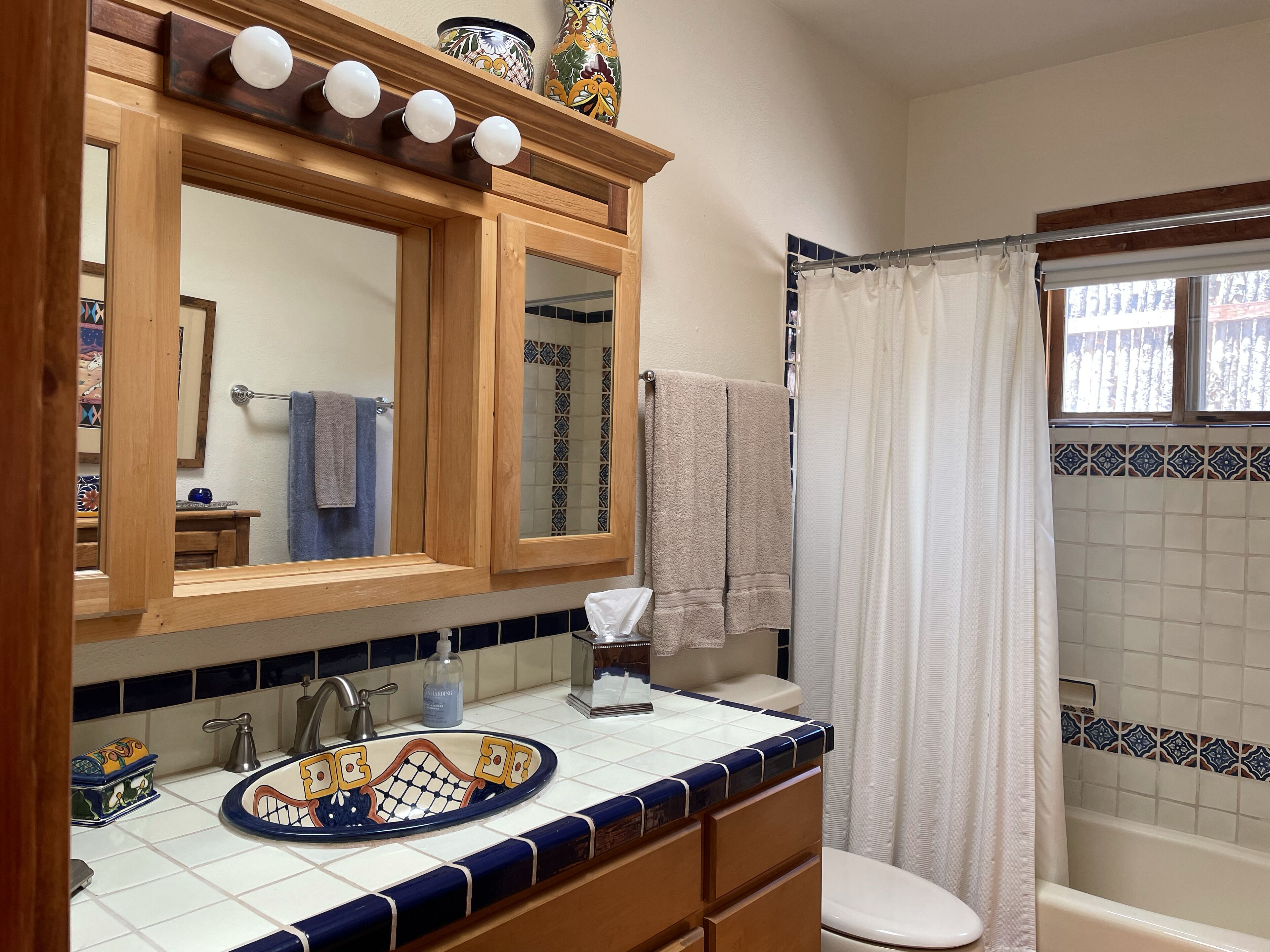 Placitas Magic-2 Bed/1 Bath Custom Santa Fe Home The home is a custom built, split-level Santa Fe Style home with 12 foot latillas & vigas ceilings, kiva fireplace, and saltillo tile and brick floors throughout. There is a covered Portal for relaxing, outdoor fire pit, and huge windows for taking in the big mountain views. The home has an open plan with contemporary furnishings and outstanding art and sculptures purchased from local artists and galleries. This is no ordinary rental, but a stylish, beautifully furnished personal home filled with quality furnishings, art, and treasures The spaceI have a 6 acre property at the end of a single lane road where my custom built, split-level Santa Fe home is nestled into the mountainside. There is a separate 1000 sq. ft. casita behind the house on the 6 acre property with its own private road. There is a wrap around courtyard around the home and stone staircases built into the terrain which makes the property interesting to explore. The home is built into the hill which makes it extra quiet and helps to keep it cool in the summer and warm in the winter months.