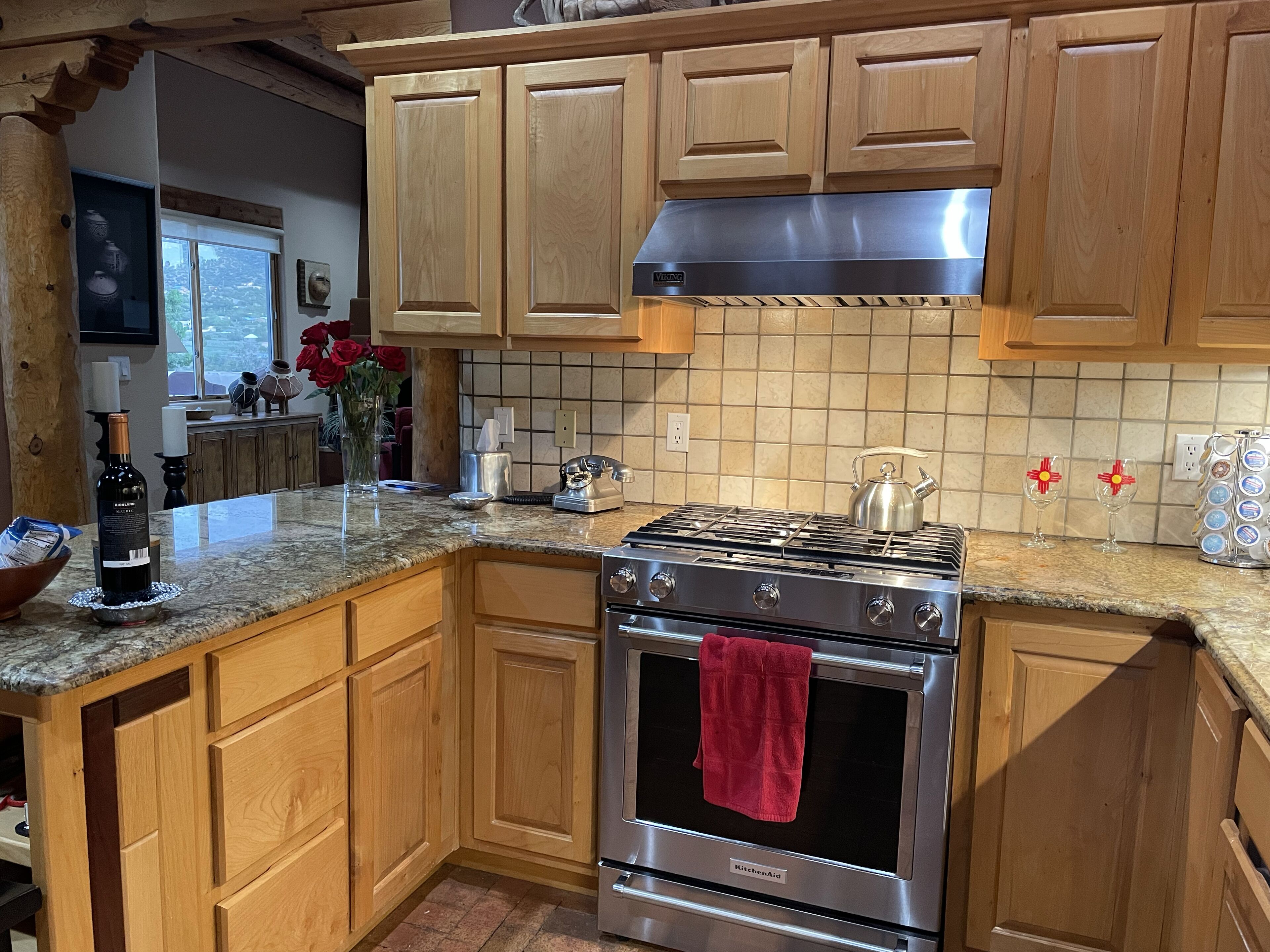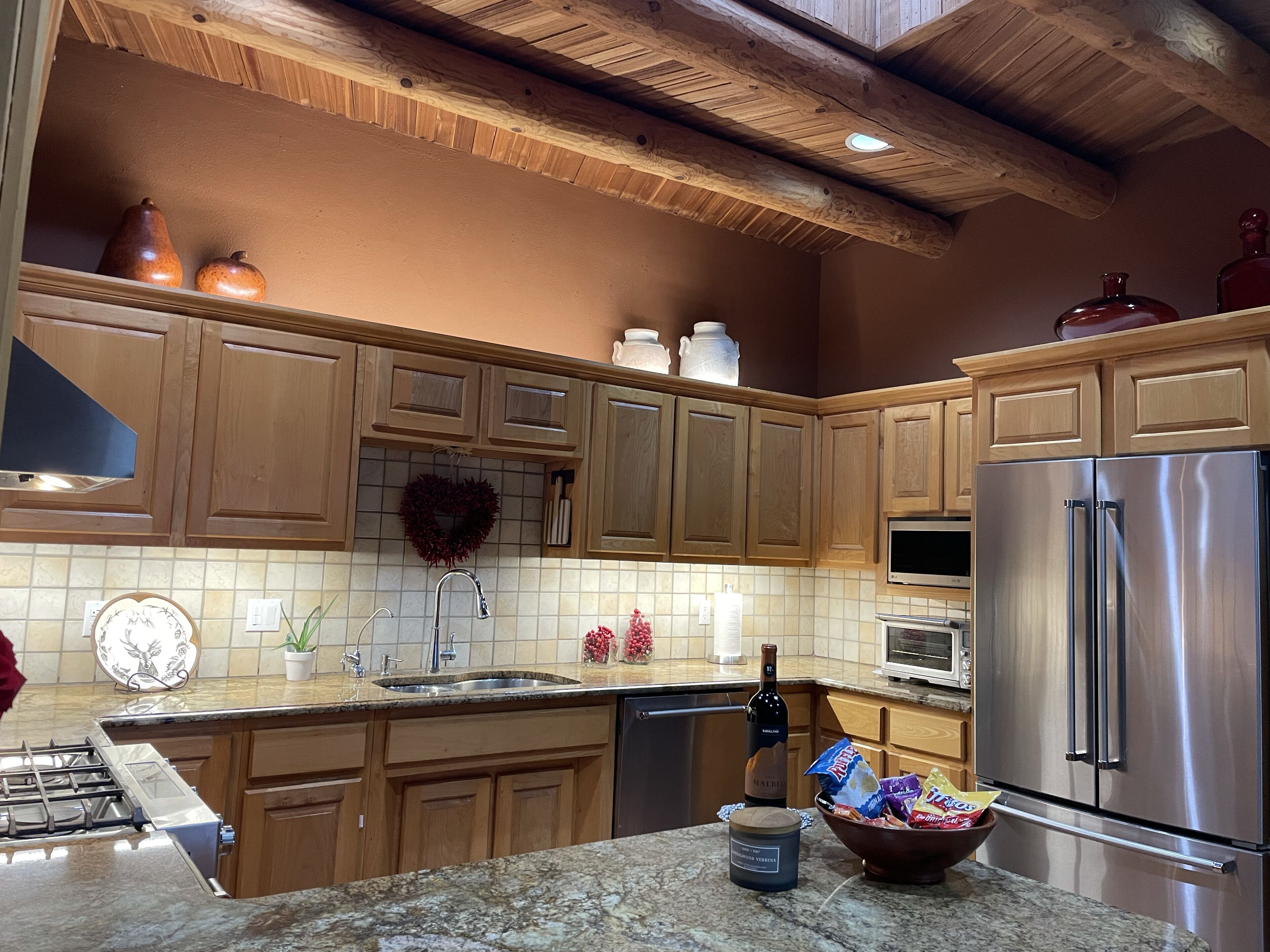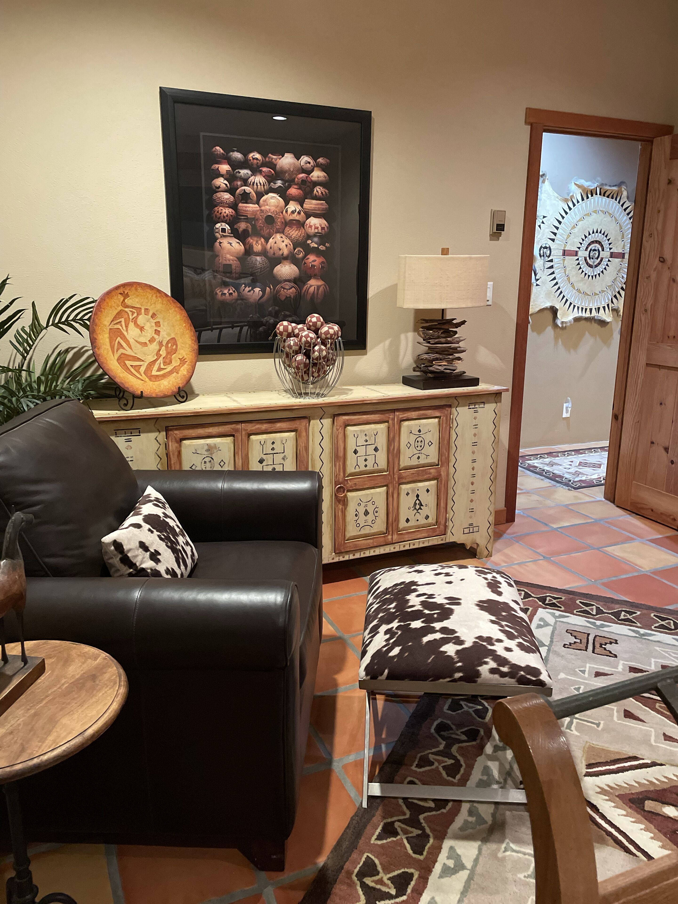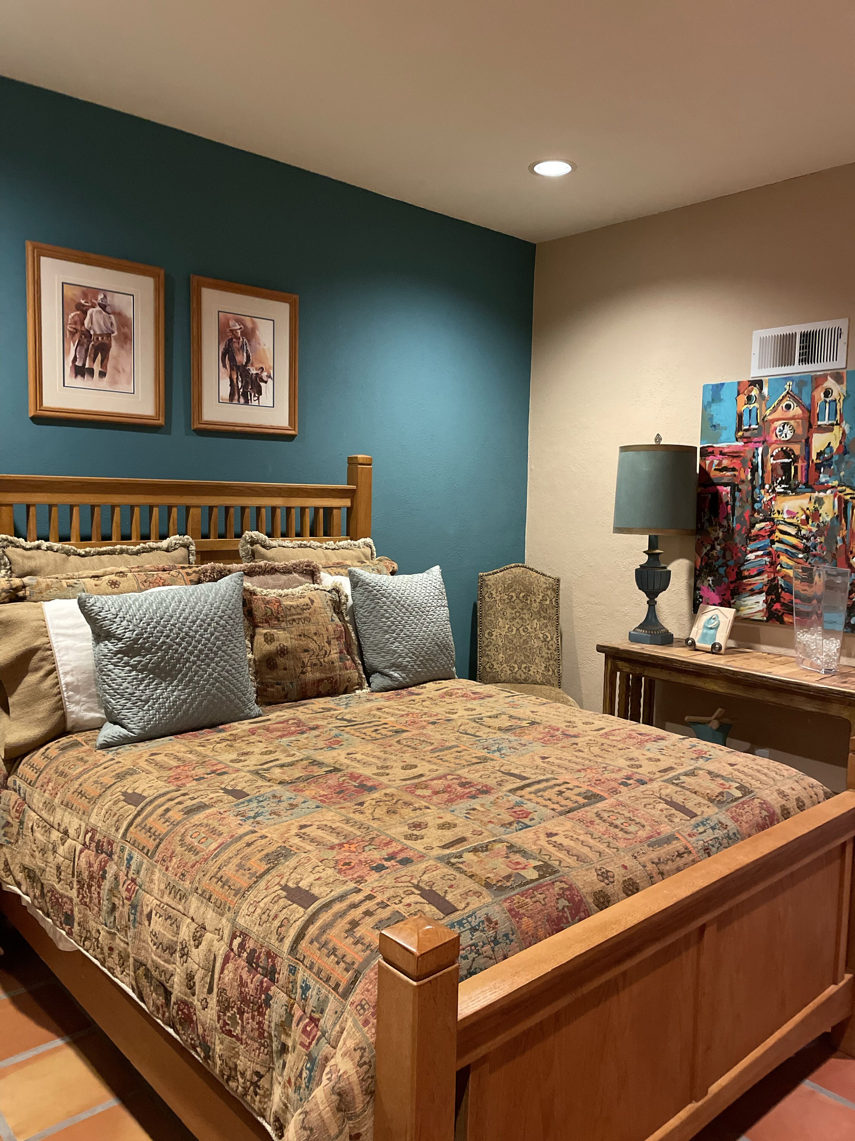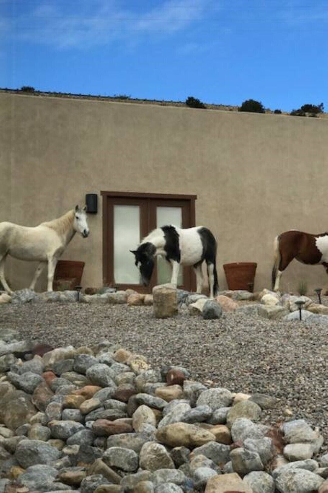 Placitas Magic-2 Bed/1 Bath Custom Santa Fe Home The home is a custom built, split-level Santa Fe Style home with 12 foot latillas & vigas ceilings, kiva fireplace, and saltillo tile and brick floors throughout. There is a covered Portal for relaxing, outdoor fire pit, and huge windows for taking in the big mountain views. The home has an open plan with contemporary furnishings and outstanding art and sculptures purchased from local artists and galleries. This is no ordinary rental, but a stylish, beautifully furnished personal home filled with quality furnishings, art, and treasures The spaceI have a 6 acre property at the end of a single lane road where my custom built, split-level Santa Fe home is nestled into the mountainside. There is a separate 1000 sq. ft. casita behind the house on the 6 acre property with its own private road. There is a wrap around courtyard around the home and stone staircases built into the terrain which makes the property interesting to explore. The home is built into the hill which makes it extra quiet and helps to keep it cool in the summer and warm in the winter months.
