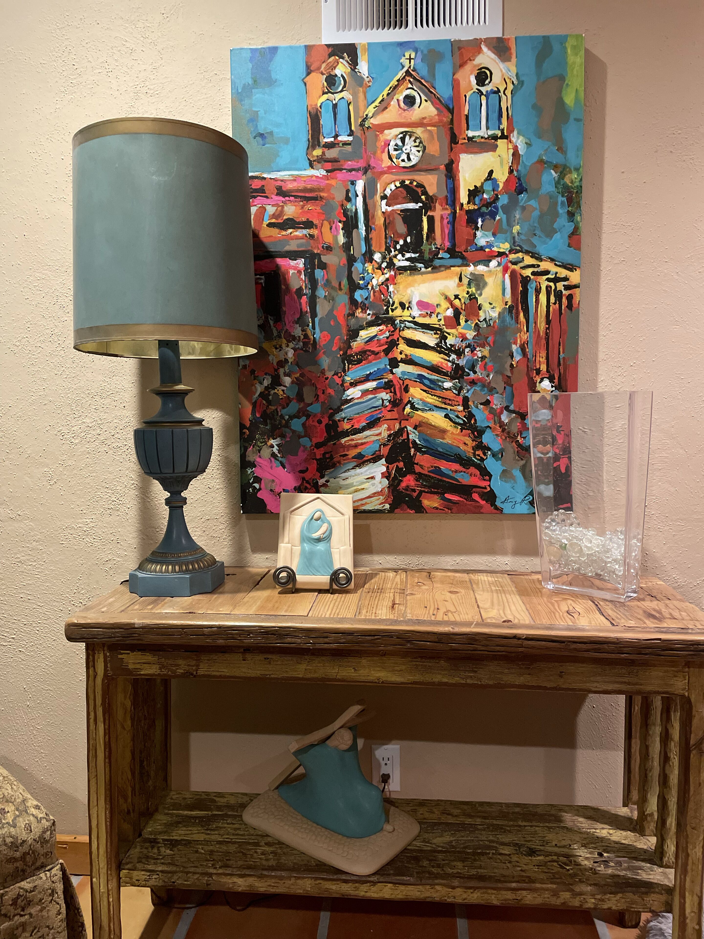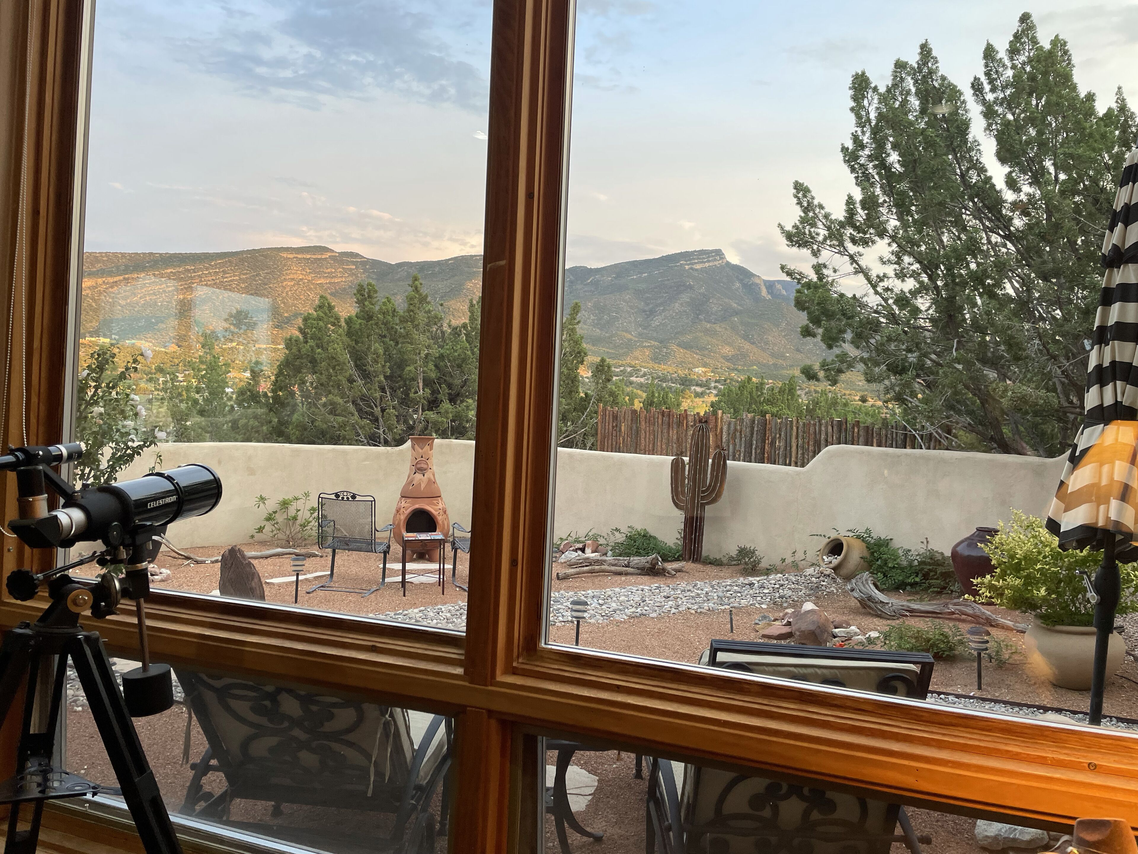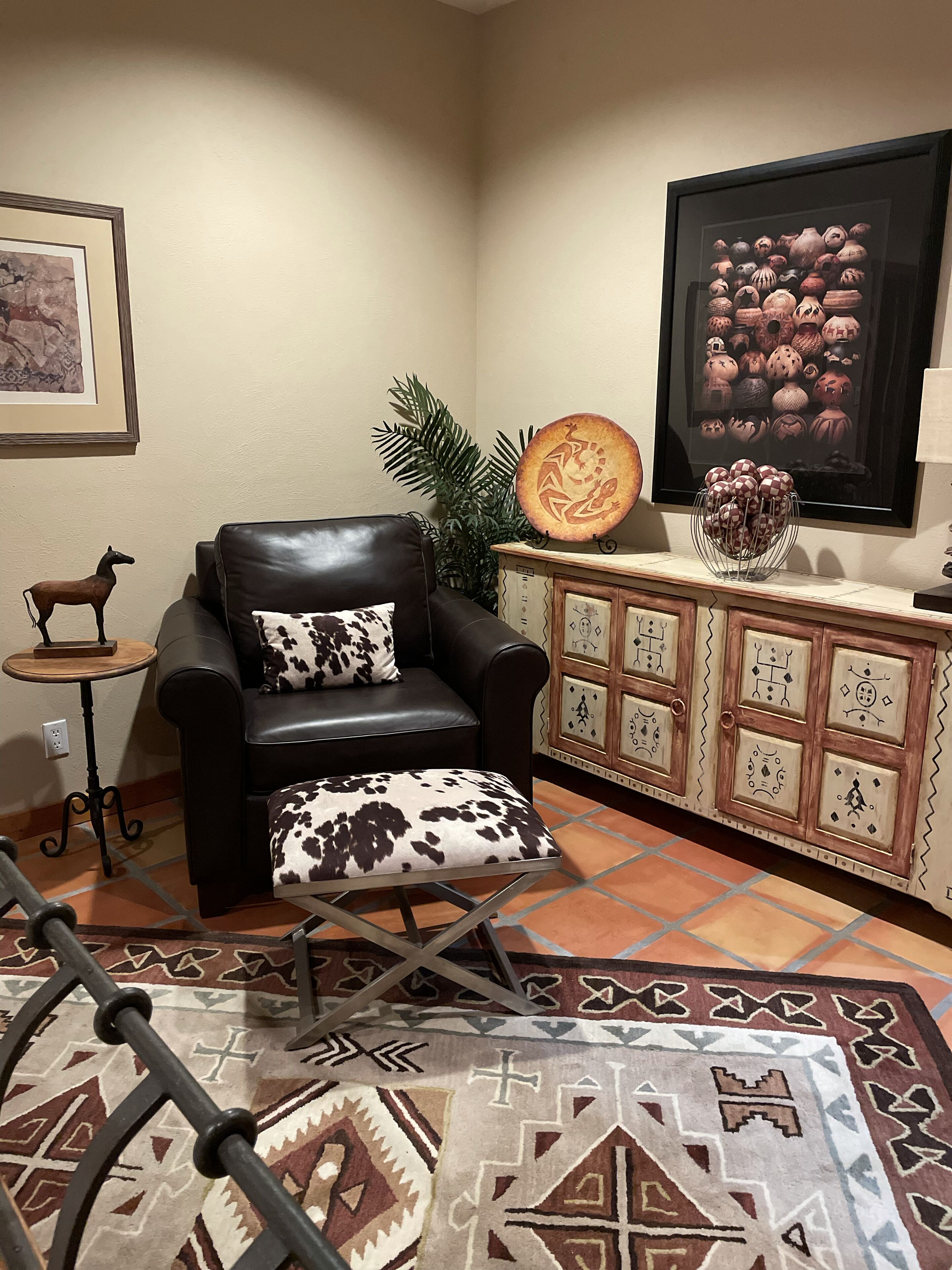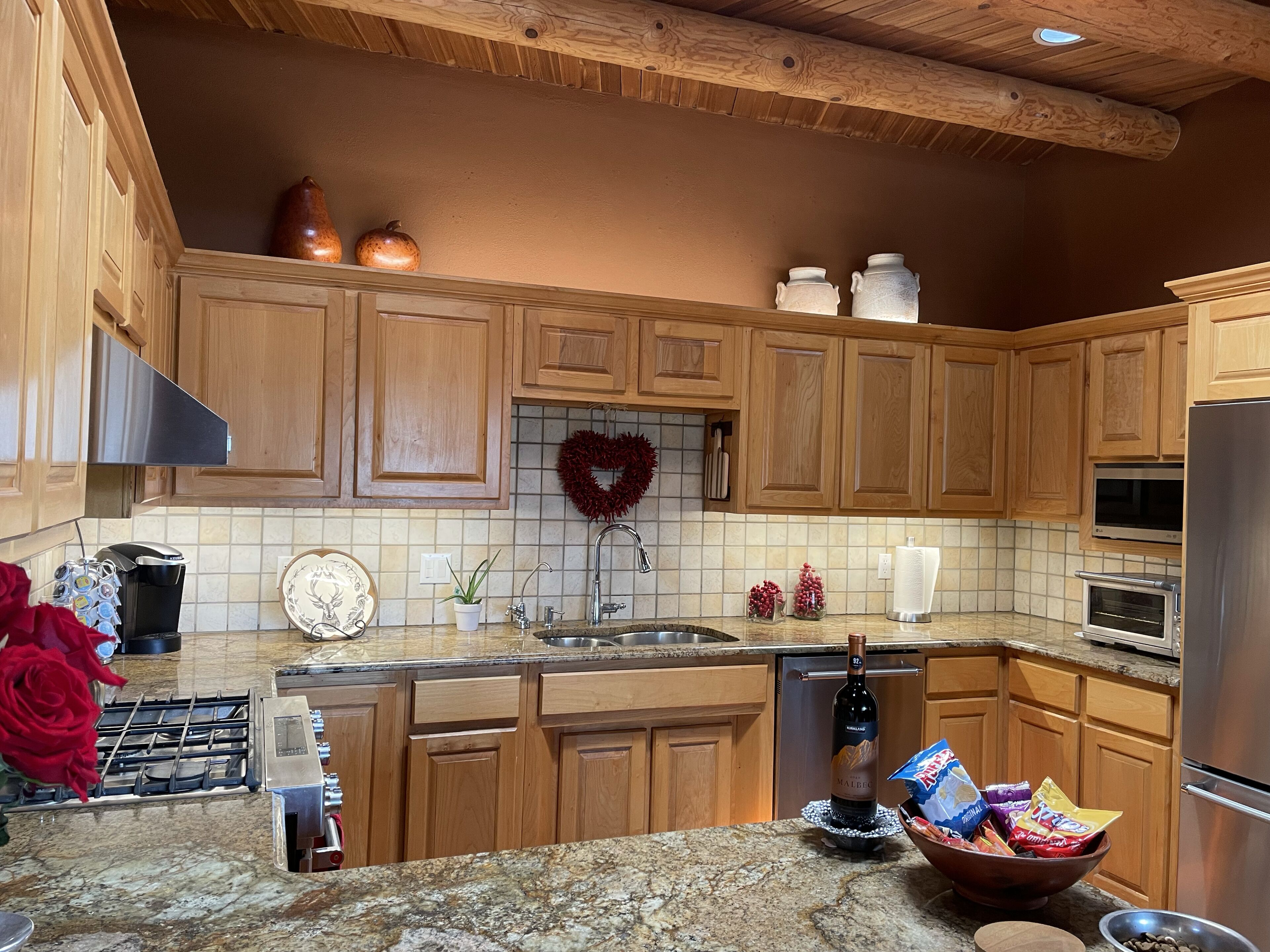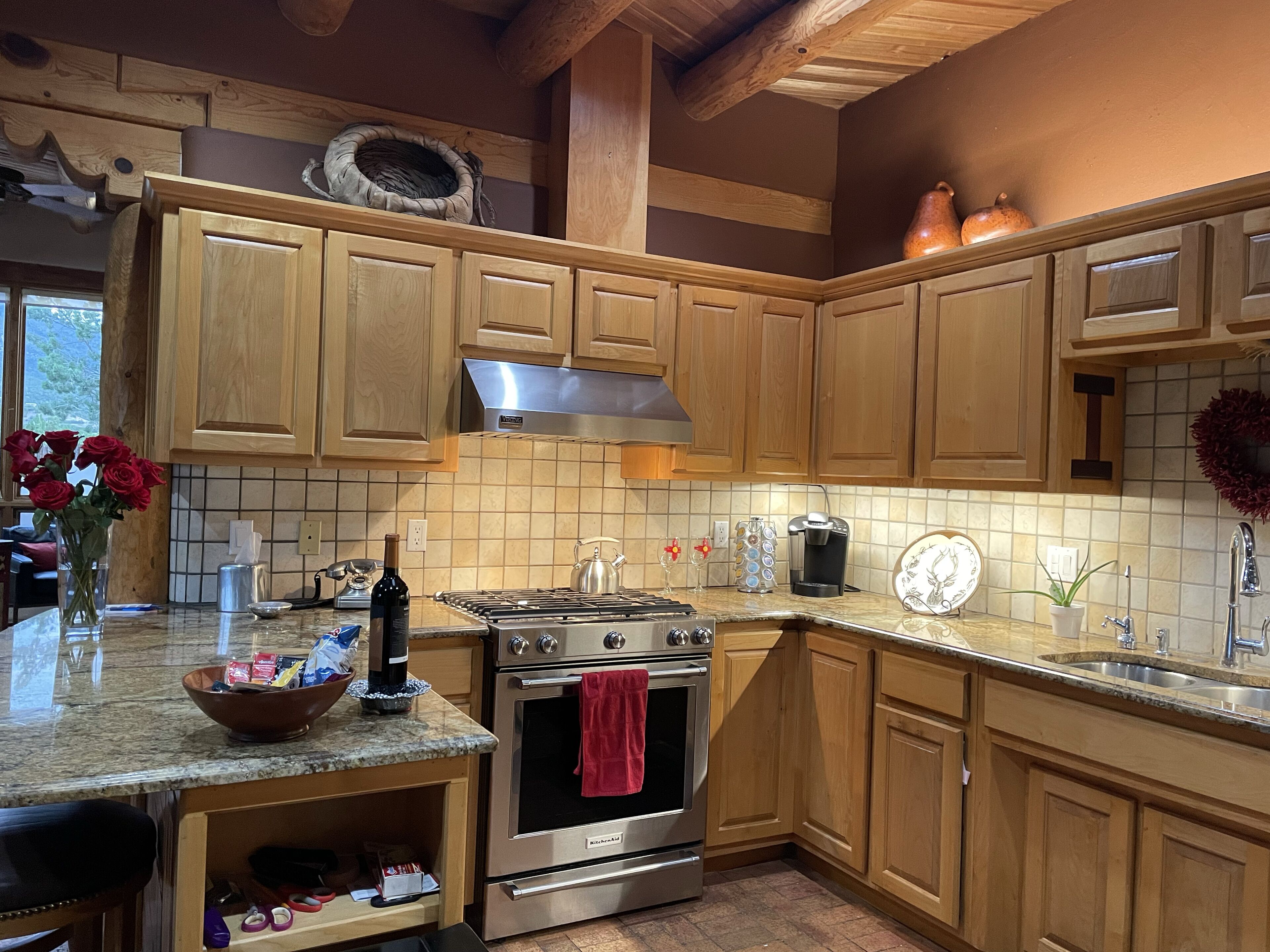 Placitas Magic-2 Bed/1 Bath Custom Santa Fe Home The home is a custom built, split-level Santa Fe Style home with 12 foot latillas & vigas ceilings, kiva fireplace, and saltillo tile and brick floors throughout. There is a covered Portal for relaxing, outdoor fire pit, and huge windows for taking in the big mountain views. The home has an open plan with contemporary furnishings and outstanding art and sculptures purchased from local artists and galleries. This is no ordinary rental, but a stylish, beautifully furnished personal home filled with quality furnishings, art, and treasures The spaceI have a 6 acre property at the end of a single lane road where my custom built, split-level Santa Fe home is nestled into the mountainside. There is a separate 1000 sq. ft. casita behind the house on the 6 acre property with its own private road. There is a wrap around courtyard around the home and stone staircases built into the terrain which makes the property interesting to explore. The home is built into the hill which makes it extra quiet and helps to keep it cool in the summer and warm in the winter months.