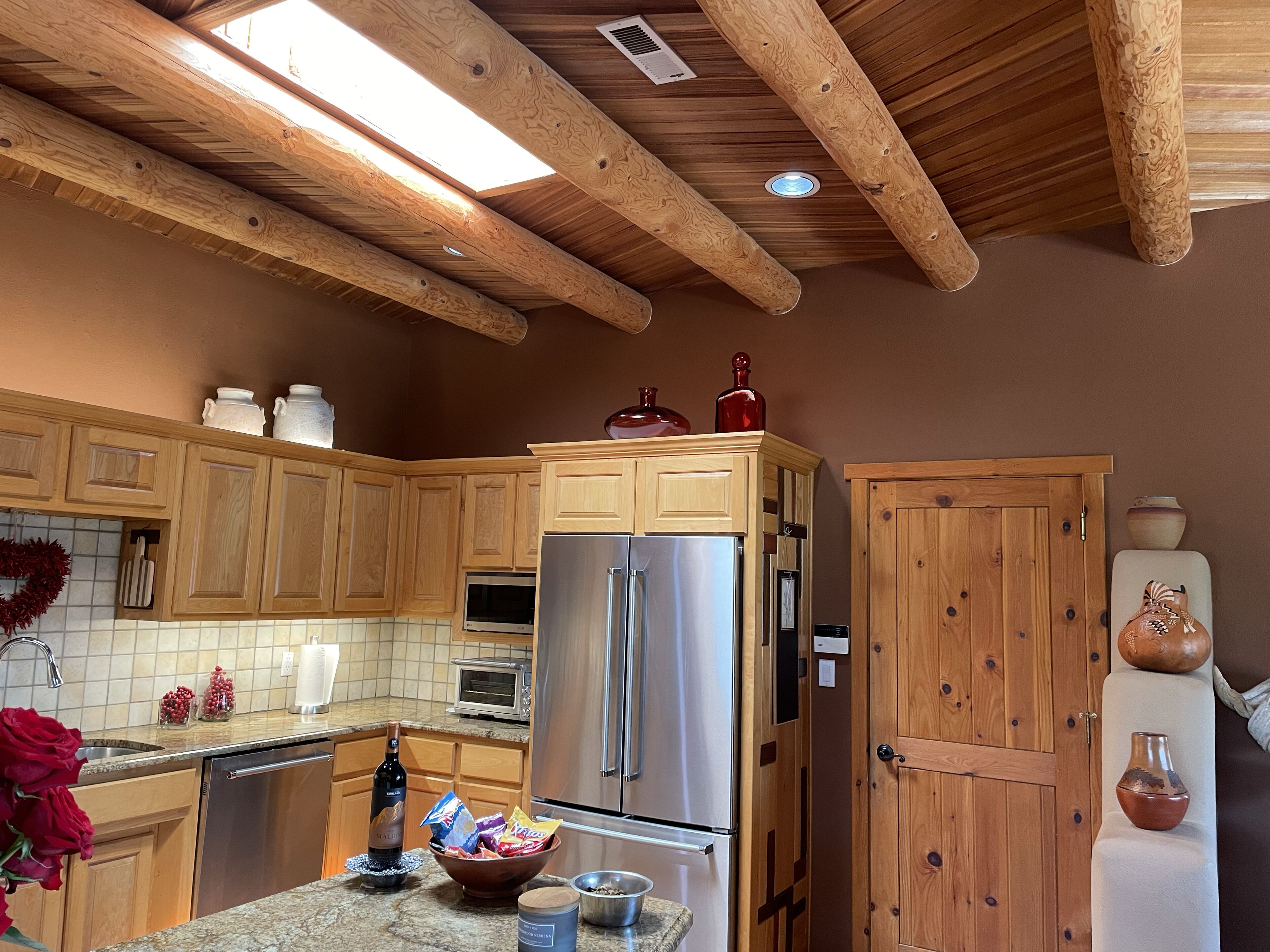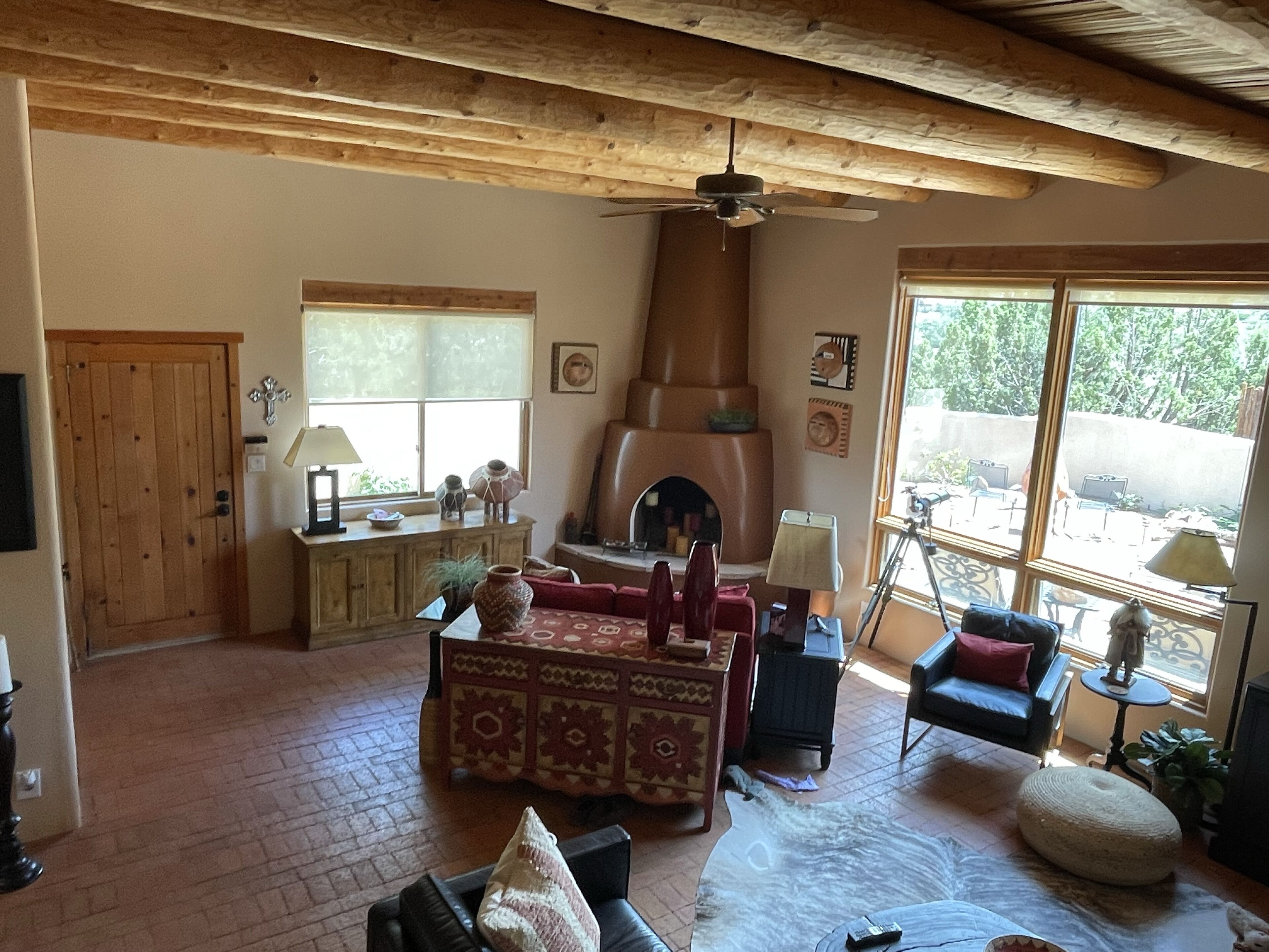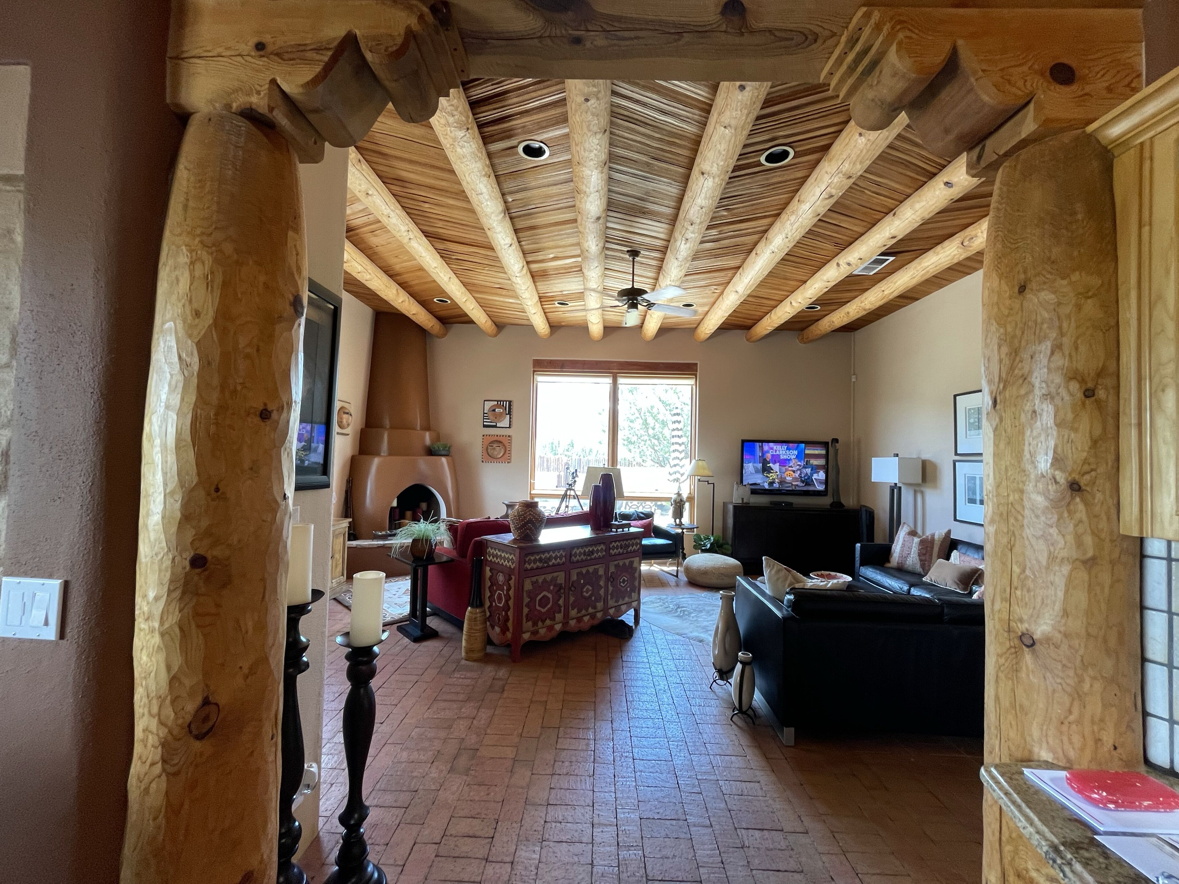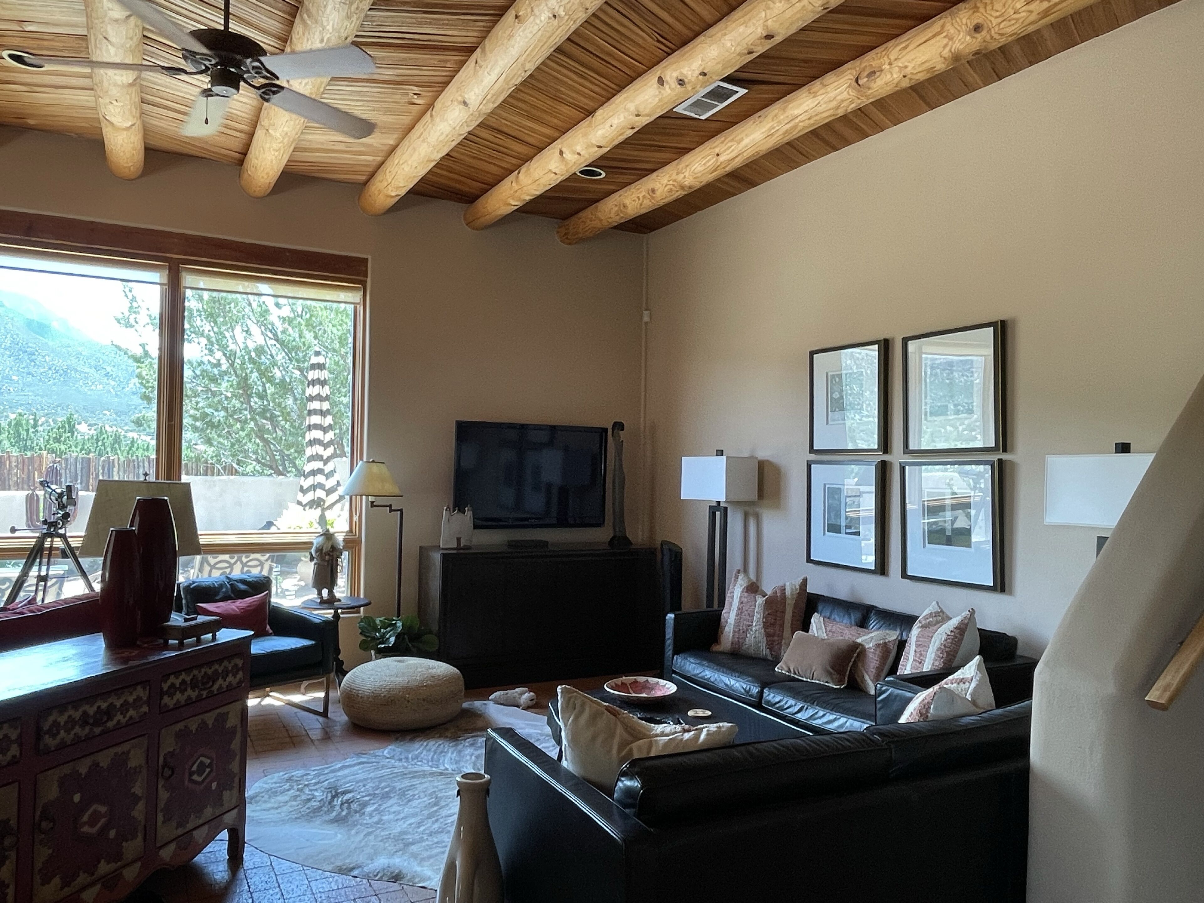 Placitas Magic-2 Bed/1 Bath Custom Santa Fe Home The home is a custom built, split-level Santa Fe Style home with 12 foot latillas & vigas ceilings, kiva fireplace, and saltillo tile and brick floors throughout. There is a covered Portal for relaxing, outdoor fire pit, and huge windows for taking in the big mountain views. The home has an open plan with contemporary furnishings and outstanding art...