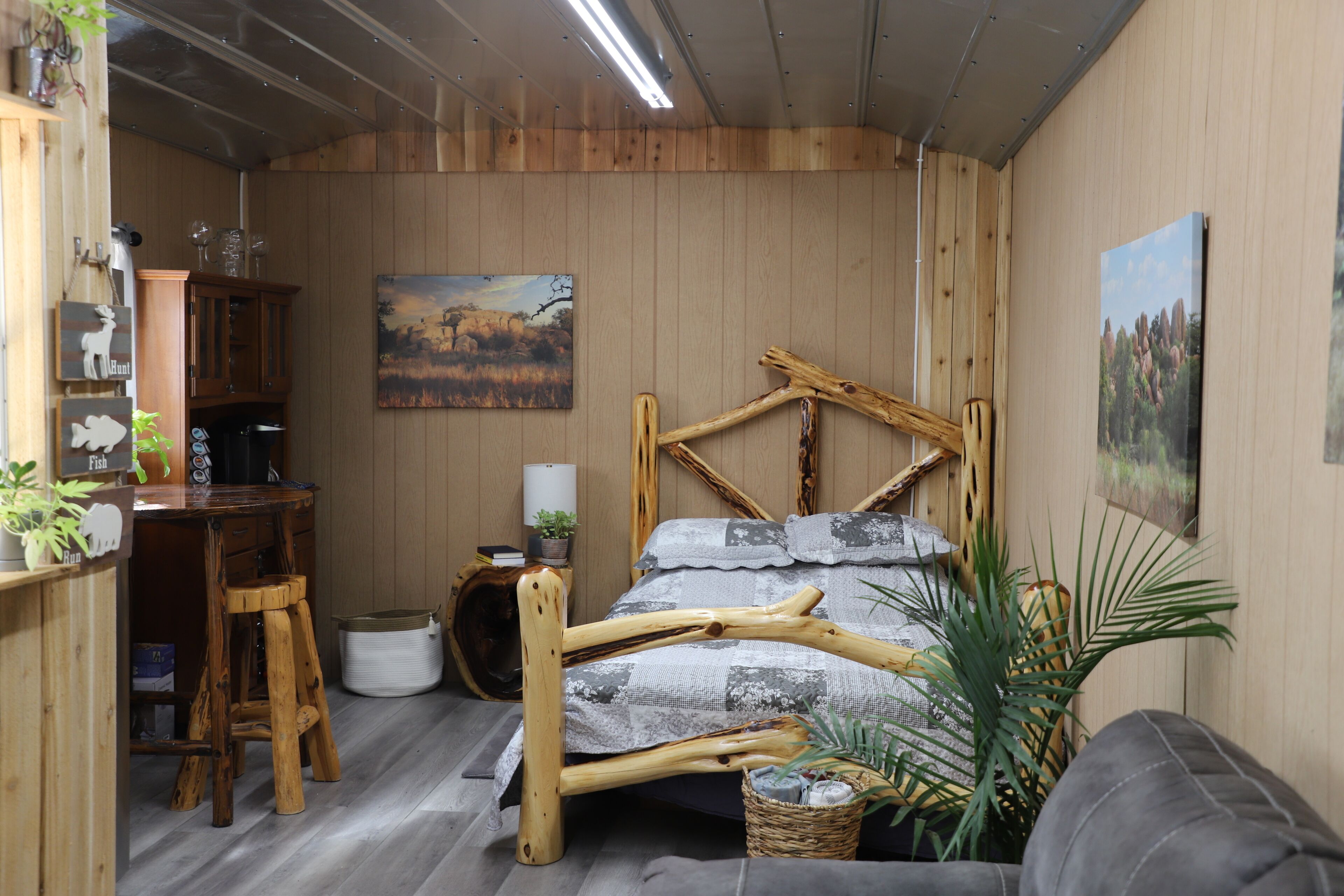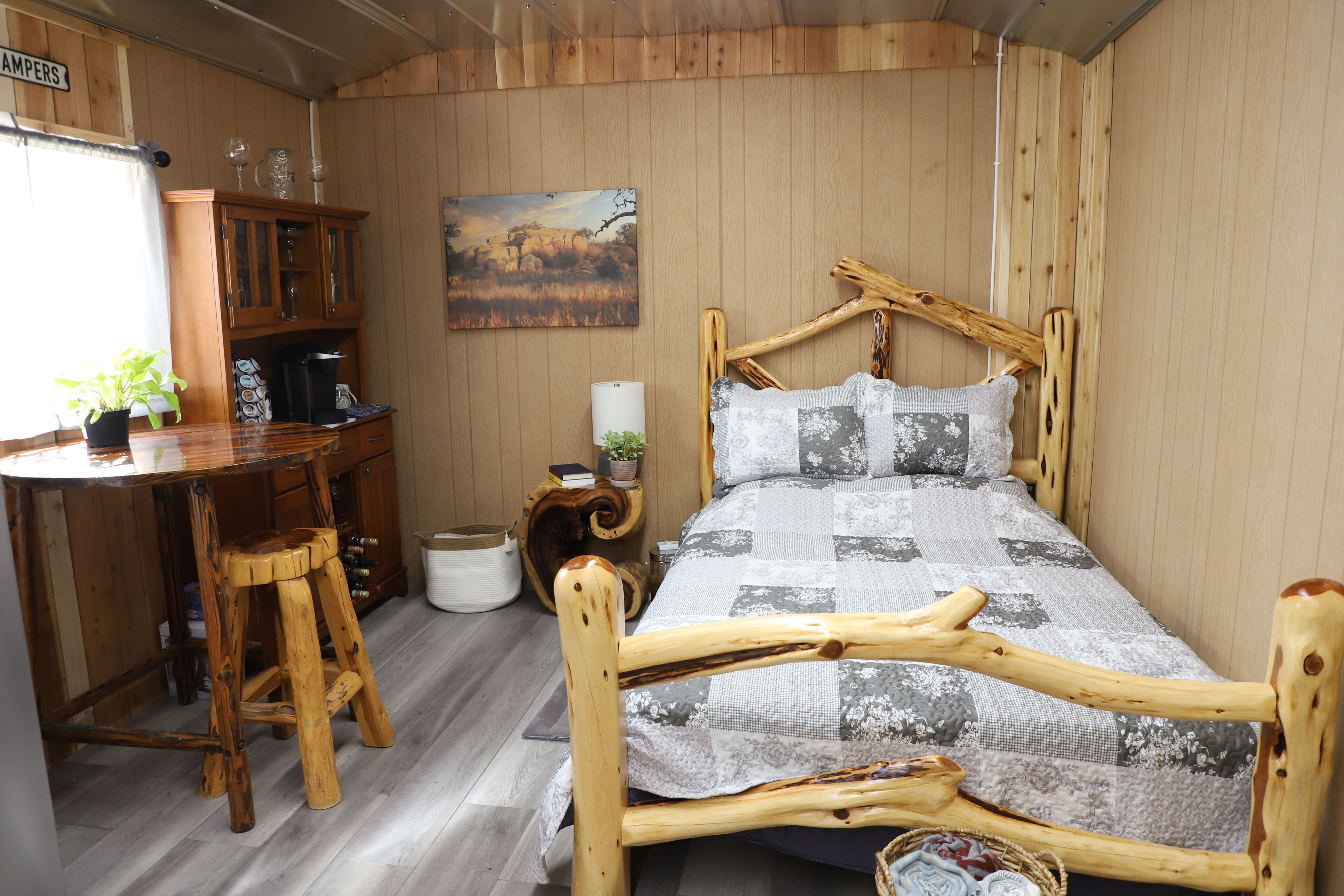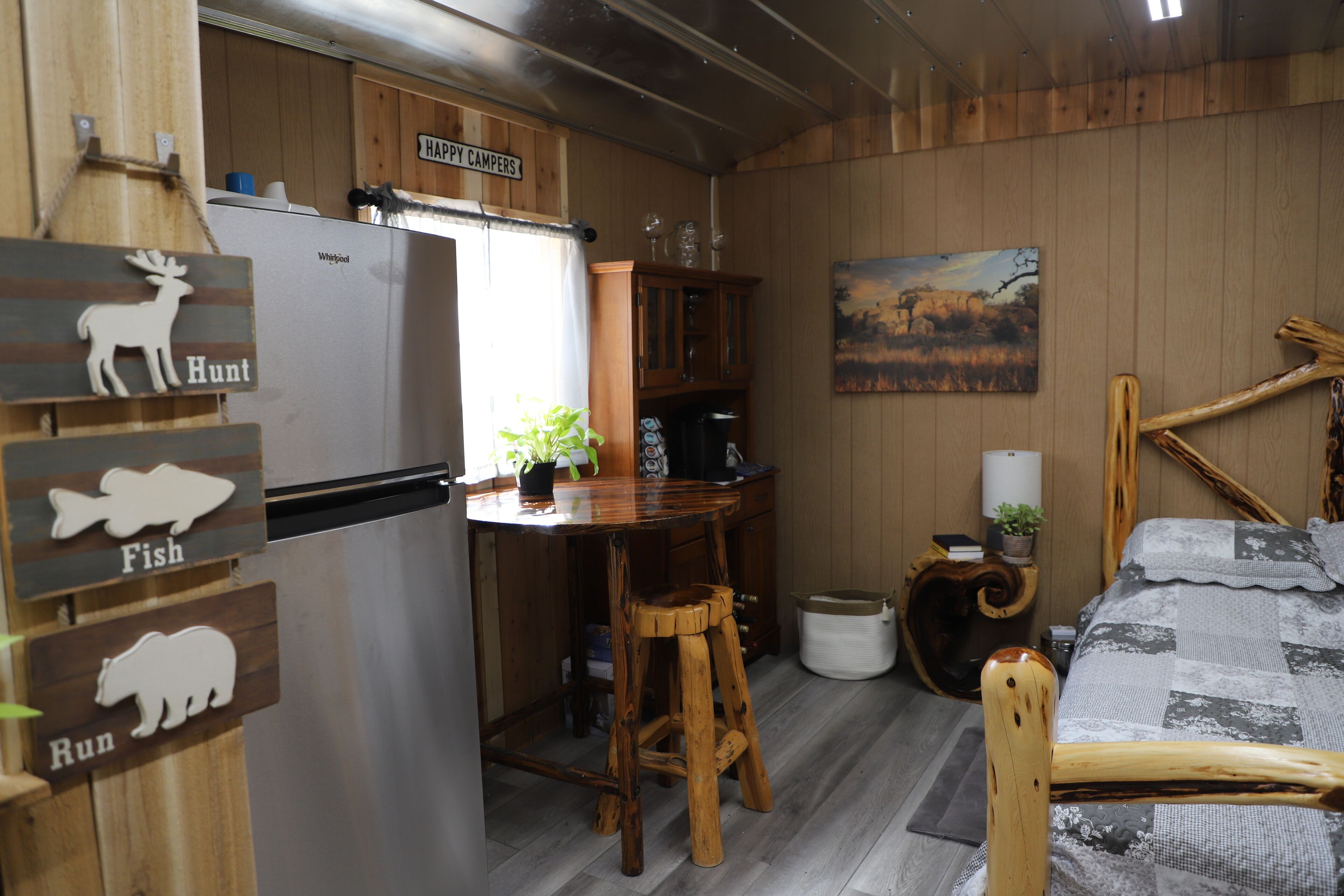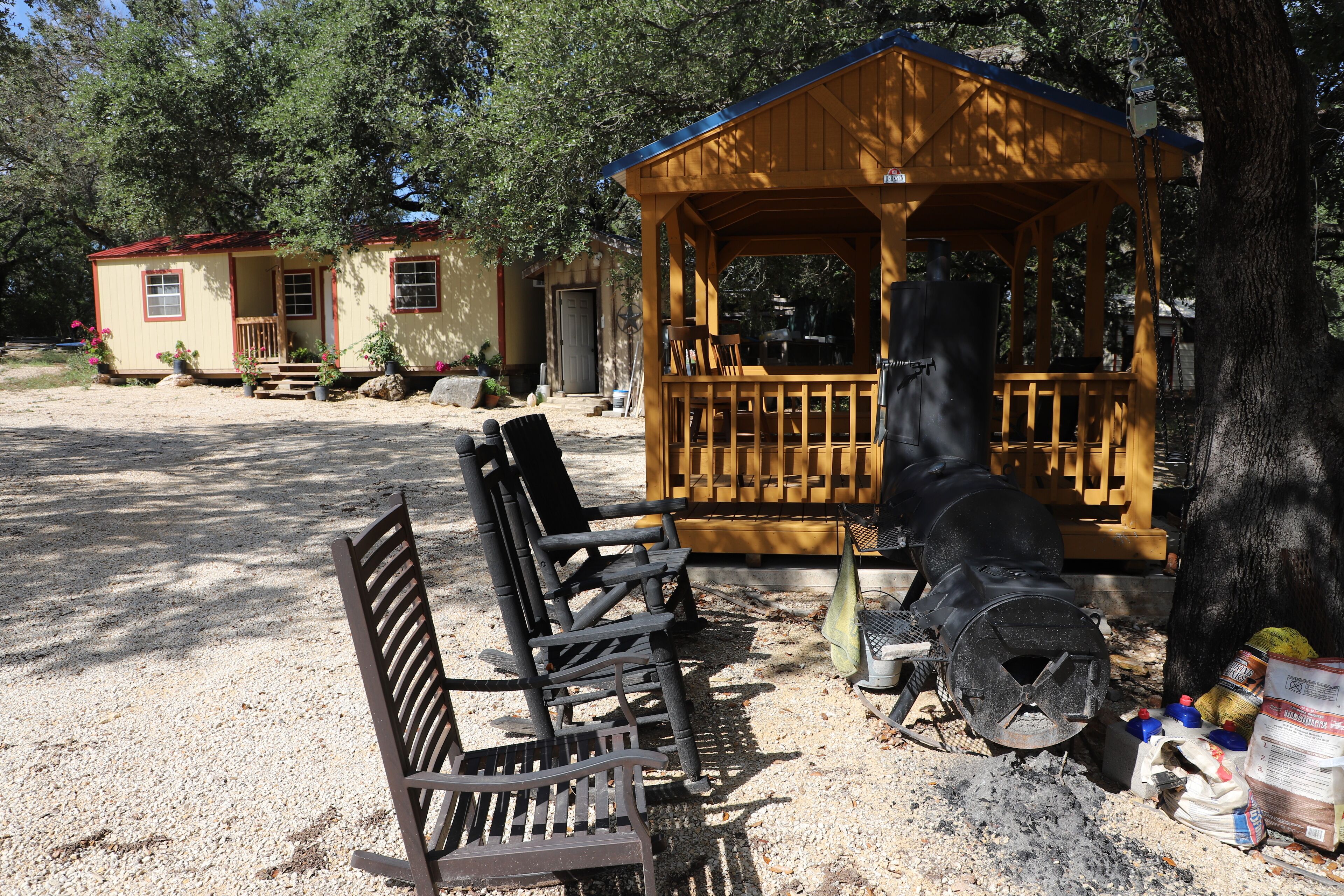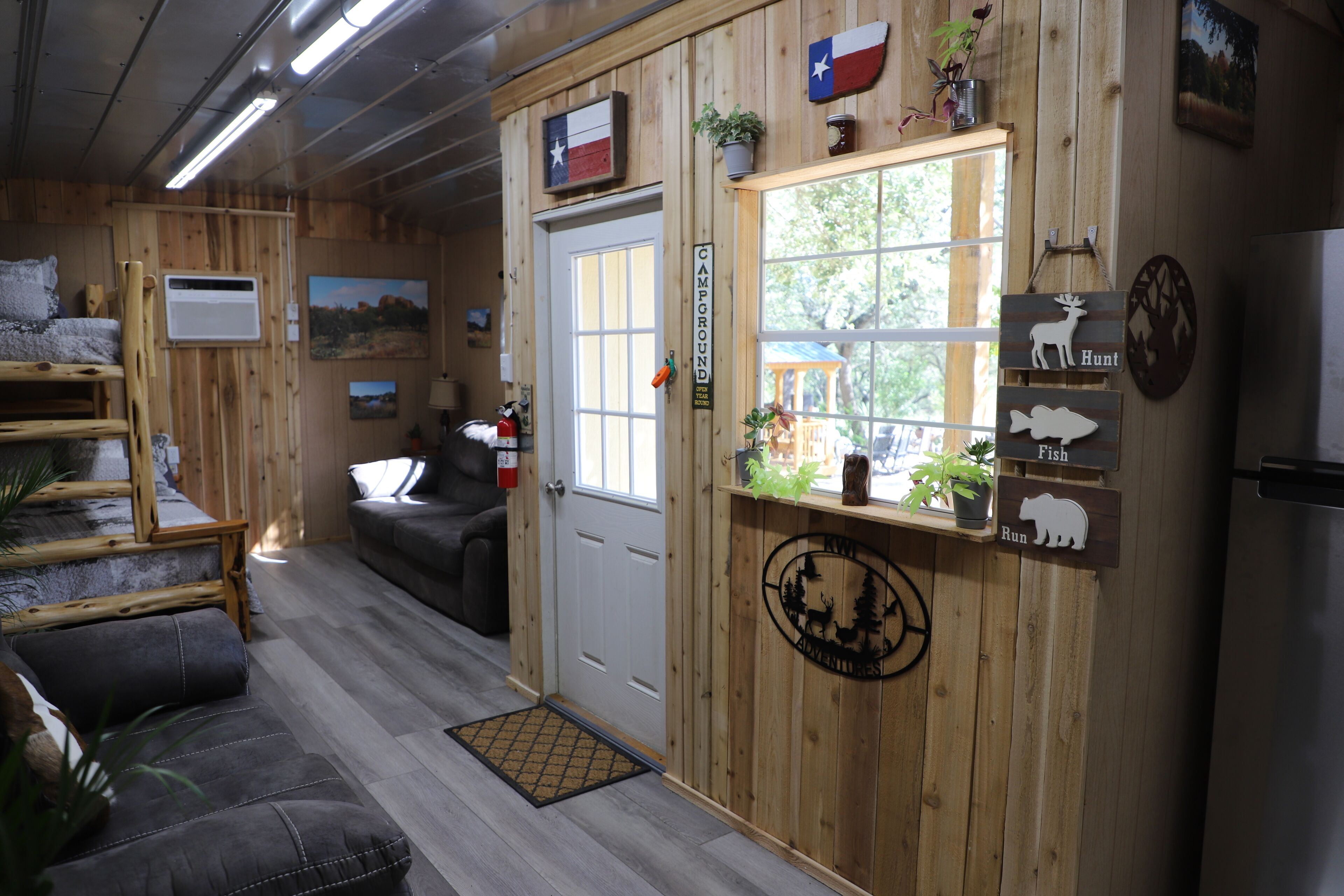 COZY HUNTER'S CABIN IN THE HILL COUNTRY Perfect location to hunt or view nature. Perfect for hunters or fishermen. One queen log bed. A combo standard and twin log bunk bed. Big refrigerator and beautiful coffee/drinks bar. 2 big couches. Huge BarBQ pit. Fire Pit and Texas Cold Tub. Please note that the Bathroom is detached and is located in the barn about 60 feet away. The only water in the cabin is bottled and is in the full-sized refrigerator. We have a slow cooker and a hot plate but there is no kitchen in the cabin. Our guests prefer to cook outside on the big bar b q pit which is perfect for eggs in the morning, hamburgers/hotdogs in the afternoon and steaks or brisket in the evening.