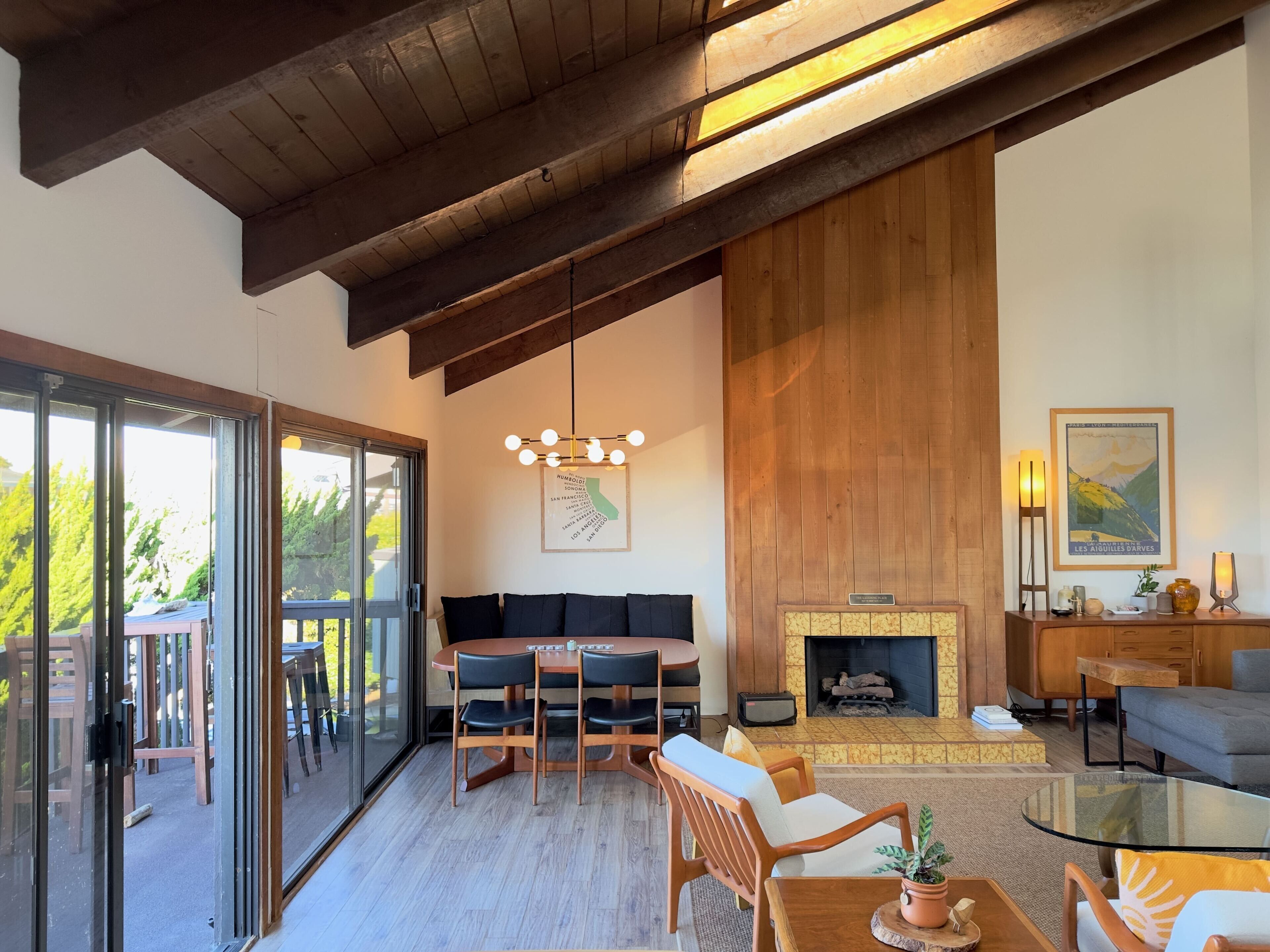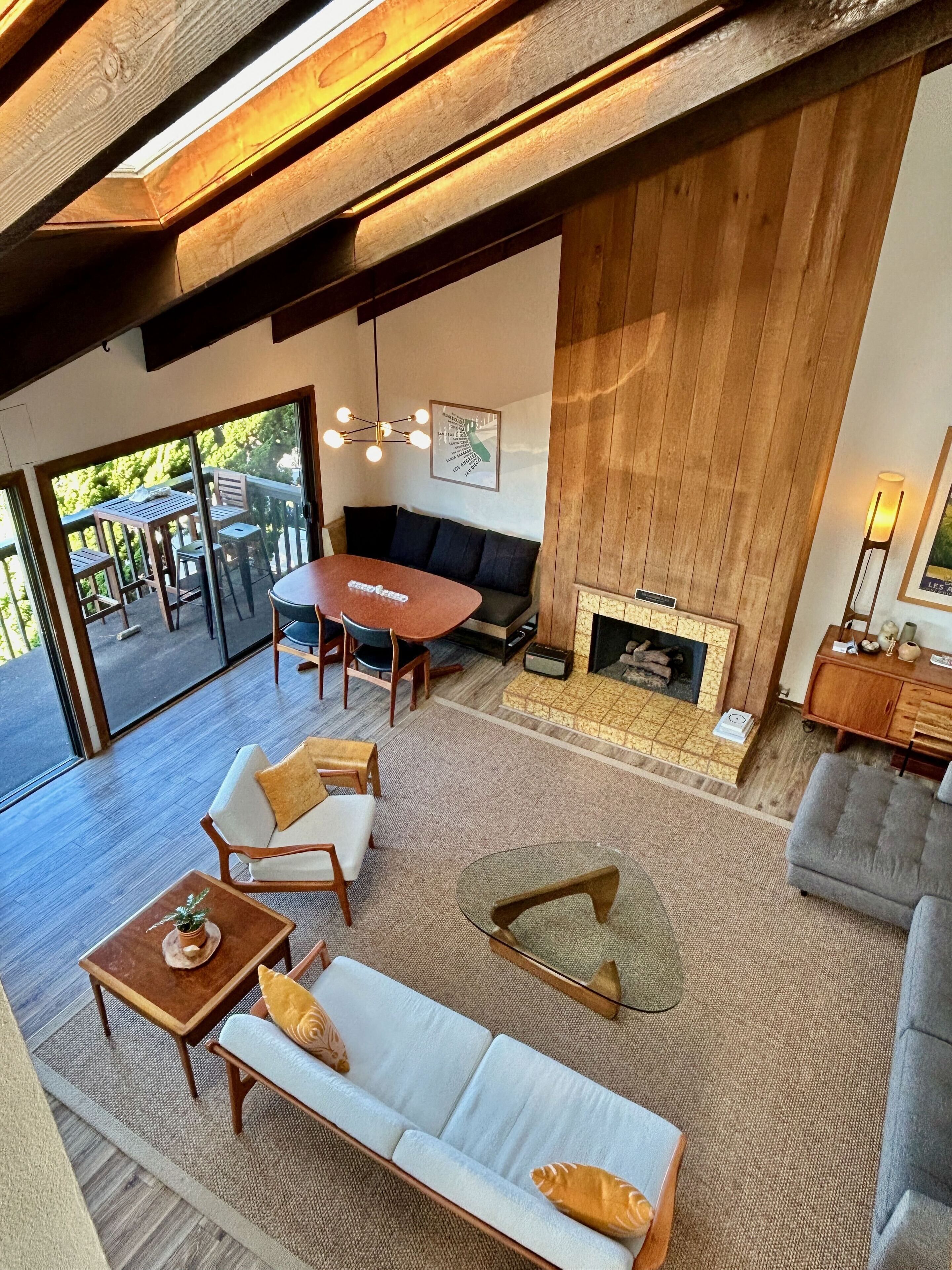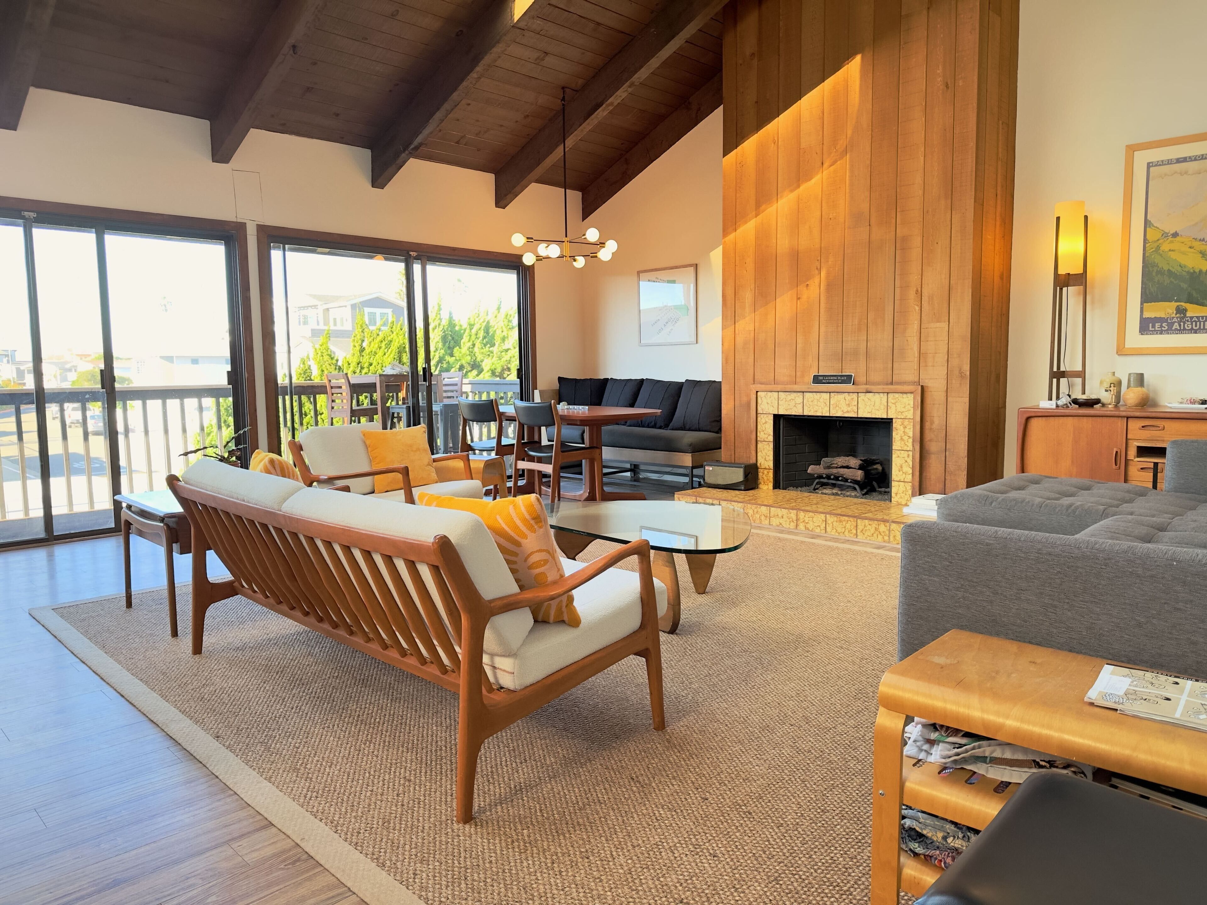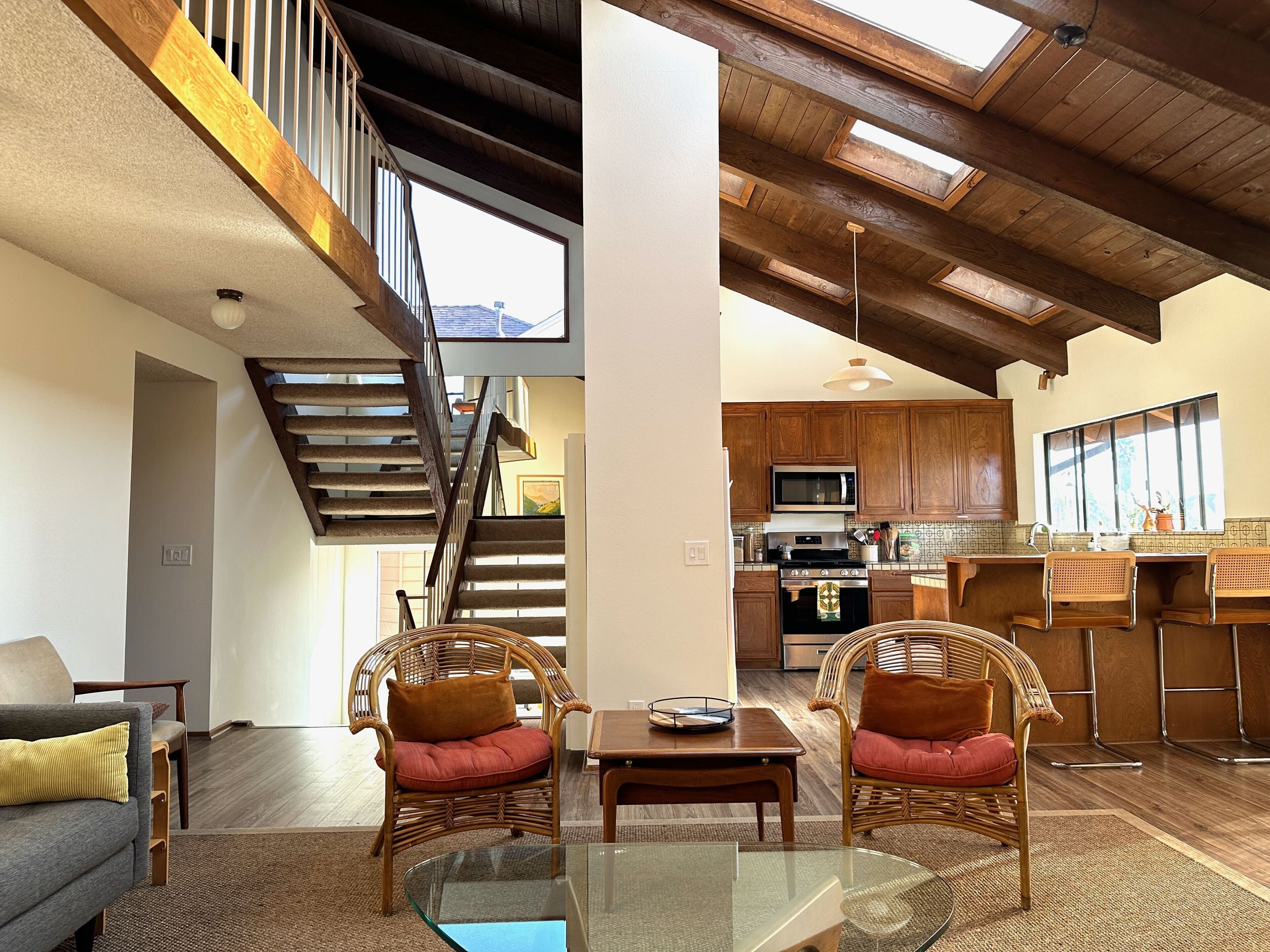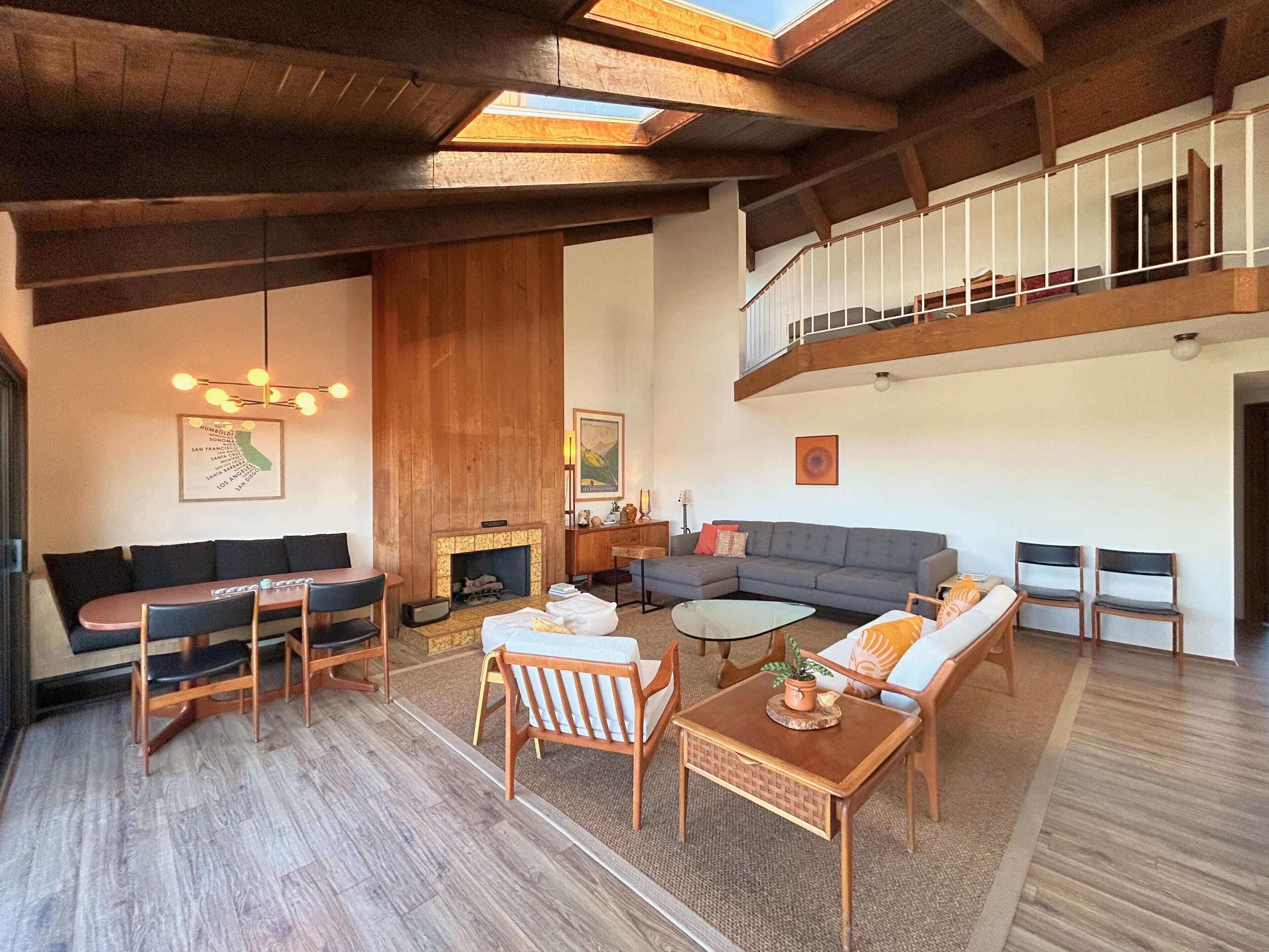 Mid-Century Beach Lodge- 1 Block to Beach! It is all about good vibes and sunshine at this fabulous 70's beach pad with authentic MCM furnishings and skylights. There are numerous welcoming and comfortable spaces indoors and out for gathering and for intimate connection at this very special house. It has an open concept kitchen/dining/living room + loft, west-facing deck, and east-facing enclos...