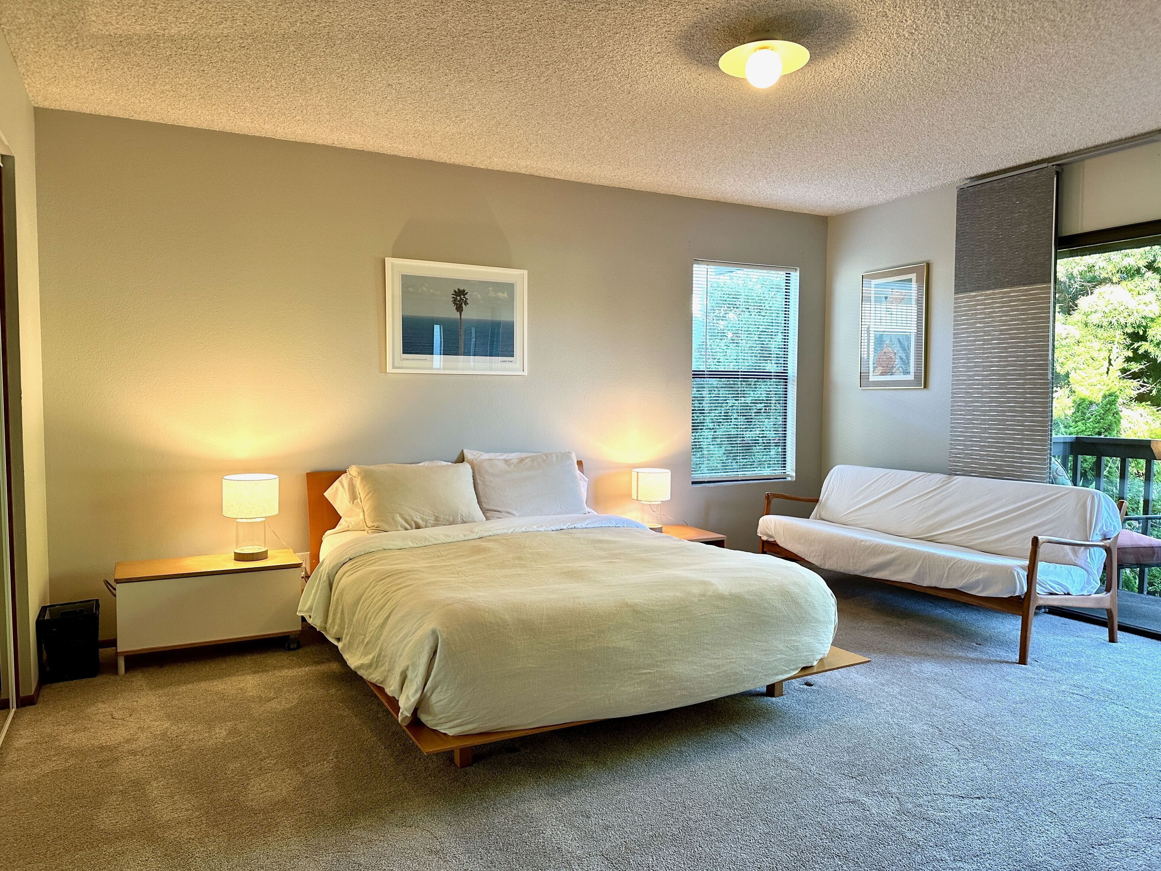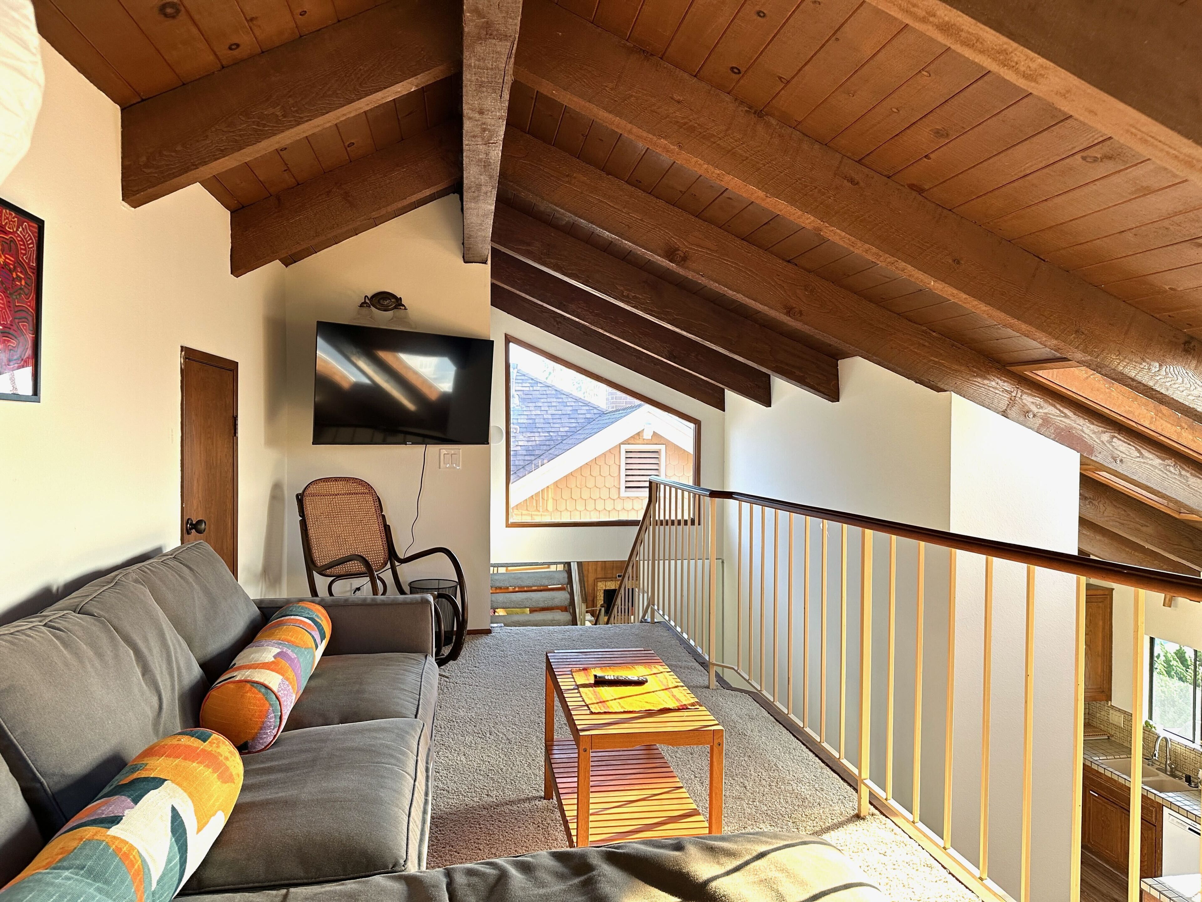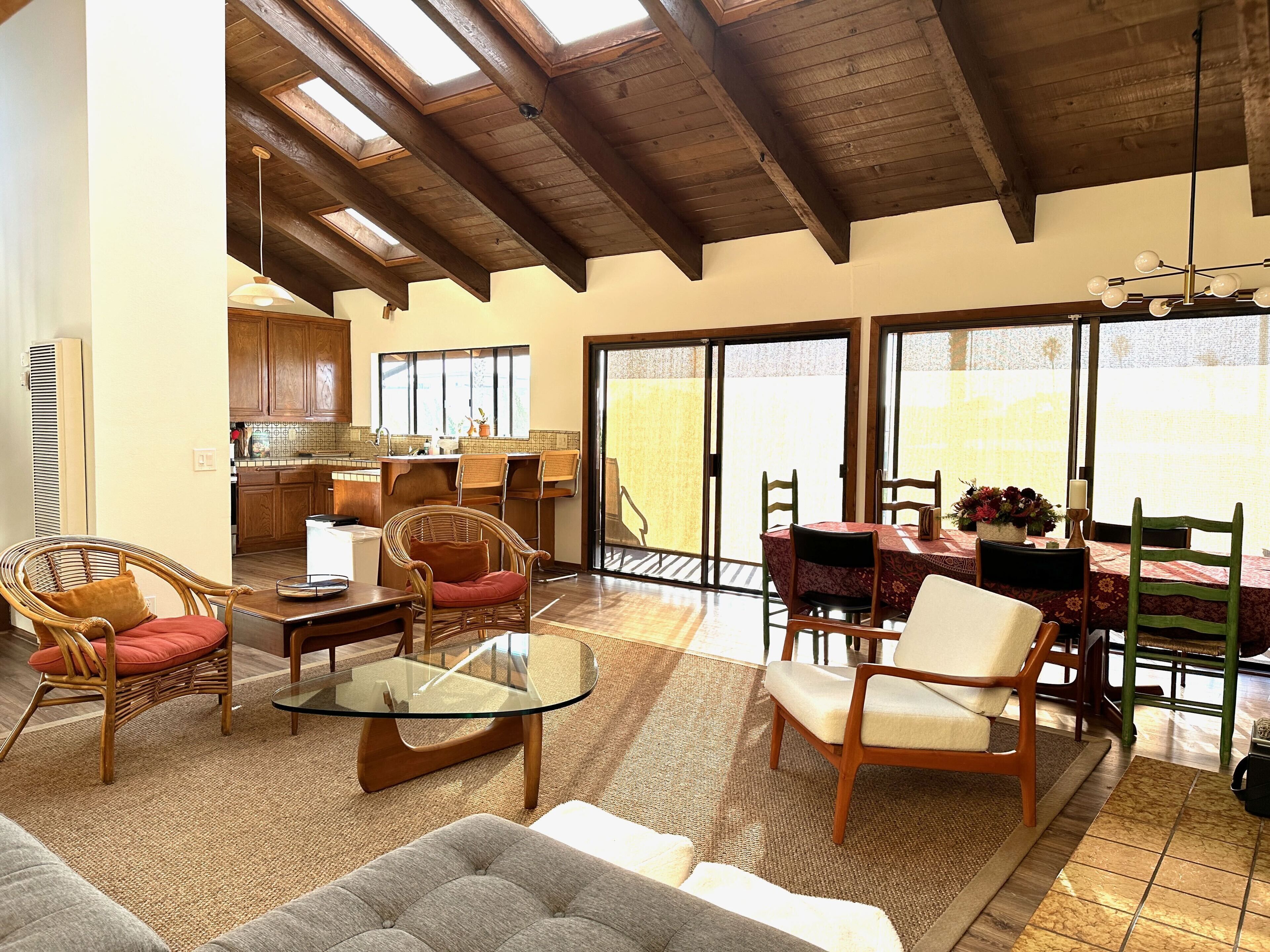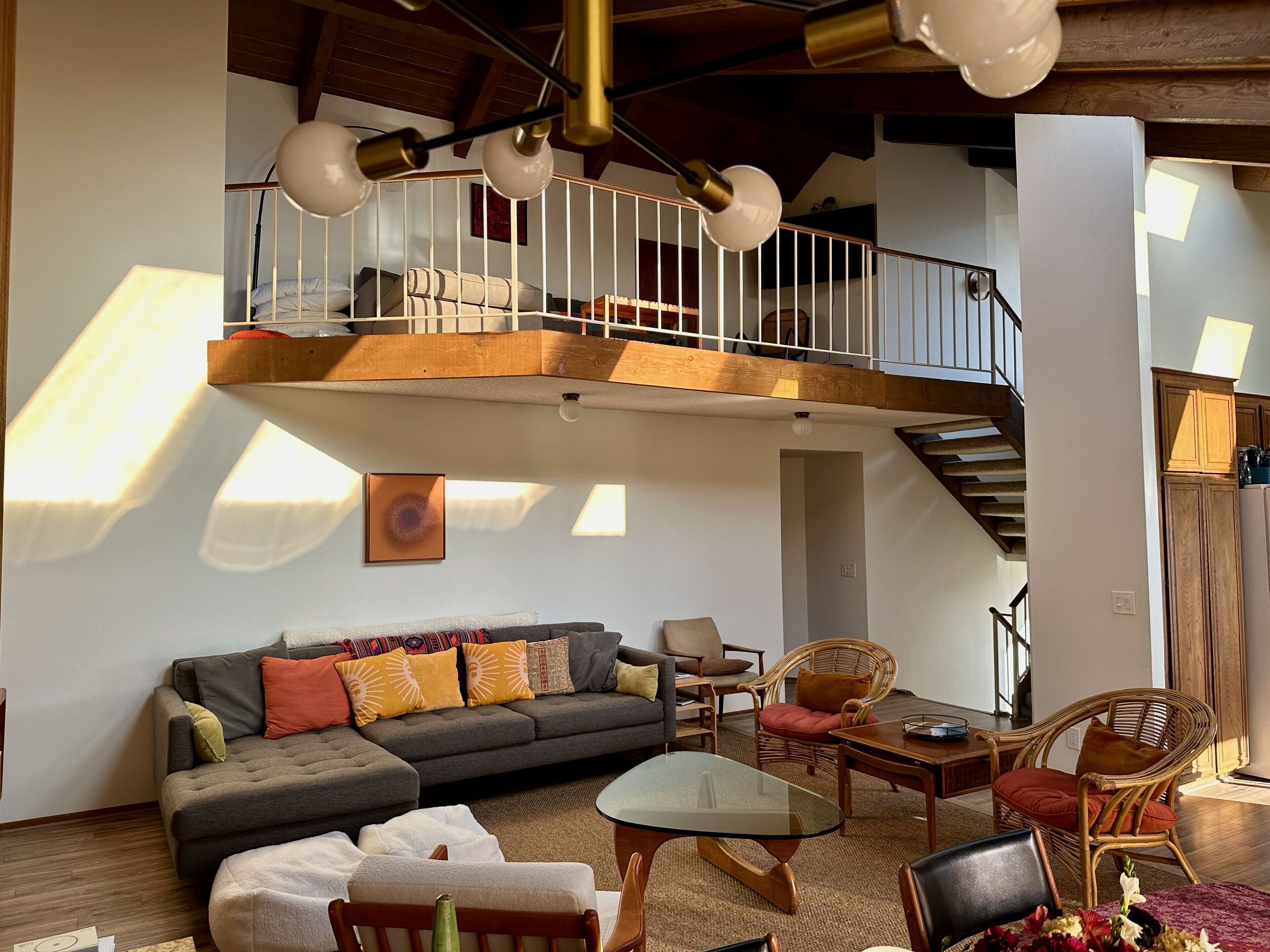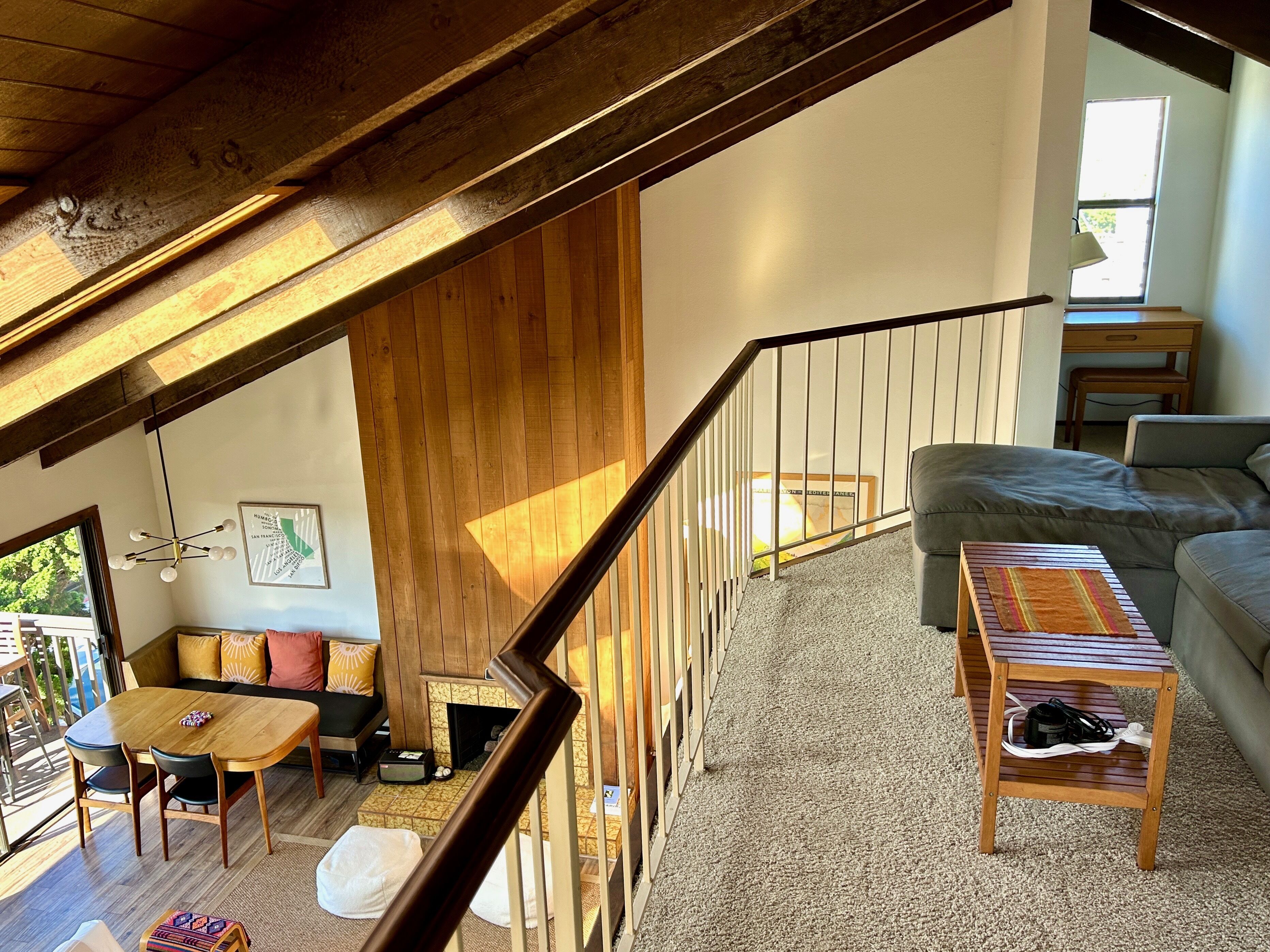 Mid-Century Beach Lodge- 1 Block to Beach! It is all about good vibes and sunshine at this fabulous 70's beach pad with authentic MCM furnishings and skylights. There are numerous welcoming and comfortable spaces indoors and out for gathering and for intimate connection at this very special house. It has an open concept kitchen/dining/living room + loft, west-facing deck, and east-facing enclos...