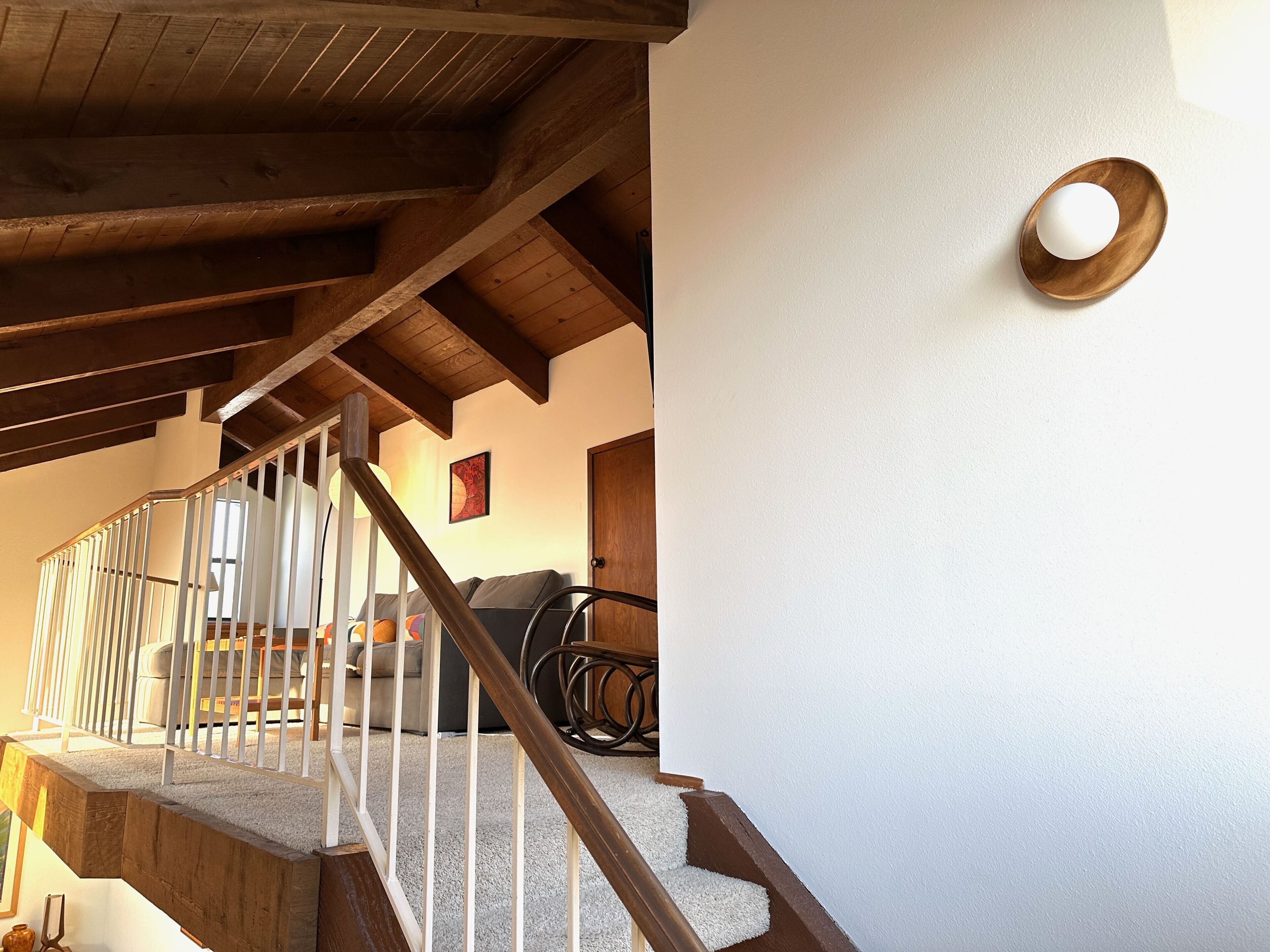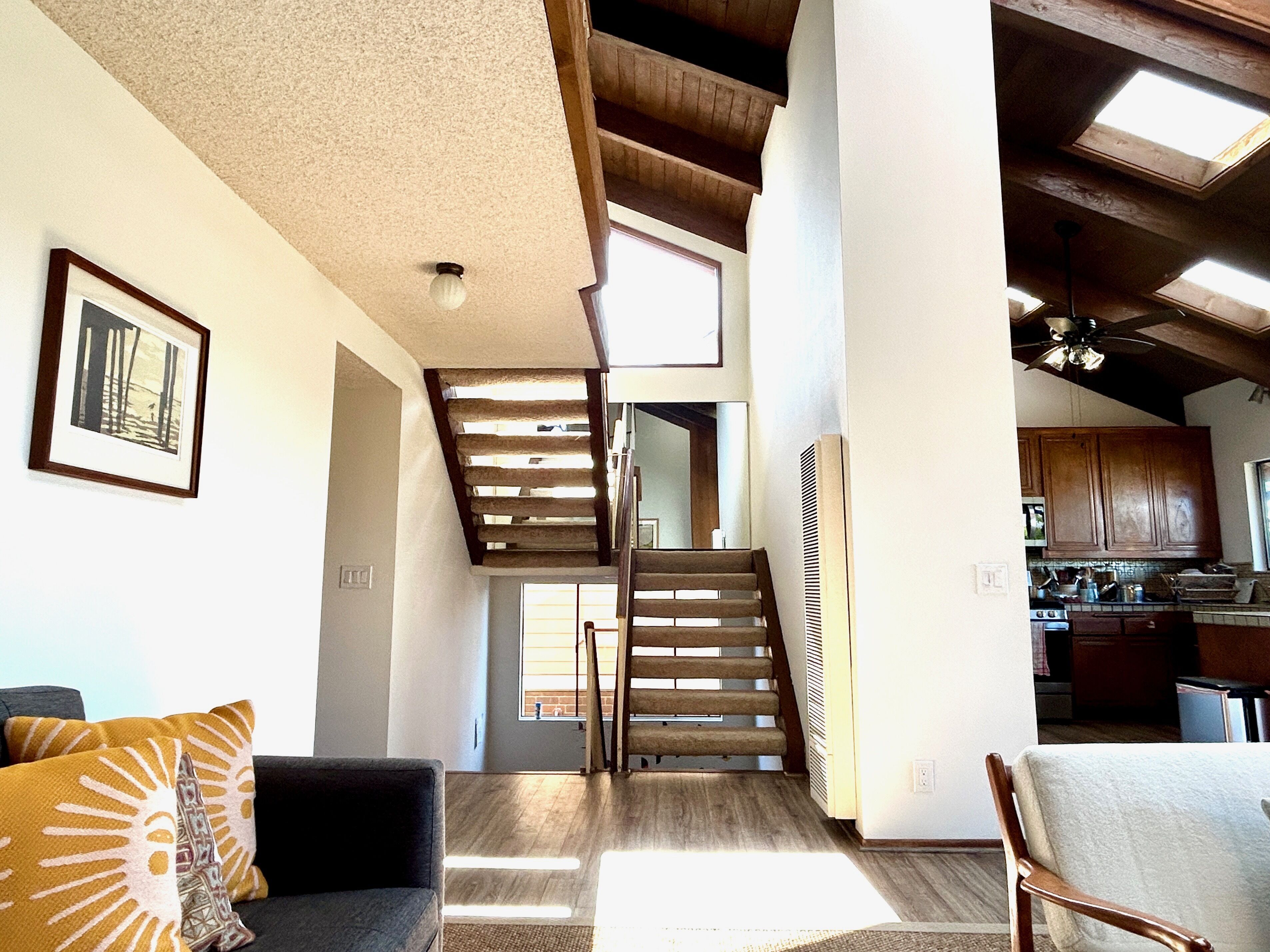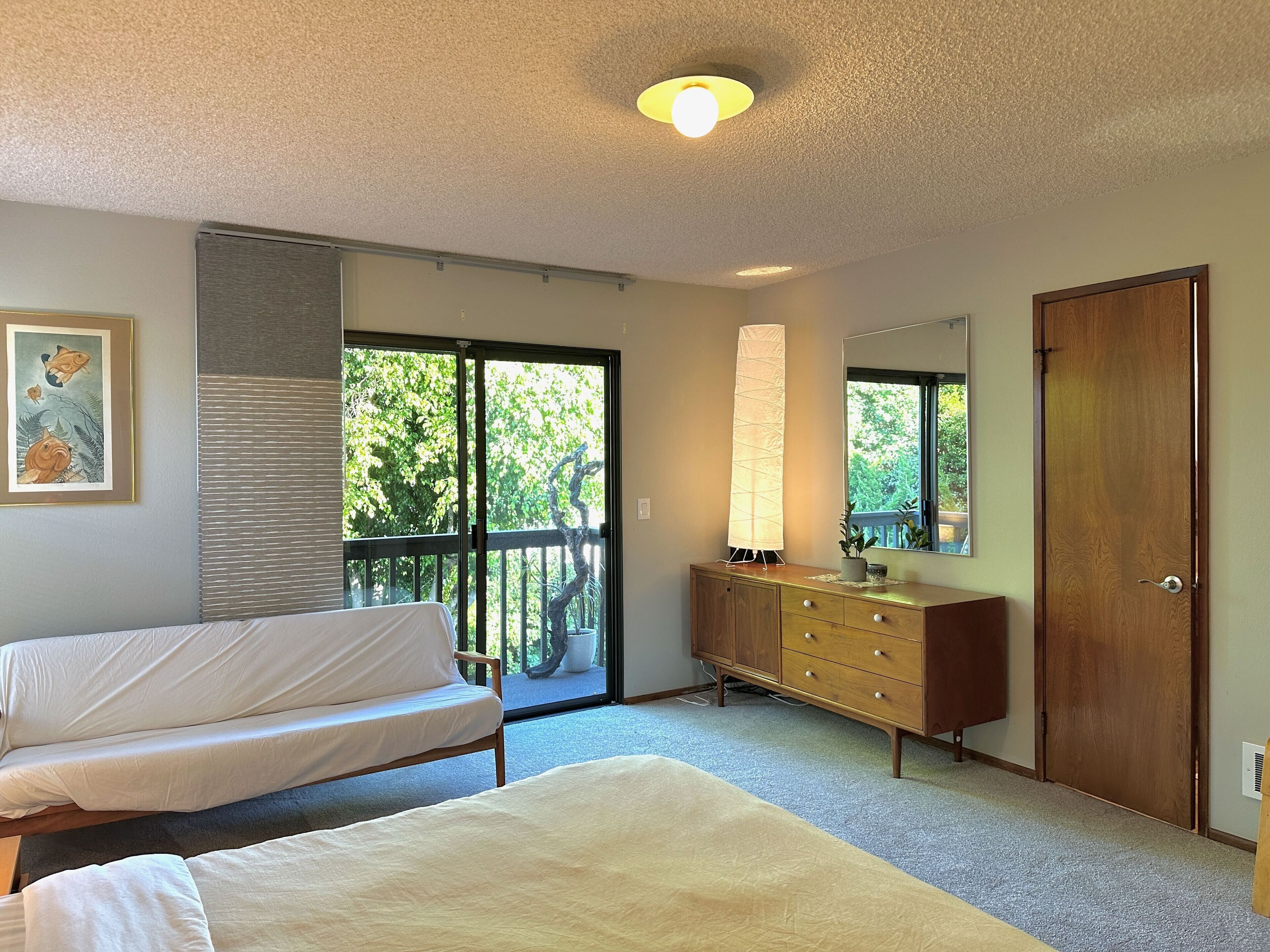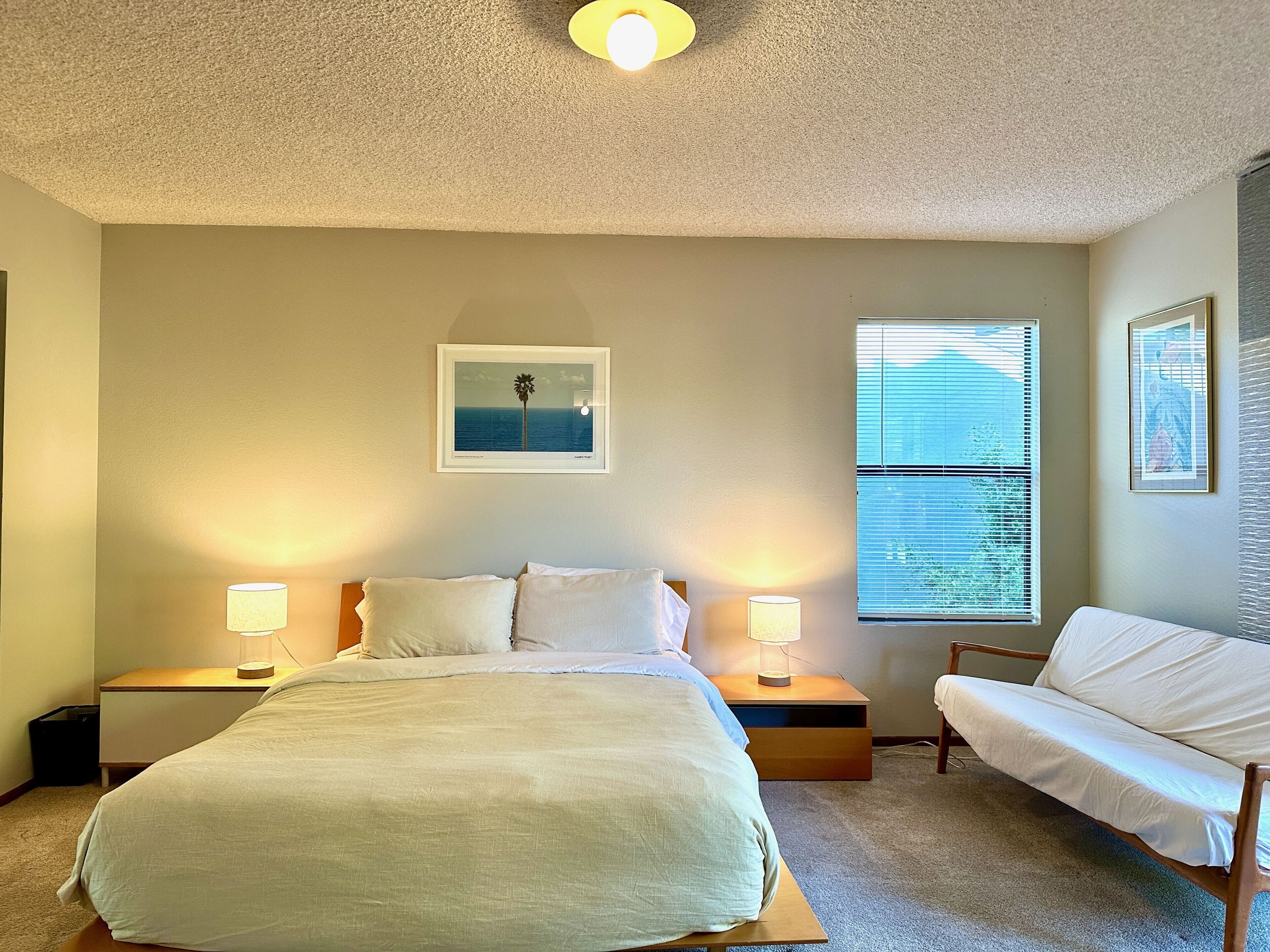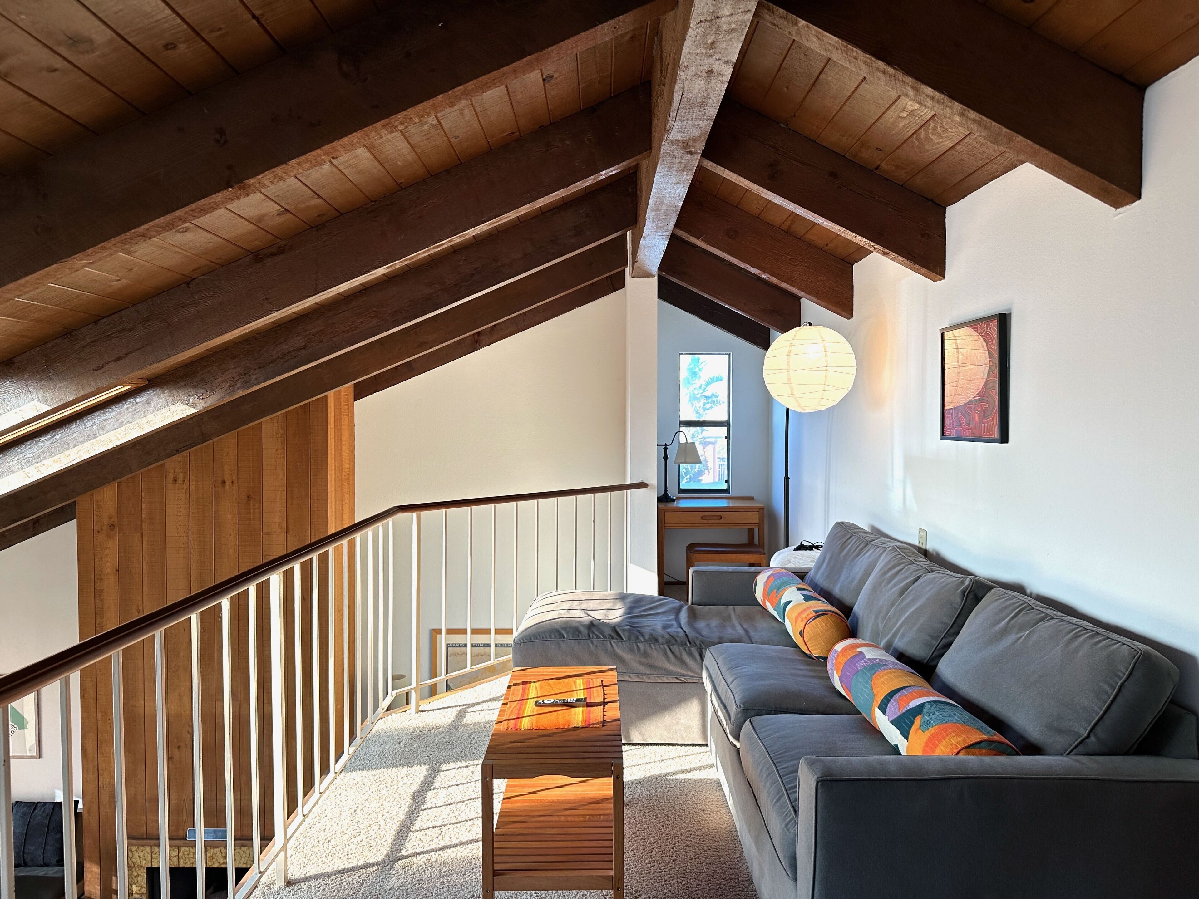 Mid-Century Beach Lodge- 1 Block to Beach! It is all about good vibes and sunshine at this fabulous 70's beach pad with authentic MCM furnishings and skylights. There are numerous welcoming and comfortable spaces indoors and out for gathering and for intimate connection at this very special house. It has an open concept kitchen/dining/living room + loft, west-facing deck, and east-facing enclos...