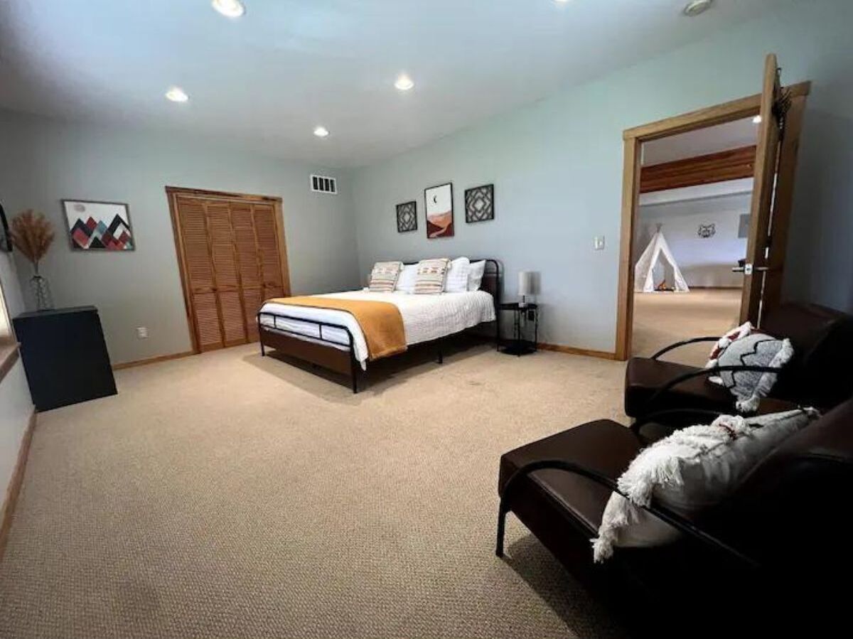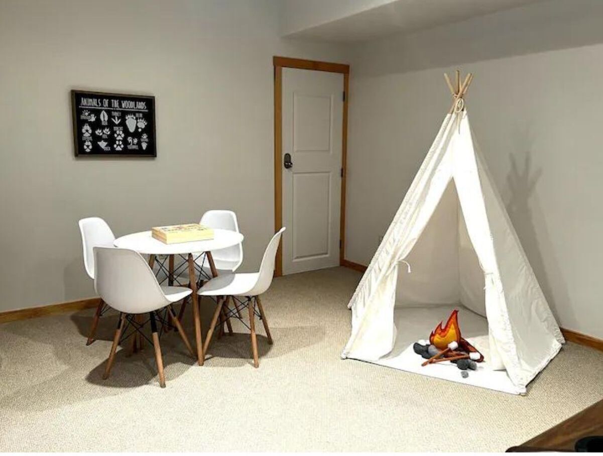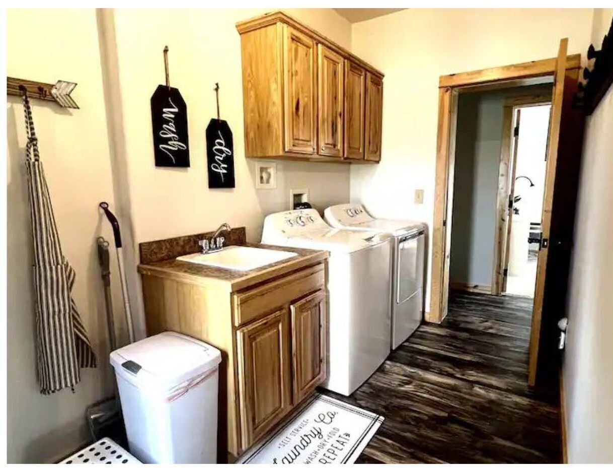 A spacious Wyoming home with stunning mountain views This spacious house sits atop a ridge overlooking the charming town of Pinedale, Wyoming. The front side of the home offers incredible views of the Wind River Mountain Range - absolutely breathtaking. From the rear of the house you can look across the valley to the Wyoming Mountain Range. If you're lucky, you may even spot a herd of pronghorn, or some moose crossing the grounds. It's a little slice of heaven. And as far removed as you might feel, you're only a short 10 minute drive to town, with plenty of shops, parks and restaurants to explore.High Peaks can sleep up to 19, with 3 king beds, 3 person Bed/Trundle in kids room, 2 full futons, 4 fold out twins, and 2 air mattresses. We also have a pack & play for the little ones! Ample room for a group or multiple couples. There are 4 bedrooms (3 King Beds and one kid's room with the Bed/Trundle Combo).The Specifics: •Main Level/Entry: Living room with a gas fireplace, dining room with table big enough for 8, fully stocked kitchen, front deck with outdoor eating area and grill, back deck with rustic log seating. This level features a Master bedroom w/ king-size bed, Smart TV and en-suite bathroom. It also has a guest bedroom with a king size bed and Smart TV, a kid's room with a 4 person bunk bed/trundle combo, and a hall bathroom. Laundry room is also located on this level.Upper level 1: Just off the laundry room and down a short flight of stairs you have a large entertaining/den area. This level features a bar, 2 Smart TVs, and 4 fold out twins.Lower Level: Located on this floor is bedroom #4 w/ a king bed. Living area features a Smart TV and 2 high-end air mattresses available. The living area also consists of two futons, a pool table, and a game area. Access to the backyard and back patio from this level. Bathroom includes a tub/shower combo.FEATURES: **Fully stocked kitchen (with an extensive line of appliances and gadgets) **Surface parking for 4+ more cars**Washer/Dryer **3 Living/Entertainment Areas **Games for Adults and Children
