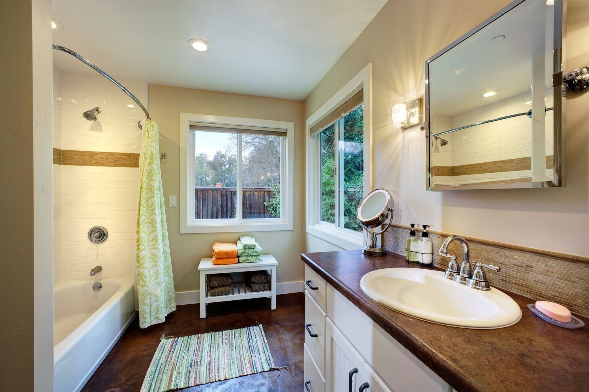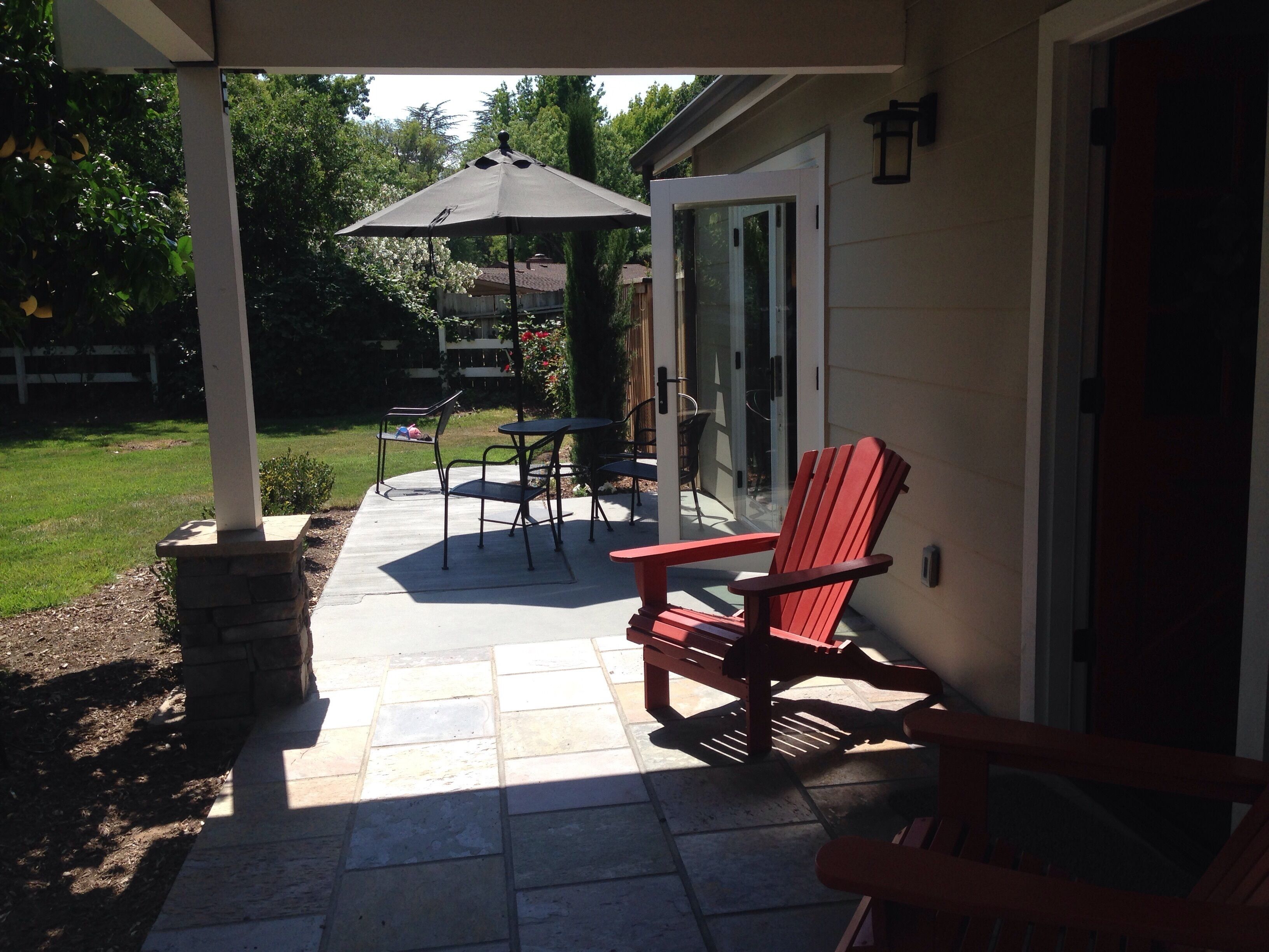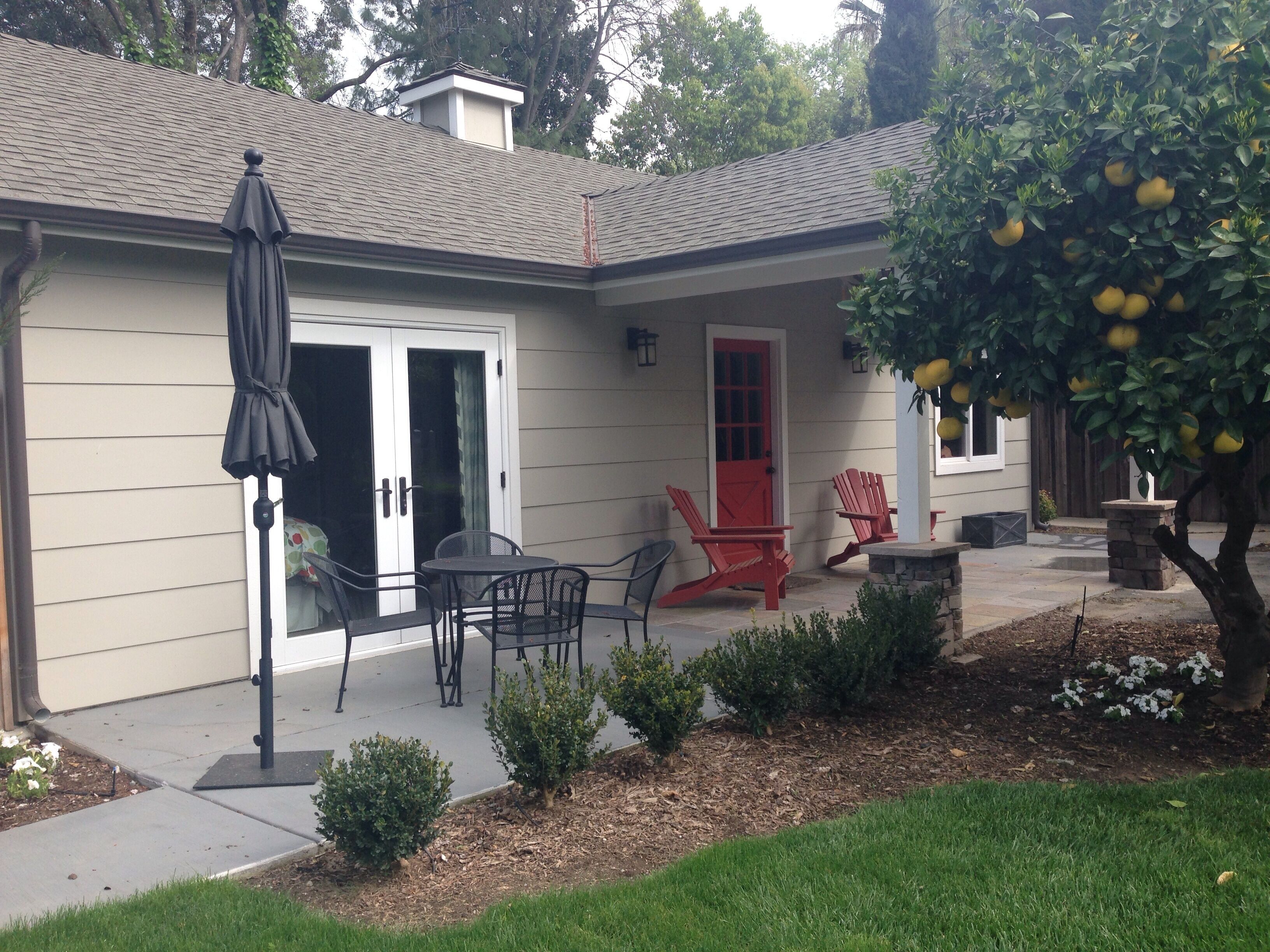 900 Square Foot Guest Cottage Built In 2013. Great For A Family of five max. Luxurious but rustic decor, beams, stained concrete floors, beautifully furnished. One large master bedroom, King bed, with red sliding barn doors, high-end pull out couch, Queen bed, in living room plus two twins configured in a day bed. High end linens. Fully equipped kitchen, dishwasher, eating area for four. Bath with shower/tub. Full laundry room with portacrib and changing table. High chair. WiFi, Comcast cable, flat screen TV. Amazon Alexa music. Lovely, private patio with table and four chairs, umbrella and lawn. Webber charcoal grill. Parking. This cottage is built on a 1.3 acre ranch-house estate in the Arden Oaks neighborhood of Sacramento. Winner of 2014 Coty Award for houses built in the under $250,000 category, Sacramento region. We are on site but very separate so guests have almost total privacy.