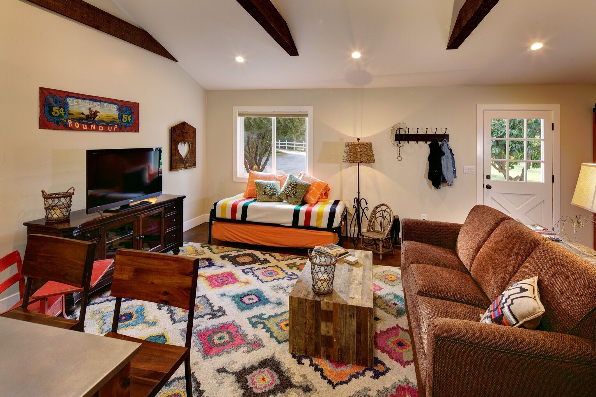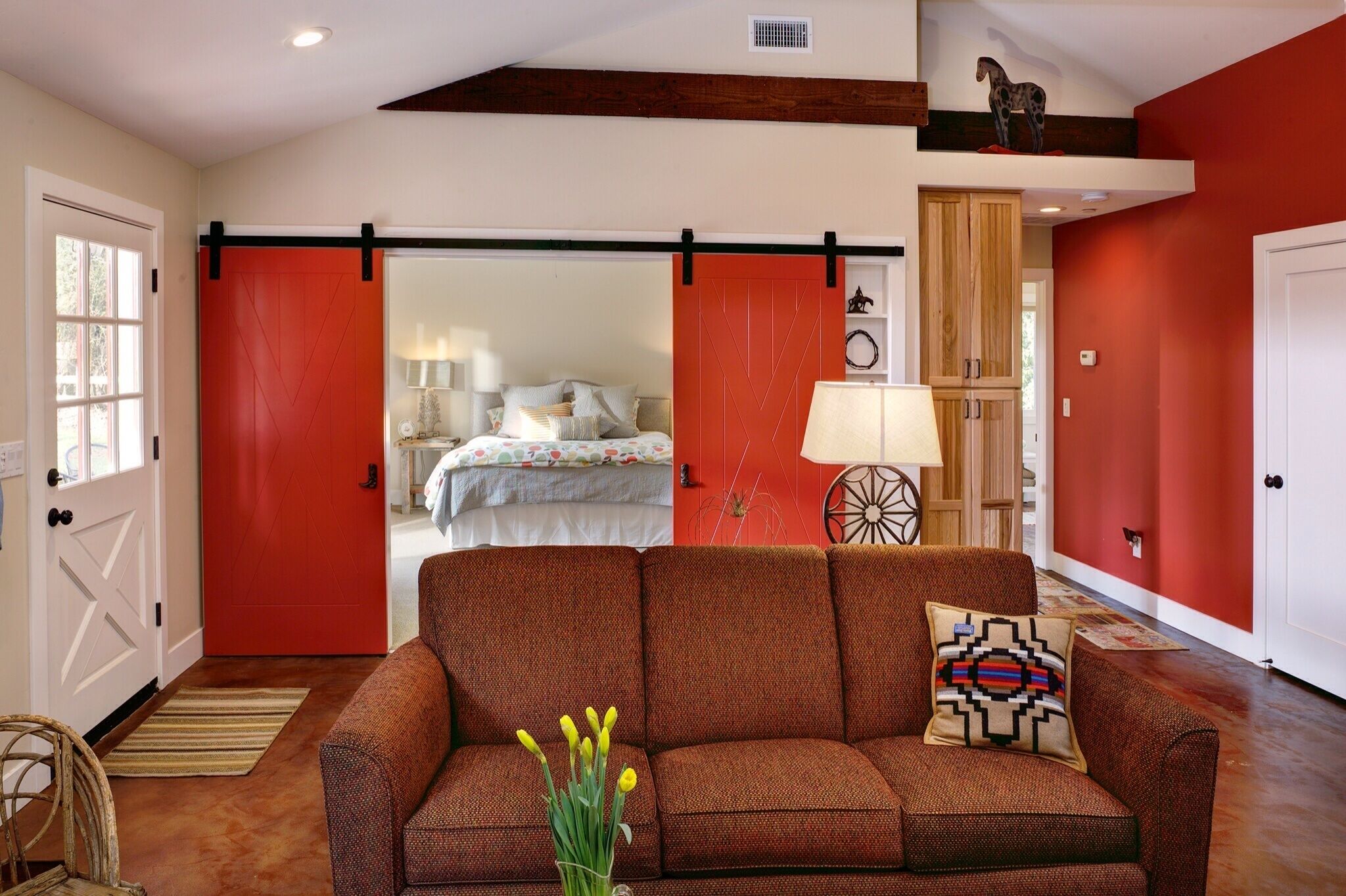 900 Square Foot Guest Cottage Built In 2013. Great For A Family of five max. Luxurious but rustic decor, beams, stained concrete floors, beautifully furnished. One large master bedroom, King bed, with red sliding barn doors, high-end pull out couch, Queen bed, in living room plus two twins configured in a day bed. High end linens. Fully equipped kitchen, dishwasher, eating area for four. Bath wit...