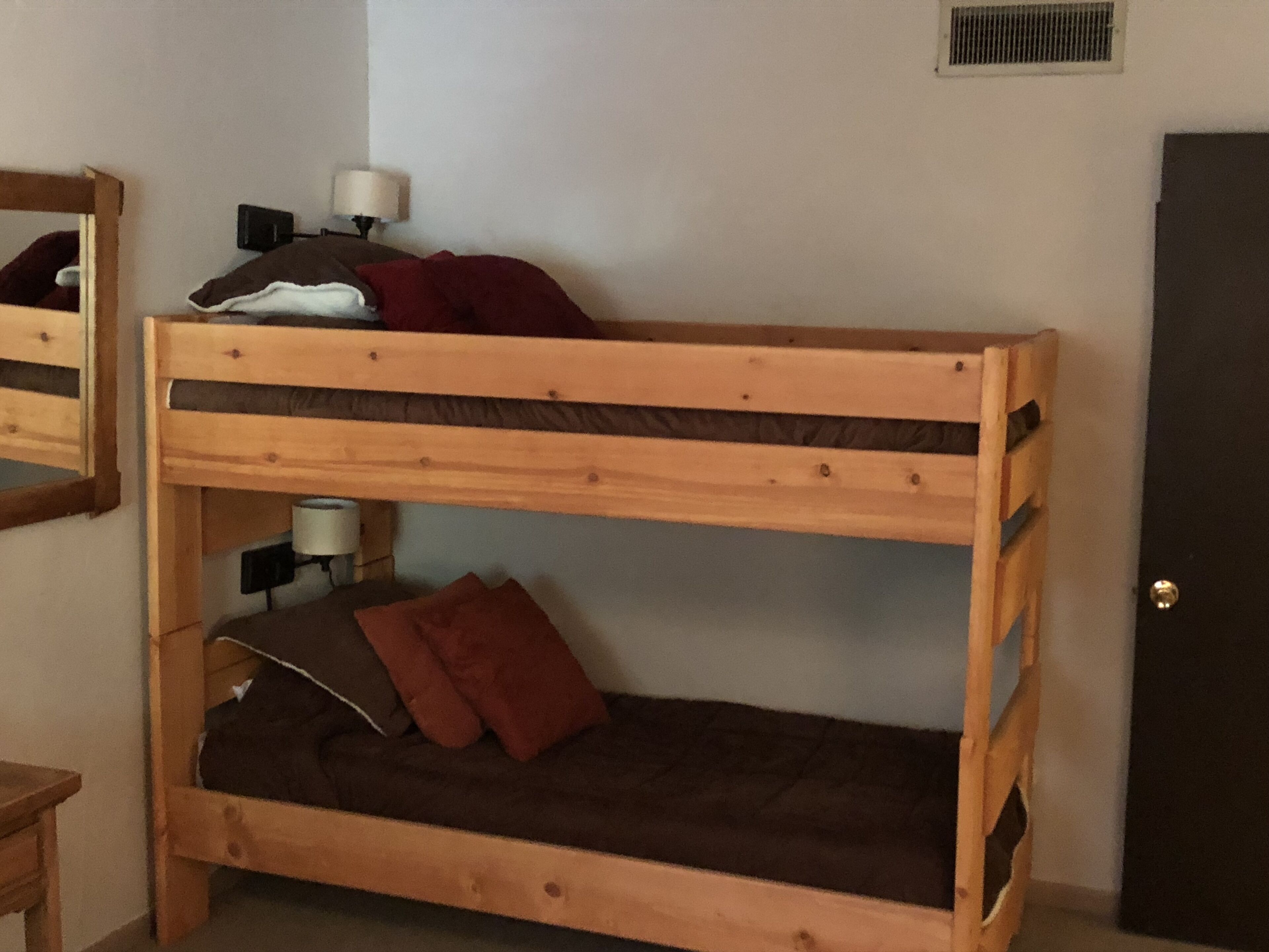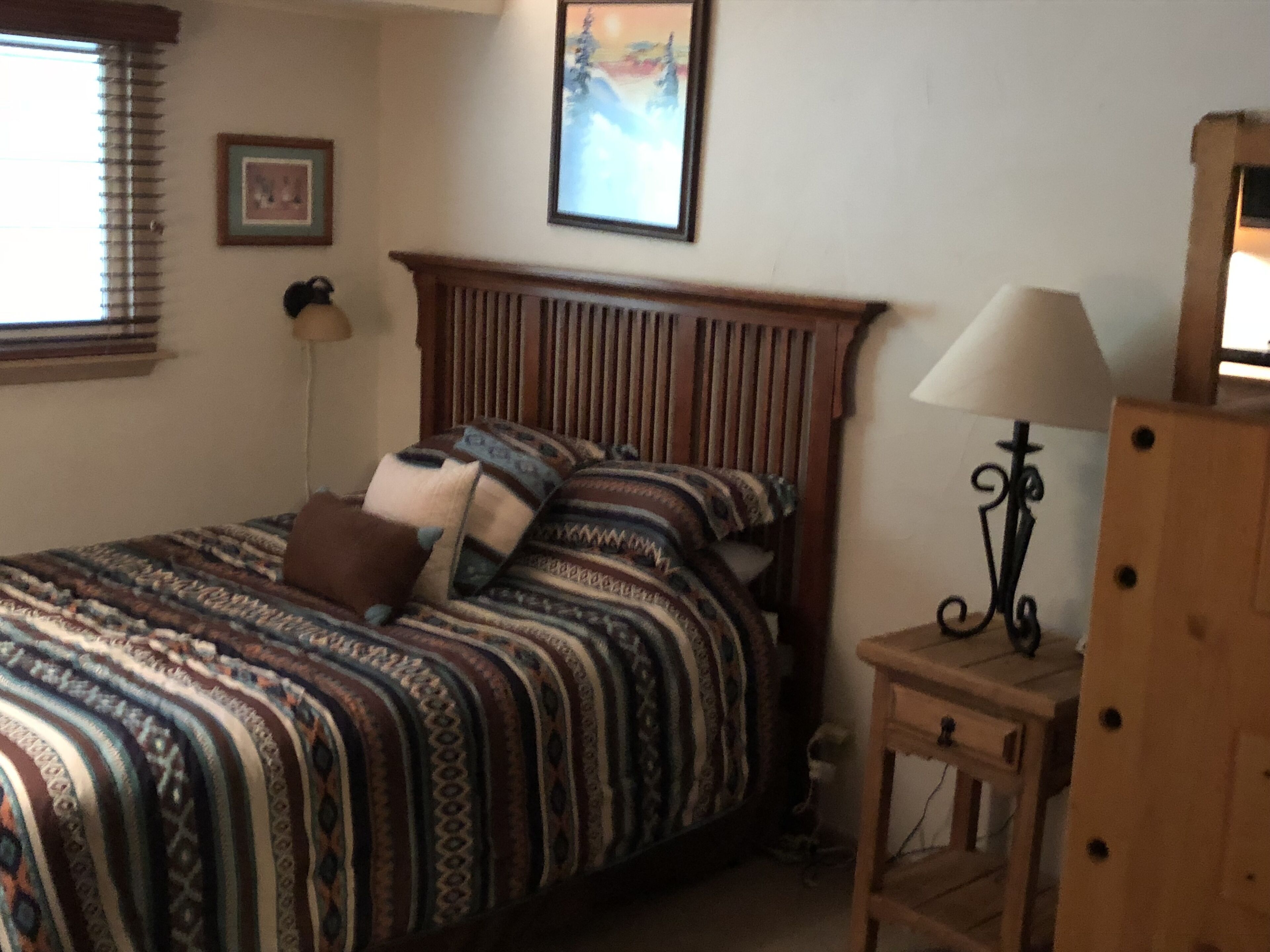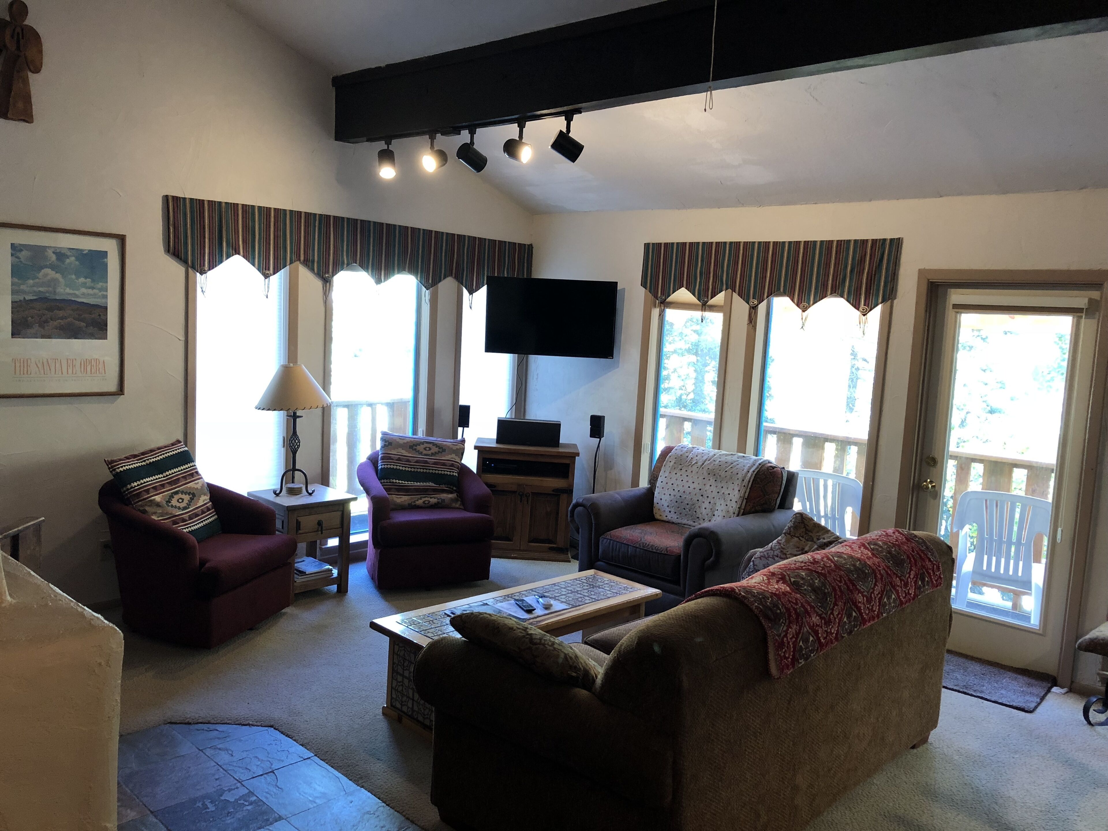Taos Ski Valley condo-Kandahar Lodging at Kandahar Vacation Condos makes your vacation perfect anytime of year! Long known for its world-class skiing, the Taos Ski Valley is now open to snowboarders. Enjoy world-class downhill and cross country skiing or snow shoeing in the Taos Ski Valley, then relax your tired muscles in the onsite hot tub at the Kandahar Vacation Condos Resort Lodging. Curl up by your condo fireplace for a relaxing evening in the comfort and privacy of your own vacation rental lodging. Summer in Taos Ski Valley brings cool, breezy days and Rocky Mountain nights full of stars. Go horseback riding, hiking or mountain biking through alpine meadows filled with wildflowers. Bring your camera to capture birds and wildlife galore. Or just relax and enjoy the peace and tranquility of Northern New Mexico, truly the Land of Enchantment.And lodging at Kandahar Condominiums Vacation Resort is the place to be! Taos Ski Valley’s favorite ski-in, ski-out condo hotel is famous for providing skiers and snowboarders the best in lodging, hotel or inn accommodations, along with all the comforts of home.Kandahar Vacation Condominiums sits on the mountain overlooking the Taos Ski Valley and the Children’s Ski Center. The lifts are just outside your door, with shops and restaurants just a short walk away. Stray Dog Cantina enjoying green chile stew and fresh squeezed margaritas. Black Diamond Express for morning latte and the St Bernard for drinks and live entertainment.Our 2 Bedroom, 1 3/4 bath end unit is perfect for a young family or several adults. Our unit features, a king size bed, a queen size bed and a set of bunk beds. Full service kitchen, satellite TV, stereo, wifi access and fireplace complete our amenities. An indoor hot tub is on the property for your after ski enjoyment.
