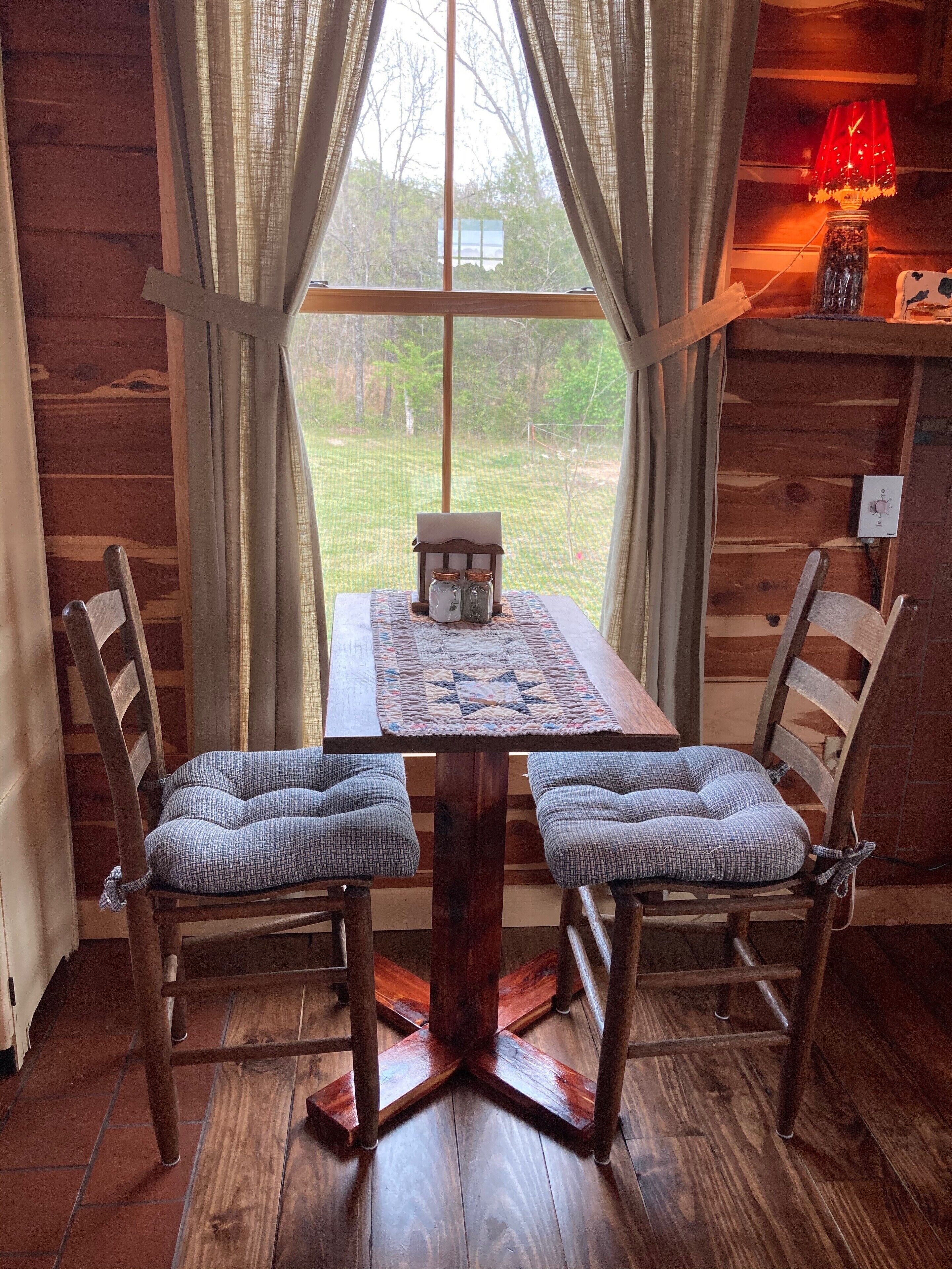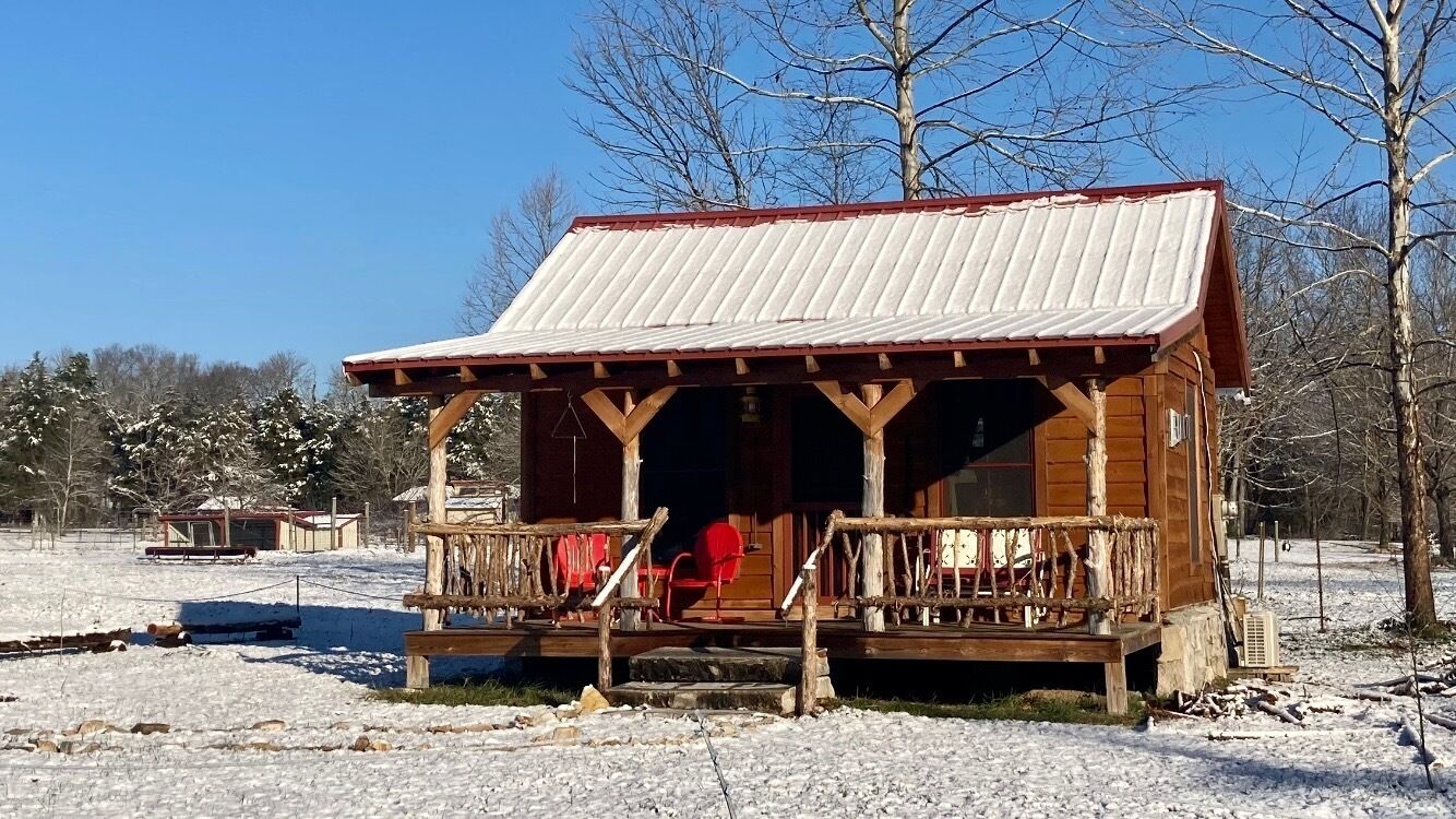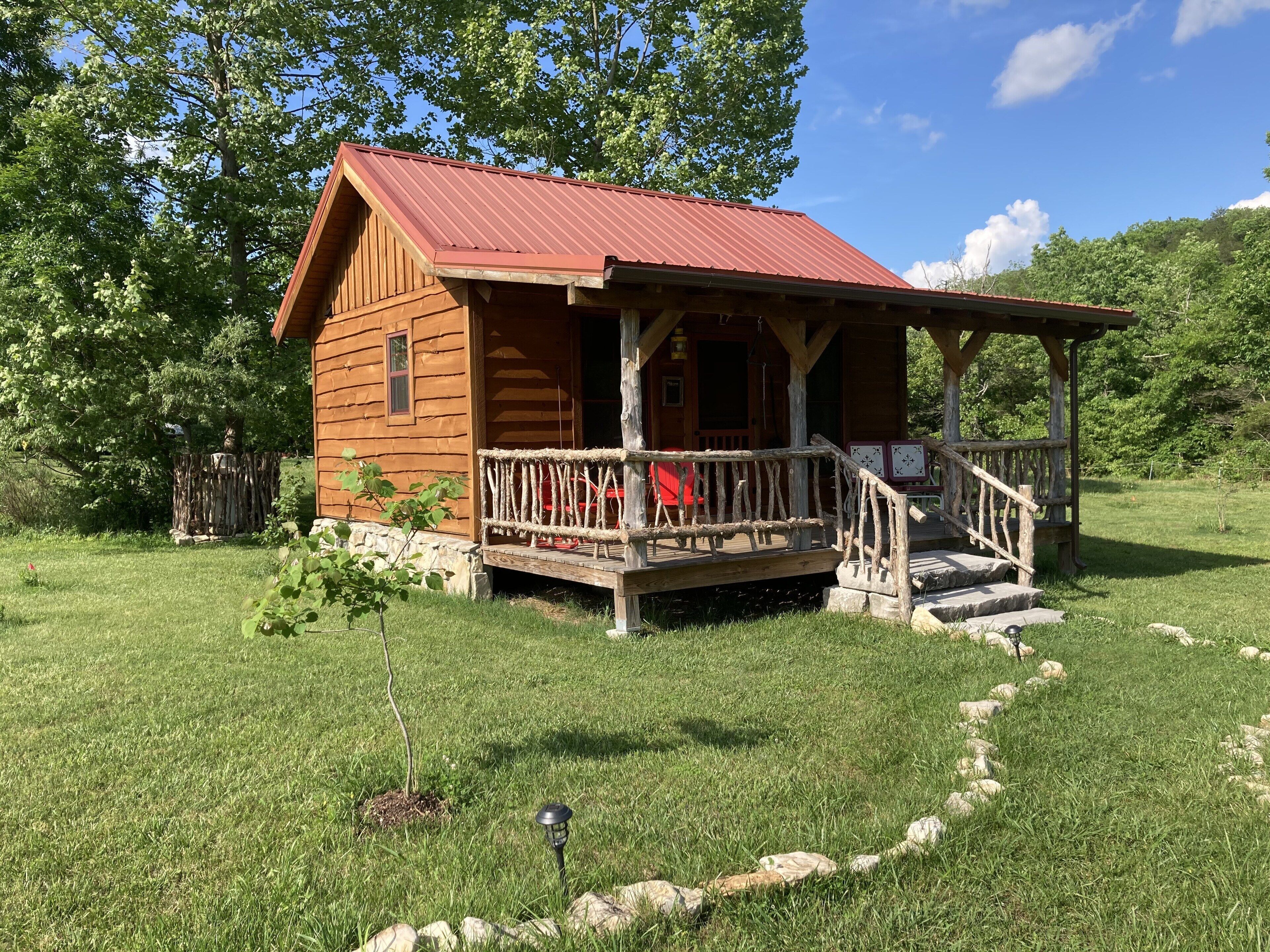 Tiny cabin farm stay! Get away from all the distractions of everyday life and escape to this cozy tiny cabin on our 35 acre farm where you will enjoy a peaceful setting with lots of fresh air and starry nights. Unplug from television and internet to experience how refreshing and renewing life can be! This tiny cabin has everything you will need to make your stay comfortable and memorable. Relax in the glider rockers with a good book in front of the fireplace on those cold winter days. Sit on the front porch and enjoy the beauty of an Ozark farm on warm, balmy summer evenings. Build a fire in the firing (firewood supplied), gaze at the stars and listen to the frogs and whippoorwills. Need more space? Check out our other listing on our farm #815405.