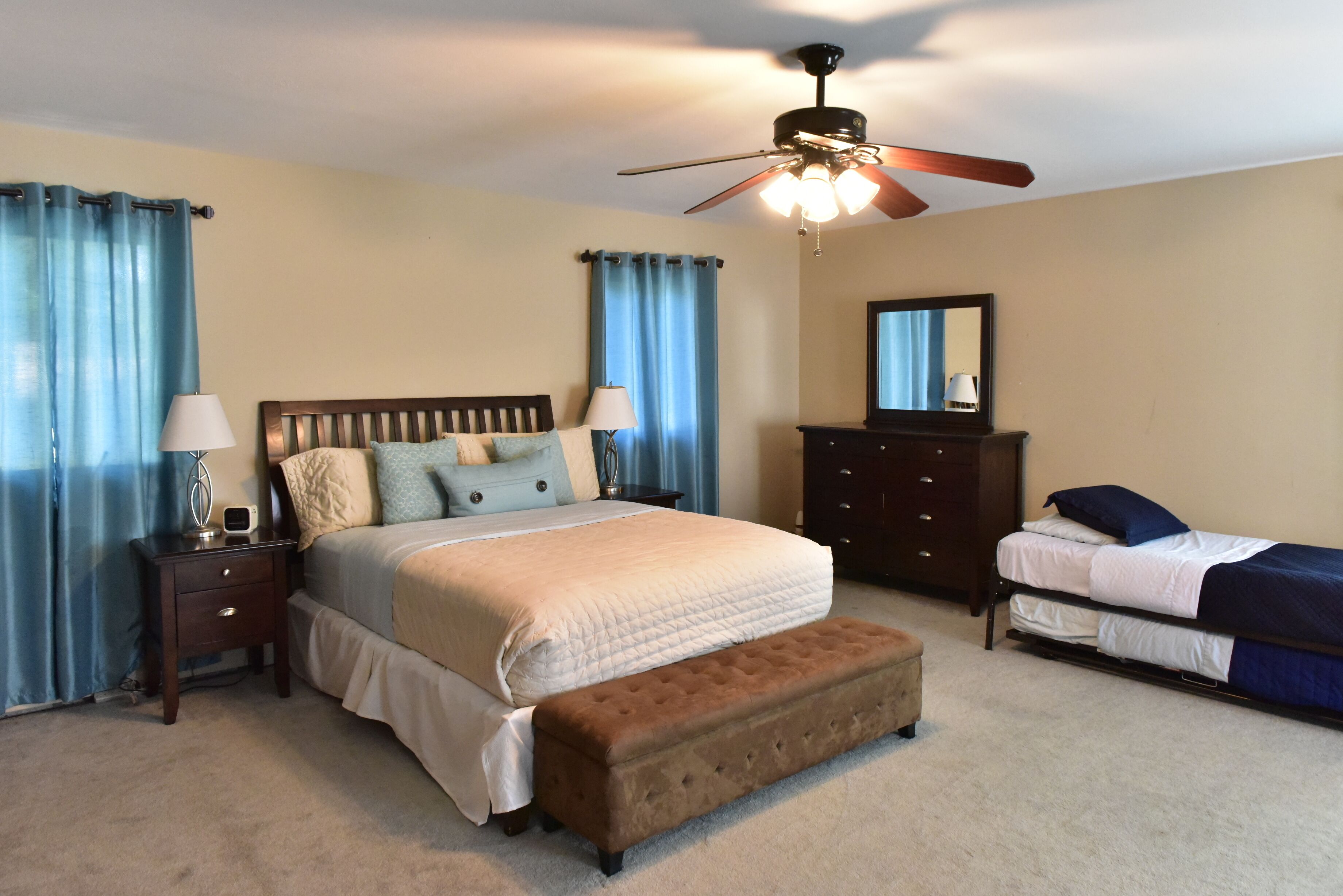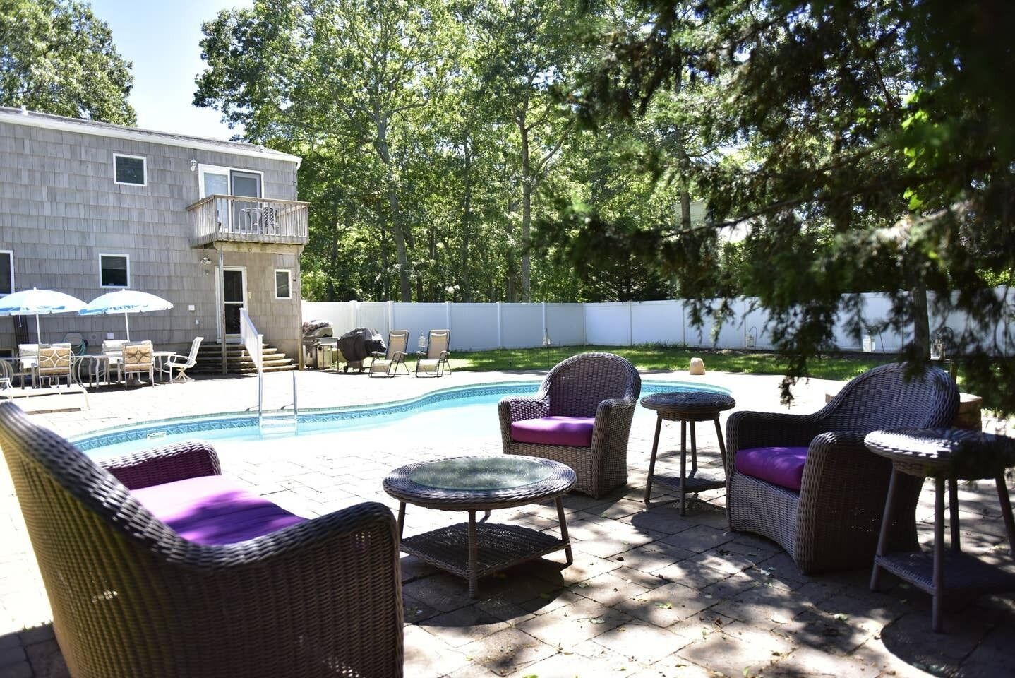 Beautiful Hampton Bays Vacation Rental Home Beautiful cozy well kept home on a quiet cul-de-sac street, perfectly centered in heart of Hampton Bays, NY. Only 3-5mins to several beaches & bays and to some of the best restaurants in the Hamptons. Huge Backyard, heated 18'x33' in-ground pool, sand volleyball court - 3 Beds (huge Master with Sitting Area & Balcony with Seating) / Comfortably Sleeps...