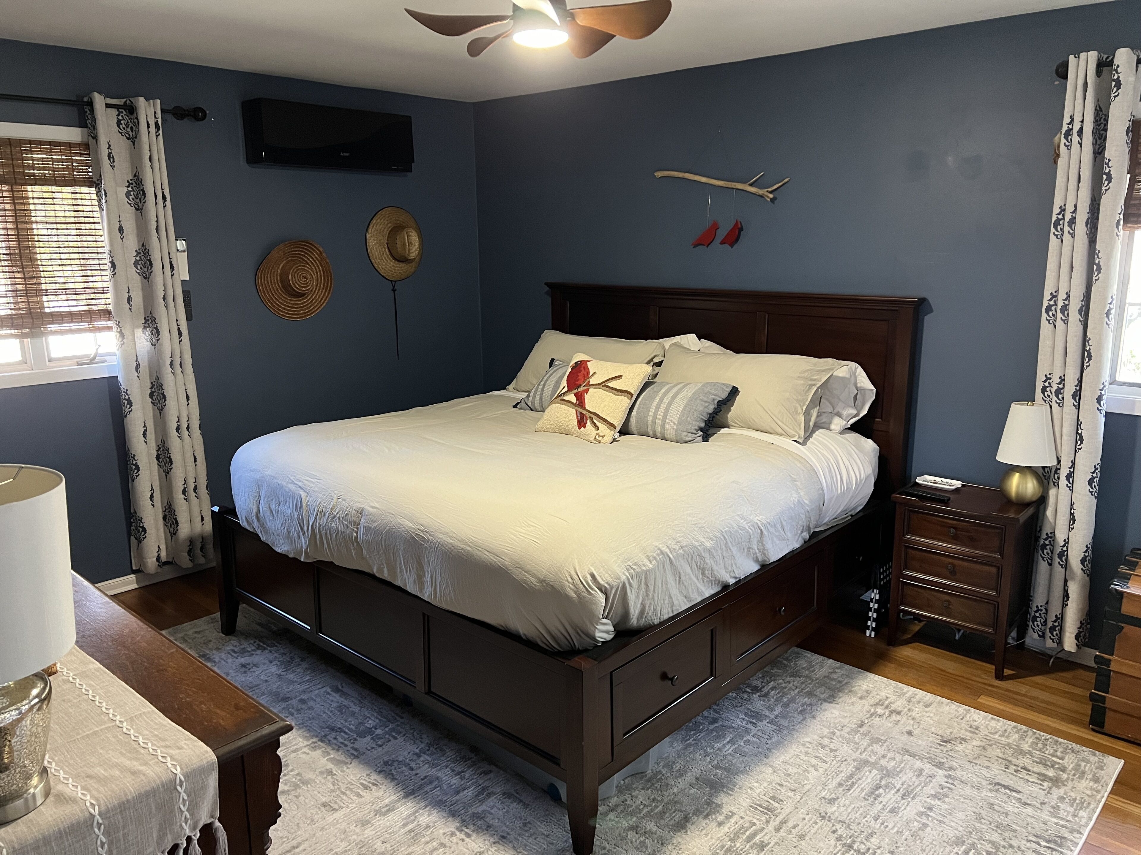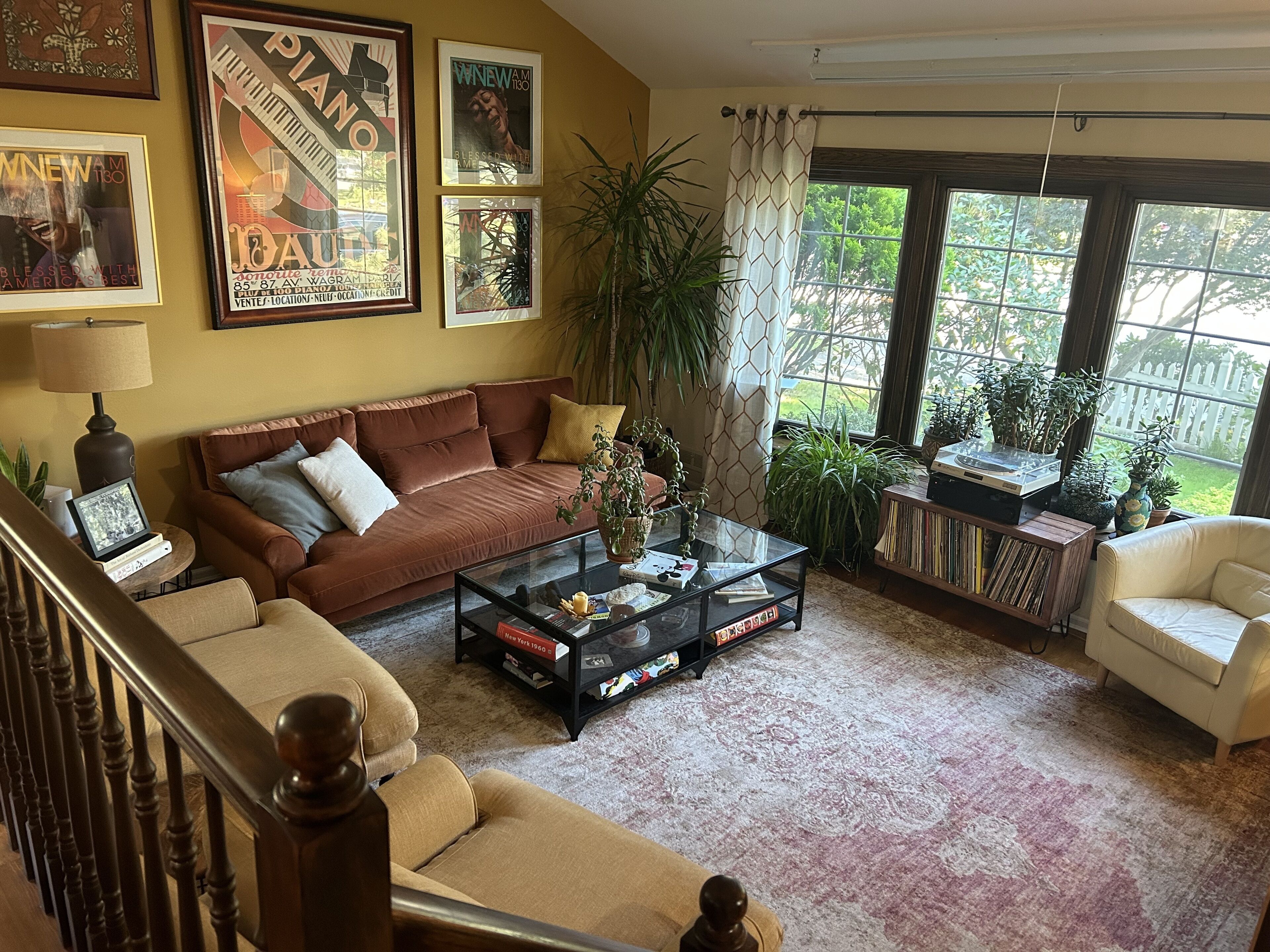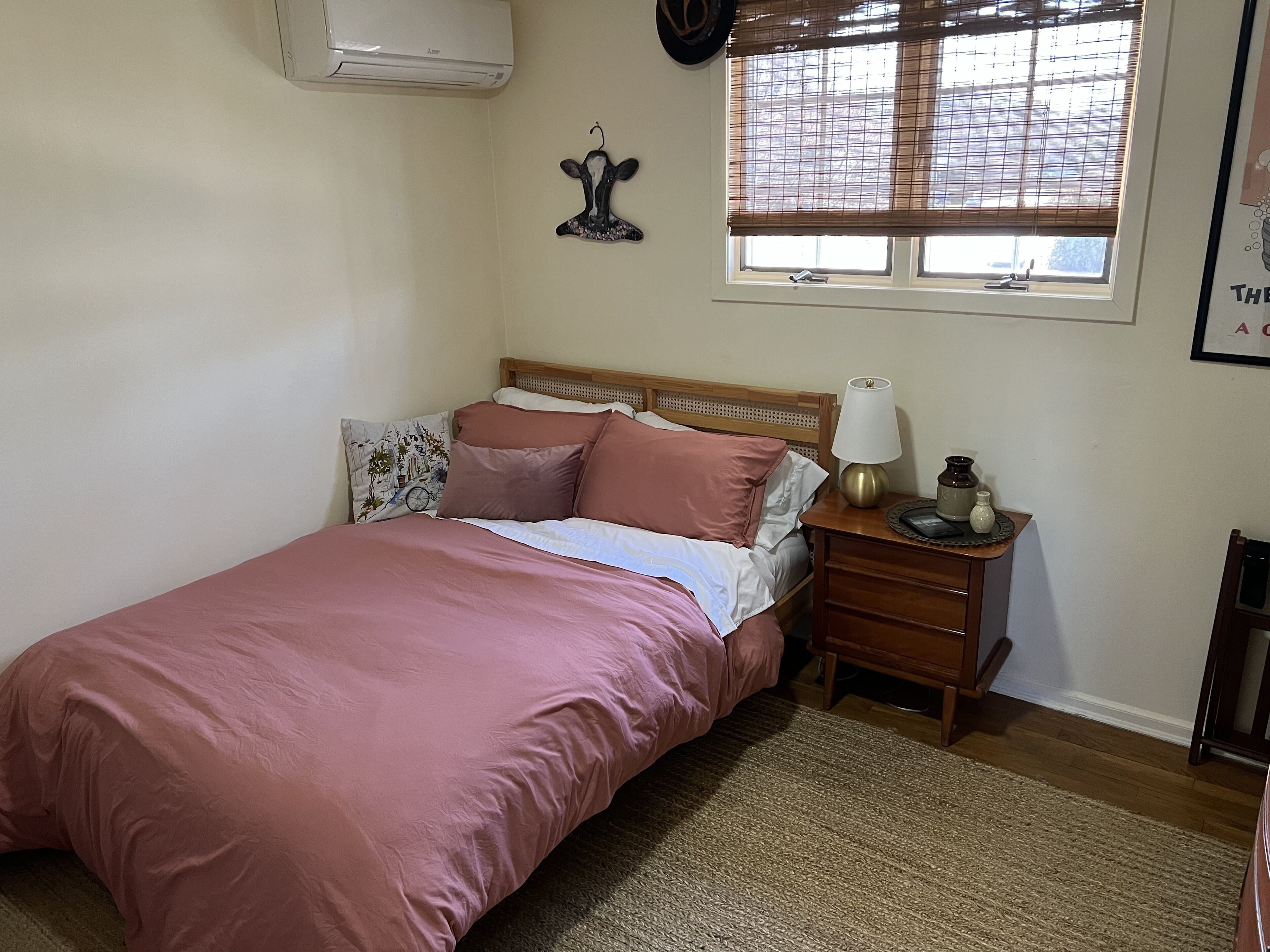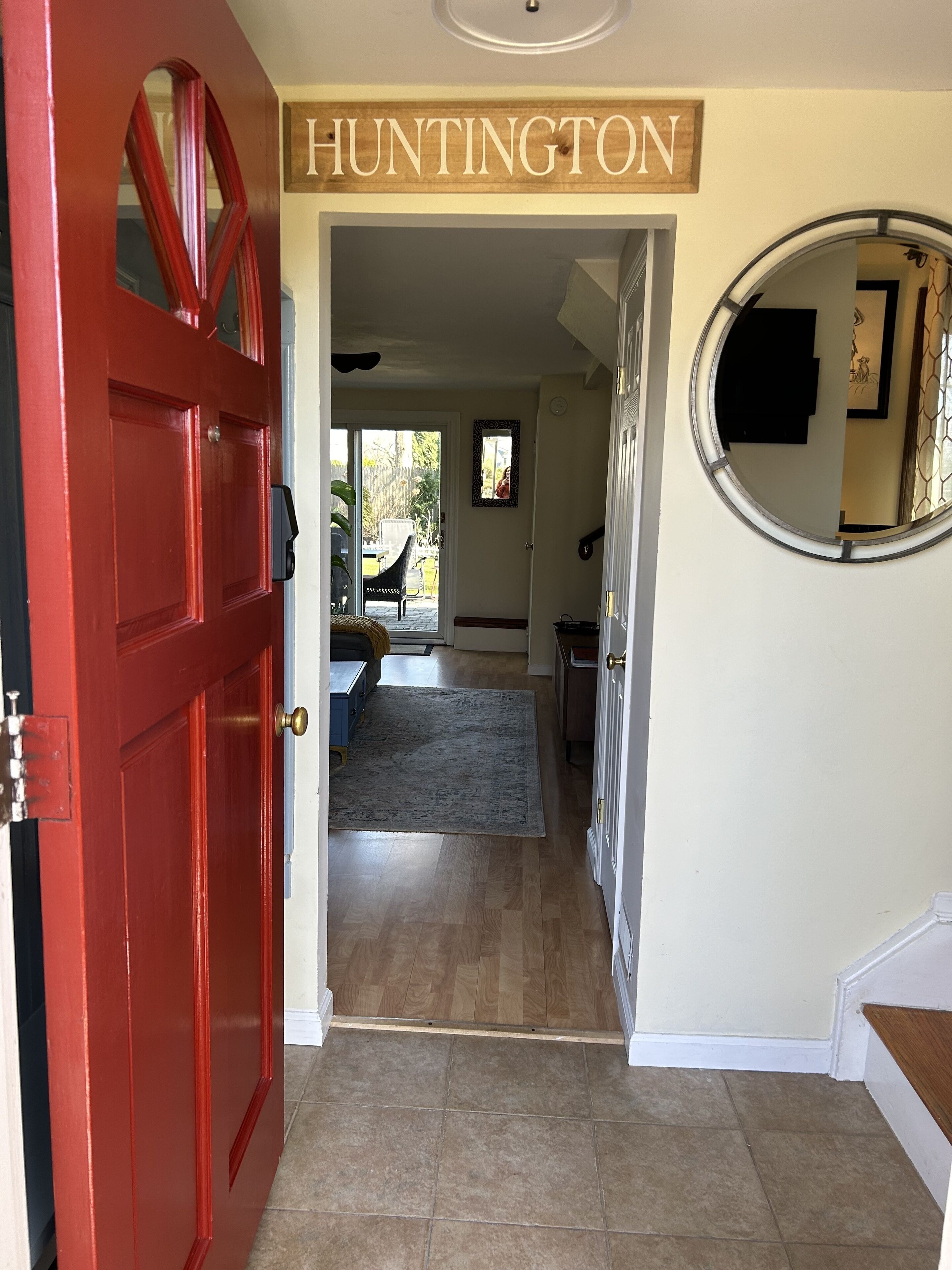 Peaceful home-away-from-home centrally located in the heart of Long Island. Welcome to Evergreen, a mid-century home tucked within a peaceful, tree-lined neighborhood, centrally located to explore all of Long Island.***MID-LEVEL * Open-concept kitchen, dining room, and living room are perfect for dining and entertaining. * Complimentary coffee and tea bar. * Well-appointed kitchen--complete with cookware, dinnerware, equipment, and seasonings* Kitchen table seats 4. Farmhouse dining room table just a few steps seats six or more. * Best NY bagels are just around the corner! DEN: * Double chaise sectional * Large wall-mounted Smart TV ideal for streaming your favorite shows. * A full bathroom with a walk-in shower.UPSTAIRS: * Dreamy pillowtop beds. * Ceiling fan and a Mitsubishi mini-split heating and cooling system in each bedroom that you can set to your desired sleeping temperature. * Wall-mounted TV in the blue bedroom. * A full bath with Carrara marble-top double-sinks and shower/tub combo * Fluffy white towels, washcloths, complimentary shampoo, conditioner, body wash, and blow dryer.DOWNSTAIRS: * A private office with Verizon Wi-Fi internet. * An egress window * Gym equipment (elliptical, treadmill, and free weights) * Washer, dryer, drying rack, and complimentary EarthBreeze laundry sheets.OUTSIDE: * Serene fenced-in yard surrounded by evergreens, mature trees, blooming perennials, and a pollinator garden. * Weber gas grill * Patio table that seats 6. * Hammock* Fire pit Please note:Evergreen is a family home in a quiet residential neighborhood. We welcome guests who respect our property, quiet hours, and our house rules. When inquiring, please let me know a little bit about your group.Things to consider before booking: 1) Parties or large gatherings are not allowed. Violation of this rule will result in cancellation of your reservation with no refund. Please be aware that we have Ring cameras at both entrances for your safety and ours. We can see if additional guests arrive.2) Visitors who are not registered as guests are welcome during the day, but they cannot stay overnight without our prior approval. Please inform us in advance if you plan to have any visitors during your stay. We charge an extra fee of $20 per person, per night for any additional guests beyond six people. 3) We want you to enjoy yourself at our home, but please be mindful of the noise levels at all times. Please keep the volume of music, TV, conversations, etc., at a reasonable level during the day and lower it after 10 p.m. until 8 a.m. 4) We love pets, but unfortunately, we cannot accommodate them at our property. We are especially allergic to cats. Please do not bring any pets or animals to our home (service animals excluded) without our prior approval. If we find any evidence of pets or animals at our property, we will charge you an extra cleaning fee of $200.5) When the house is not being rented, we have a very spoiled senior dog who lives here. And while the house is thoroughly cleaned before check-in, no amount of cleaning can guarantee a completely dander-free home. If you or anyone in your group are allergic to dogs, we want you to know this before booking.