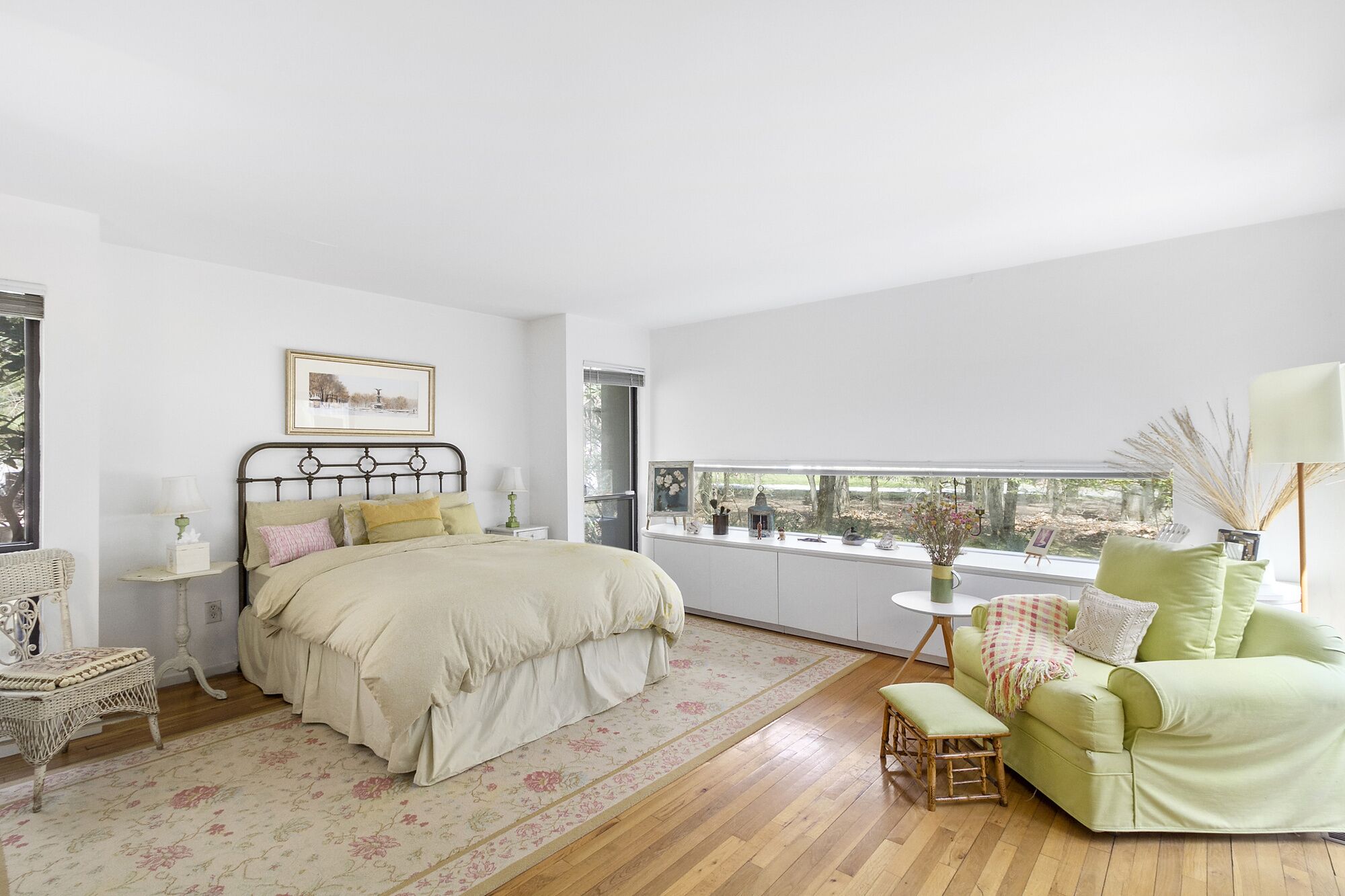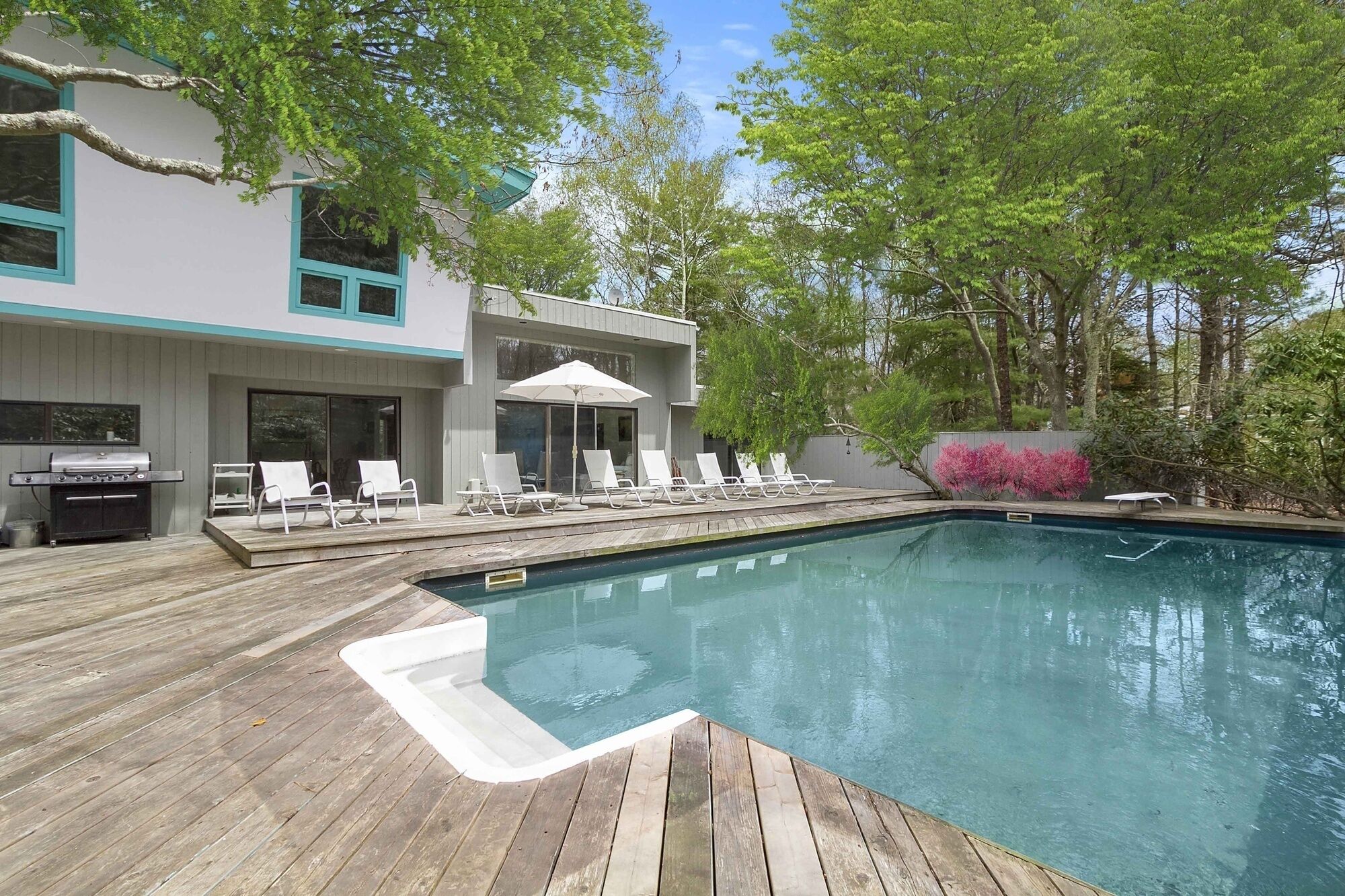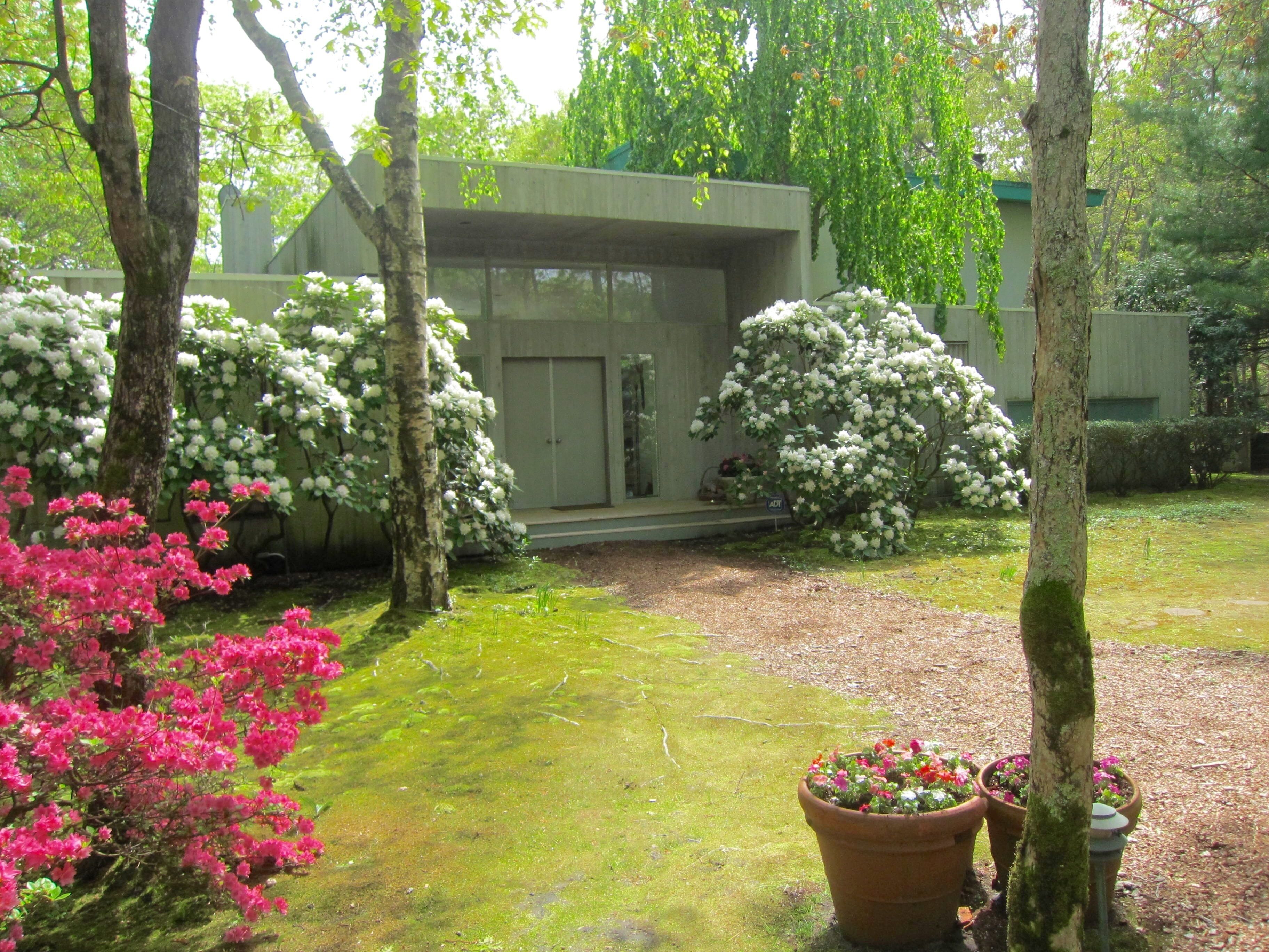 Beautiful Home in Wainscott, walking distance to the ocean with large pool. THE PROPERTY IN A SNAPSHOT5 Bedrooms, including 2 masters, 1 office/ den, which has a sofa-bed, 3 Bathrooms, Sleeps up to 12WHERE YOU’LL BE STAYINGOur home is in the ideal location. On a quiet street in Wainscott, it is located south of the highway in the sweet spot between Bridgehampton and East Hampton. It’s unique setting—walking or biking distance from the ocean beach, two blocks from the jitney stop and the shops in Wainscott, including the best seafood shop in the Hamptons—make it a true find. A large variety of excellent restaurants, tennis courts, civic center and a multiplex movie theater are within 5-7 minutes by car. The house is on a private, landscaped full acre with luxurious trees surrounding the spacious deck and large heated pool.A HOUSE TO ENJOYThe house is designed by the famous architect Philippe Starck, who intended to capture the surrounding nature of the house within its bedrooms. The upstairs master is super-large with a king-sized bed and overlooks the swimming pool. It opens up into the tree-filled surroundings giving you the feeling of sleeping in a treehouse. The den has a computer desk, printer and ample work space in addition to comfortable chairs and a pull-out sofa. The bathroom next to it contains a glass enclosed stall shower. The downstairs bedroom opens up to its own nature filled patio and has direct access to a large bathroom with jacuzzi. Two additional bedrooms are very comfortablThe living room is spacious and has a wood-burning fireplace to enjoy the nights you want to relax at home. Our home is filled with books providing you access to any reading you may want to do. The open kitchen will offer an opportunity to cook at home. Our kitchen is fully equipped with appliances, including a washer and dryer. You can receive guests for dinner in the dining room.There are televisions in every bedroom and in the den, excellent wifi throughout the house, a sound system on the main floor and deck area, with a collection of dvds in the cabinets. Numerous chaises and an umbrella surround our pool. We have a new large grill, a picnic table and benches and, in addition to our pool lights, small strung lighting across the deck providing for extra hours of outdoor evening dining. There is an outdoor shower for after beach and pool activities.The house has a washer and dryer, a dishwasher, picnic coolers, pool/ beach towels, bikes in the shed and access to the beach. Housekeeping service is available. OwnersBarbara J. Berg and Arnold SchlangerBarbara is an historian/ writer who has spent many hours writing in the sun-filled upstairs den. Arnold is an attorney and legal consultant. We fell in love with this house the moment we saw it because it manages to be secluded yet very central to all that we enjoy: the ocean, some of the best biking routes in the Hamptons, antique fairs, great shops, cultural centers and restaurants ranging from fun to fine-dining. The house is extremely well-built and quiet. Adults can read or relax or work but are always close enough to supervise children.Our own children are all married now, but they love coming to the house with their own children for all the reasons that our renters and guests love it.Guests provide their own mealsMin age of renters, 28Max occupancy 8Parties/ events not permittedPets not allowed unless specially cleared by owners.Amenities include: Two zone air conditioningInternetLinens Coffee and espresso makerMicrowaveToaster ovenUtensils, dishes, full kitchen--all appliancesBeautiful heated pooldeck chairsumbrellapicnic tablepool lights for evening outdoor diningLeisure activities include:AntiquingBoatingKayakingSurfingShoppingWalkingClose to: Numerous farm standsChurchesSynagogueUrgent Medical care facilityManicuristYoga studioFitness CenterHome storeBakeriesBagel StorePost OfficeSeafood Shop
