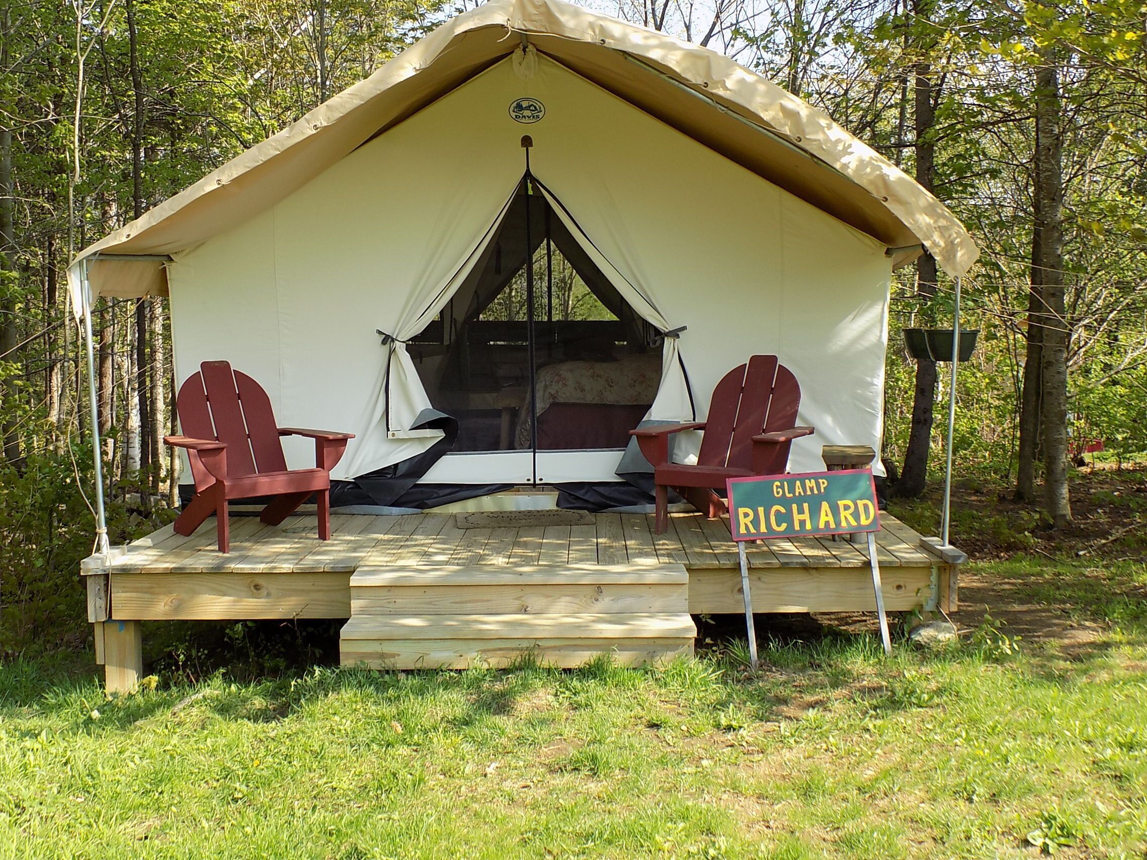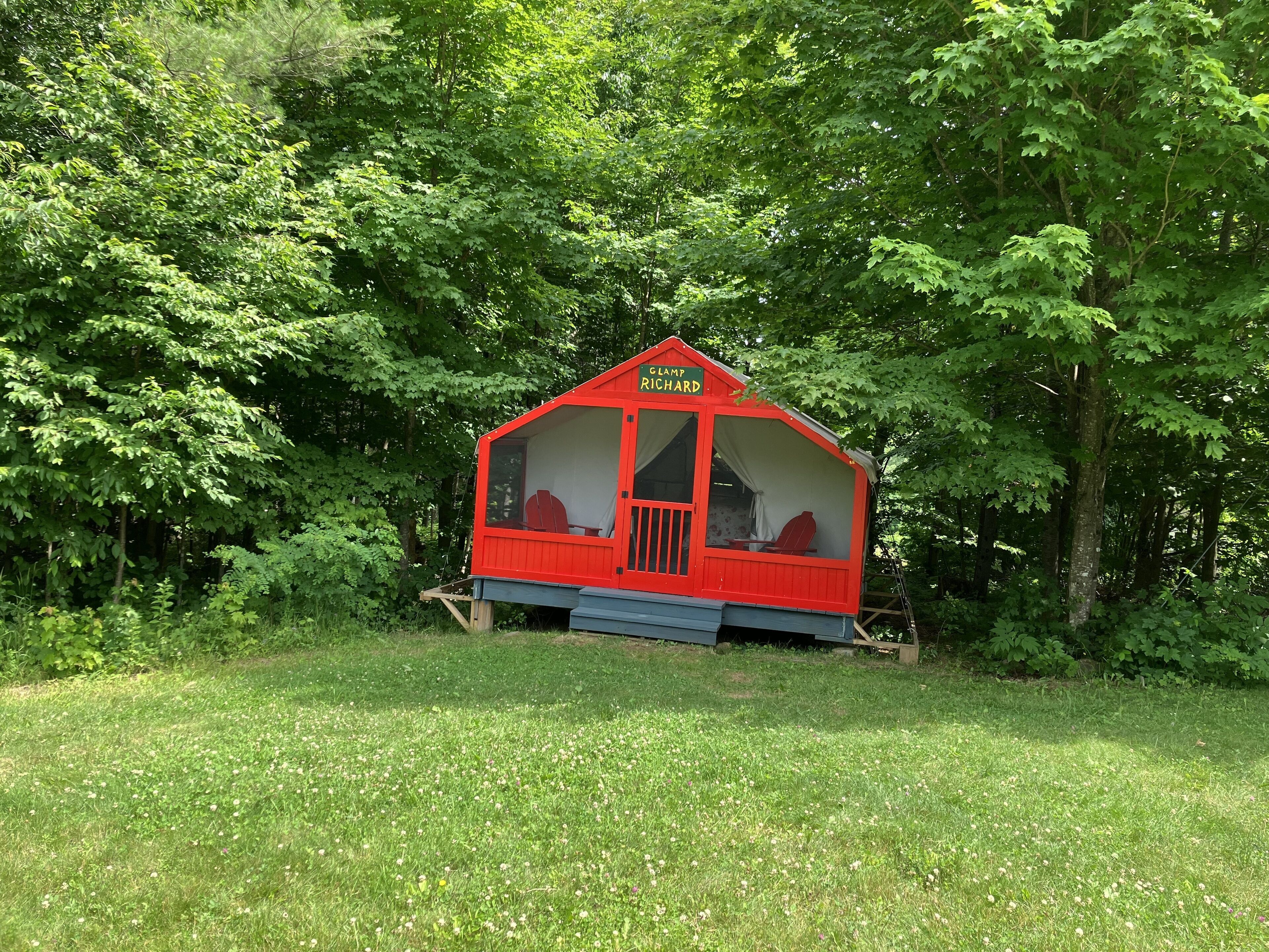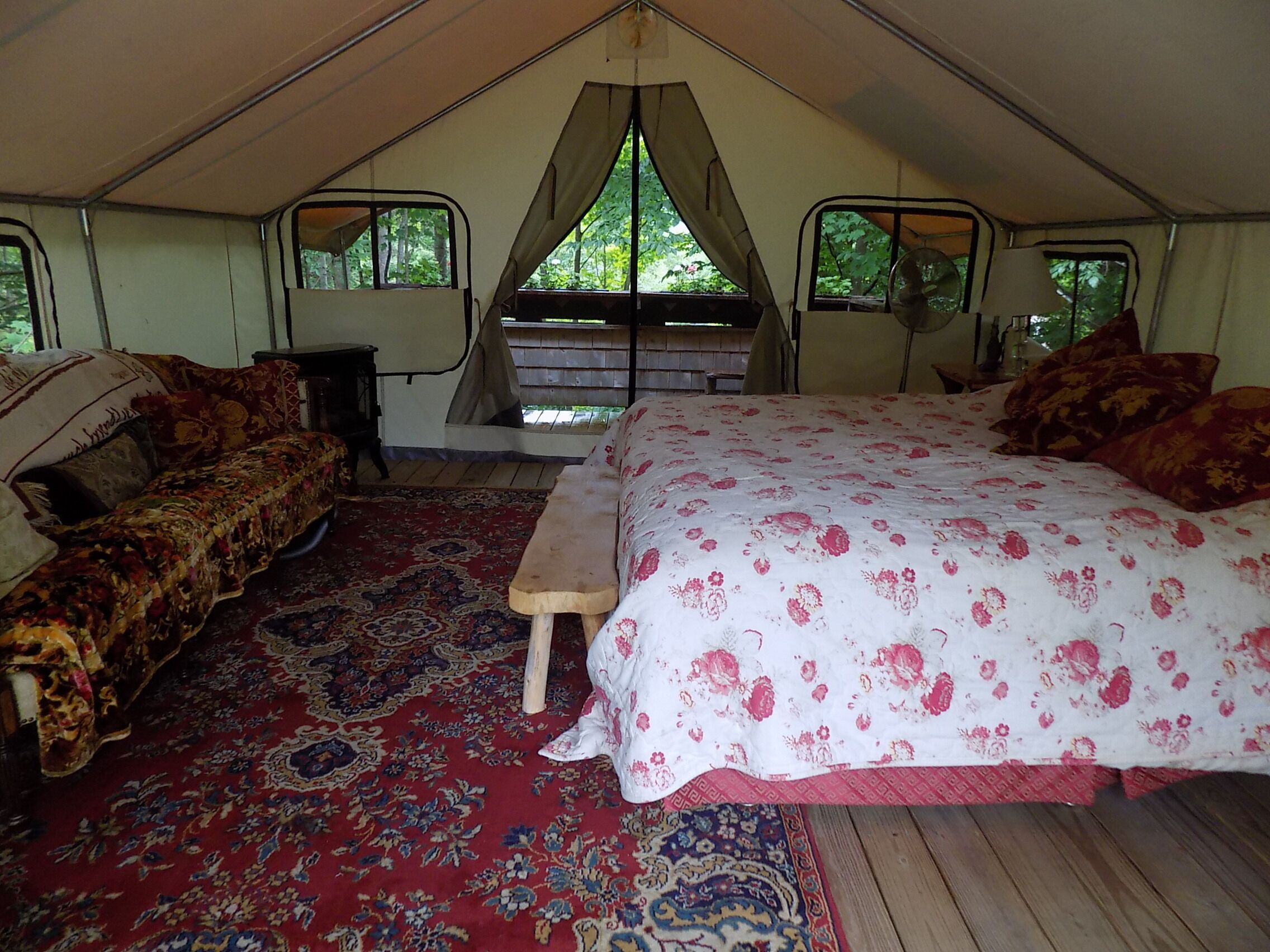 CANVAS CABIN ON PRETTY FARM At the edge of a wildflower meadow with mountain views, this beautifully furnished glamping tent has a king-size water bed, sofa and private deck. Each tent has a kitchenette in the Lodge. There is a sweet new Bath House. Enjoy wood-fired pizza and our new all natural wood hot tub. Get fresh eggs from our henhouse. 40 acres of meadows, woods, pond, streams and trails. Nightly bonfires, star gazing, a nearby lake and rafting in the Hudson River below. Golf cart service to your tent.We have four glamping tents, Glamp Richard, Glamp Suzanne, Glamp Bernice and Glamp Thomas which are spaciously set apart for privacy yet an easy walk to the Bath House and the Lodge where each glamping tent has its own kitchenette. The tents have a “fly” over them so they stay remarkably cool during the day and completely waterproof. At night, zip up the canvas windows and doors, and stay cozy under handmade feather quilts. The new Bath House has a women’s side with two toilets, a shower and double vanity with glass vessel sinks; ditto for the men’s side. In the nearby Lodge, there is also a lovely new bathroom with an old-fashion claw foot tub where you can enjoy a deep bath with lavender salts. We provide nice towels and soap. In the Lodge, there are individual kitchenettes for each of our four glamping tents. It has a sink, one burner cooktop, coffee maker, compact refrigerator, dishes, cutting board, glasses, utensils, napkins and basics of salt, pepper, sugar. Bring your own coffee and cream. There are open shelves for you to store your groceries. Outside are several charcoal grills and a gas grill. We provide charcoal and lighter fluid. We spent the fall and winter of 2019 building an amazing all natural cedar hot tub. Located on one of the most beautiful spots of our land, our new Japanese wood hot tub is a delightful treat for our guests. Built within a small post and beam temple-like structure with gorgeous views of the mountains beyond and wildflowers below, our spa tub is a wonderful way to relax during your stay. $25 for an hour’s retreat of happiness. Most nights in the summer, we offer wood fired pizza. Here’s how it works. We make and provide the dough, and guests bring their own toppings. We fire up the wood-fired pizza in the late afternoon. By six, the wood fire has died down and the oven is about 800 degrees. Starting at 6:30 and ending about 7:30, guests come to the pizza pavilion with their toppings and we help them cook their pizzas. Because the oven is so hot, the pizzas cook in about three minutes. Lots of fun! Oh, most toppings should be sautéed in advance since the cooking time in the oven is so short. (Requested donation of $8). At dusk, we get the bonfire going so guests can relax in hand-built Adirondack chairs to watch the fire and the stars. There is no “light pollution” so it is an amazing experience to see thousands of stars, night clouds, moonscapes. Enjoy getting your breakfast eggs from the henhouse --- our chickens will be laying their first eggs at the end of July 2021. Our flock of chickens and ducks are fun to watch as they free range all over the property. The ducklings enjoy it when there is fresh water run into their little swimming pool --- they are so joyous when they’re in water. The ducks are sweet but shy away from people (oh no! humans!). Unlike the chickens that wander all day and come back together to the coop only to sleep, the ducks are co-dependent and stick together all the time; if one duck is separated, they all quack until they get back together. So yes, country life can be noisy with the chickens cackling and the ducks quacking! And of course there is Sammy Dog, a lab/shepherd mix, who bounds around the property, visiting all our guests, laying down on the porch and steps waiting for people to come home. Be careful coming down the driveway because he sometimes leaps unexpectedly in front of cars all goofy and happy. He can come in and even sleep over if you want (just send us a text message so we know where he is). Our cabins are set up for visiting dogs, but unfortunately we cannot host dogs in the tents. The lake is three miles down the winding road …13th Lake it is called and it is just beautiful. Totally natural and quiet with no sign of civilization on its shores. The Hudson River is at the bottom of our mountain; clear beautiful water; you go tubing or rafting with the various rafting companies located right nearby. The town of North Creek is five miles away off the main Route 28 road but it’s easy to miss so look for the 3 or 4 signs that mark the entrance to “town”. North Creek is a scenic little town with some great restaurants, a grocery store, liquor store, some shopping places and a scenic train called the Saratoga/North Creek Railroad which takes folks in antique train cars along the Hudson River. Another great experience is nearby Garnet Hill Lodge, an historic lodge offering lunches and dinners … beautiful property, amazing views, great food. It’s located right up the road in North River. They rent mountain bikes and have all kinds of walking trails. Lots and lots more to do … check our online Guide Book for more suggestions! So .... Enjoy amazing mountain day views and glorious stargazing by night ... this might be the most special vacation you’ve ever had! Quiet and tranquil … safely and privately located at the edge of our Hobby Farm where you can enjoy a beautiful tent, ducks and chickens, and sweet lab dog. If you're looking for additional space, we have other cottages on the property as well ... Authentic Adirondack Bird Camp which has two bedrooms. Our other cabins have one bedroom: Farmstand Guest House, Camp Hudsonview, Camp TwoSome, Camp Lillian and Camp Bossie, all of which are listed on this site.Farmstand Guest House – Homeaway listing 3646886Glamp Bernice - Homeaway listing 4227751Glamp Suzanne - Homeaway listing 4005409Glamp Thomas - Homeaway listing 4227739