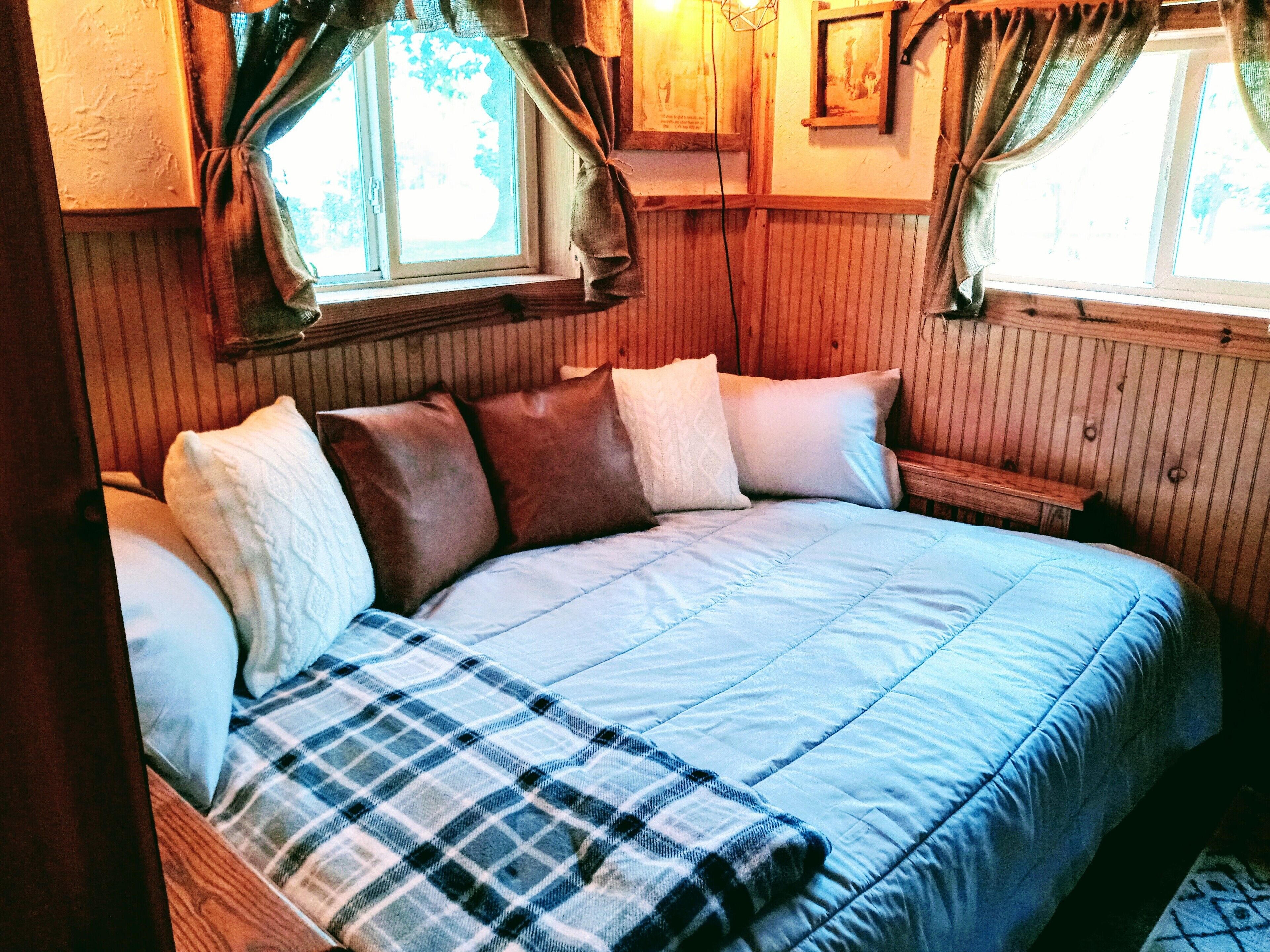 Tiny home cabin by the pond A beautiful little tiny Cabin guest house. Cabin is located behind the host family's house. Queen bed and futon couch ( ideal for small children). It has Private patio and fire pit. Take a walk on path through the woods to two additional fire pit/picknick areas, feed the goats and ducks, catch and release fishing. Kitchen with full stove/oven, microwave, mini fridge,...