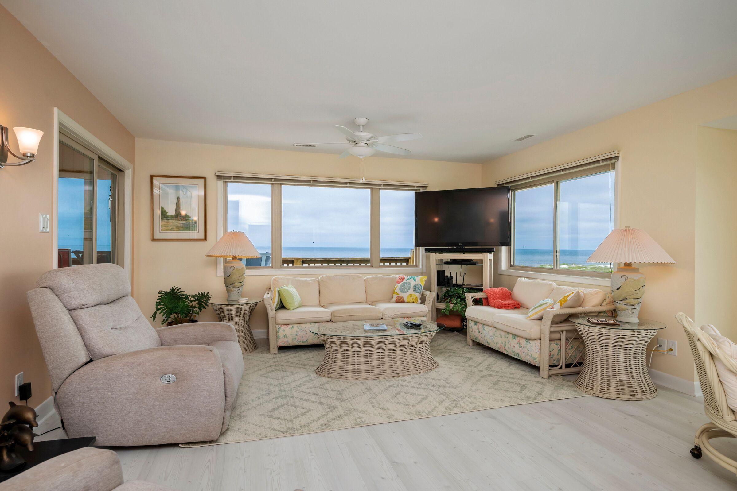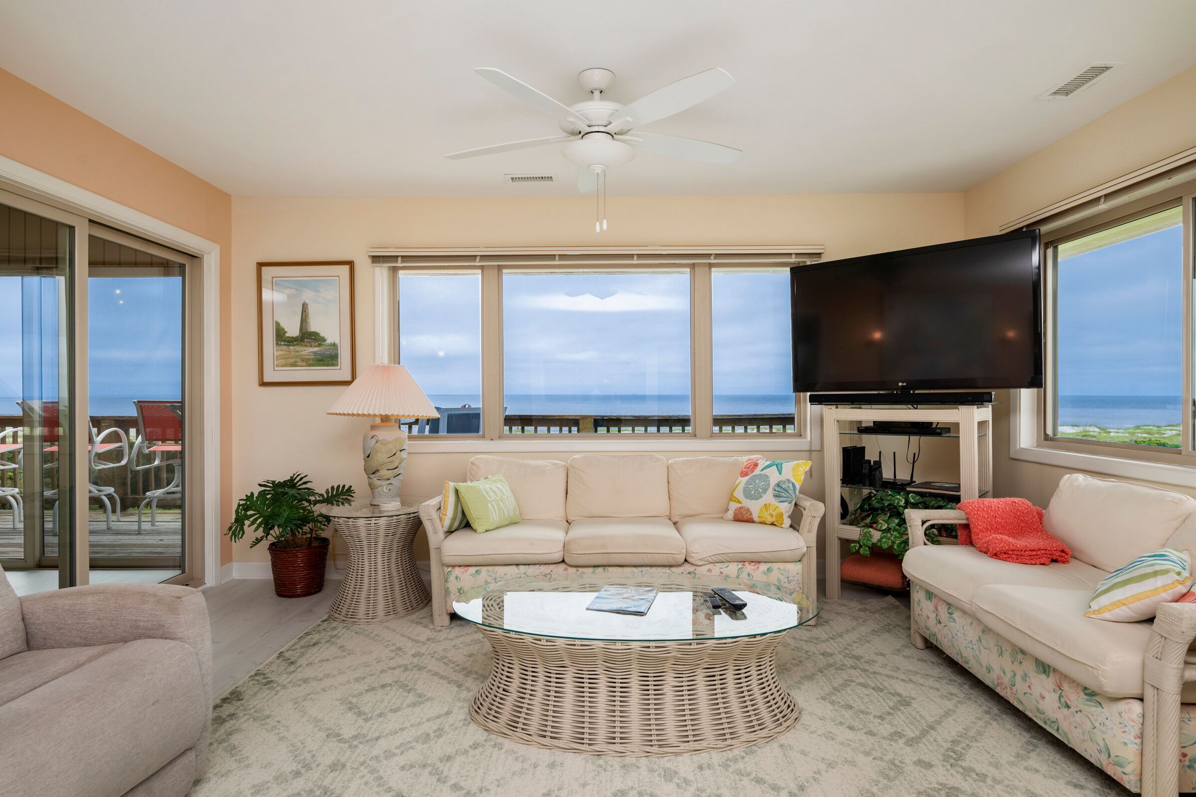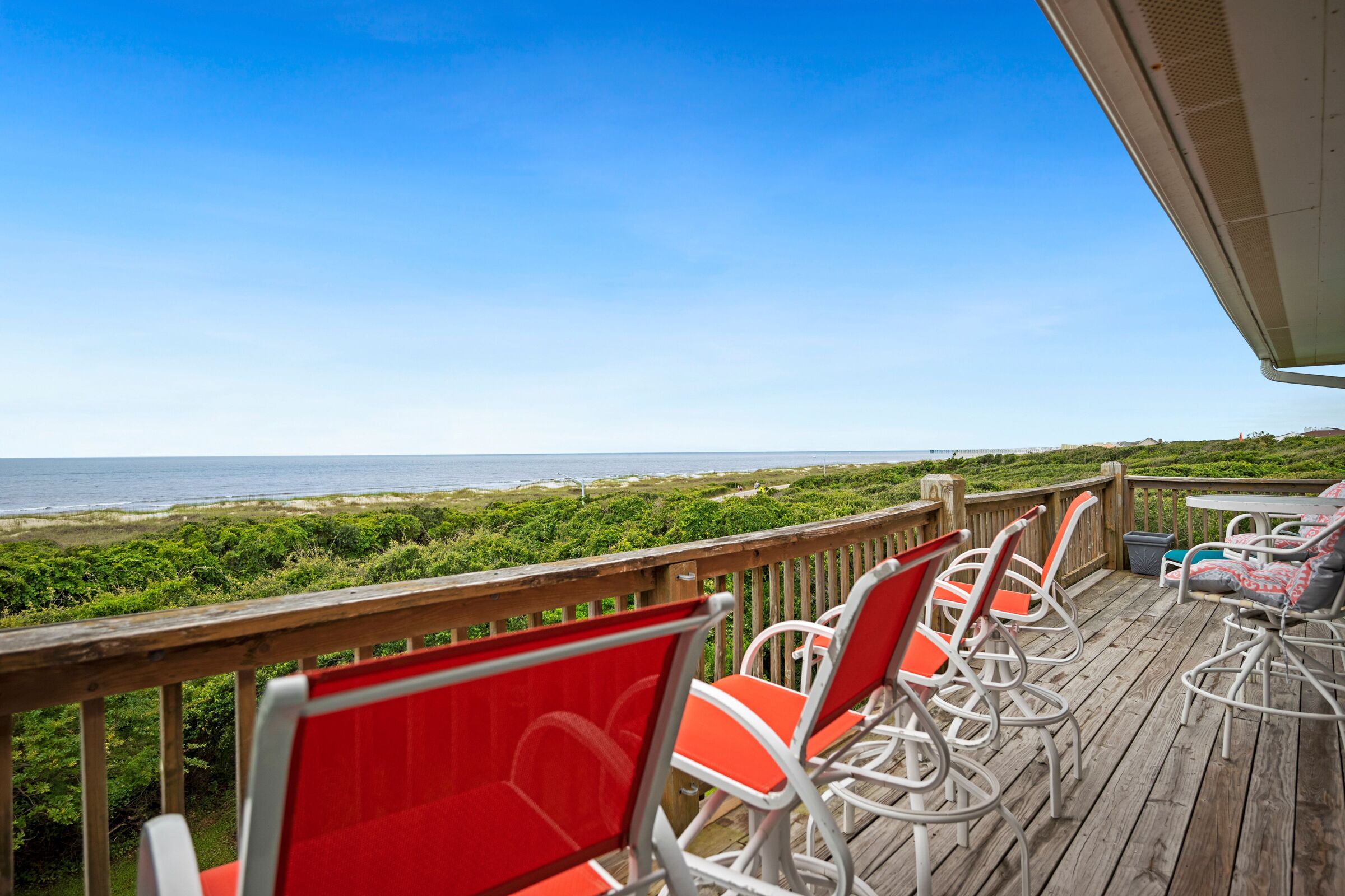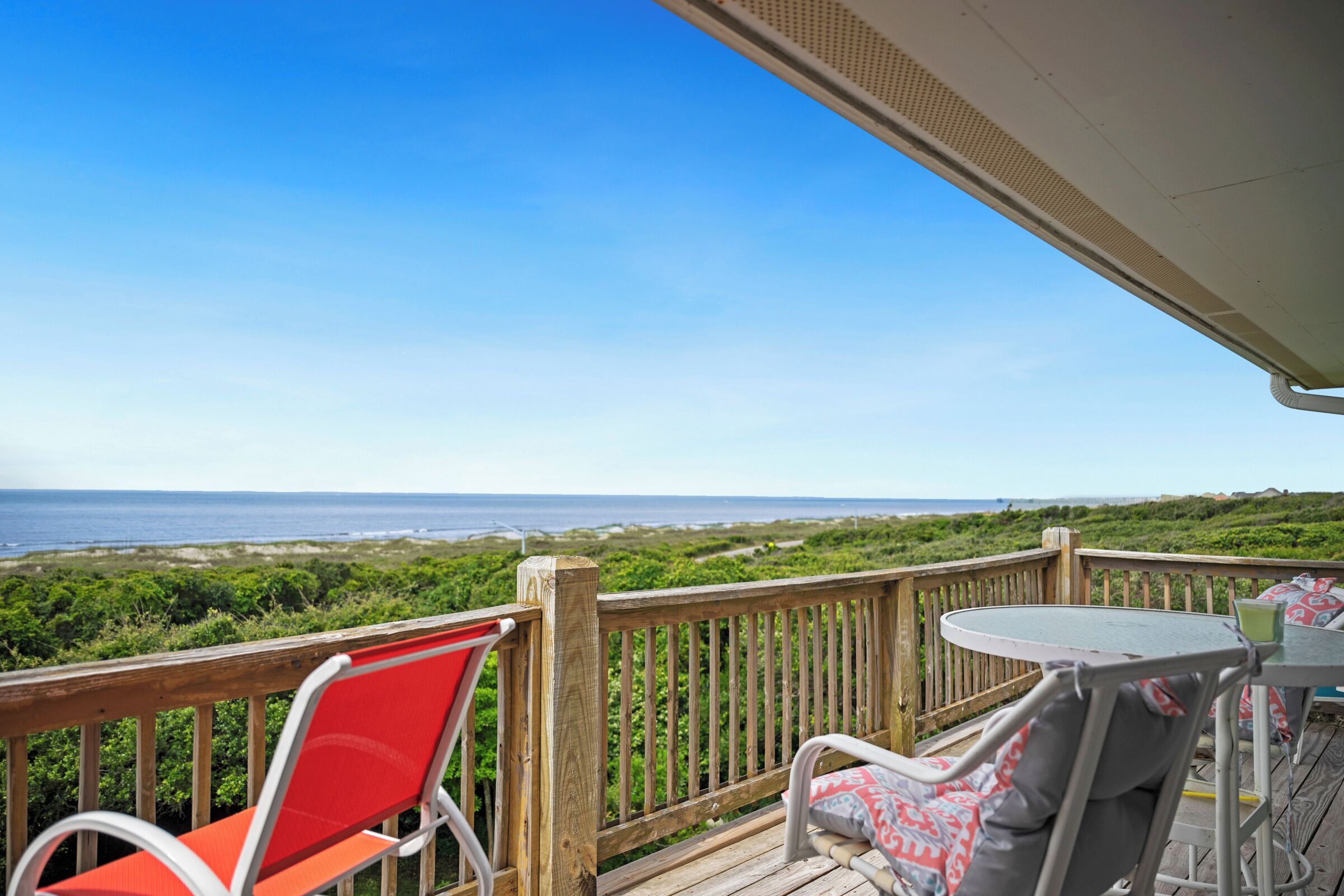 A Searious Sunset View: Condo with Panoramic Ocean Views and Community Pool 3 Bedrooms | 2 Bathrooms | 2nd Level Condo1 King | 1 Queen | 2 TwinsCaswell Dunes condo with large sun porch with furniture and ceiling fan. Over-sized ocean view deck with furniture. Enjoy the unobstructed panoramic ocean views from just about every window. Guests can use the Caswell Dunes community footpath to reach a pu...