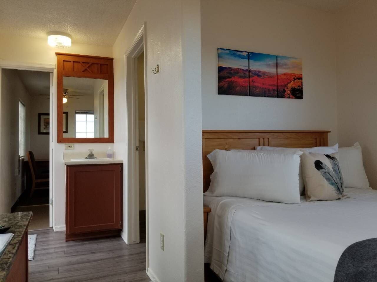 072B Affordable Retreat nr South Rim Sleeps 4 Summary:Discover a new adventure every day in this newly remodeled, private 2-bedroom, 2-bathroom apartment. This cozy room is located 20 miles away from the Grand Canyon National Park in a mobile home park 3 minutes down a gravel road. Let the worries of the world slip away while you prepare for your Grand Canyon adventure with 2 plush queen-size beds that sleep 2, a smart TV with WiFi, a microwave, and a mini fridge. Only minutes away from a gas station and restaurants.The Space:Access will include two separate bedrooms, two private bathrooms, microwave, coffee maker, refrigerator/freezer, and smart TV. Due to our remoteness, our night skies offer world-class stargazing. This location is superb for getting the most out of your Grand Canyon experience, being right in the middle of the action of the Grand Canyon, Bearizona, and the Sky Walk.Guest Access:2 car parking area. Please come and go as you wish. The front door is a smart lock and need a 4 digit code to get in, guest will receive code once they book the room. There is also a gazebo and BBQ grills that guest have access to.The Neighborhood:You will be close to all the action, but in an incredibly relaxing and private escape. Just a 20-minute drive from the Grand Canyon National Park means you can arrive in time to see the sunrise or sunset. We also recommend checking out other nearby attractions, including: Bearizona in Williams or Downtown Flagstaff.The area you are in is 1 mile down a gravel road in a rural area. There are other houses and campers in the area, as well as street lights and security cameras.Getting Around:There is an airport and a park shuttle service in Tusayan, AZ, 20 miles away. Uber and Lyft are offered inside Grand Canyon National Park.Other Things to Note:The location is in between the city of Williams, AZ, and the Grand Canyon South Rim. Although we use Williams’ zip code and city name in our address, our location is not inside the city of Williams, but it is 30 miles away from it. Please check the address with your GPS before driving to the location. From Highway 64 you will turn down a DIRT road called East Woodland Ranch Road. During winter months, it does snow, but most of the time the road is still drivable, even in cars. It’s located inside a mobile home park that has streetlights and is fenced in, but the area around the mobile home park is desolate and old. However, with it being so isolated, star gazing is highly recommended while you stay with us. There is a gas station 5 miles from the location that sells small amounts of produce and snacks. We do not have kitchens, but we suggest bringing food with you because there aren’t many options nearby besides the gas station and small restaurant 5 miles away from the property. We have charcoal BBQ pits, gazebos, and picnic tables around the property for guests to use. If there are any problems with the room, please message me through the booking platform, as it’s the fastest way to receive a response. Please be courteous to people who live and are traveling the area like yourself. For winter months we have a space heater located under the sink cabinet.Interaction with Guests:We take your comfort very seriously, so let us know if there are any issues. We have people who live on site or close to it, to help the guest in any way.
