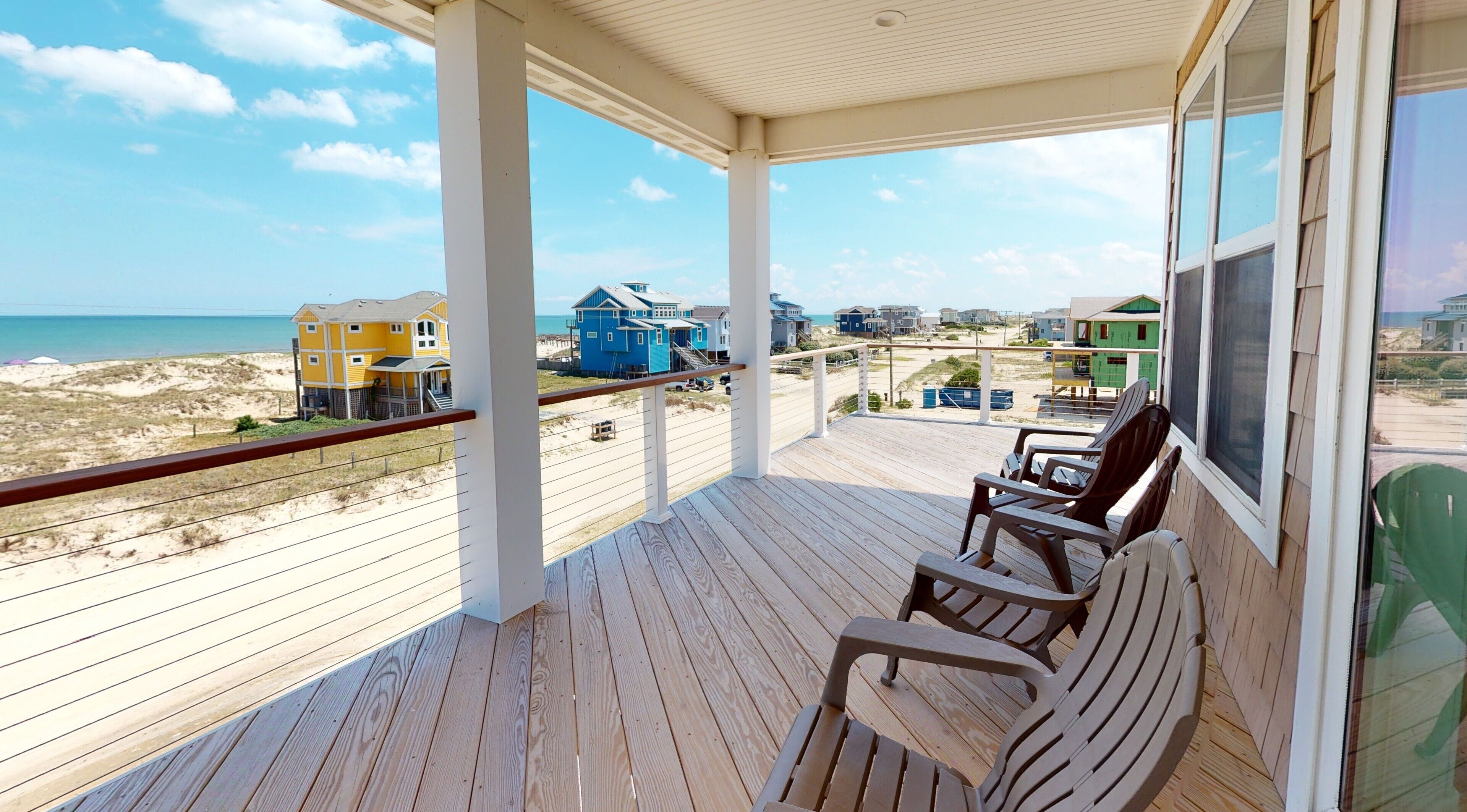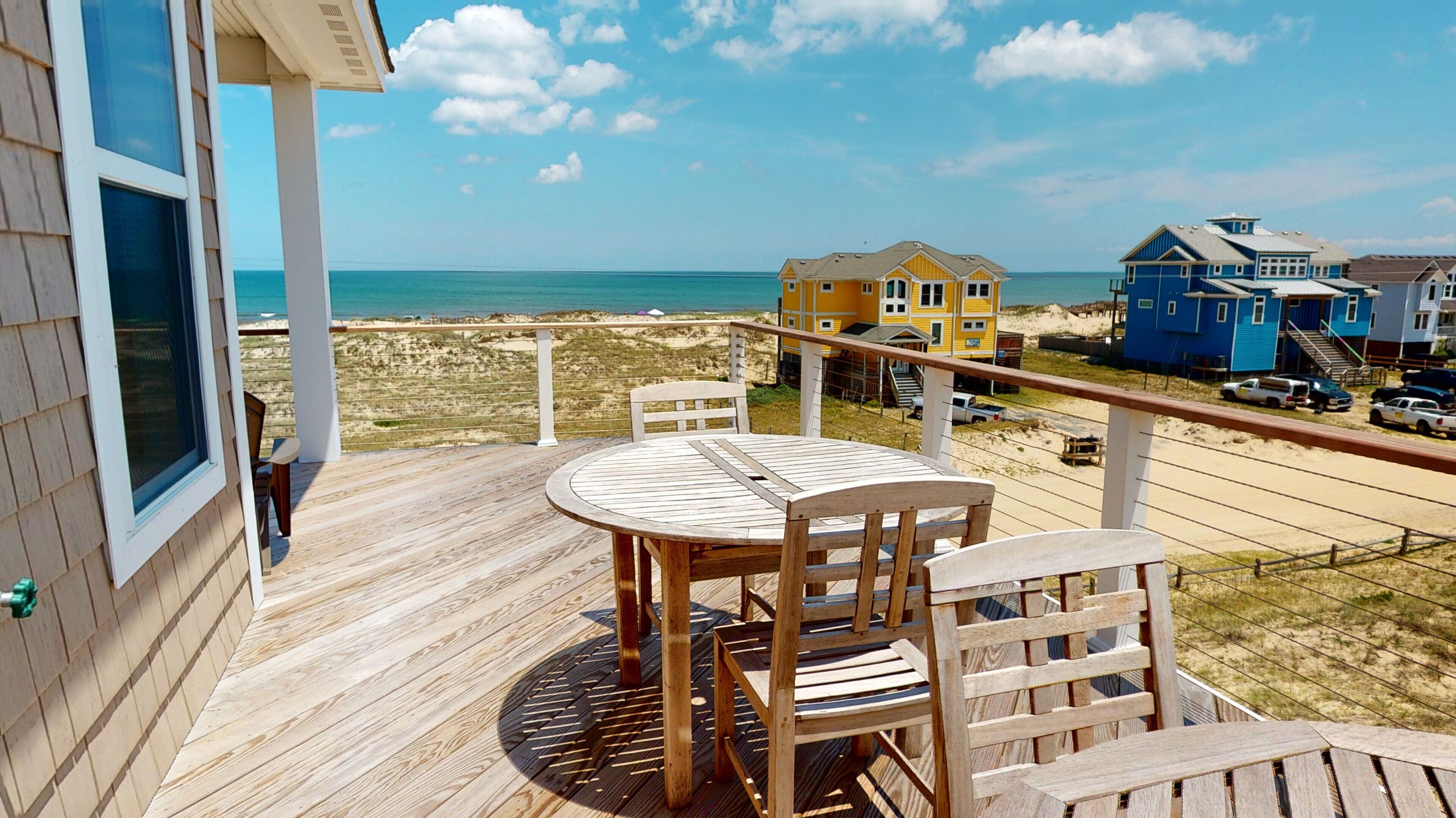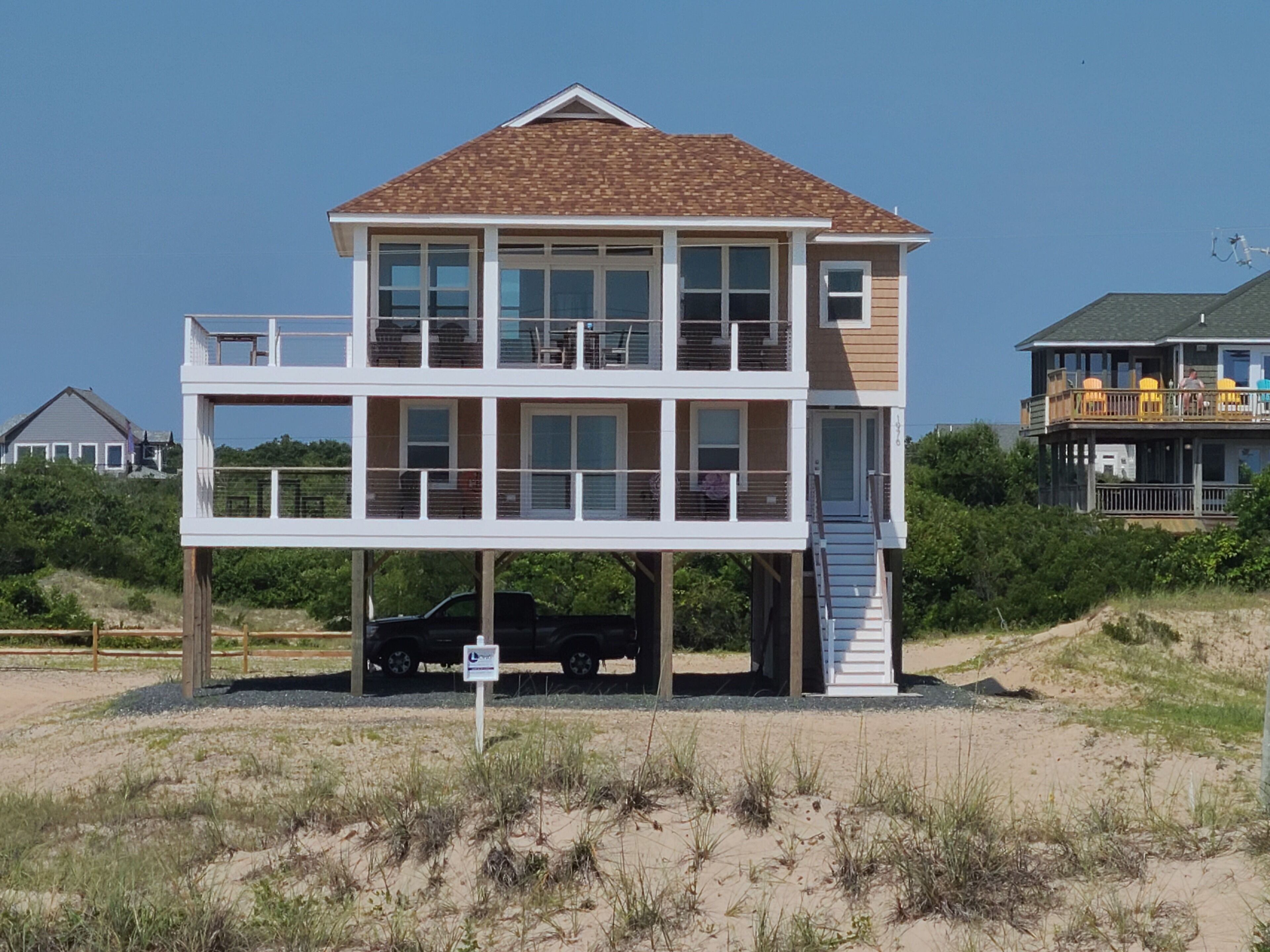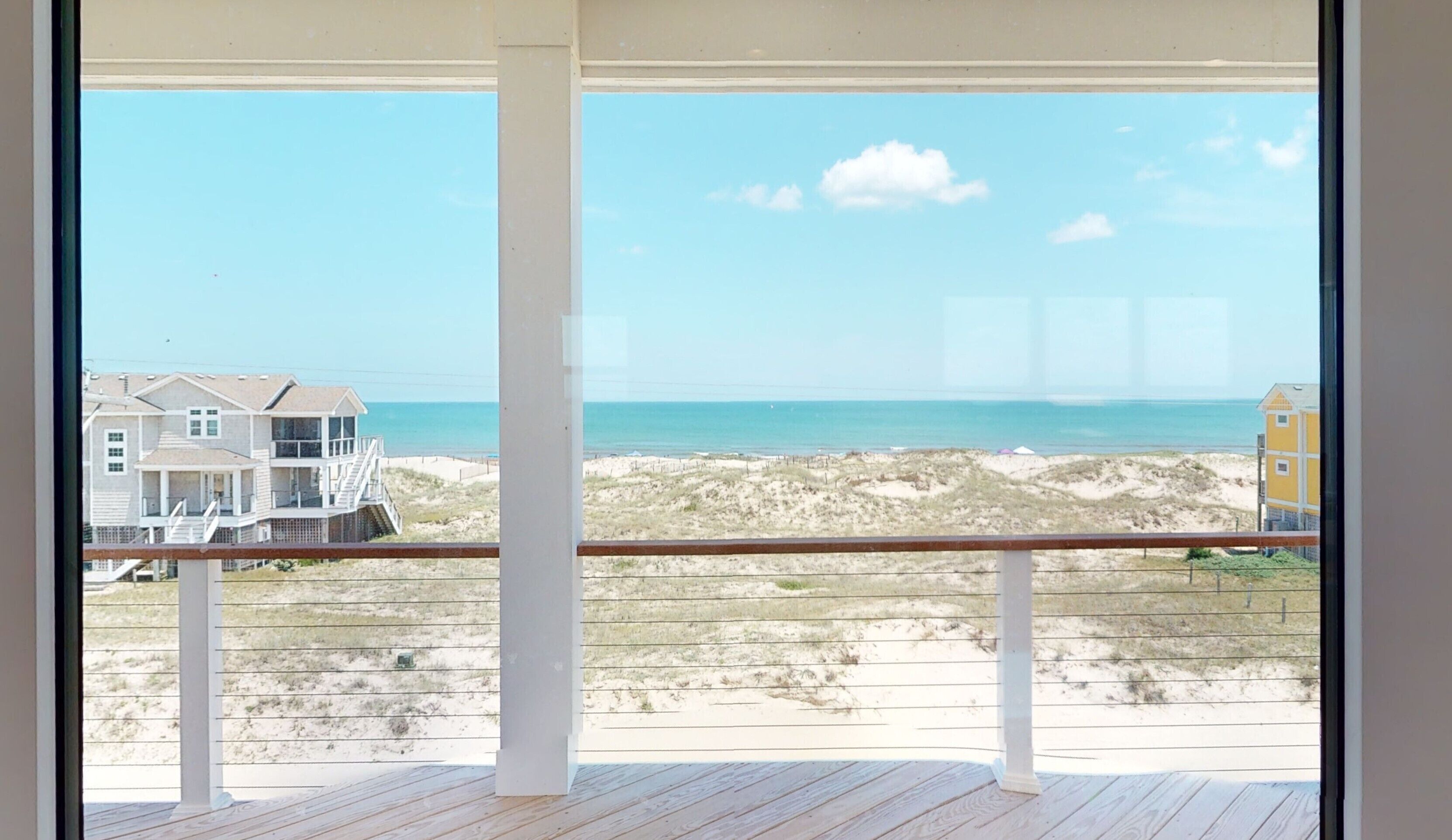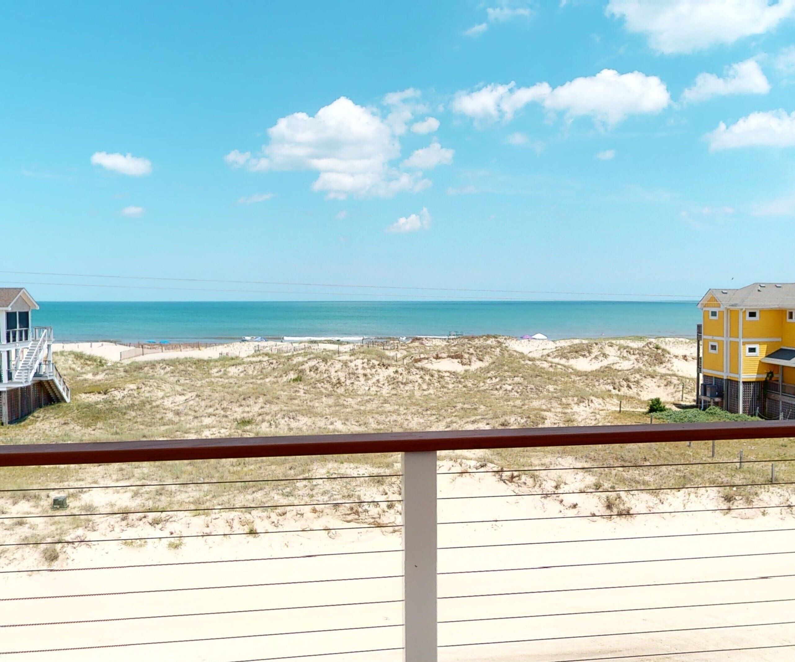 New home by premier builder. Fantastic Views! 4x4 Required Welcome to Harper House, a lovely 3BR home with fantastic ocean views on the 4x4 beach. The wide beach and close beach access make this North Swan home an easy choice! Located on the second row with no oceanfront home directly in front, Harper House views and sounds of the surf come right into the living room! The heavenly breezes will whoosh all of your cares away and relax your soul. The owners of this home love the minimalist approach and it shows in the outfitting of every room. The Ocean is the main focal point from both levels. There IS a tv for the diehard.... but there are no other screens to divert your attention from the focus of the Atlantic Ocean and your family. Level one has a keyless entry which makes life so much easier! No keys to find or lose! On level two there is a queen master bedroom with a gorgeous master bath and huge private deck. The other two bedrooms on level two share a hallway bath and are a queen in one, and two twins in the other. Linens and towels are provided. On level three you will find a wide open kitchen with very comfortable and inviting island seating, leather sofas, the lone smart TV connected to satellite and a huge dining room table. Expansive wrap around decks invite you to partake in a sun drenched south exposure or the more relaxed ocean side covered porch. The teak outside dining table will invite you to picnic while listening to the pounding surf. The fact that there are no homes between you and the ocean makes Harper House a delightful way to reconnect with nature. The ocean views will delight you with dolphins, pelicans, shore birds and surf, while the occasional fox or wild horse will top off the back to basics feeling that Harper House provides. The ocean is calling.. come experience it in full at Harper House.Saturday Check in - 4 Wheel Drive Required - Linens and Towels provided - located approximately 7 miles up the 4x4 beach - NO pets. Parking passes for parking two cars on the beach are included with this home. Parking at the house is free and unlimited. There is No Pool or Hot Tub at this home.Save money by booking directly on the Carova Cottages website: