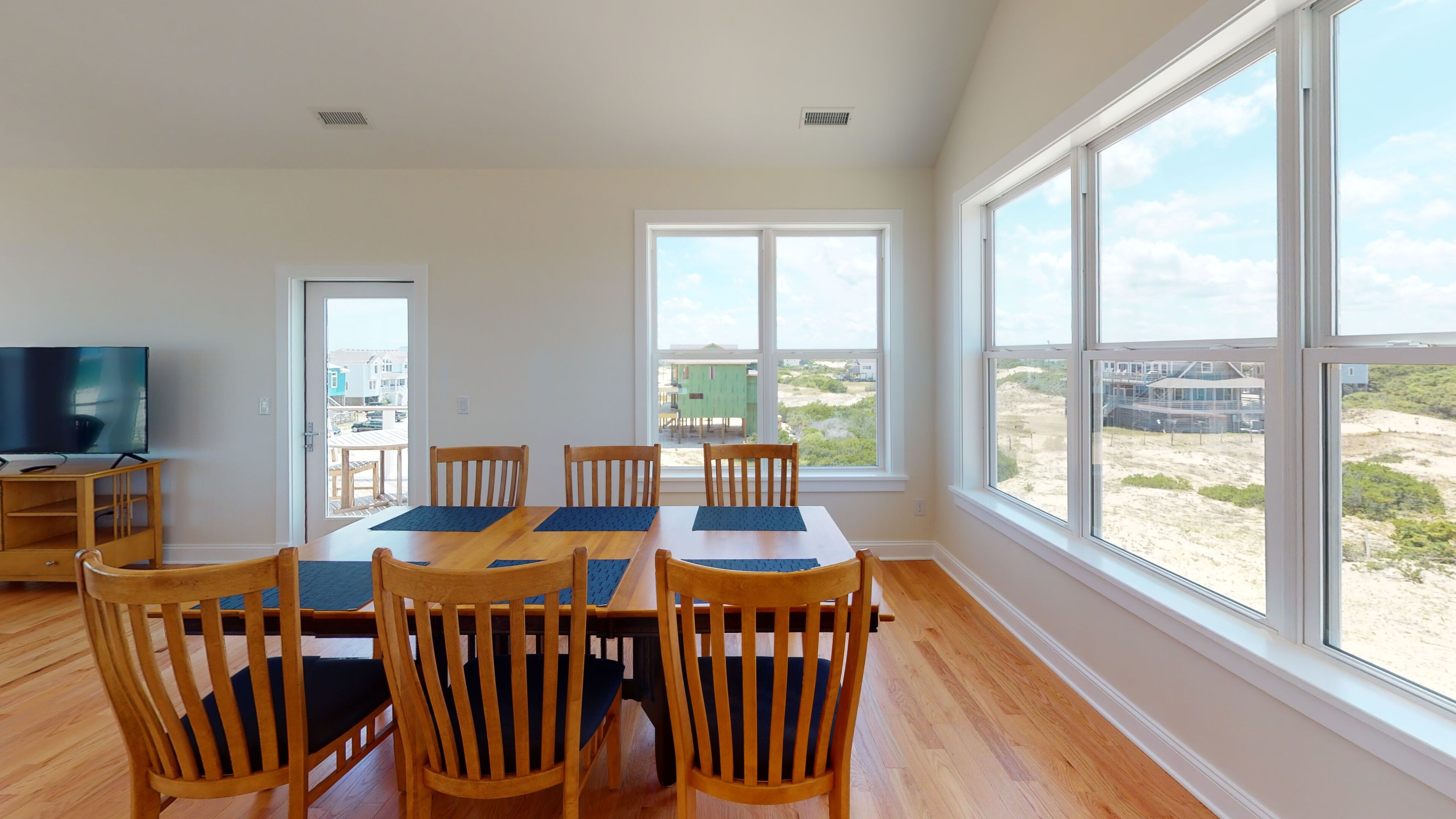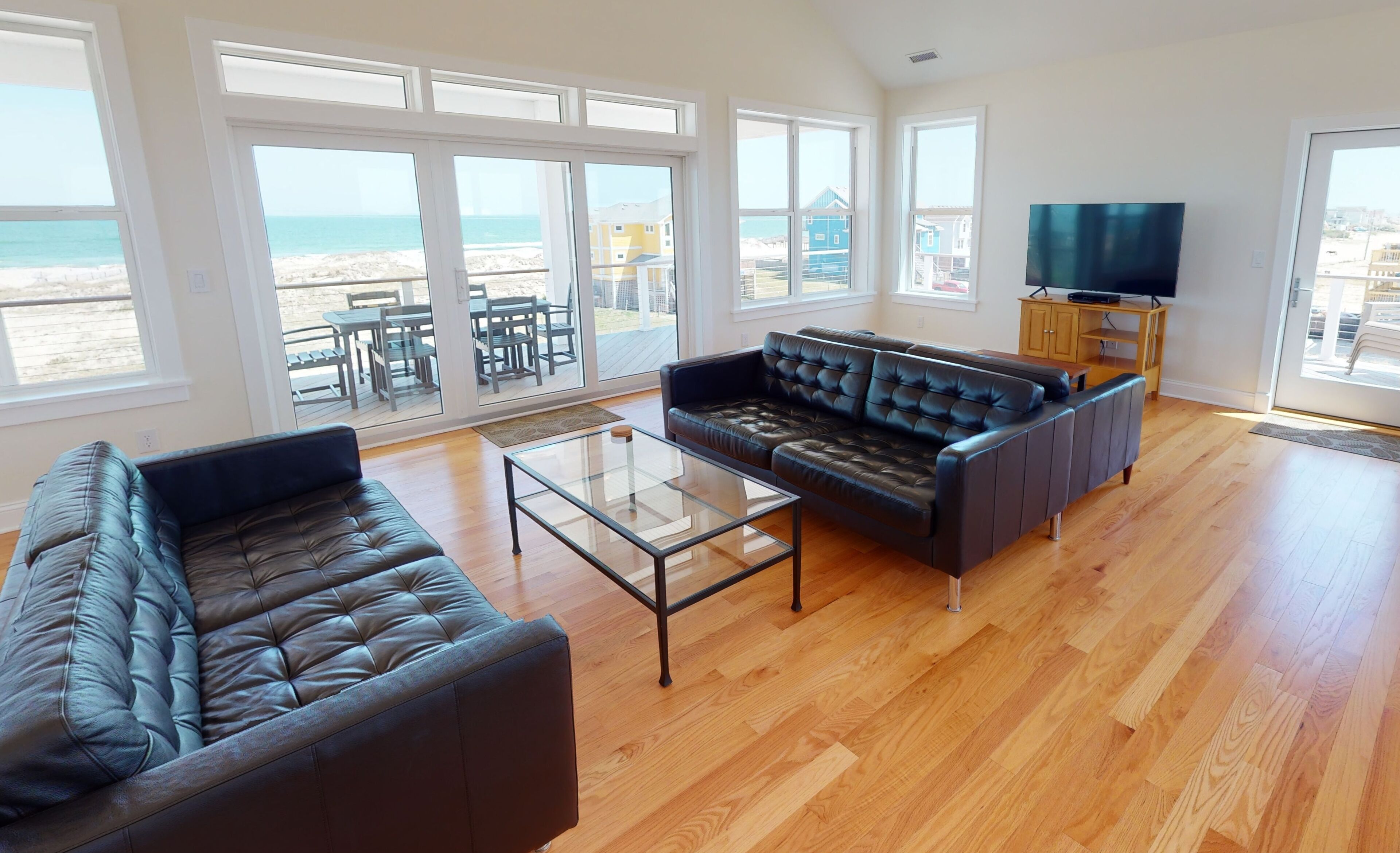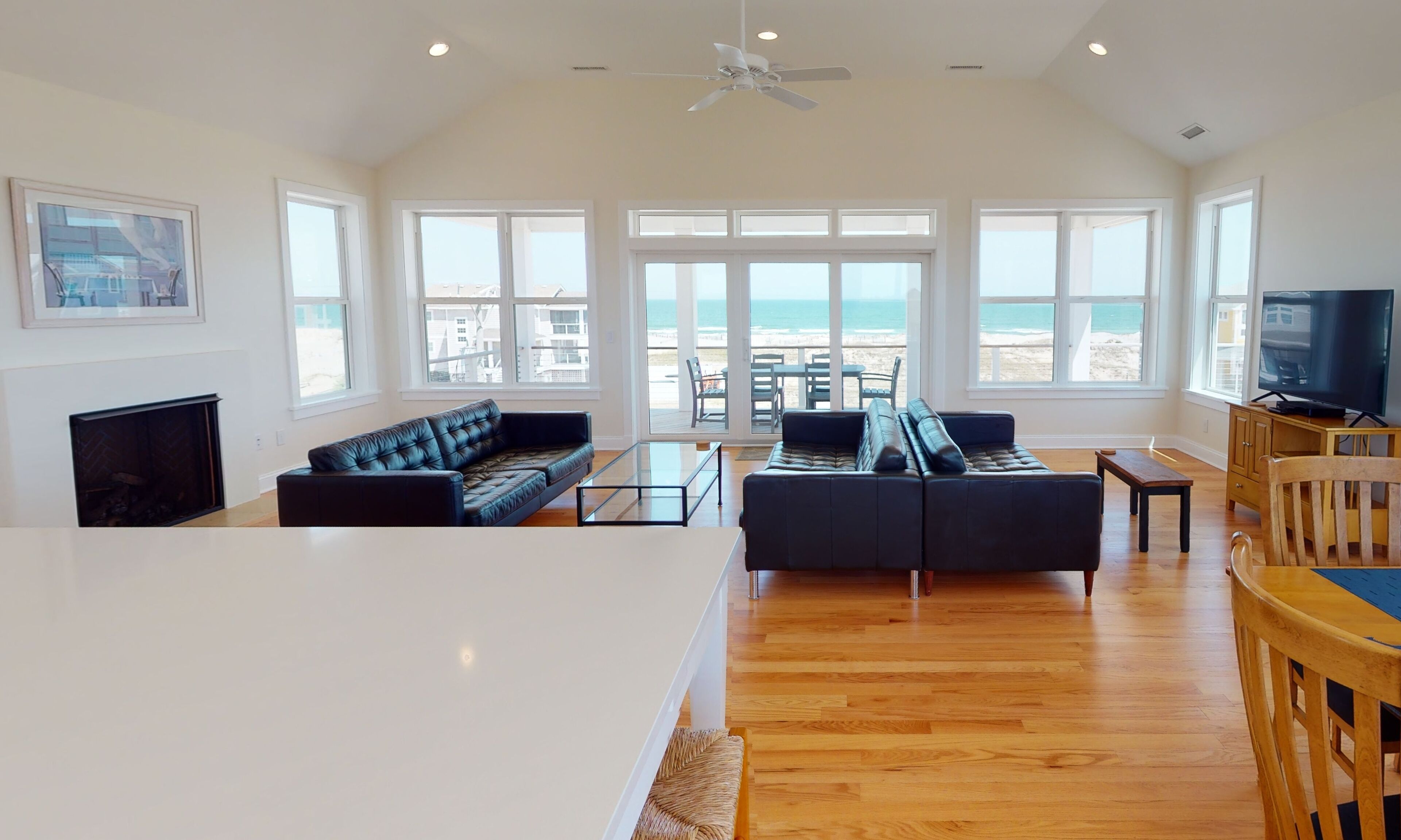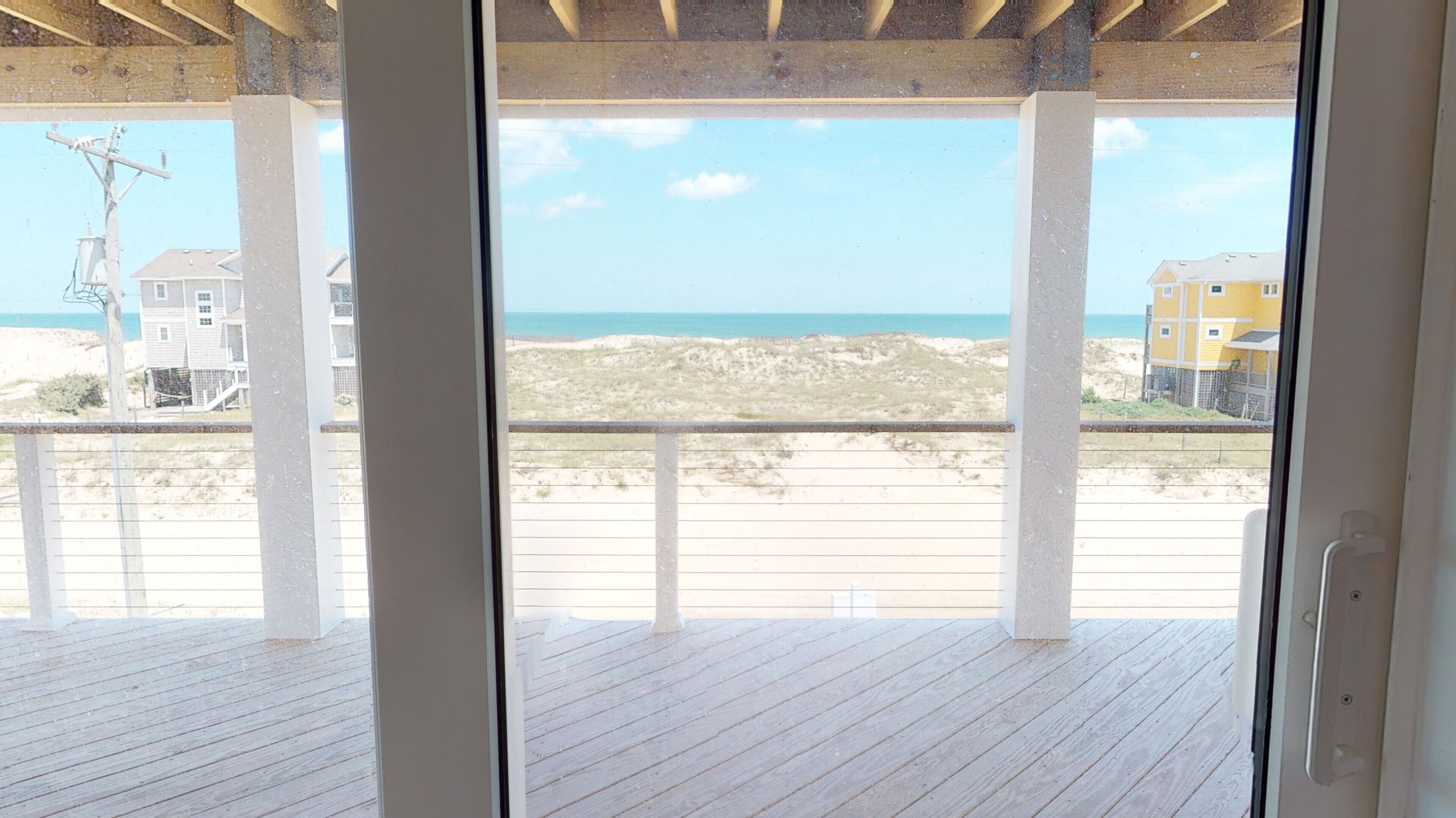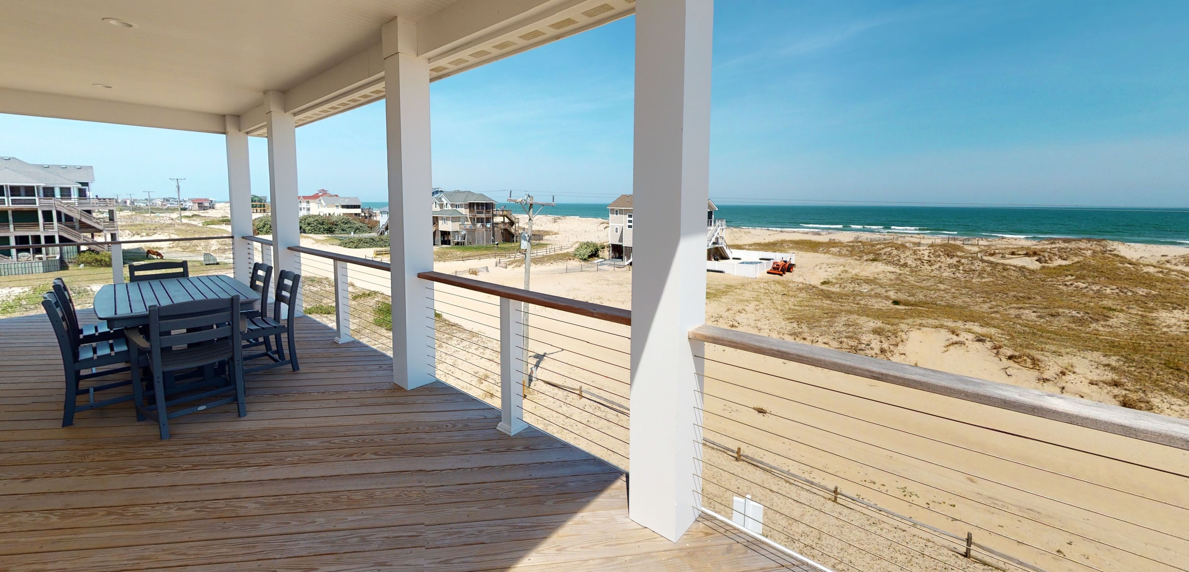 New home by premier builder. Fantastic Views! 4x4 Required Welcome to Harper House, a lovely 3BR home with fantastic ocean views on the 4x4 beach. The wide beach and close beach access make this North Swan home an easy choice! Located on the second row with no oceanfront home directly in front, Harper House views and sounds of the surf come right into the living room! The heavenly breezes will whoosh all of your cares away and relax your soul. The owners of this home love the minimalist approach and it shows in the outfitting of every room. The Ocean is the main focal point from both levels. There IS a tv for the diehard.... but there are no other screens to divert your attention from the focus of the Atlantic Ocean and your family. Level one has a keyless entry which makes life so much easier! No keys to find or lose! On level two there is a queen master bedroom with a gorgeous master bath and huge private deck. The other two bedrooms on level two share a hallway bath and are a queen in one, and two twins in the other. Linens and towels are provided. On level three you will find a wide open kitchen with very comfortable and inviting island seating, leather sofas, the lone smart TV connected to satellite and a huge dining room table. Expansive wrap around decks invite you to partake in a sun drenched south exposure or the more relaxed ocean side covered porch. The teak outside dining table will invite you to picnic while listening to the pounding surf. The fact that there are no homes between you and the ocean makes Harper House a delightful way to reconnect with nature. The ocean views will delight you with dolphins, pelicans, shore birds and surf, while the occasional fox or wild horse will top off the back to basics feeling that Harper House provides. The ocean is calling.. come experience it in full at Harper House.Saturday Check in - 4 Wheel Drive Required - Linens and Towels provided - located approximately 7 miles up the 4x4 beach - NO pets. Parking passes for parking two cars on the beach are included with this home. Parking at the house is free and unlimited. There is No Pool or Hot Tub at this home.Save money by booking directly on the Carova Cottages website: