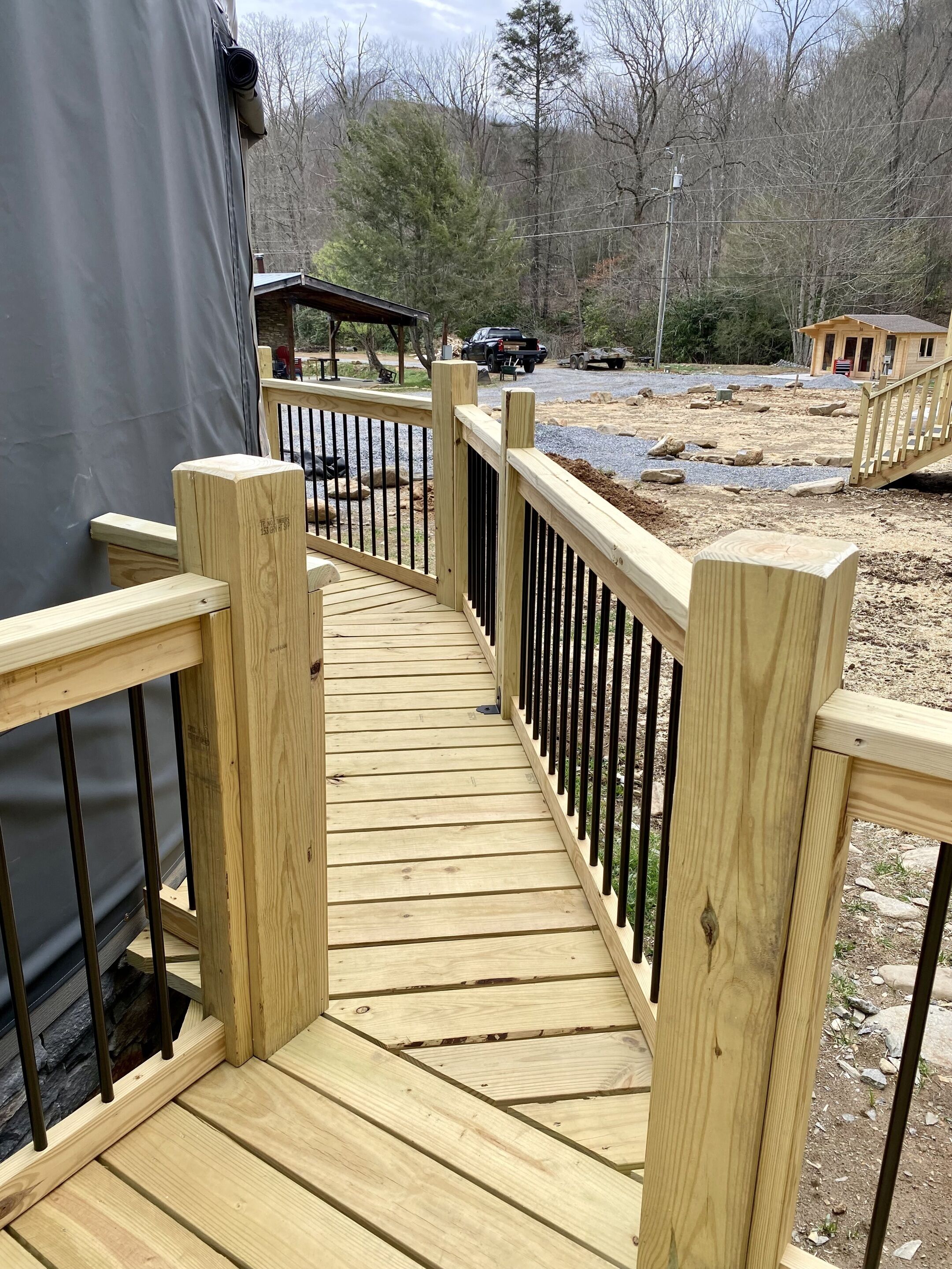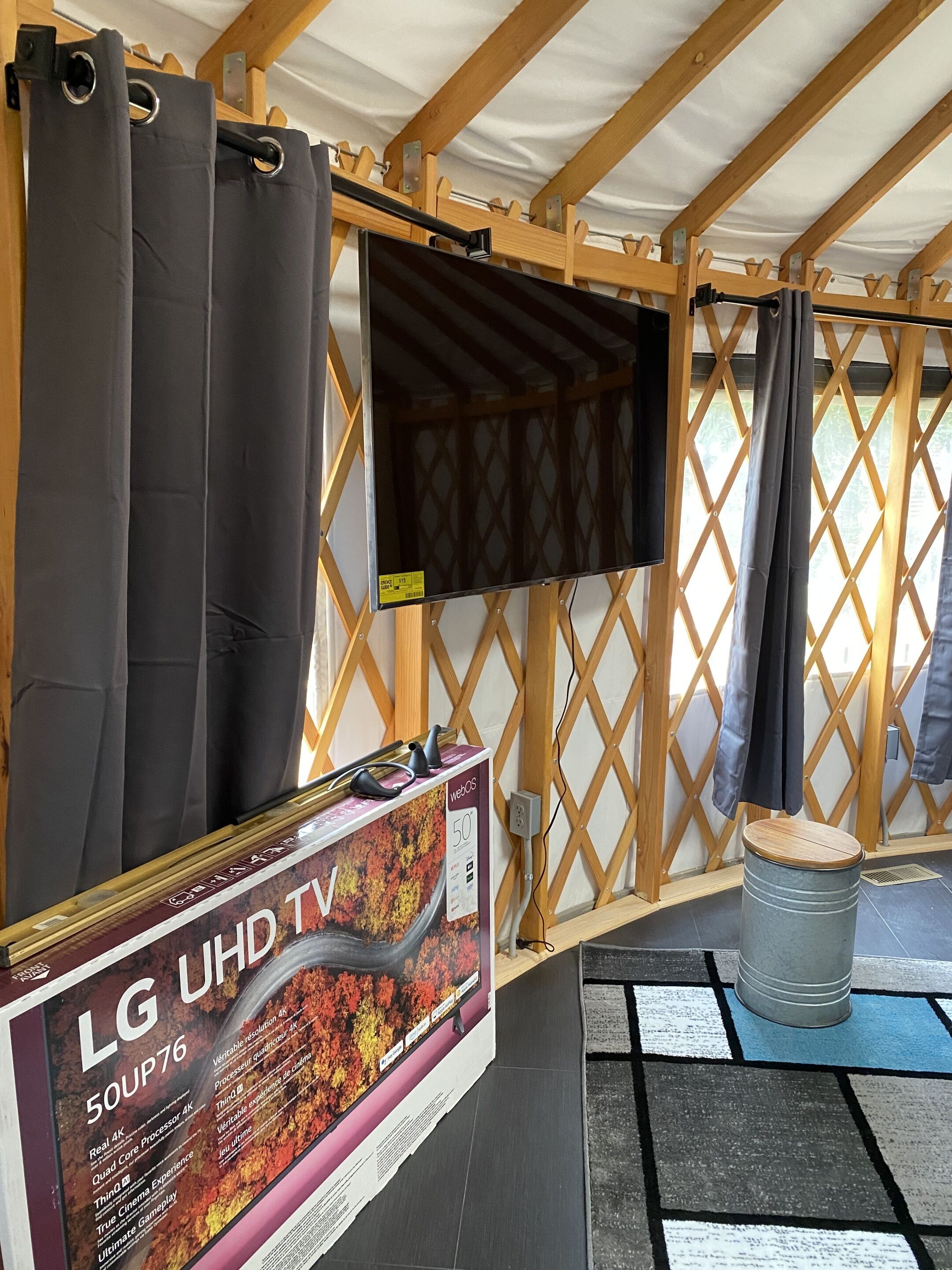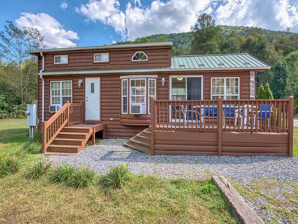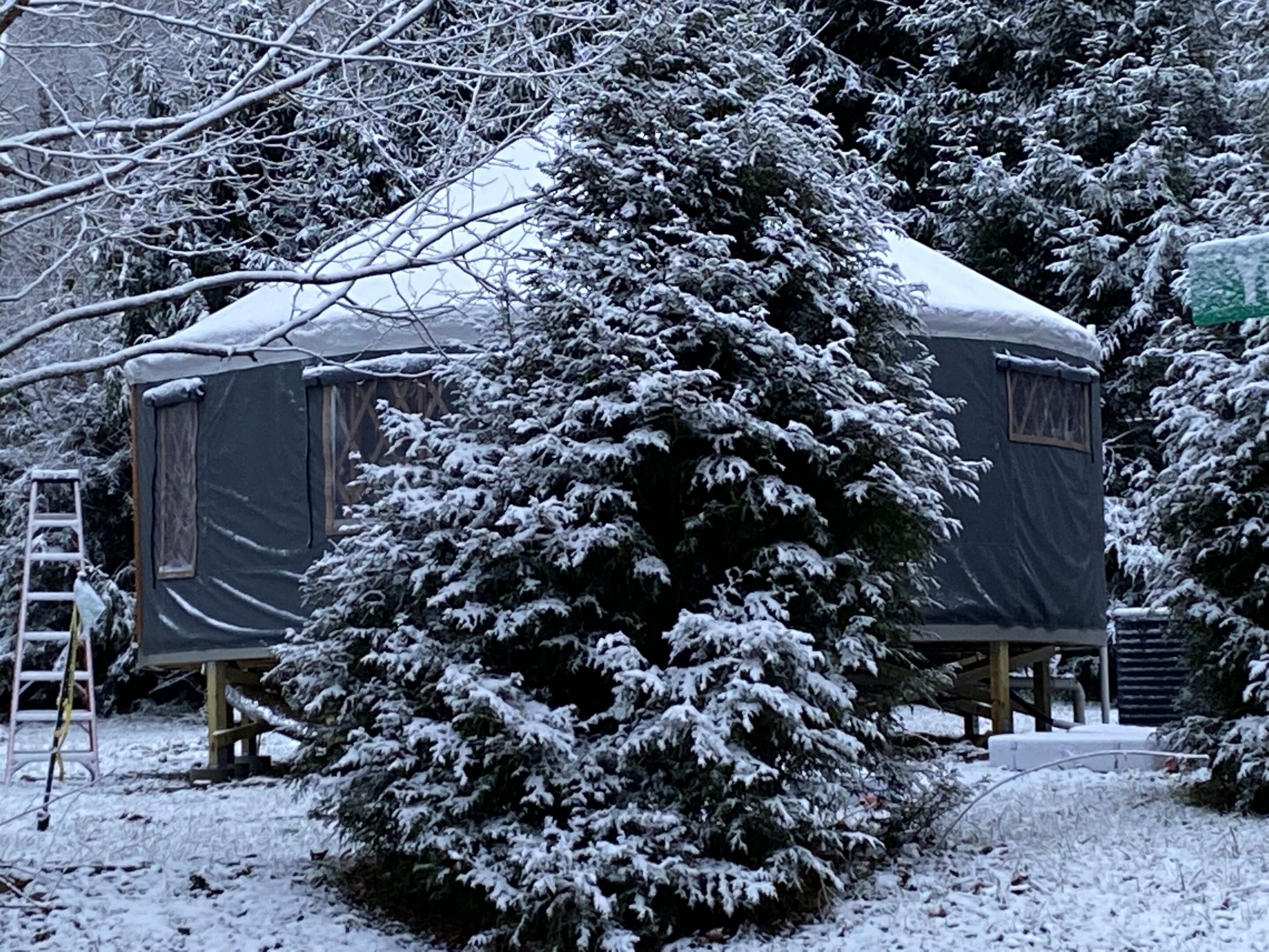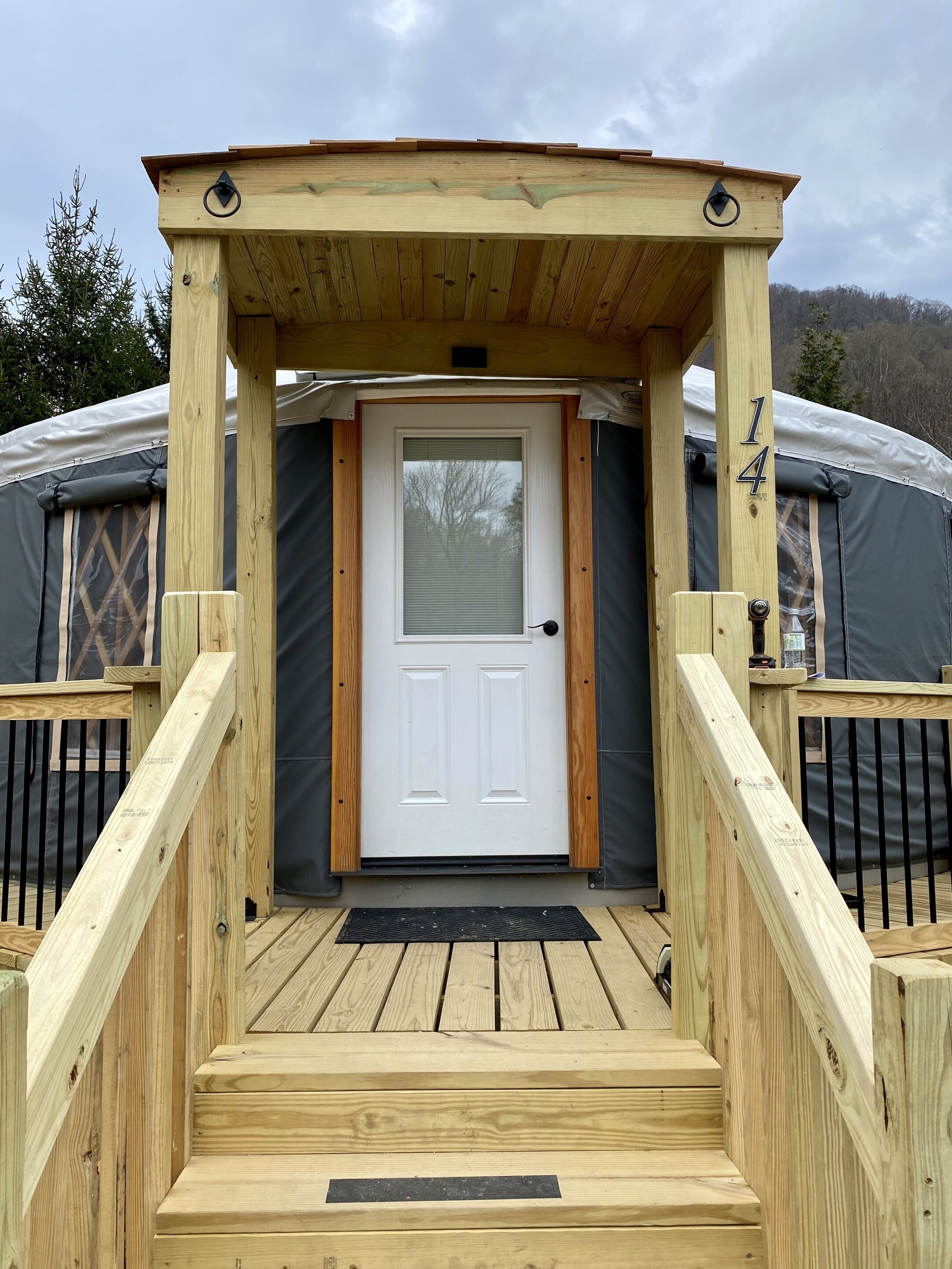 Loblolly Pine, Yurt Village(#14) 1st on your right Maggie Valley Yurts + Tiny Log CabinsStep inside our spacious studio yurt...452 sq/ft of high ceilings and all of the luxurious comforts of home! While it really is for couples with a big king size bed, the couch does convert into a sleeper for a small child, or that friend that just wanted to tag along for the adventure.- full kitchen w/ dishwasher- private bath w/ a tiled shower - small morning coffee porch off the front, and a larger gathering porch off the back (connected)** Small Dogs Allowed w/ a $75 Pet Fee (not included in any total)** $60 per stay cleaning fee We are a year round destination with flat paved roads and easy access to the property...less than a mile from Soco Rd. (main road running thru town). We have 6 - 400 sq/ft tiny cabins, and 5 - luxury yurts with all the comforts of home. The property sits on almost 8 acres, and there are 2 shallow fish ponds (no fishing) with frequent visits by our duck and geese families. The Elk trail runs thru the property, and if you're lucky...then you will get to see these majestic animals from a safe distance inside, or on the deck of your Yurt/ Cabin!All Cabins and Yurts have their own HVAC.All Cabins and Yurts have their own high speed internet/ wi-fi and cable TV...just in case you need to plug in while you're visiting. Smart TV's as well...All Cabins have an electric fireplace for those chilly, but almost perfect mountain nights.All Cabins and Yurts are fully stocked with plates, cups, utensils, pots and pans, linens, towels, etc.All Cabins and Yurts have their own coffee pot, toaster, and can opener.All Cabins and Yurts come with a standard set-up of toilet paper, paper towels, trash bags, soap, etc. Those staying longer will need to supplement this.All Cabins with the exception of Wild Turkey (#10), have a generous loft space with additional bedding (4 ft ceilings, so best suited for children).All Cabins and Yurts have 1-2 parking spaces, with overflow parking nearby Picnic tables around the property,Fire pit by the pond on the cabin side,Central Pavilion with a Stone Fireplace near the pond in Yurt Village (Hang Out).