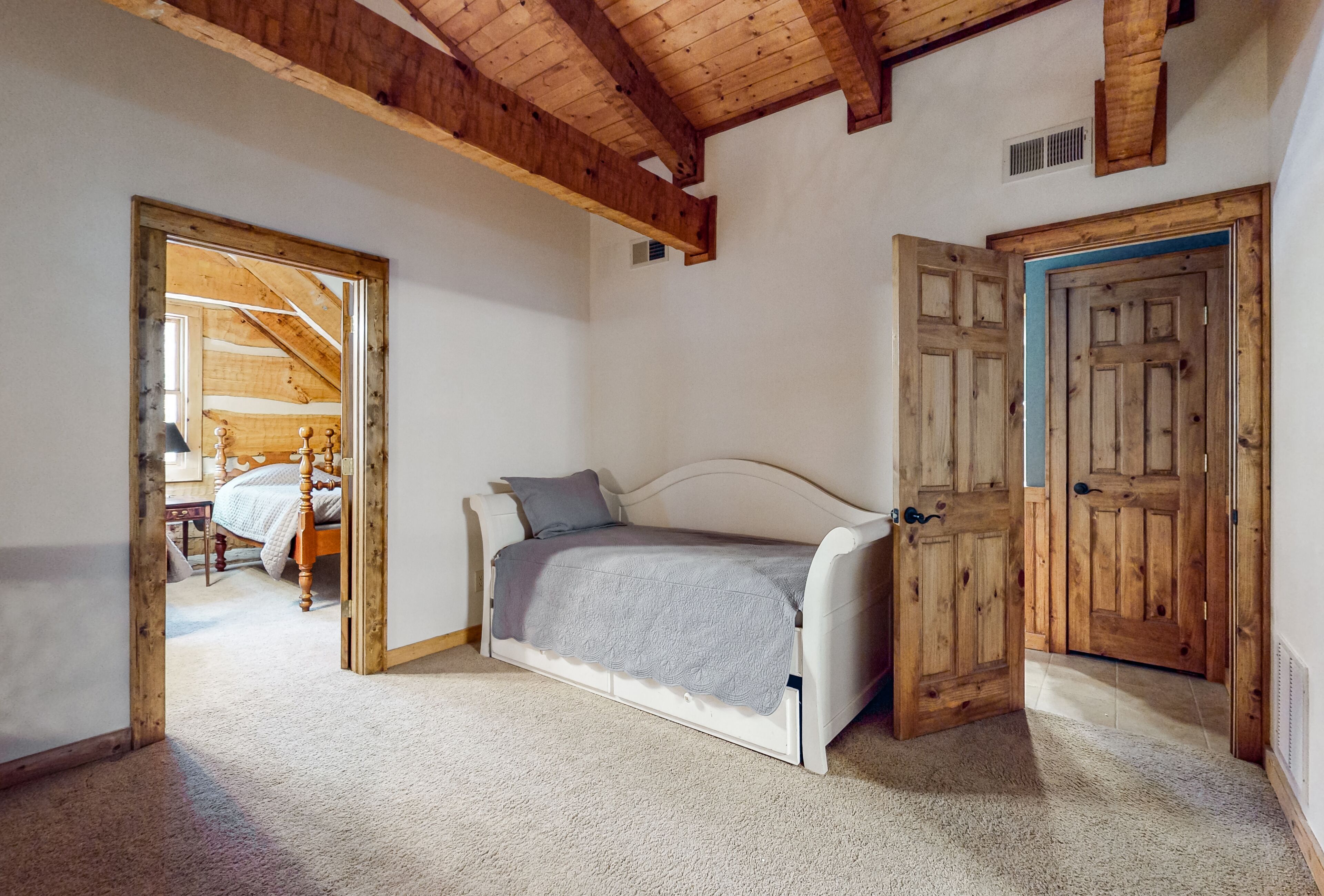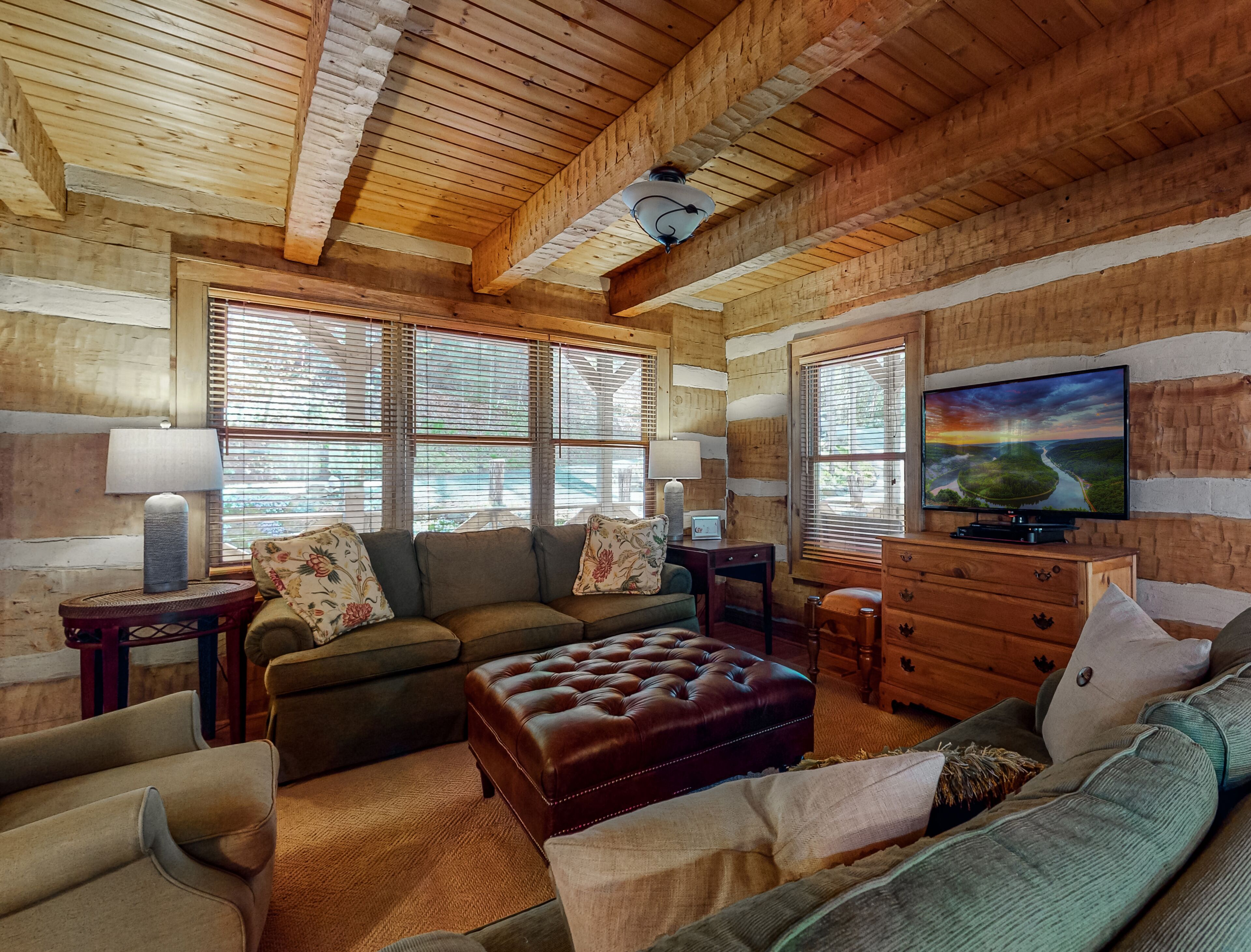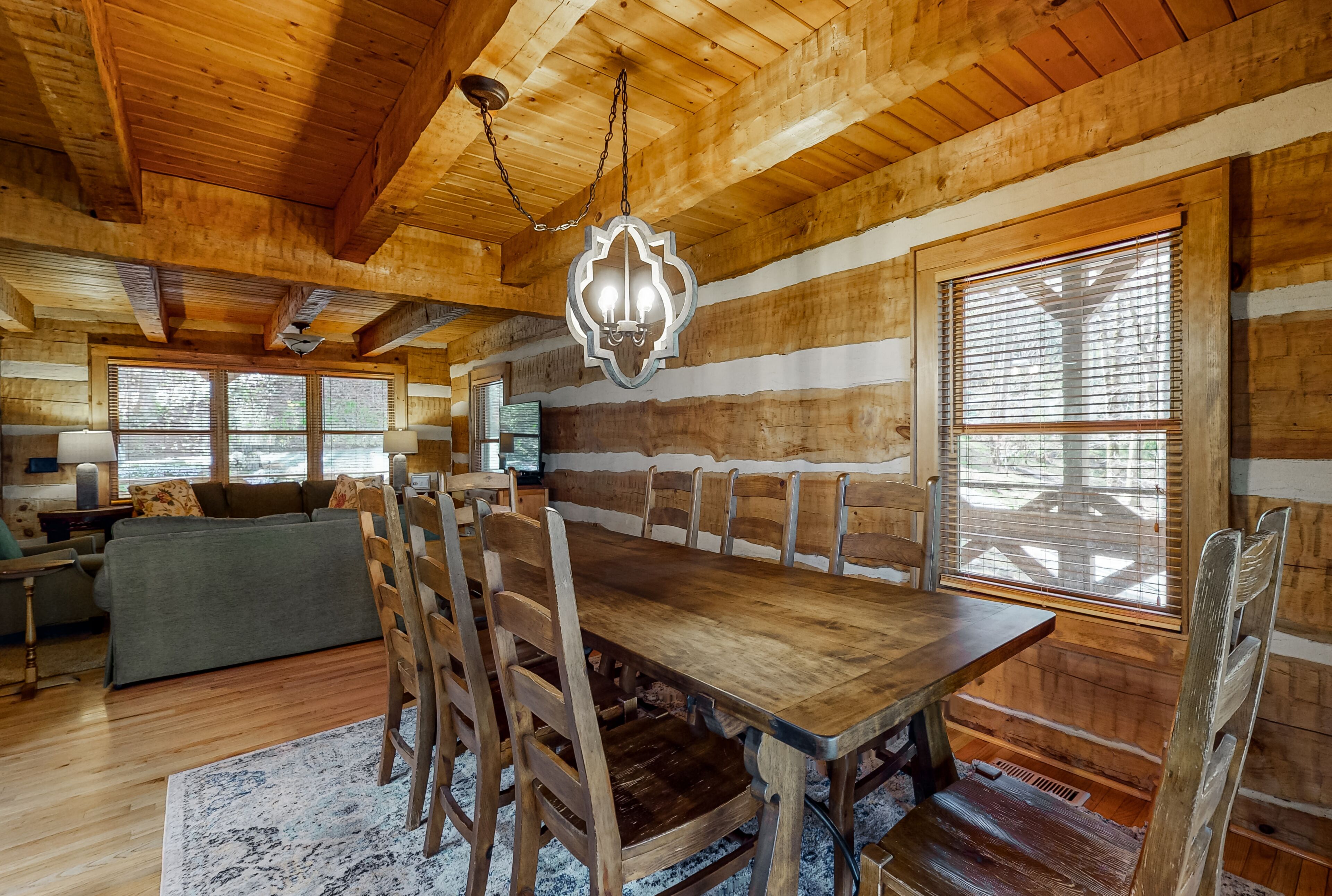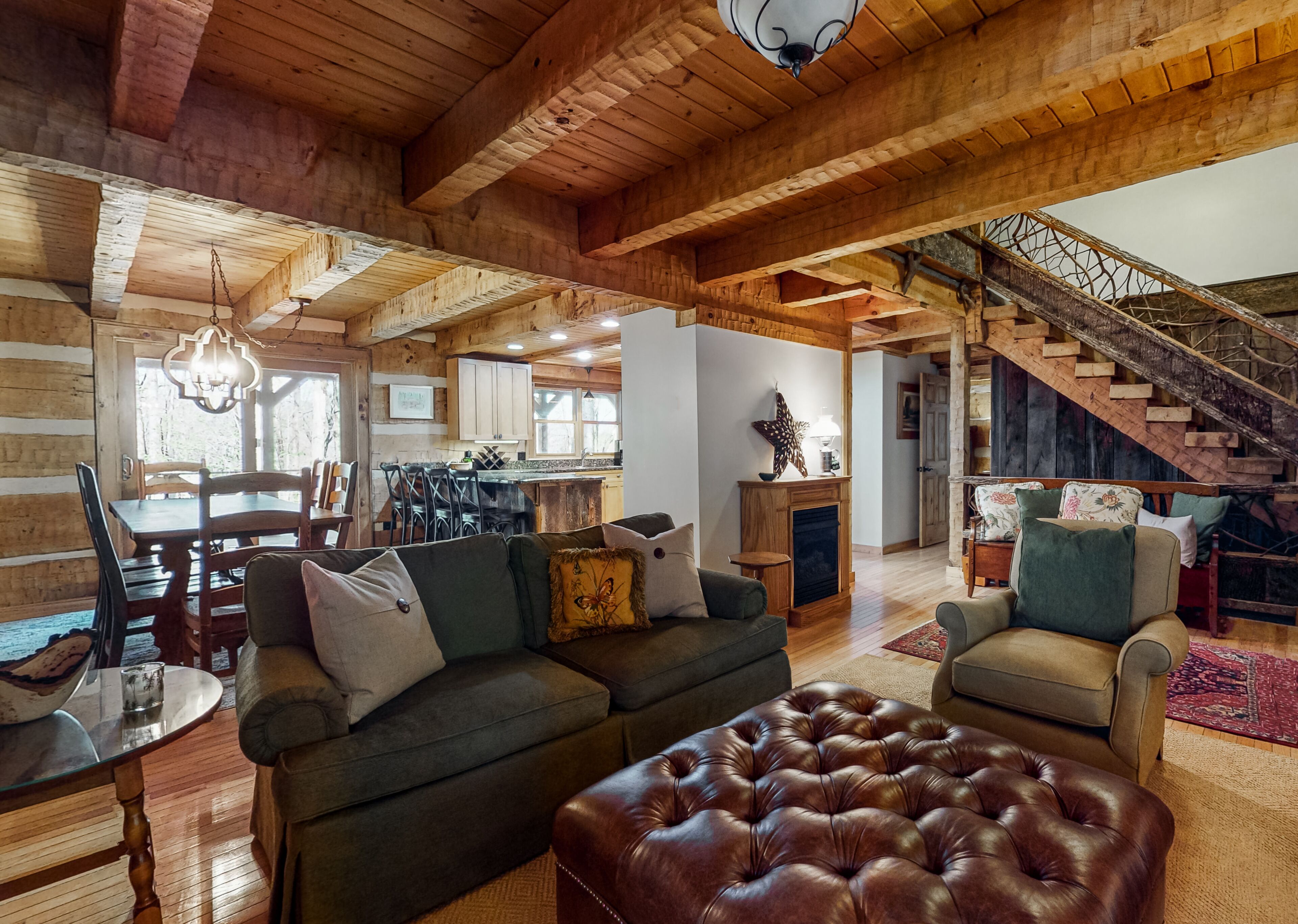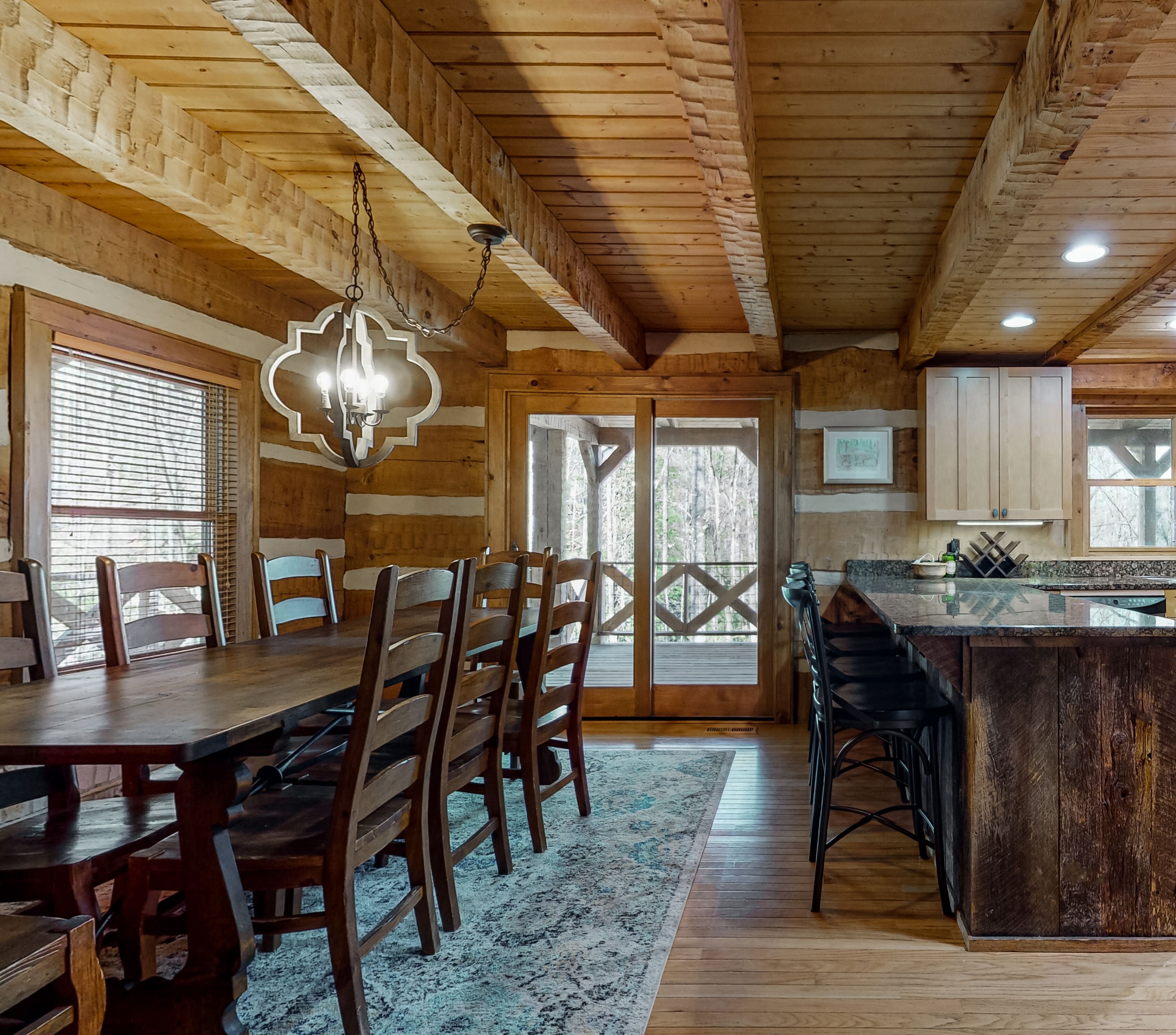 Log Cabin near Lake Glenville This incredible rustic cabin is next to Lake Glenville and is the perfect getaway for families or friends! Nestled on a 3 acre lot with a creek running through, you are a 12 min drive from downtown Cashiers, and 1/4 mile from public boat ramp. There are multiple parks, hiking trails, as well as a public beach recreation area all within 1 mile. Sapphire Valley Ski Resort is a 20 min drive and a wonderful place to teach kids how to ski. This 3 story house boasts a wrap around porch on the main level and walk out patio from the bottom level facing the lake that includes a fire pit.The cabin can accommodate 12 guests with 4 BR and 3.5 bath. The main level has a kitchen, den area, dining area and half bath. The dining area has a large walnut table that comfortably seats 8 adults and a bar at the kitchen island that seats four. The master bedroom and bath are also on the main level off of the kitchen. Upstairs, there are two bedrooms, one with a queen and the other with four twin beds that is perfect for kids! There is a full bathroom upstairs between the two bedrooms. The upstairs loft also houses a trundle bed that pulls out for additional sleeping quarters. The basement is newly renovated and boasts a large rec area with a pool table and seating area! The TV swivels so you can watch your favorite game from anywhere in the room! Full bath downstairs and a spacious queen bedroom. Washer/dryer in laundry room w/ a utility sink. Kitchen fully stocked. Central AC/Heat throughout. Satellite TV (DISH) and one tv on main level and one downstairs. Wifi w/ speeds fast enough to stream (Netflix, Hulu, Disney +).