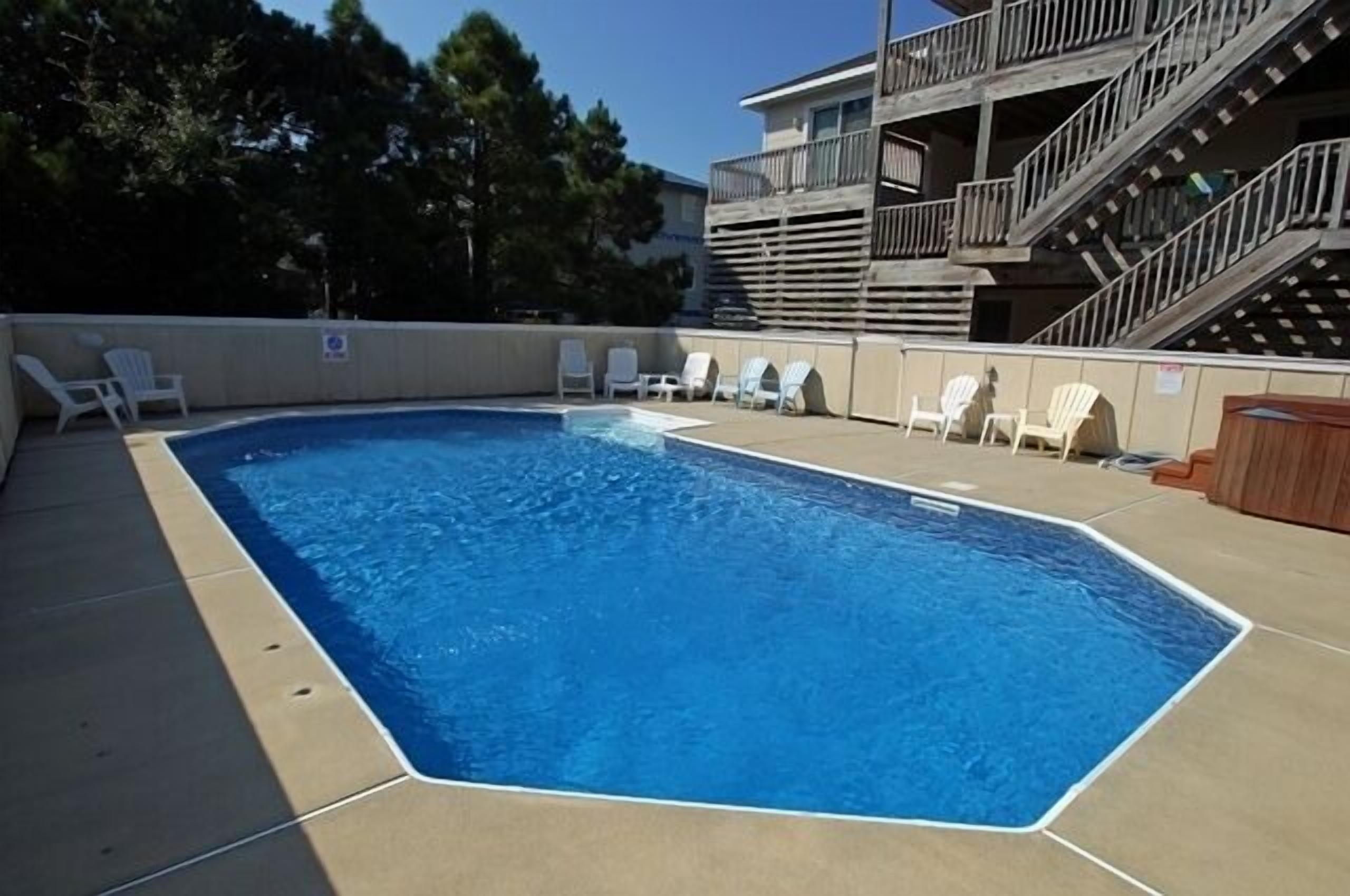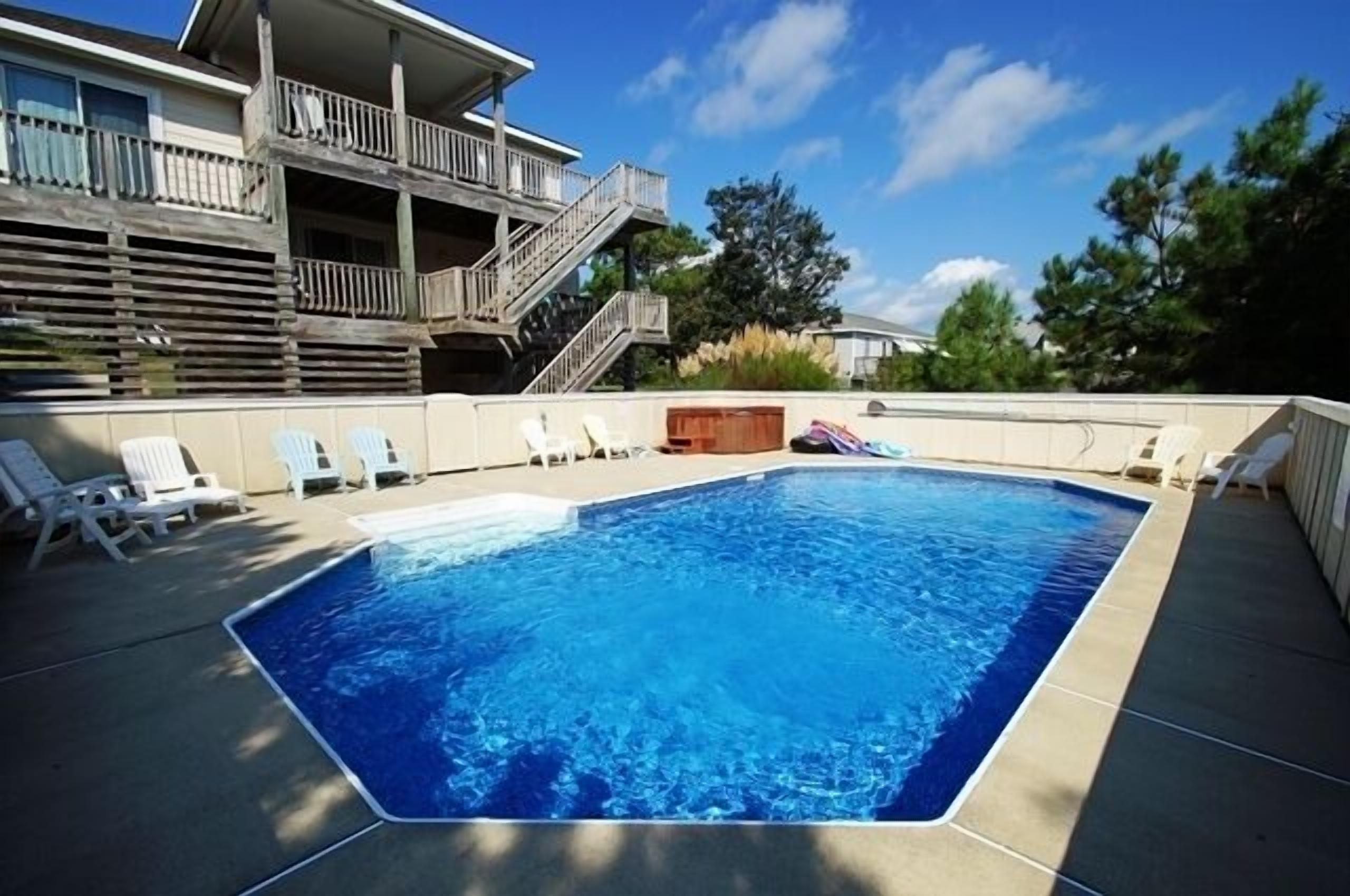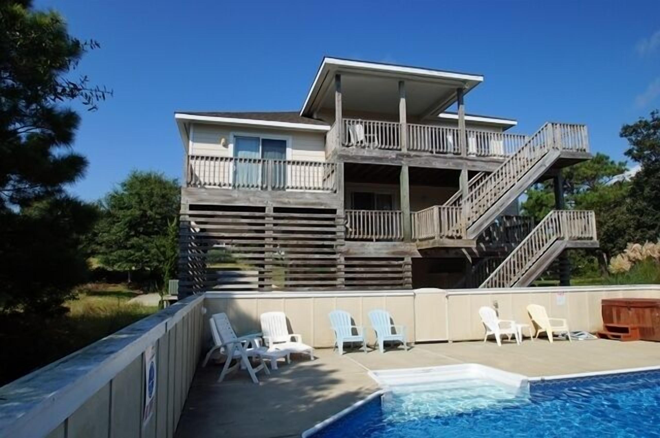 SS272- 5 Bedrooms Private Pool & Hot Tub Community Tennis and Sun Decks!! Homeaway From Home is an exquisite Outer Banks vacation home with a stunning beach decor. Here you'll find two master suites, a 14 x 30-foot private pool, 8 person hot tub and huge sun and covered decks! The interiors are absolutely priceless and modern with your comfort being the most important. The kitchen, dining room and living areas are under a cathedral ceiling with direct deck access over-looking the large private pool and hot tub. On the ground floor is a second living area with an over-stuffed wraparound sofa along with a stereo, DVD and direct access to the pool and hot tub.Your family will find Homeaway From Home to be simply striking, modern and spacious. Property Bedding: 3 Queens, 2 Bunk-Sets, 1 Duo-Bunk with Trundle.Upper Level: Large kitchen with granite counter top, breakfast bar with seating for 4, stainless steel appliances and hardwood floor. The stunning dining room has seating for 10 with views of the private pool and hot tub. The living area features a cathedral ceiling, flat screen TV, DVD, ceiling fan, over-stuffed sofa Direct deck access to a wide open sun deck.Upper Mid-Level: On this level you'll find a half bathroom Queen master suite with private bath. The bedroom has a walk-in closet, direct deck access, flat screen TV, ceiling fan and a full bathroom with tub and shower.Mid-Level: This level provides the main entrance to the home along with 3 bedrooms and the laundry area.The first bedroom provides a duo-bunk with trundle, ceiling fan, flat screen TV and connects to a Jack 'n Jill bathroom with a tub and shower. Connecting to the Jack 'n Jill bathroom is a bedroom with a queen bed, ceiling fan and direct deck access overlooking the private pool and hot tub. A queen master suite greets you featuring direct deck access overlooking the private pool and hot tub, TV, ceiling fan and a full bathroom with tub and shower.Ground Level: Here you'll enjoy the 2nd living area completed with direct access to the huge private pool and hot tub area, a flat screen TV, stereo with CD player and VCR and a wrap-around sofa. There is a full bathroom with a tub and shower along with the 5th bedroom. This bedroom provides two bunk sets!Outside: A beautiful 14 x 30-foot private pool8 person hot tubEnclosed outdoor showerGas grill and charcoal grill.2024 Pool Date April 13 to October 19.