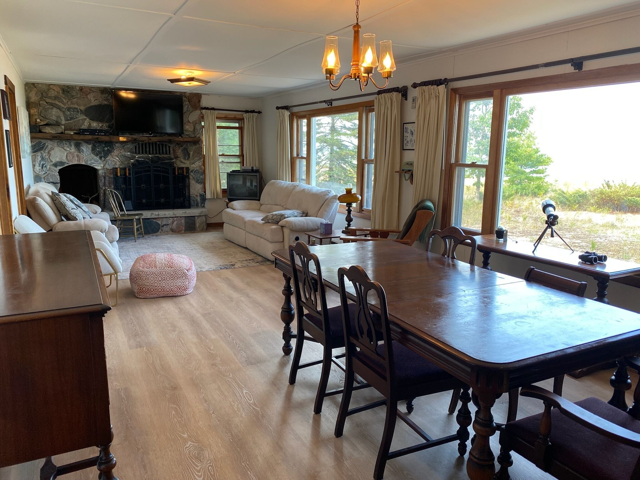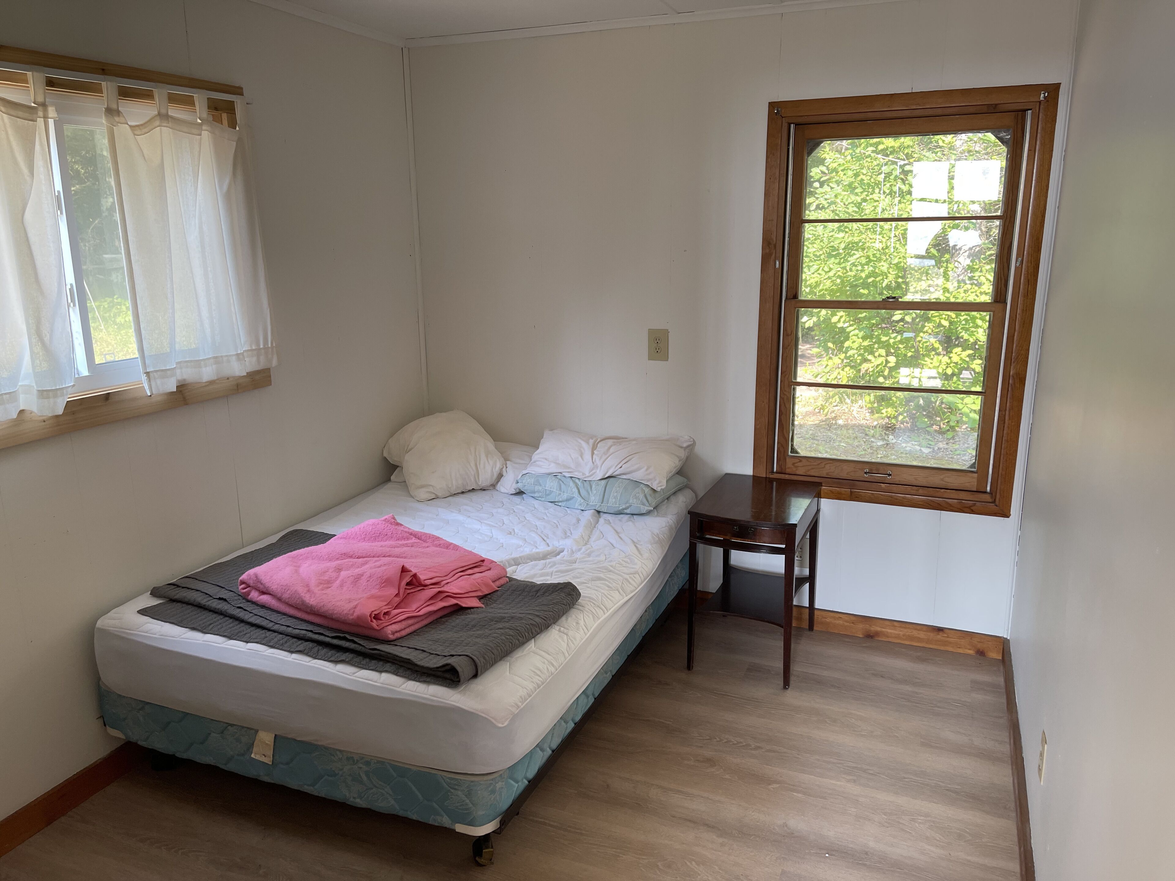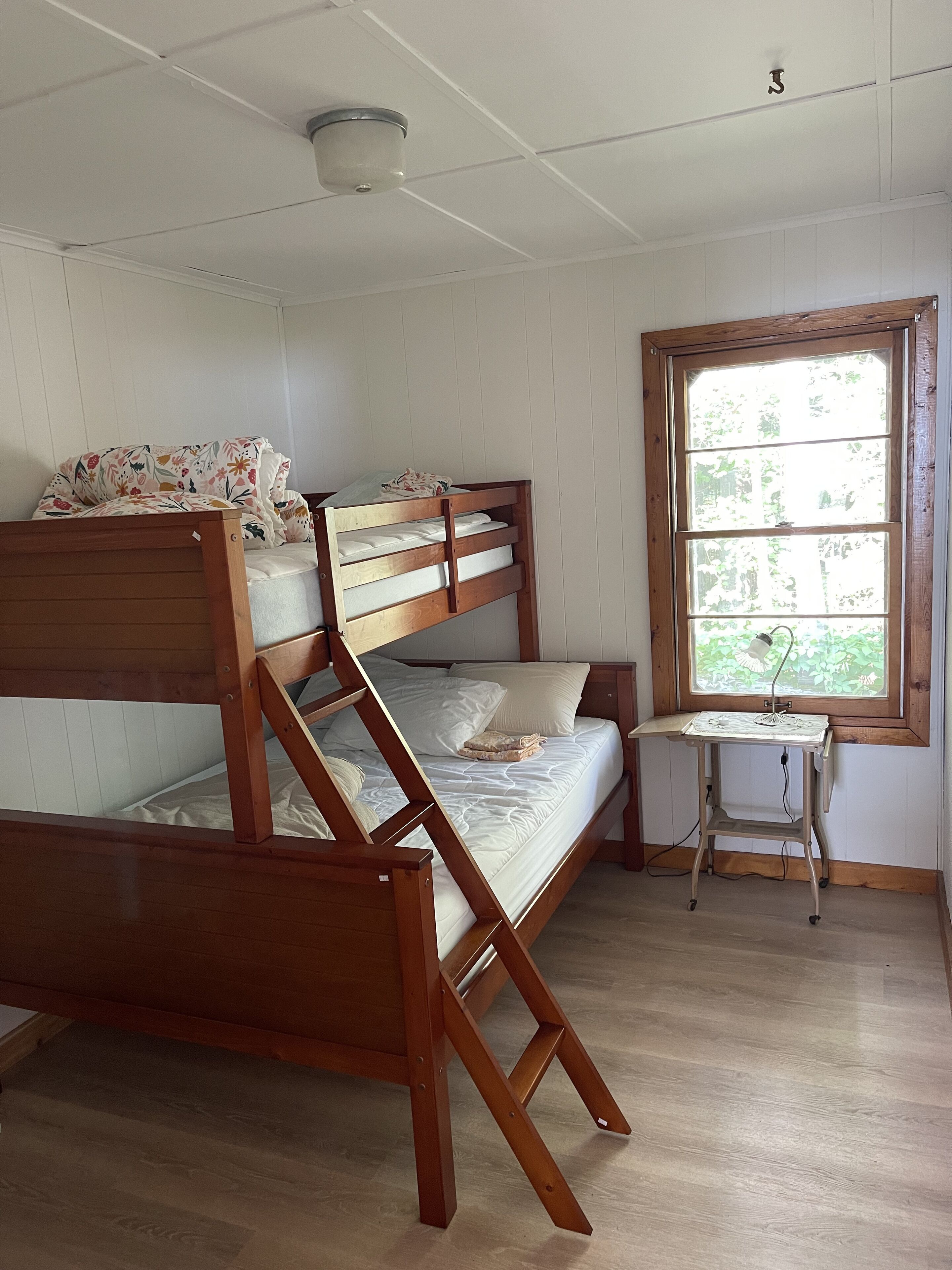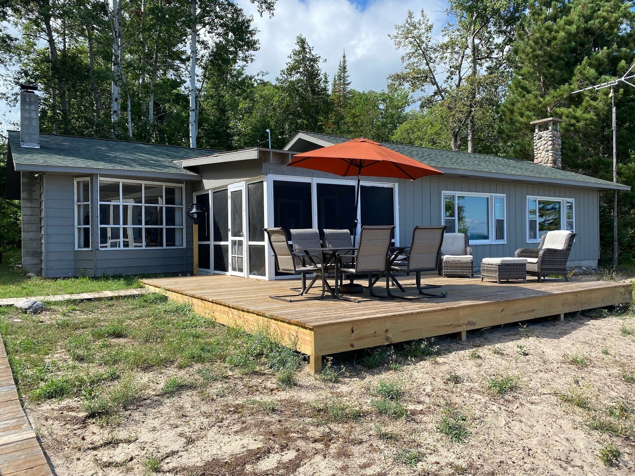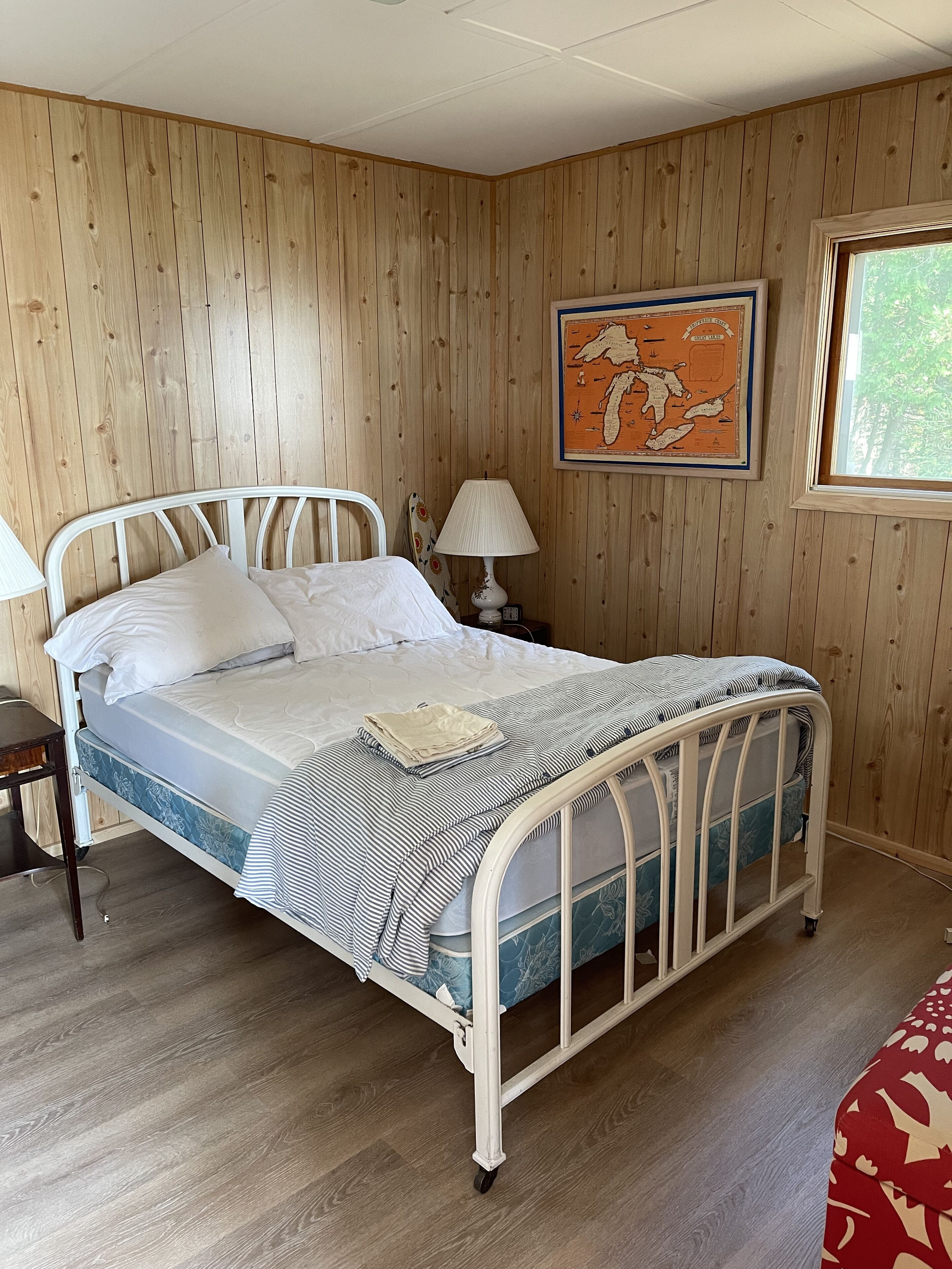 Lakefront Cottage on Soft Sand Located in the middle of Sand Bay, 5 miles from down town, 3 miles from the golf course and steps from150 feet of sandy private beach. There is enough room for two families or more in this 1400 square foot cabin with 4 bedrooms and 1 bathroom. The large cabin easily sleeps nine, with the addition of two cots for extra sleeping. You can enjoy preparing for your days adventure as you fashion meals in our newly renovated eat in kitchen with dishwasher and garbage disposal. The kitchen is fully equipped with microwave, toaster, Instant Pot and blender. The evening can be spent enjoying time in the screened in porch, on the outdoor deck or in the living room where you can enjoy a fireplace, Bluetooth TV, DVD/VCR, WIFI and lots of books and board games. For those that like to cook outdoors, we have a charcoal grill. A new washer and dryer is available to keep your clothes clean. We ask that guest bring their own bedsheets, pillow cases and towels. Comforters, blankets and pillows are provided. Linen Service is available for additional charge. Rentals are Saturday - Saturday only