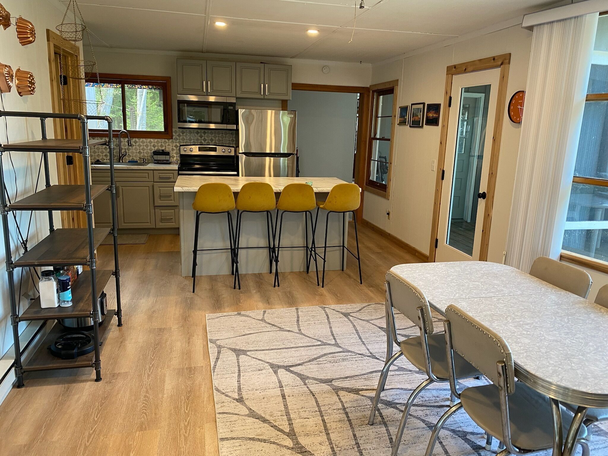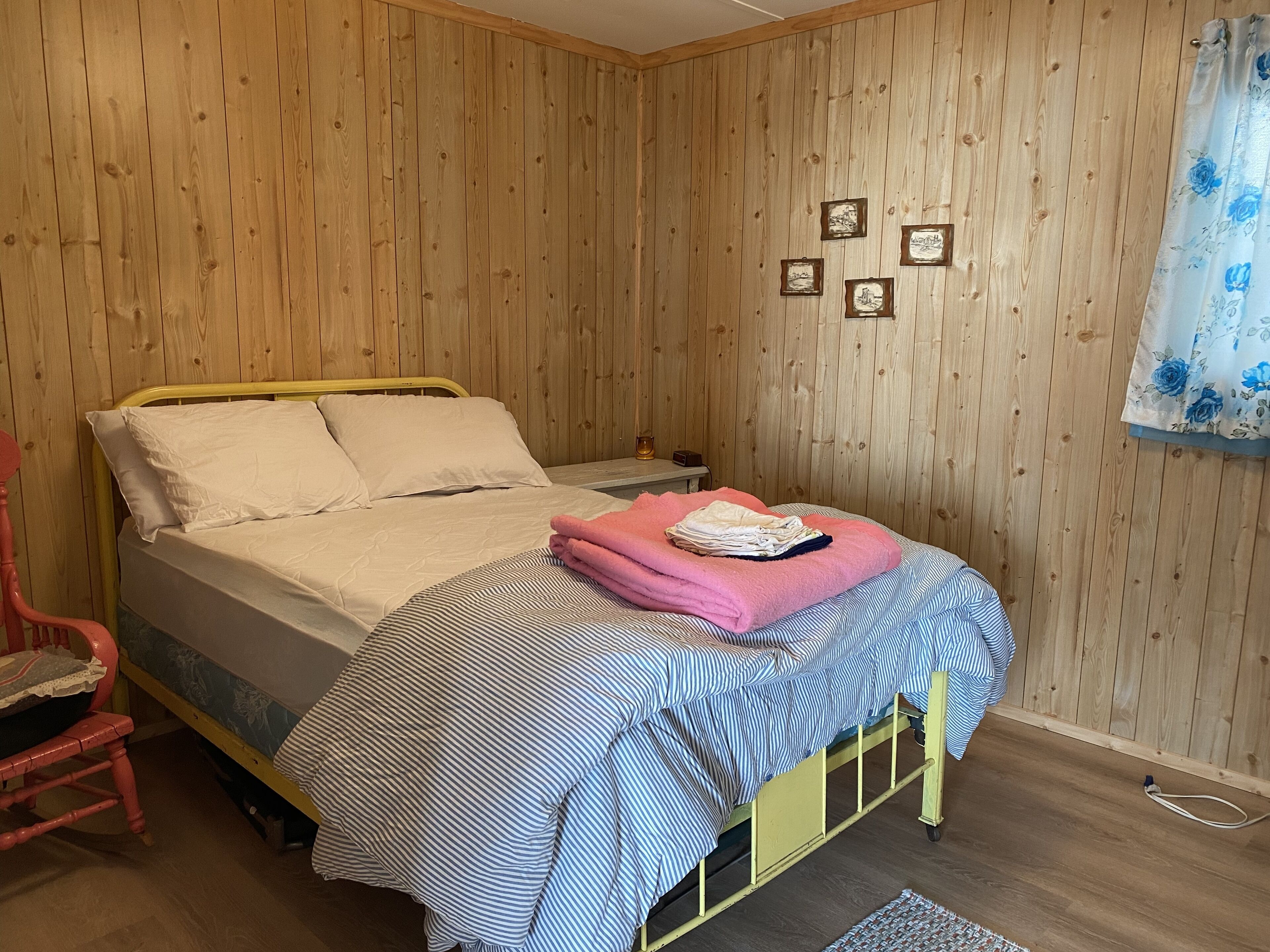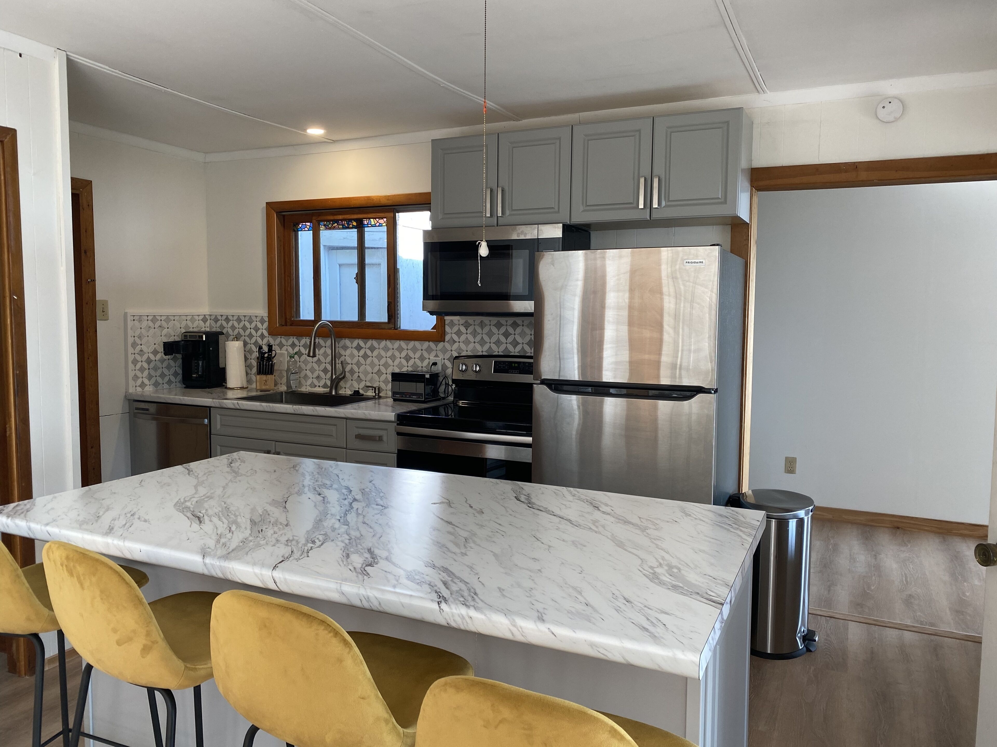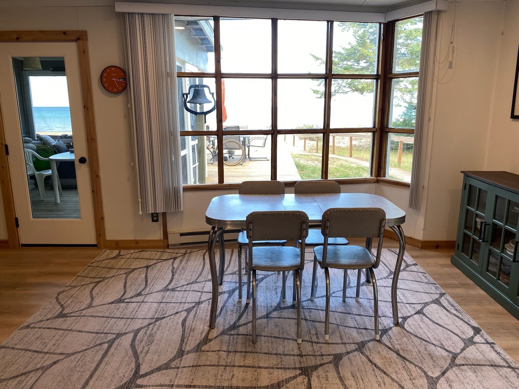 Lakefront Cottage on Soft Sand Located in the middle of Sand Bay, 5 miles from down town, 3 miles from the golf course and steps from150 feet of sandy private beach. There is enough room for two families or more in this 1400 square foot cabin with 4 bedrooms and 1 bathroom. The large cabin easily sleeps nine, with the addition of two cots for extra sleeping. You can enjoy preparing for your days adventure as you fashion meals in our newly renovated eat in kitchen with dishwasher and garbage disposal. The kitchen is fully equipped with microwave, toaster, Instant Pot and blender. The evening can be spent enjoying time in the screened in porch, on the outdoor deck or in the living room where you can enjoy a fireplace, Bluetooth TV, DVD/VCR, WIFI and lots of books and board games. For those that like to cook outdoors, we have a charcoal grill. A new washer and dryer is available to keep your clothes clean. We ask that guest bring their own bedsheets, pillow cases and towels. Comforters, blankets and pillows are provided. Linen Service is available for additional charge. Rentals are Saturday - Saturday only