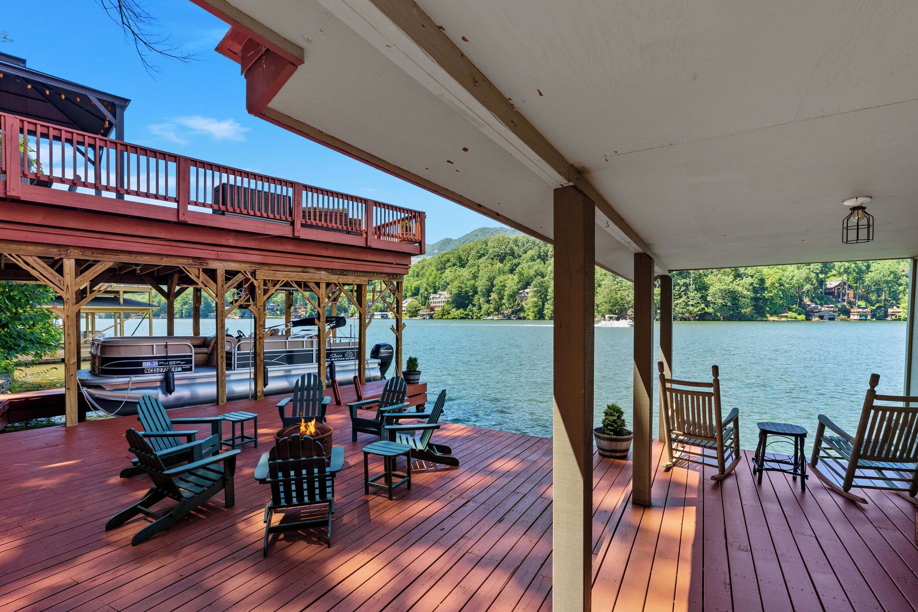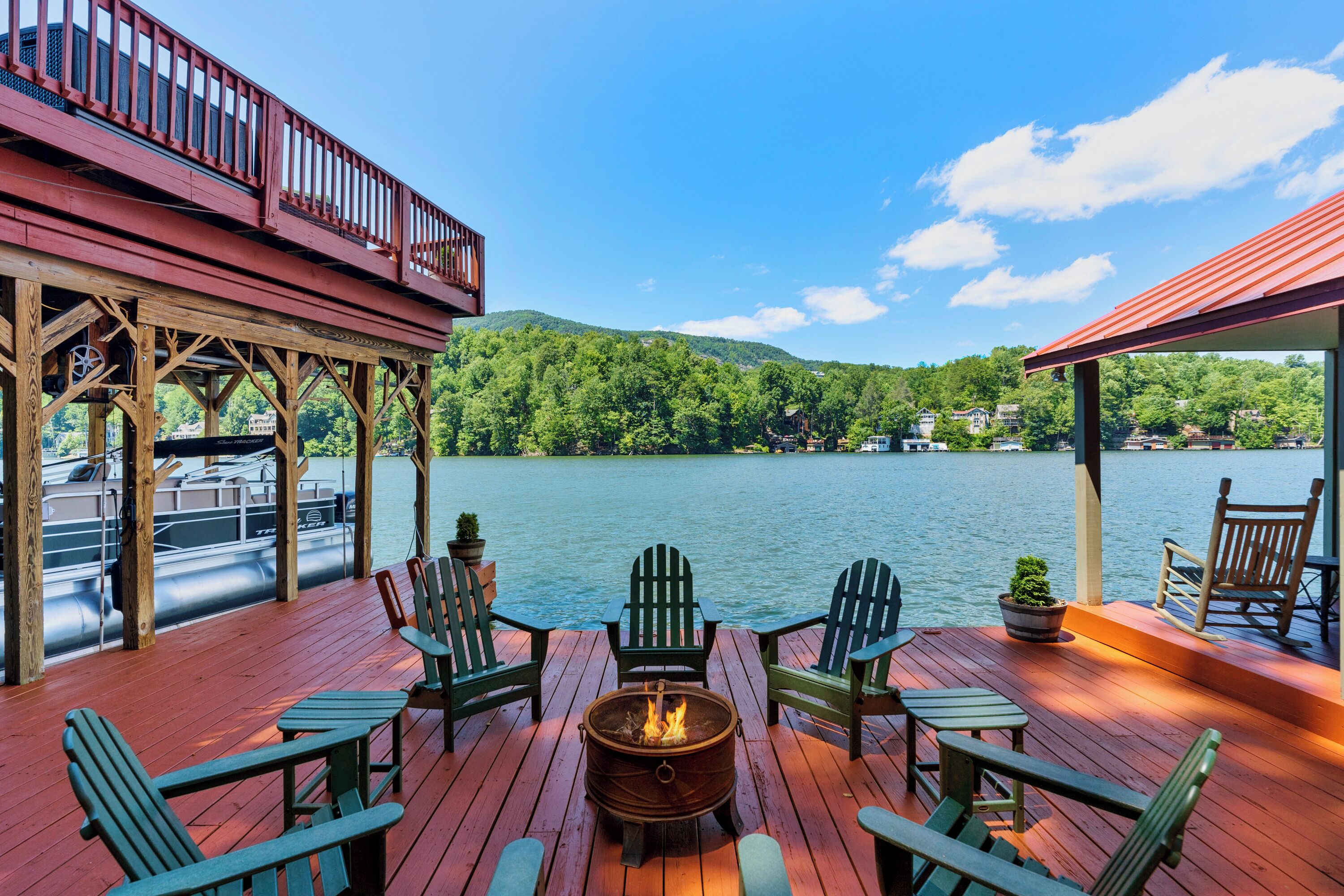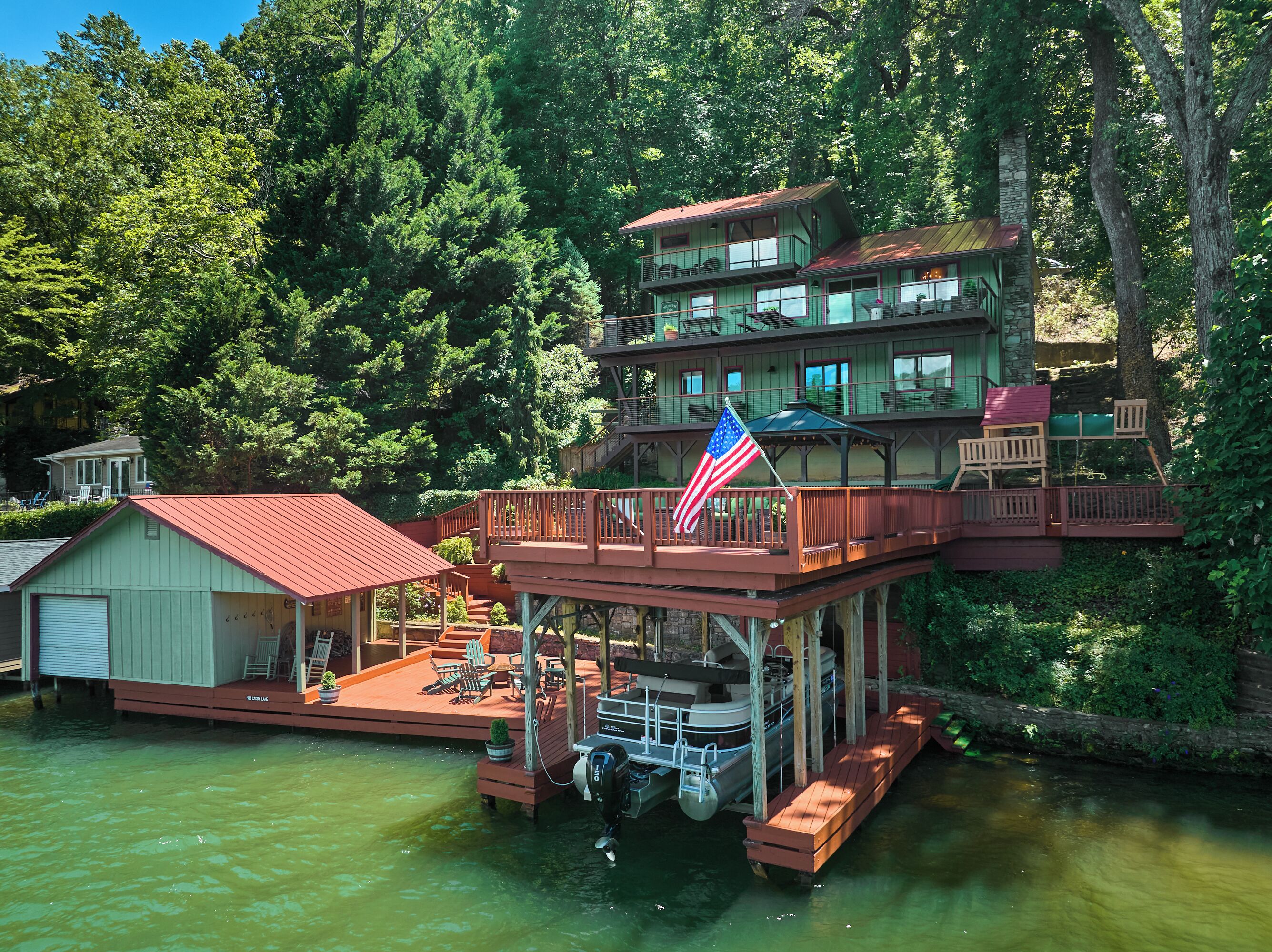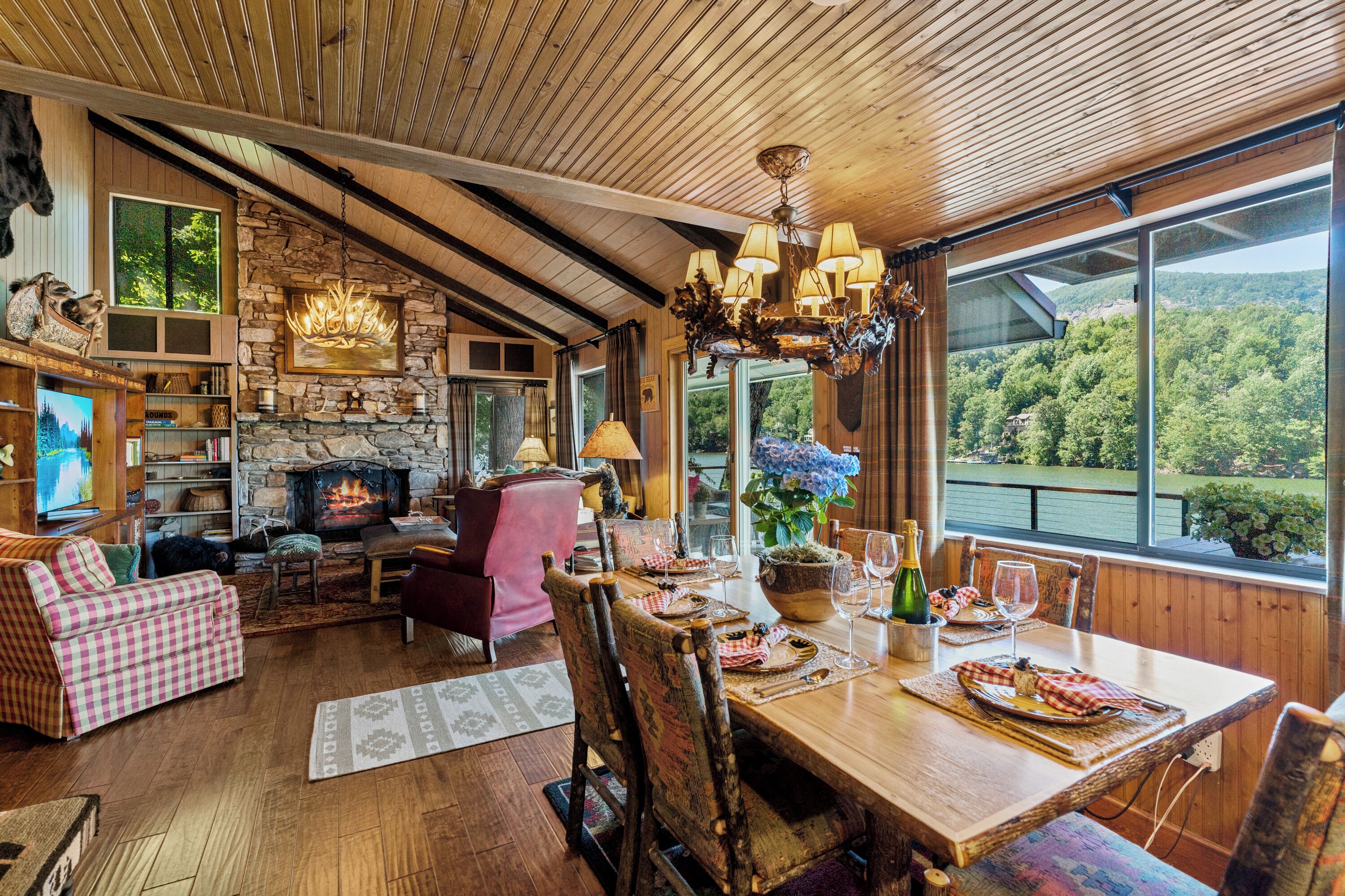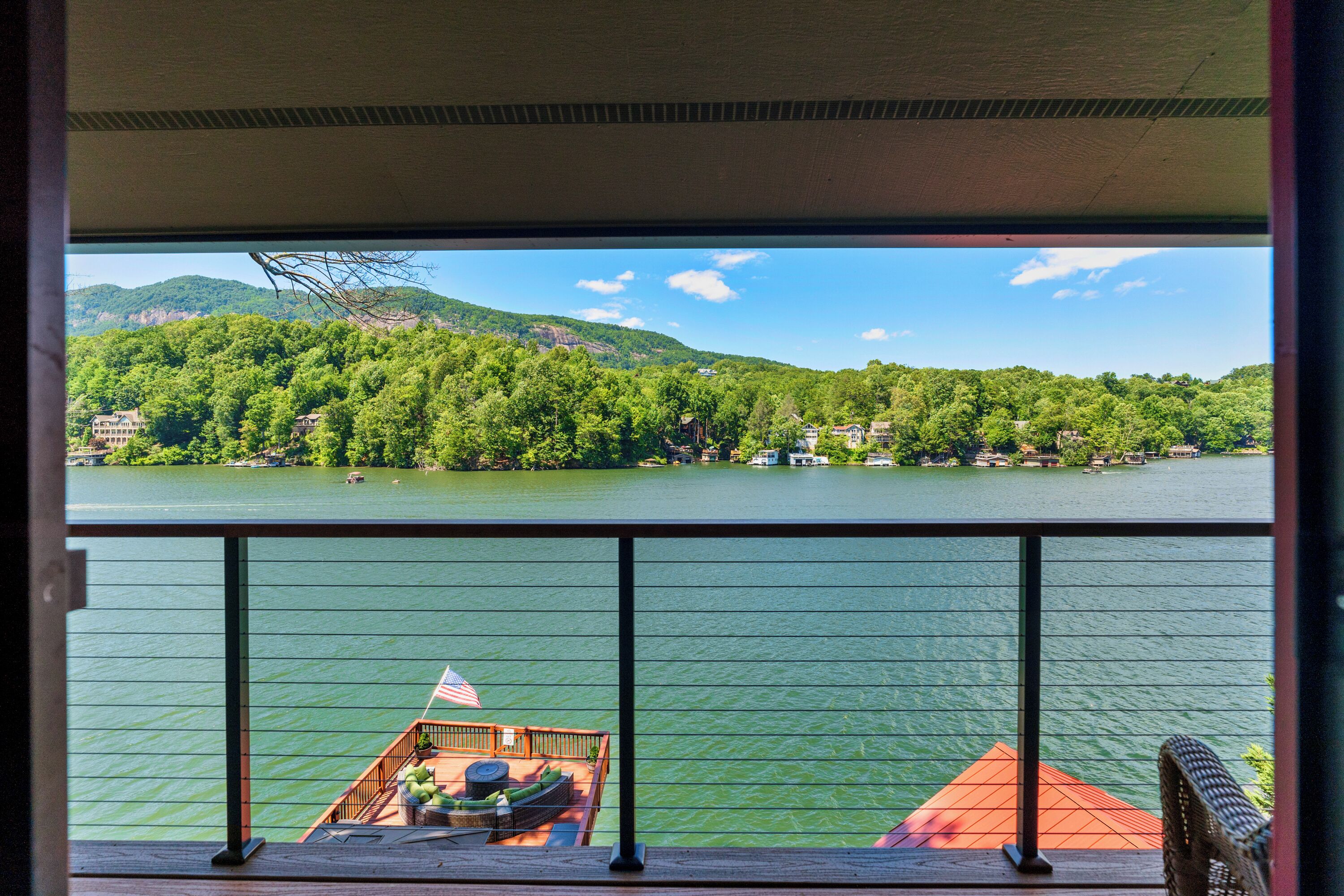 Papas Haus on Lake Lure - 3BR 3BA Lakefront, Decks Galore - Fire Pit Papas Haus is a 3 bedroom, 3 bath, tri level lakefront home on the open water main channel of Lake Lure. This vacation dream offers some of the best outdoor lakefront living area of any home on the lake! Plus, the location is ideal, just a few minutes to downtown Lake Lure and Chimney Rock Village.Pull the comfortable Adirondack chairs around the wood burning FIRE PIT on the giant dock right at the water's edge and create lifelong memories day or night. Or you can relax on the big semi-circle cushy couch with gas burning FIRE PIT on the raised deck over the boathouse. For those who prefer some shade, there is also a covered table and chairs on the boathouse deck. The main two levels of the home both have full length decks, and there is even a private deck off the Master Bedroom. All these living areas offer plenty of furniture, so the group can all gather, or break into small groups and still have your own private space to enjoy.The inside of this exquisite home is a decorator's dream. The decor is stunning, and we guarantee that every day you walk thru the home you will notice something new. Immediately as you enter, views of the lake will pull you thru the home as you pass a custom carved Bear Newel post directly to the lake view deck. The light and bright main level lake view living room features high vaulted ceilings, stone GAS FIREPLACE, wood floors, antler chandelier, giant 65 inch SMART TV, and ample seating for everyone. The open floor plan connects the living room, dining area and kitchen. The lake view dining table seats six for mealtime, playing one of the many board games provided, or planning the next day's activities on the lake. Adjacent to the dining table is a breakfast bar with three leather bar stools ideal for overflow seating, morning coffee, or just talking with the cook. Steps away is a fully equipped lake view kitchen with all the dishware, cookware, and utensils you will need for preparing vacation meals. It has plenty of counter space, refrigerator freezer, double oven, electric stove, microwave, dishwasher, and coffee maker. Right outside is a GAS GRILL. Rest assured, the kitchen is equipped with all the essentials to prepare gourmet meals, as the Homeowner was a regular on the TV Food Network. Completing the main level are two Guest Rooms. The first Guest Room called the Trout Room features stunning Lake Lure decor and a very open feeling with high vaulted ceilings. Accents include a birch and wood double headboard copied from Walt Disney's Wilderness Lodge, and a classic trout theme with original art and posters. It features a double bed, two nightstands with reading lights, dresser drawers, and a large closet. The second Guest Room is called the Bear Room, also with splendid original themed artwork. Family members of all ages can enjoy the massive log bed bunk bed with double mattress on top and queen mattress on the bottom. This helps tremendously with sleeping flexibility for the group. Other details include vaulted ceiling, nightstand with reading light, and chest of drawers. Even the bathroom on the main level has the same magnificent Camp theme with oversized curved bathtub, Ralph Lauren plaid shower curtain, and custom tin and birch wainscoting. Up a short set of stairs is a private Master Suite paradise. The most amazing feature is the private covered deck where you can relax away from the rest of your group. The room features vaulted ceilings, sliding glass doors to the deck, a king size bed, two nightstands with reading lights, dresser drawers, and a closet. The exquisite decor of the bathroom matches the bedroom and features a walk-in tile shower with glass doors.But wait, there's more. Let's go downstairs to another large living area known as the Bat Cave. Here you find a second living room, equally as impressive as the one upstairs. It has plenty of luxurious seating to gather around the stone GAS FIREPLACE to watch the enormous 75” SMART TV. For additional sleeping flexibility, there is a pull-out queen sofa bed with upgraded mattress and no mattress bars, the ultimate in comfort. A full bathroom is located downstairs for your convenience with large walk-in shower, copper sink, and birch cabinets. When it's time to relax outside, you can enjoy the full-length covered lake view deck. Plus, one necessity a vacation rental lake home needs, a laundry room!Papas Haus on Lake Lure can't be beat. The decor is extraordinary with unlimited personal touches. You simply won't find a home with more exceptional outdoor living area. Location is ideal, only minutes to downtown Lake Lure, Chimney Rock State Park, Chimney Rock Village, brewery, grocery store, river access, marina, and more. Our repeat Guests love the location because they don't need to endure the long narrow winding roads around the lake. Activities, restaurants, breweries, wine tasting, shops, and unlimited hiking are all nearby. You can't go wrong with Papas Haus on Lake Lure.