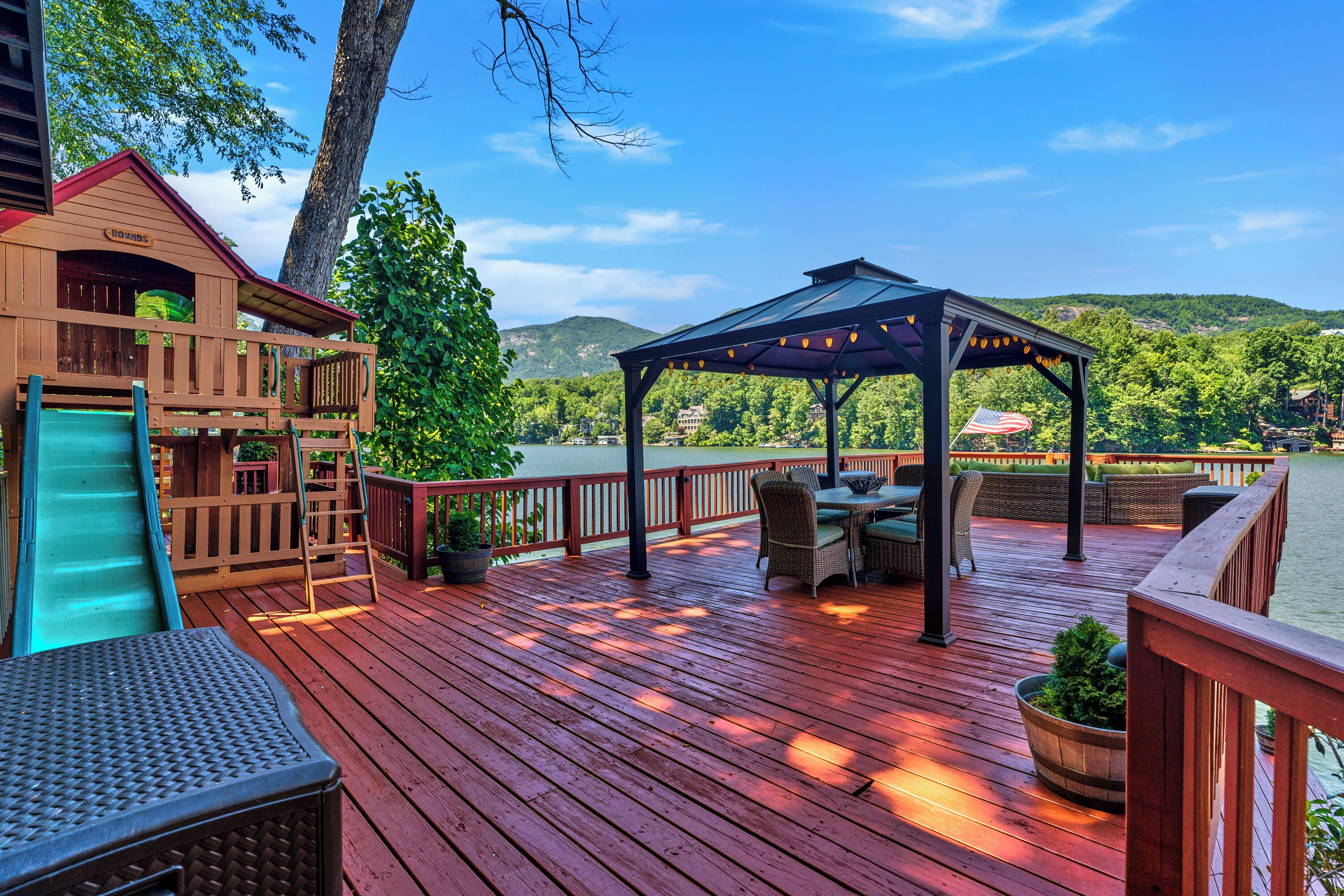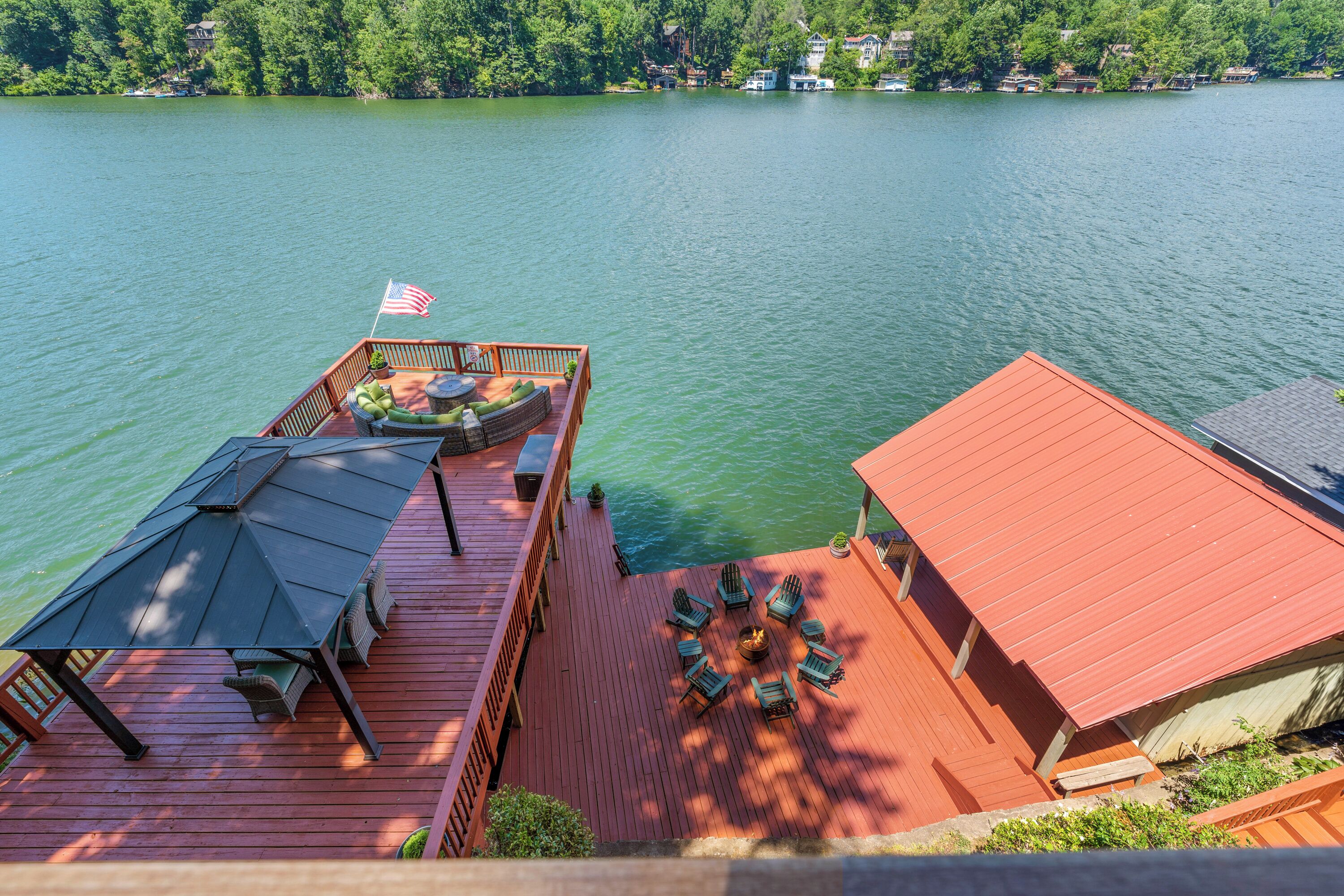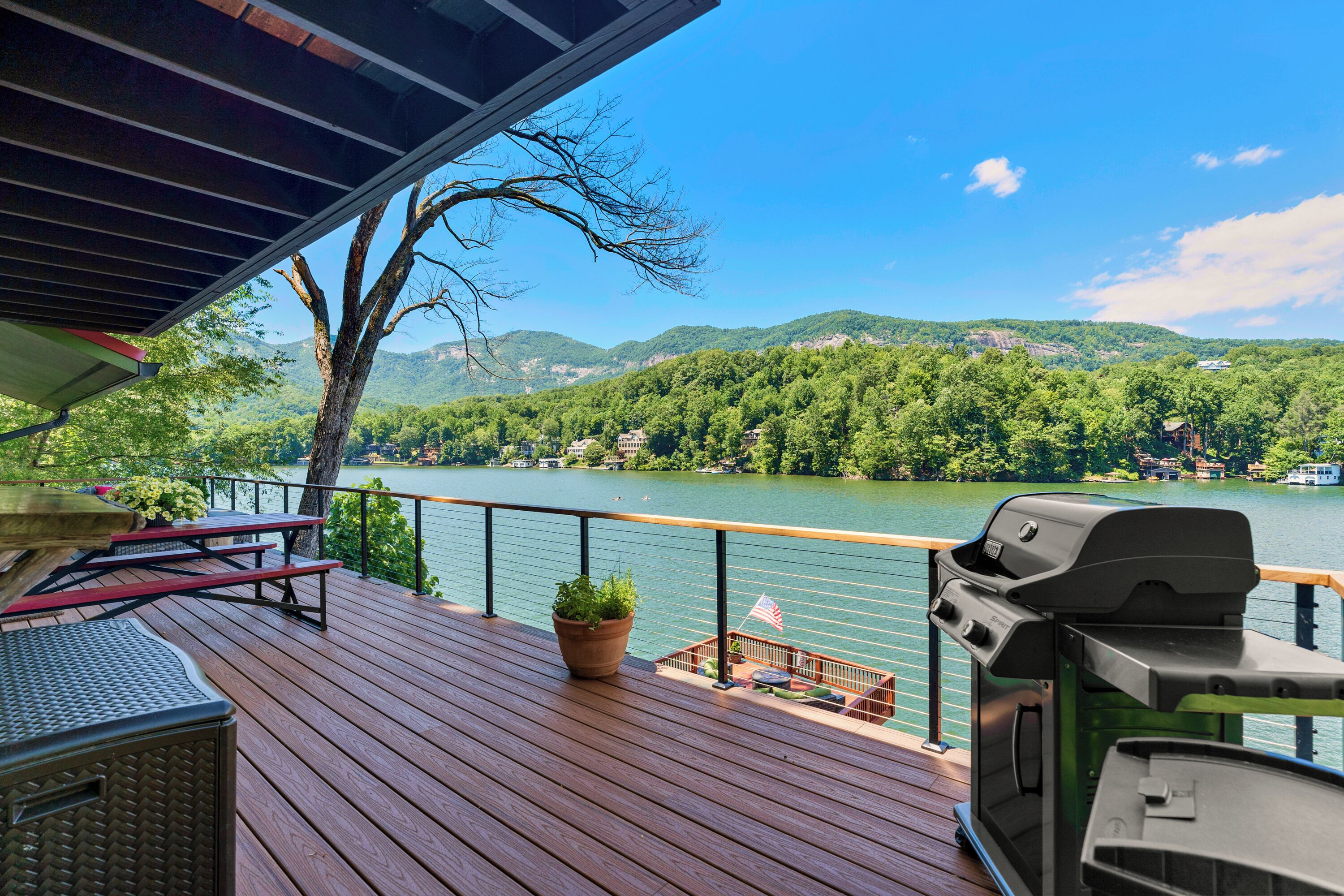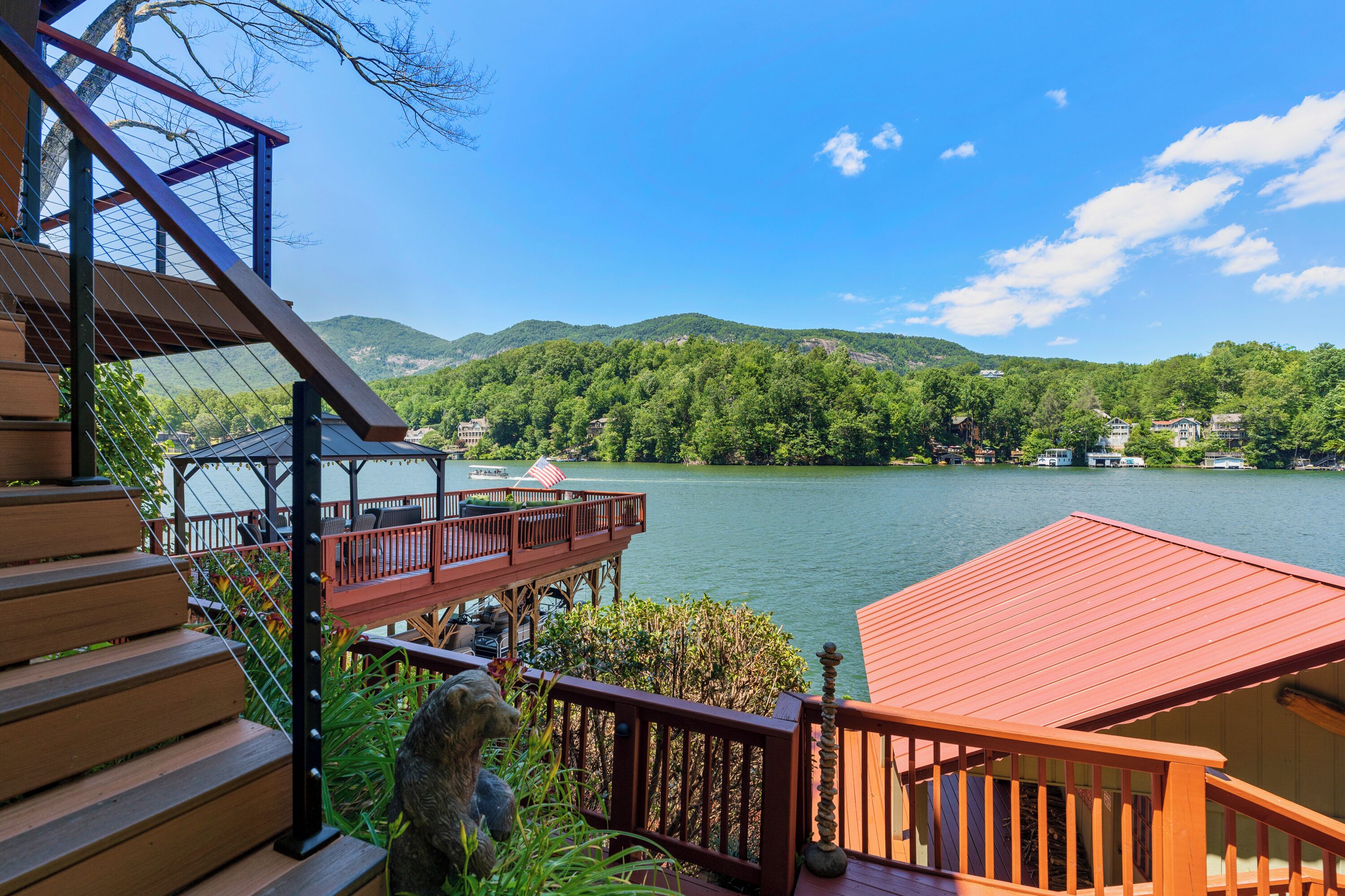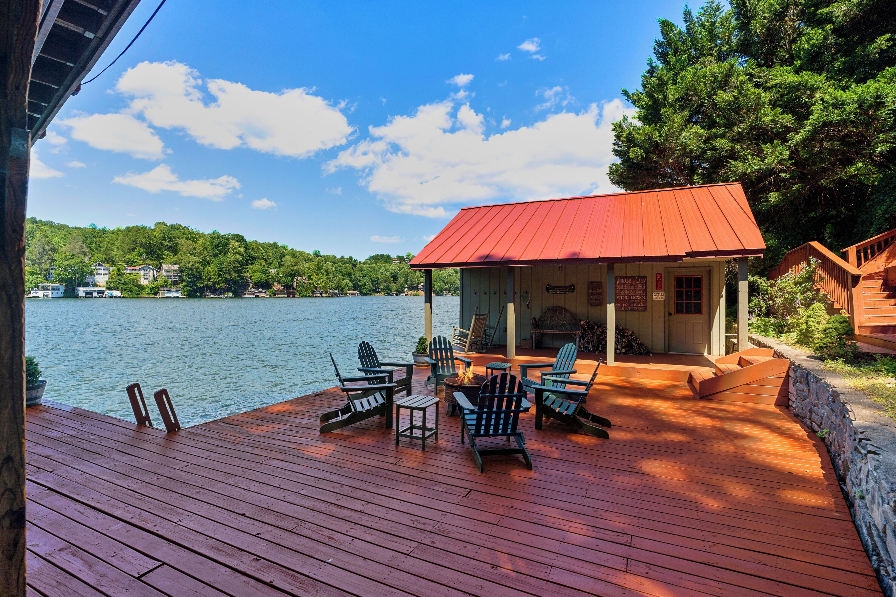 Papas Haus on Lake Lure - 3BR 3BA Lakefront, Decks Galore - Fire Pit Papas Haus is a 3 bedroom, 3 bath, tri level lakefront home on the open water main channel of Lake Lure. This vacation dream offers some of the best outdoor lakefront living area of any home on the lake! Plus, the location is ideal, just a few minutes to downtown Lake Lure and Chimney Rock Village.Pull the comfortable Adirondack chairs around the wood burning FIRE PIT on the giant dock right at the water's edge and create lifelong memories day or night. Or you can relax on the big semi-circle cushy couch with gas burning FIRE PIT on the raised deck over the boathouse. For those who prefer some shade, there is also a covered table and chairs on the boathouse deck. The main two levels of the home both have full length decks, and there is even a private deck off the Master Bedroom. All these living areas offer plenty of furniture, so the group can all gather, or break into small groups and still have your own private space to enjoy.The inside of this exquisite home is a decorator's dream. The decor is stunning, and we guarantee that every day you walk thru the home you will notice something new. Immediately as you enter, views of the lake will pull you thru the home as you pass a custom carved Bear Newel post directly to the lake view deck. The light and bright main level lake view living room features high vaulted ceilings, stone GAS FIREPLACE, wood floors, antler chandelier, giant 65 inch SMART TV, and ample seating for everyone. The open floor plan connects the living room, dining area and kitchen. The lake view dining table seats six for mealtime, playing one of the many board games provided, or planning the next day's activities on the lake. Adjacent to the dining table is a breakfast bar with three leather bar stools ideal for overflow seating, morning coffee, or just talking with the cook. Steps away is a fully equipped lake view kitchen with all the dishware, cookware, and utensils you will need for preparing vacation meals. It has plenty of counter space, refrigerator freezer, double oven, electric stove, microwave, dishwasher, and coffee maker. Right outside is a GAS GRILL. Rest assured, the kitchen is equipped with all the essentials to prepare gourmet meals, as the Homeowner was a regular on the TV Food Network. Completing the main level are two Guest Rooms. The first Guest Room called the Trout Room features stunning Lake Lure decor and a very open feeling with high vaulted ceilings. Accents include a birch and wood double headboard copied from Walt Disney's Wilderness Lodge, and a classic trout theme with original art and posters. It features a double bed, two nightstands with reading lights, dresser drawers, and a large closet. The second Guest Room is called the Bear Room, also with splendid original themed artwork. Family members of all ages can enjoy the massive log bed bunk bed with double mattress on top and queen mattress on the bottom. This helps tremendously with sleeping flexibility for the group. Other details include vaulted ceiling, nightstand with reading light, and chest of drawers. Even the bathroom on the main level has the same magnificent Camp theme with oversized curved bathtub, Ralph Lauren plaid shower curtain, and custom tin and birch wainscoting. Up a short set of stairs is a private Master Suite paradise. The most amazing feature is the private covered deck where you can relax away from the rest of your group. The room features vaulted ceilings, sliding glass doors to the deck, a king size bed, two nightstands with reading lights, dresser drawers, and a closet. The exquisite decor of the bathroom matches the bedroom and features a walk-in tile shower with glass doors.But wait, there's more. Let's go downstairs to another large living area known as the Bat Cave. Here you find a second living room, equally as impressive as the one upstairs. It has plenty of luxurious seating to gather around the stone GAS FIREPLACE to watch the enormous 75” SMART TV. For additional sleeping flexibility, there is a pull-out queen sofa bed with upgraded mattress and no mattress bars, the ultimate in comfort. A full bathroom is located downstairs for your convenience with large walk-in shower, copper sink, and birch cabinets. When it's time to relax outside, you can enjoy the full-length covered lake view deck. Plus, one necessity a vacation rental lake home needs, a laundry room!Papas Haus on Lake Lure can't be beat. The decor is extraordinary with unlimited personal touches. You simply won't find a home with more exceptional outdoor living area. Location is ideal, only minutes to downtown Lake Lure, Chimney Rock State Park, Chimney Rock Village, brewery, grocery store, river access, marina, and more. Our repeat Guests love the location because they don't need to endure the long narrow winding roads around the lake. Activities, restaurants, breweries, wine tasting, shops, and unlimited hiking are all nearby. You can't go wrong with Papas Haus on Lake Lure.