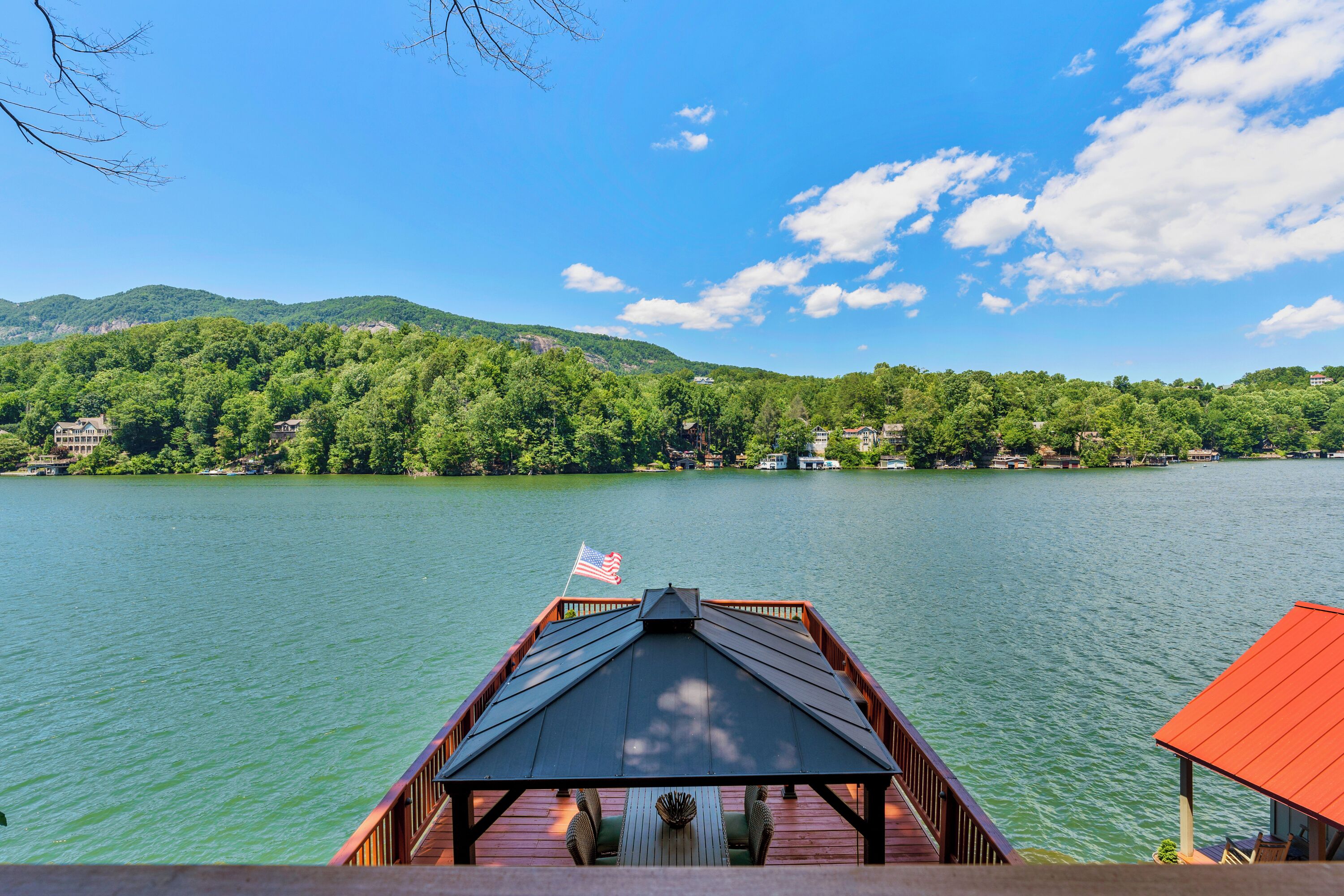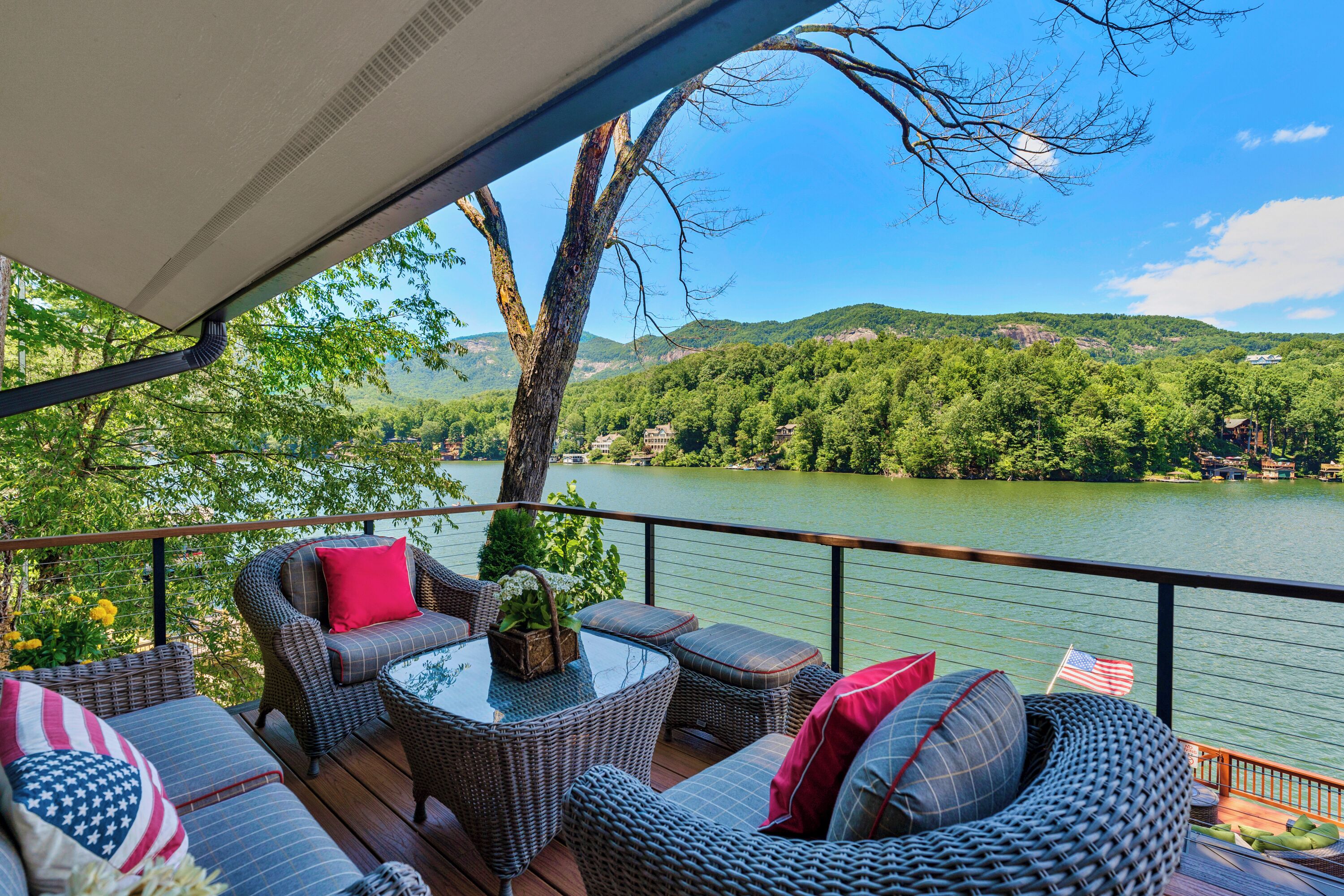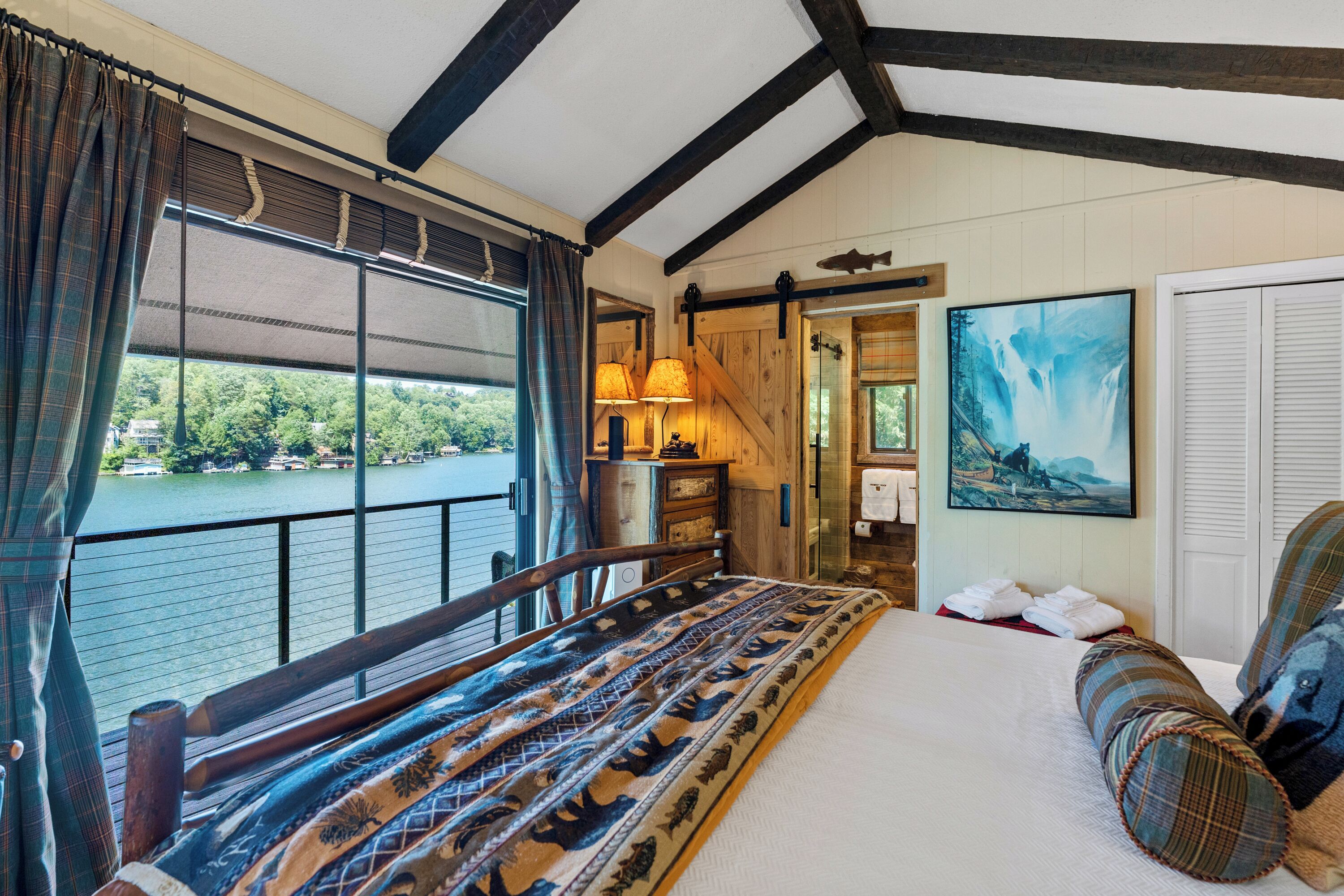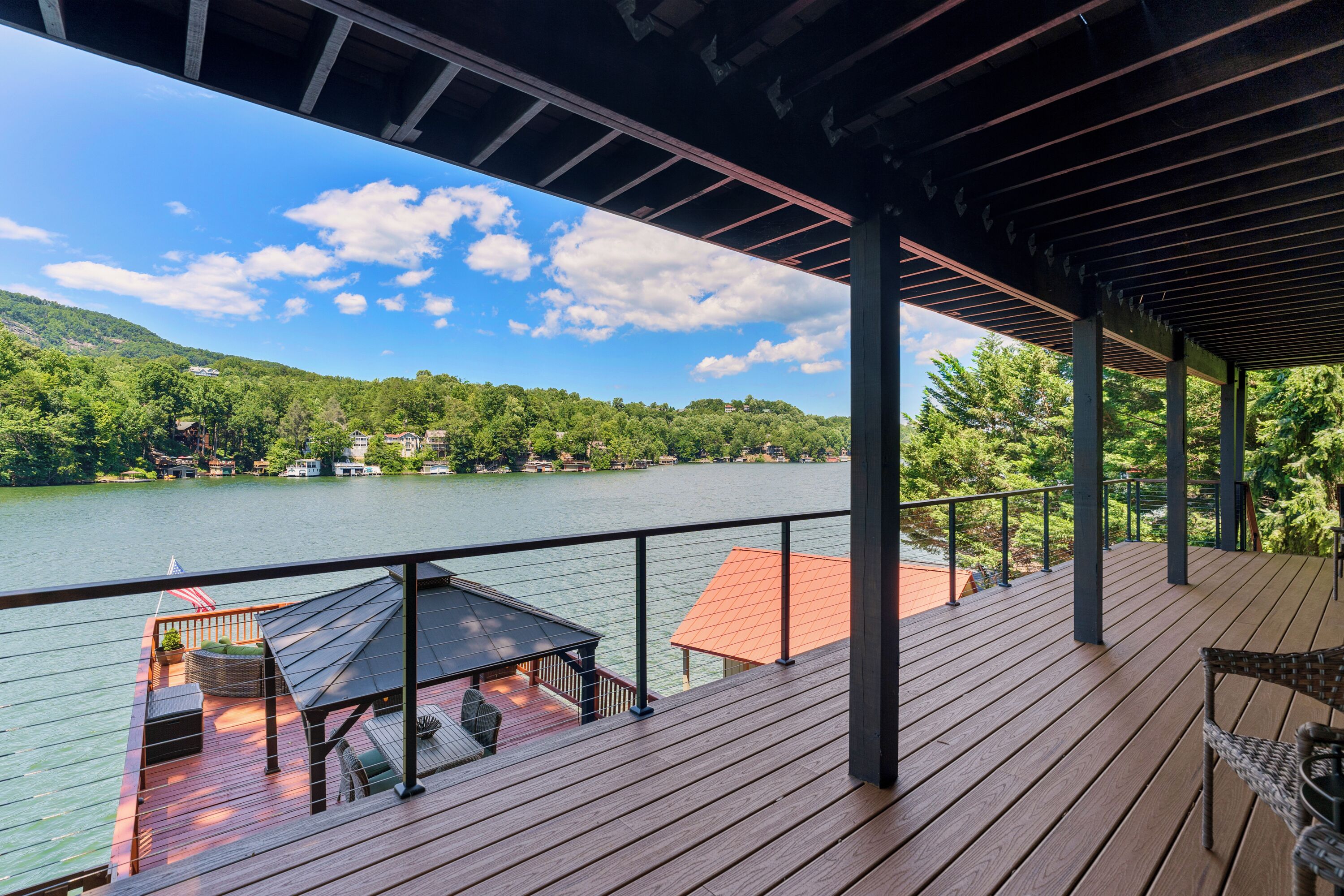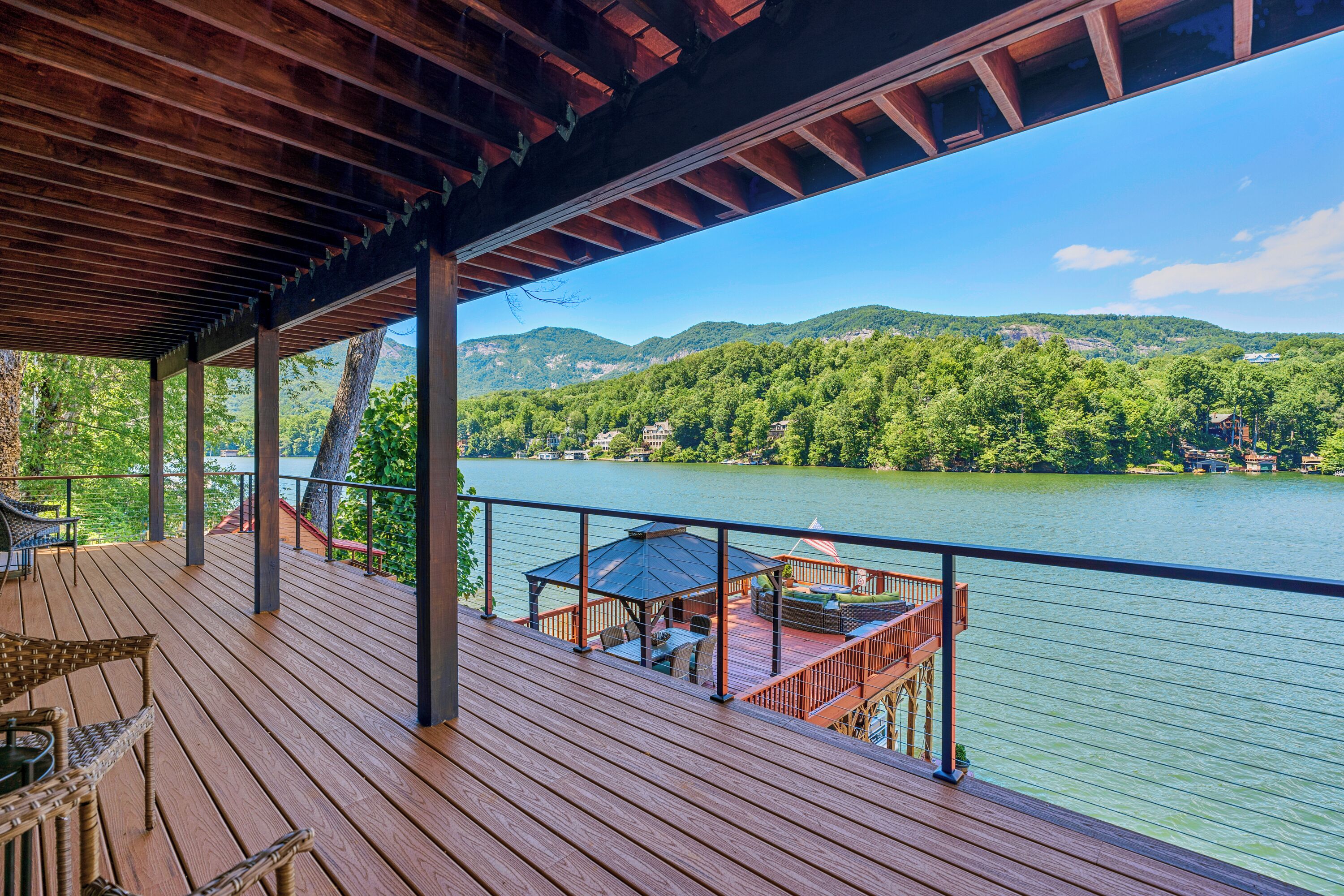 Papas Haus on Lake Lure - 3BR 3BA Lakefront, Decks Galore - Fire Pit Papas Haus is a 3 bedroom, 3 bath, tri level lakefront home on the open water main channel of Lake Lure. This vacation dream offers some of the best outdoor lakefront living area of any home on the lake! Plus, the location is ideal, just a few minutes to downtown Lake Lure and Chimney Rock Village.Pull the comfortable Adirondack chairs around the wood burning FIRE PIT on the giant dock right at the water's edge and create lifelong memories day or night. Or you can relax on the big semi-circle cushy couch with gas burning FIRE PIT on the raised deck over the boathouse. For those who prefer some shade, there is also a covered table and chairs on the boathouse deck. The main two levels of the home both have full length decks, and there is even a private deck off the Master Bedroom. All these living areas offer plenty of furniture, so the group can all gather, or break into small groups and still have your own private space to enjoy.The inside of this exquisite home is a decorator's dream. The decor is stunning, and we guarantee that every day you walk thru the home you will notice something new. Immediately as you enter, views of the lake will pull you thru the home as you pass a custom carved Bear Newel post directly to the lake view deck. The light and bright main level lake view living room features high vaulted ceilings, stone GAS FIREPLACE, wood floors, antler chandelier, giant 65 inch SMART TV, and ample seating for everyone. The open floor plan connects the living room, dining area and kitchen. The lake view dining table seats six for mealtime, playing one of the many board games provided, or planning the next day's activities on the lake. Adjacent to the dining table is a breakfast bar with three leather bar stools ideal for overflow seating, morning coffee, or just talking with the cook. Steps away is a fully equipped lake view kitchen with all the dishware, cookware, and utensils you will need for preparing vacation meals. It has plenty of counter space, refrigerator freezer, double oven, electric stove, microwave, dishwasher, and coffee maker. Right outside is a GAS GRILL. Rest assured, the kitchen is equipped with all the essentials to prepare gourmet meals, as the Homeowner was a regular on the TV Food Network. Completing the main level are two Guest Rooms. The first Guest Room called the Trout Room features stunning Lake Lure decor and a very open feeling with high vaulted ceilings. Accents include a birch and wood double headboard copied from Walt Disney's Wilderness Lodge, and a classic trout theme with original art and posters. It features a double bed, two nightstands with reading lights, dresser drawers, and a large closet. The second Guest Room is called the Bear Room, also with splendid original themed artwork. Family members of all ages can enjoy the massive log bed bunk bed with double mattress on top and queen mattress on the bottom. This helps tremendously with sleeping flexibility for the group. Other details include vaulted ceiling, nightstand with reading light, and chest of drawers. Even the bathroom on the main level has the same magnificent Camp theme with oversized curved bathtub, Ralph Lauren plaid shower curtain, and custom tin and birch wainscoting. Up a short set of stairs is a private Master Suite paradise. The most amazing feature is the private covered deck where you can relax away from the rest of your group. The room features vaulted ceilings, sliding glass doors to the deck, a king size bed, two nightstands with reading lights, dresser drawers, and a closet. The exquisite decor of the bathroom matches the bedroom and features a walk-in tile shower with glass doors.But wait, there's more. Let's go downstairs to another large living area known as the Bat Cave. Here you find a second living room, equally as impressive as the one upstairs. It has plenty of luxurious seating to gather around the stone GAS FIREPLACE to watch the enormous 75” SMART TV. For additional sleeping flexibility, there is a pull-out queen sofa bed with upgraded mattress and no mattress bars, the ultimate in comfort. A full bathroom is located downstairs for your convenience with large walk-in shower, copper sink, and birch cabinets. When it's time to relax outside, you can enjoy the full-length covered lake view deck. Plus, one necessity a vacation rental lake home needs, a laundry room!Papas Haus on Lake Lure can't be beat. The decor is extraordinary with unlimited personal touches. You simply won't find a home with more exceptional outdoor living area. Location is ideal, only minutes to downtown Lake Lure, Chimney Rock State Park, Chimney Rock Village, brewery, grocery store, river access, marina, and more. Our repeat Guests love the location because they don't need to endure the long narrow winding roads around the lake. Activities, restaurants, breweries, wine tasting, shops, and unlimited hiking are all nearby. You can't go wrong with Papas Haus on Lake Lure.
