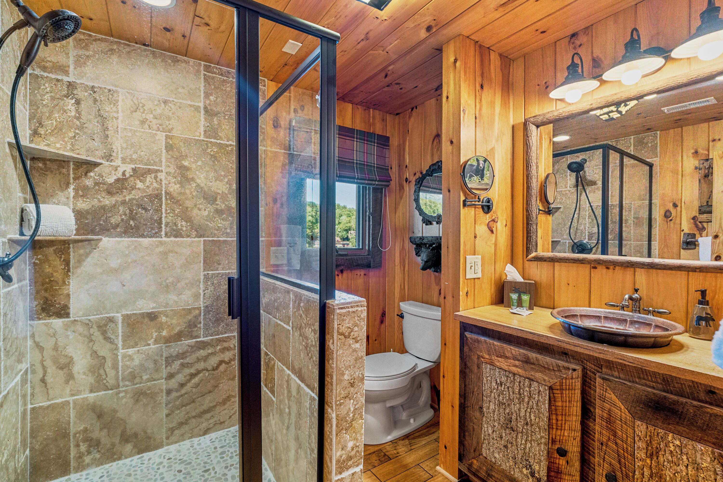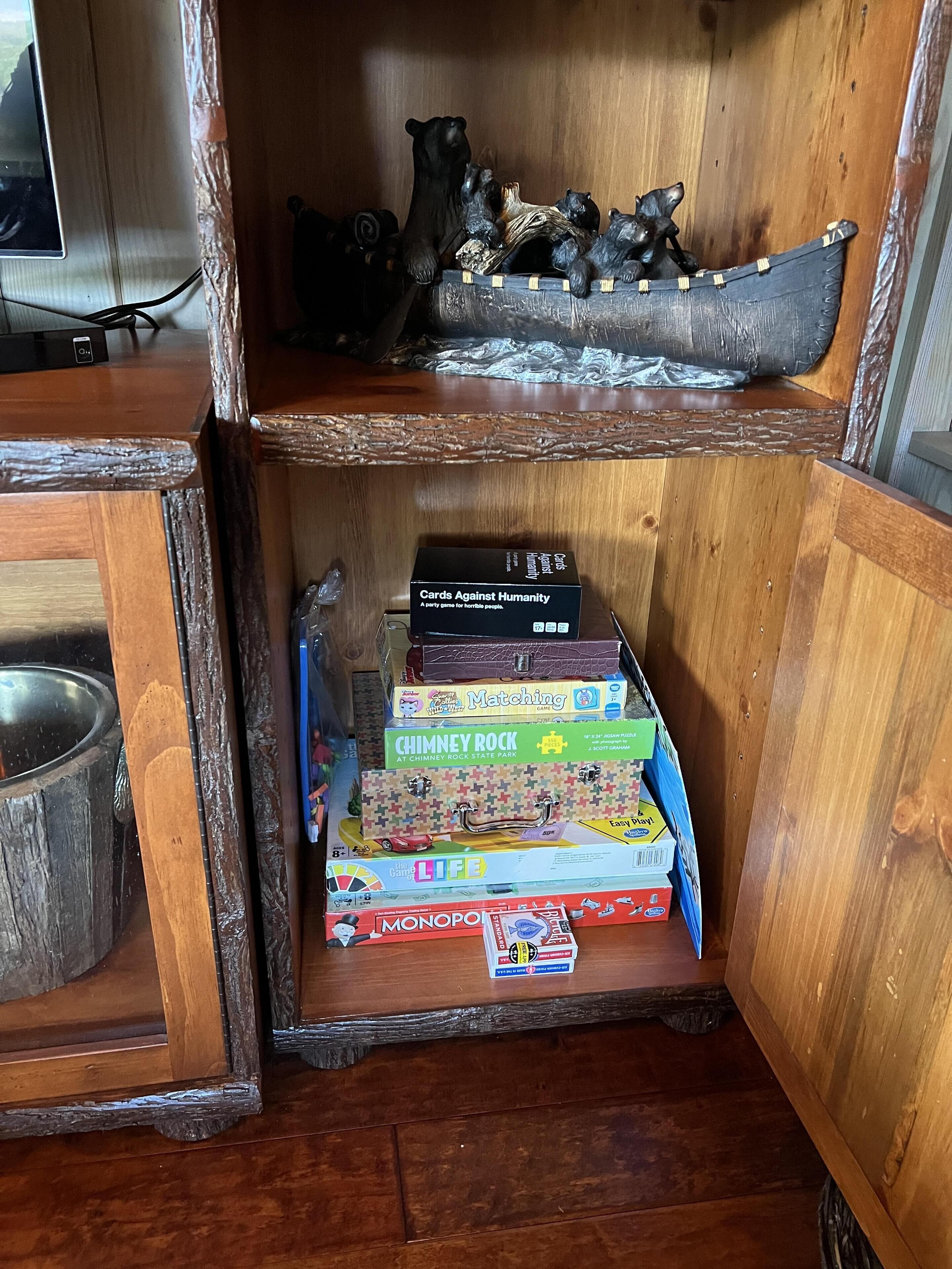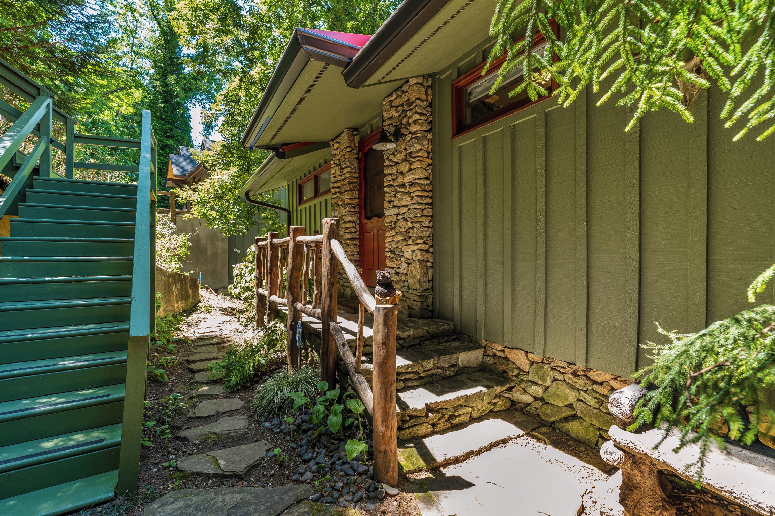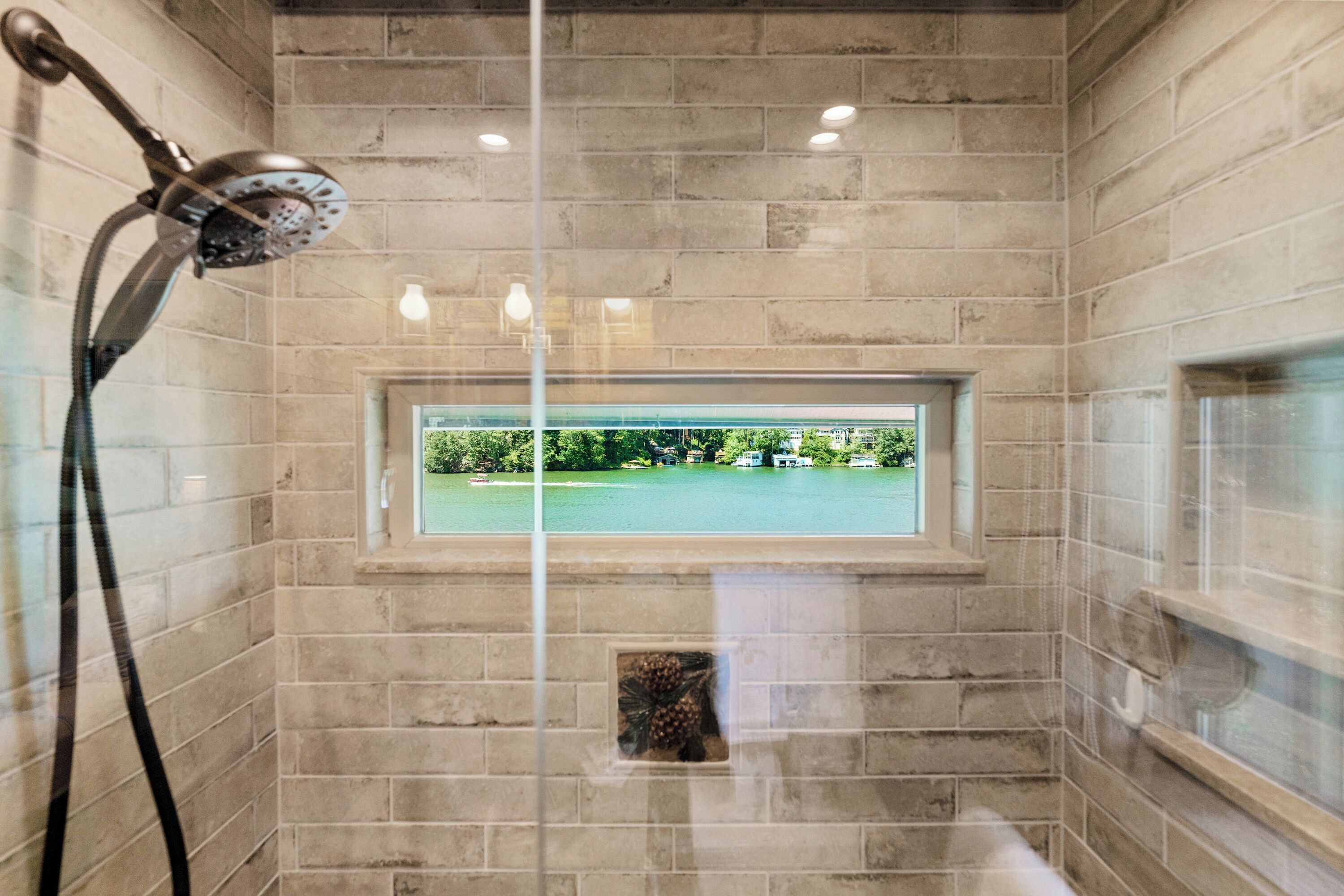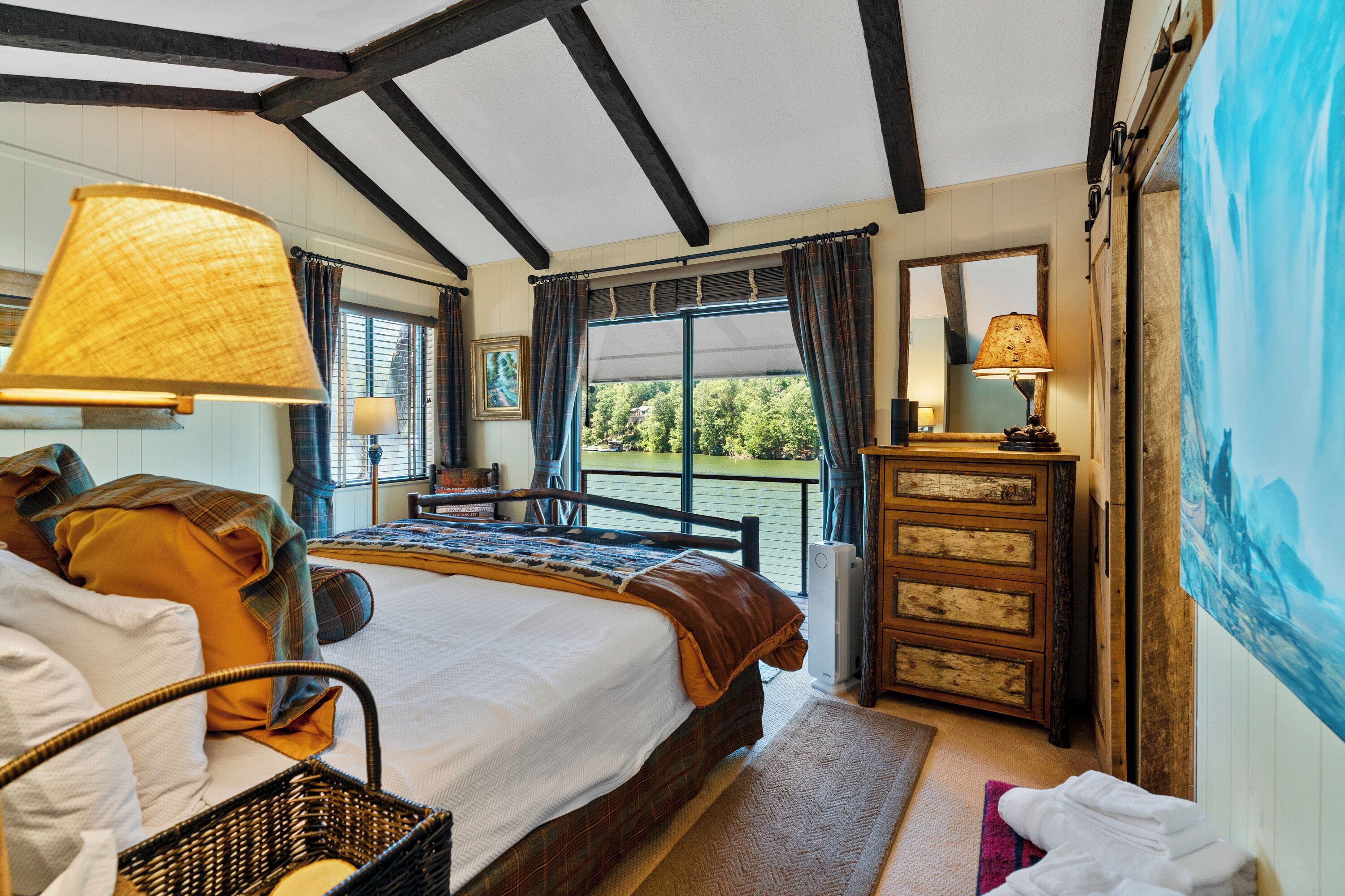 Papas Haus on Lake Lure - 3BR 3BA Lakefront, Decks Galore - Fire Pit Papas Haus is a 3 bedroom, 3 bath, tri level lakefront home on the open water main channel of Lake Lure. This vacation dream offers some of the best outdoor lakefront living area of any home on the lake! Plus, the location is ideal, just a few minutes to downtown Lake Lure and Chimney Rock Village.Pull the comfortable Adirondack chairs around the wood burning FIRE PIT on the giant dock right at the water's edge and create lifelong memories day or night. Or you can relax on the big semi-circle cushy couch with gas burning FIRE PIT on the raised deck over the boathouse. For those who prefer some shade, there is also a covered table and chairs on the boathouse deck. The main two levels of the home both have full length decks, and there is even a private deck off the Master Bedroom. All these living areas offer plenty of furniture, so the group can all gather, or break into small groups and still have your own private space to enjoy.The inside of this exquisite home is a decorator's dream. The decor is stunning, and we guarantee that every day you walk thru the home you will notice something new. Immediately as you enter, views of the lake will pull you thru the home as you pass a custom carved Bear Newel post directly to the lake view deck. The light and bright main level lake view living room features high vaulted ceilings, stone GAS FIREPLACE, wood floors, antler chandelier, giant 65 inch SMART TV, and ample seating for everyone. The open floor plan connects the living room, dining area and kitchen. The lake view dining table seats six for mealtime, playing one of the many board games provided, or planning the next day's activities on the lake. Adjacent to the dining table is a breakfast bar with three leather bar stools ideal for overflow seating, morning coffee, or just talking with the cook. Steps away is a fully equipped lake view kitchen with all the dishware, cookware, and utensils you will need for preparing vacation meals. It has plenty of counter space, refrigerator freezer, double oven, electric stove, microwave, dishwasher, and coffee maker. Right outside is a GAS GRILL. Rest assured, the kitchen is equipped with all the essentials to prepare gourmet meals, as the Homeowner was a regular on the TV Food Network. Completing the main level are two Guest Rooms. The first Guest Room called the Trout Room features stunning Lake Lure decor and a very open feeling with high vaulted ceilings. Accents include a birch and wood double headboard copied from Walt Disney's Wilderness Lodge, and a classic trout theme with original art and posters. It features a double bed, two nightstands with reading lights, dresser drawers, and a large closet. The second Guest Room is called the Bear Room, also with splendid original themed artwork. Family members of all ages can enjoy the massive log bed bunk bed with double mattress on top and queen mattress on the bottom. This helps tremendously with sleeping flexibility for the group. Other details include vaulted ceiling, nightstand with reading light, and chest of drawers. Even the bathroom on the main level has the same magnificent Camp theme with oversized curved bathtub, Ralph Lauren plaid shower curtain, and custom tin and birch wainscoting. Up a short set of stairs is a private Master Suite paradise. The most amazing feature is the private covered deck where you can relax away from the rest of your group. The room features vaulted ceilings, sliding glass doors to the deck, a king size bed, two nightstands with reading lights, dresser drawers, and a closet. The exquisite decor of the bathroom matches the bedroom and features a walk-in tile shower with glass doors.But wait, there's more. Let's go downstairs to another large living area known as the Bat Cave. Here you find a second living room, equally as impressive as the one upstairs. It has plenty of luxurious seating to gather around the stone GAS FIREPLACE to watch the enormous 75” SMART TV. For additional sleeping flexibility, there is a pull-out queen sofa bed with upgraded mattress and no mattress bars, the ultimate in comfort. A full bathroom is located downstairs for your convenience with large walk-in shower, copper sink, and birch cabinets. When it's time to relax outside, you can enjoy the full-length covered lake view deck. Plus, one necessity a vacation rental lake home needs, a laundry room!Papas Haus on Lake Lure can't be beat. The decor is extraordinary with unlimited personal touches. You simply won't find a home with more exceptional outdoor living area. Location is ideal, only minutes to downtown Lake Lure, Chimney Rock State Park, Chimney Rock Village, brewery, grocery store, river access, marina, and more. Our repeat Guests love the location because they don't need to endure the long narrow winding roads around the lake. Activities, restaurants, breweries, wine tasting, shops, and unlimited hiking are all nearby. You can't go wrong with Papas Haus on Lake Lure.