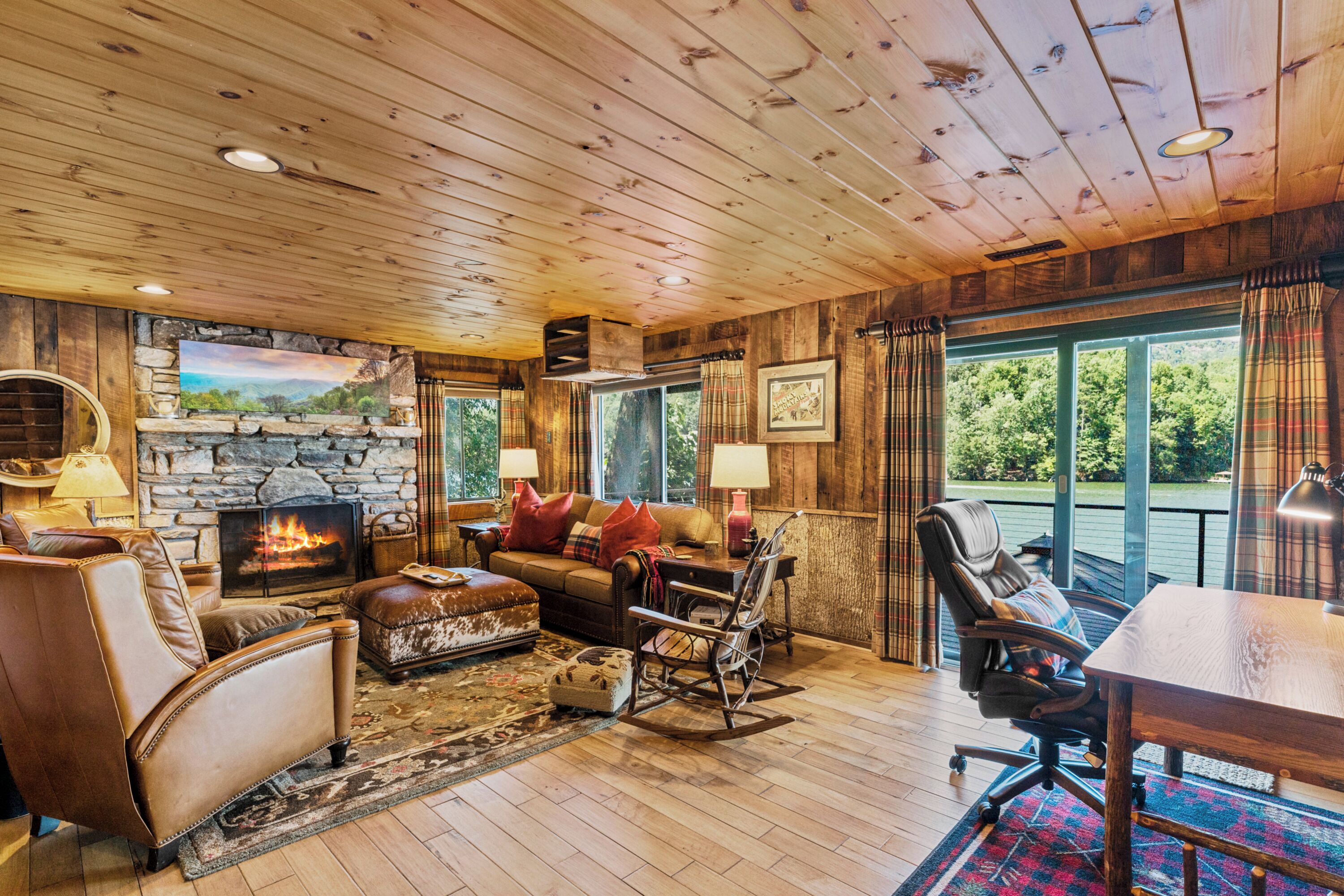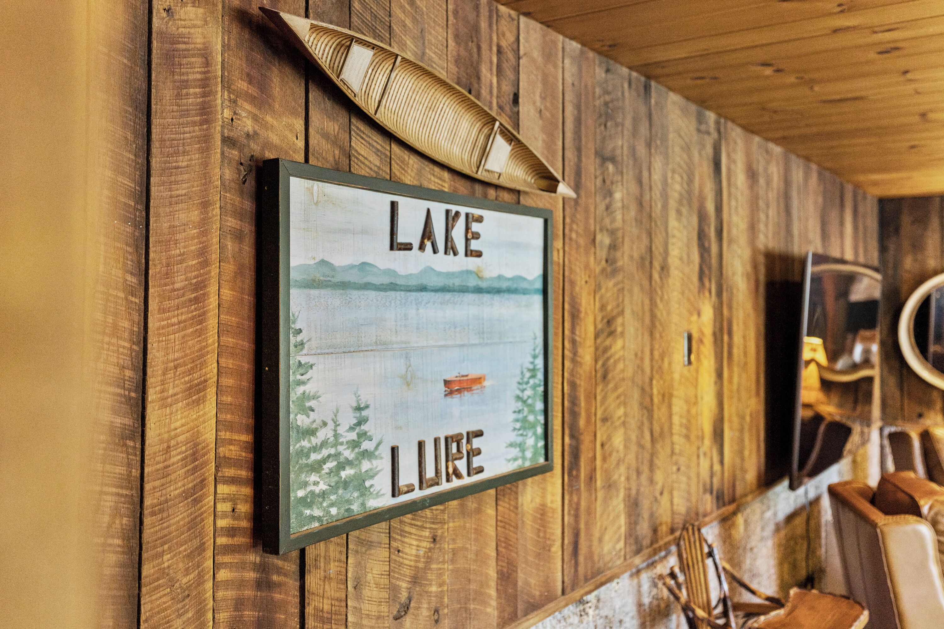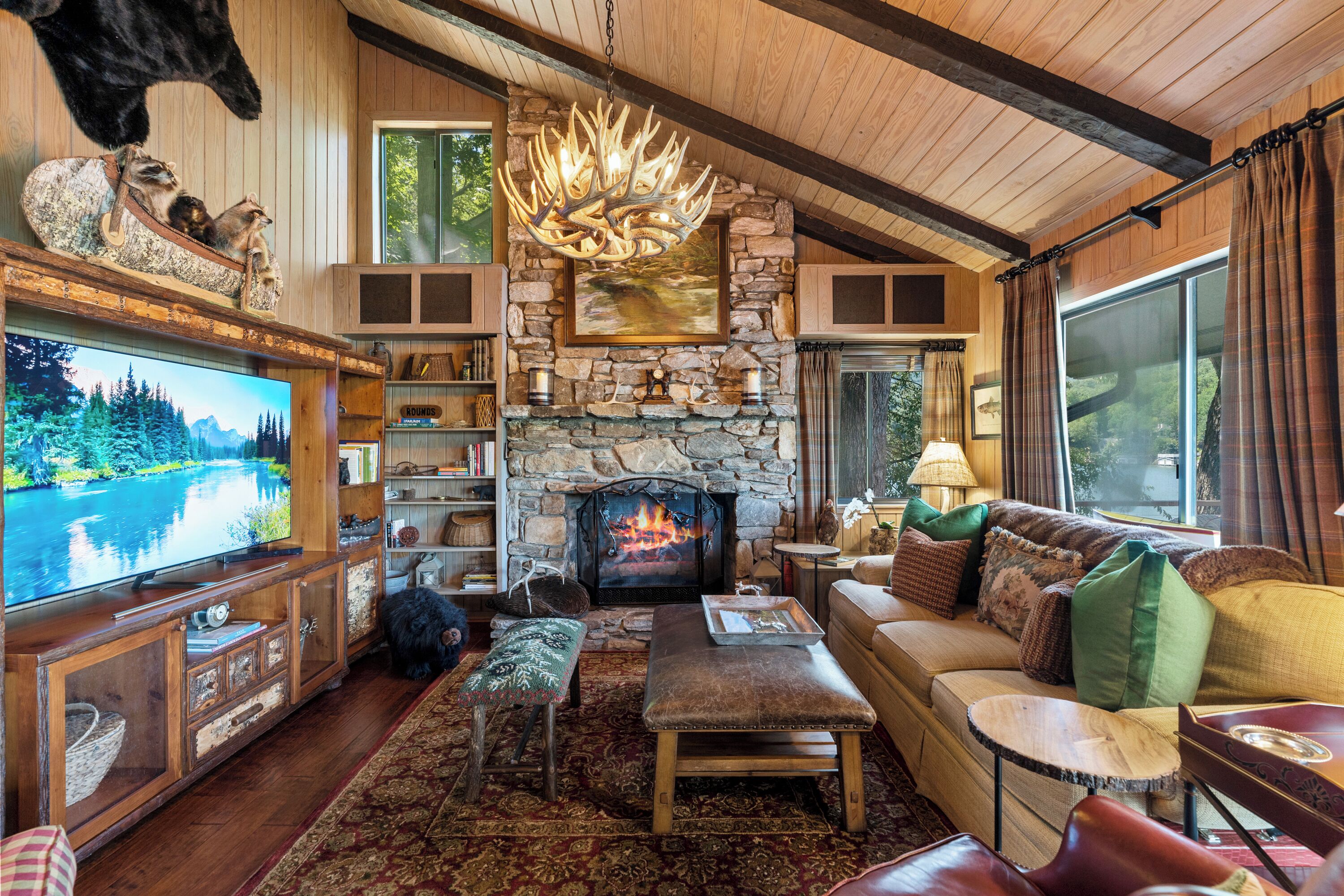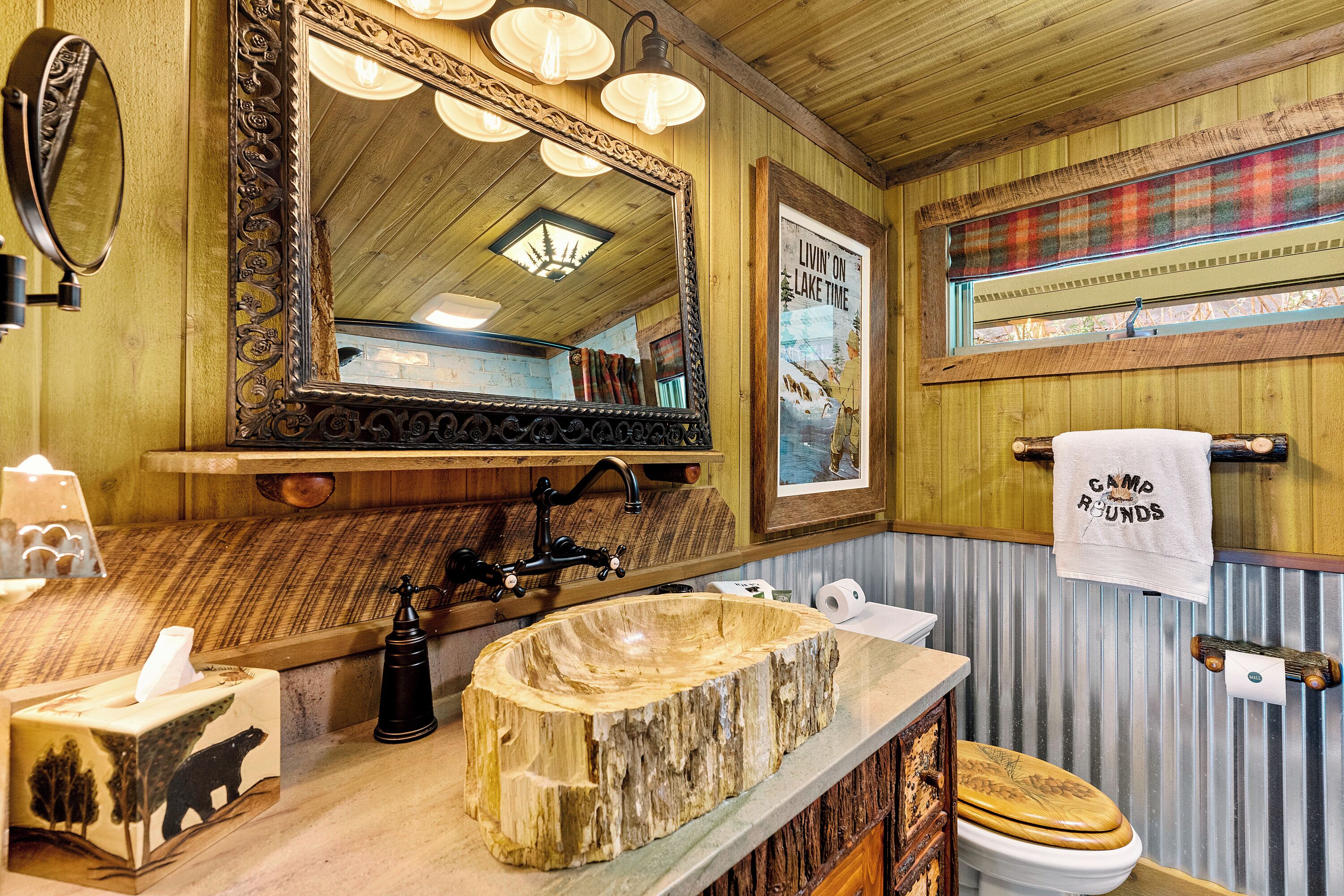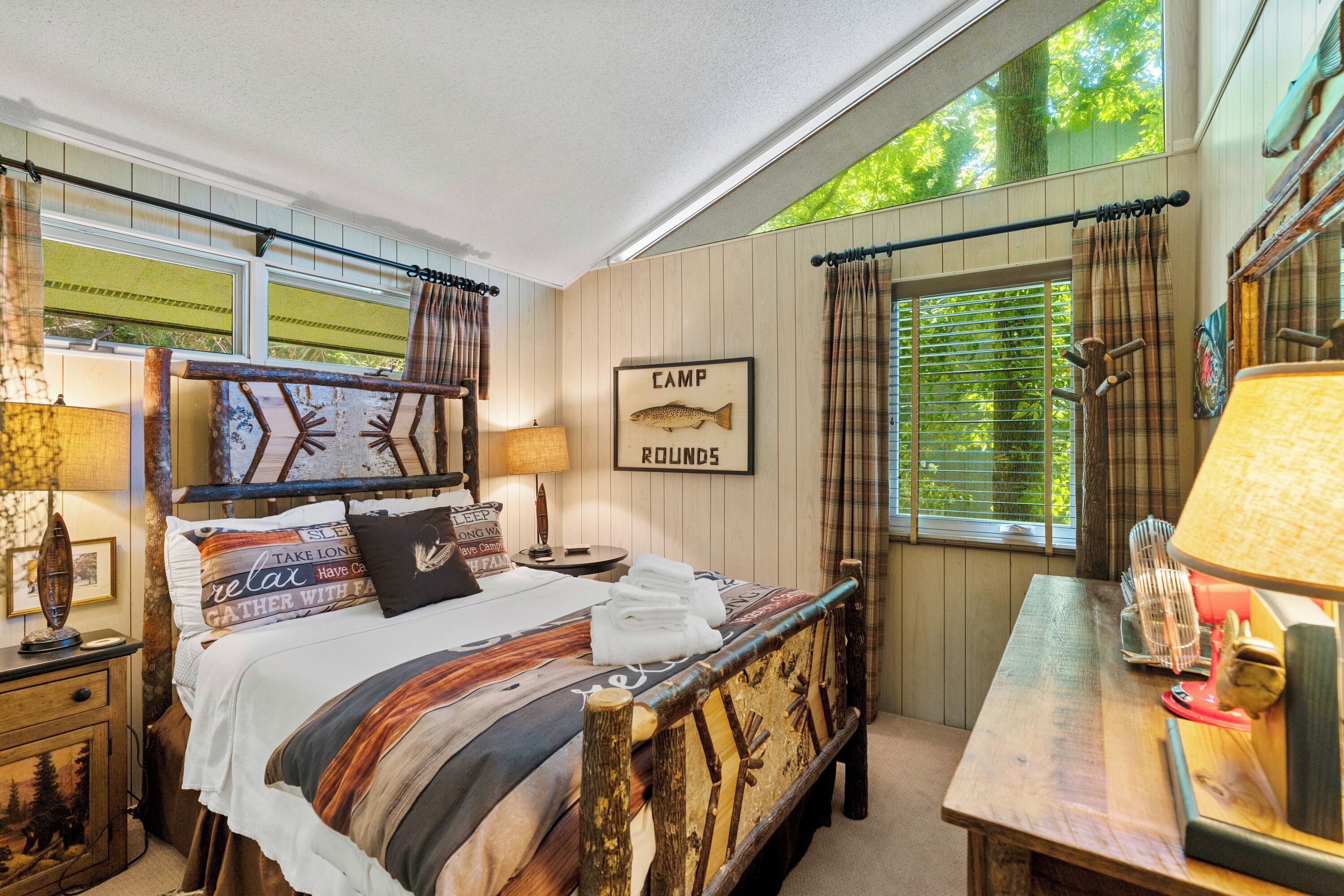 Papas Haus on Lake Lure - 3BR 3BA Lakefront, Decks Galore - Fire Pit Papas Haus is a 3 bedroom, 3 bath, tri level lakefront home on the open water main channel of Lake Lure. This vacation dream offers some of the best outdoor lakefront living area of any home on the lake! Plus, the location is ideal, just a few minutes to downtown Lake Lure and Chimney Rock Village.Pull the comfortable Adirondack chairs around the wood burning FIRE PIT on the giant dock right at the water's edge and create lifelong memories day or night. Or you can relax on the big semi-circle cushy couch with gas burning FIRE PIT on the raised deck over the boathouse. For those who prefer some shade, there is also a covered table and chairs on the boathouse deck. The main two levels of the home both have full length decks, and there is even a private deck off the Master Bedroom. All these living areas offer plenty of furniture, so the group can all gather, or break into small groups and still have your own private space to enjoy.The inside of this exquisite home is a decorator's dream. The decor is stunning, and we guarantee that every day you walk thru the home you will notice something new. Immediately as you enter, views of the lake will pull you thru the home as you pass a custom carved Bear Newel post directly to the lake view deck. The light and bright main level lake view living room features high vaulted ceilings, stone GAS FIREPLACE, wood floors, antler chandelier, giant 65 inch SMART TV, and ample seating for everyone. The open floor plan connects the living room, dining area and kitchen. The lake view dining table seats six for mealtime, playing one of the many board games provided, or planning the next day's activities on the lake. Adjacent to the dining table is a breakfast bar with three leather bar stools ideal for overflow seating, morning coffee, or just talking with the cook. Steps away is a fully equipped lake view kitchen with all the dishware, cookware, and utensils you will need for preparing vacation meals. It has plenty of counter space, refrigerator freezer, double oven, electric stove, microwave, dishwasher, and coffee maker. Right outside is a GAS GRILL. Rest assured, the kitchen is equipped with all the essentials to prepare gourmet meals, as the Homeowner was a regular on the TV Food Network. Completing the main level are two Guest Rooms. The first Guest Room called the Trout Room features stunning Lake Lure decor and a very open feeling with high vaulted ceilings. Accents include a birch and wood double headboard copied from Walt Disney's Wilderness Lodge, and a classic trout theme with original art and posters. It features a double bed, two nightstands with reading lights, dresser drawers, and a large closet. The second Guest Room is called the Bear Room, also with splendid original themed artwork. Family members of all ages can enjoy the massive log bed bunk bed with double mattress on top and queen mattress on the bottom. This helps tremendously with sleeping flexibility for the group. Other details include vaulted ceiling, nightstand with reading light, and chest of drawers. Even the bathroom on the main level has the same magnificent Camp theme with oversized curved bathtub, Ralph Lauren plaid shower curtain, and custom tin and birch wainscoting. Up a short set of stairs is a private Master Suite paradise. The most amazing feature is the private covered deck where you can relax away from the rest of your group. The room features vaulted ceilings, sliding glass doors to the deck, a king size bed, two nightstands with reading lights, dresser drawers, and a closet. The exquisite decor of the bathroom matches the bedroom and features a walk-in tile shower with glass doors.But wait, there's more. Let's go downstairs to another large living area known as the Bat Cave. Here you find a second living room, equally as impressive as the one upstairs. It has plenty of luxurious seating to gather around the stone GAS FIREPLACE to watch the enormous 75” SMART TV. For additional sleeping flexibility, there is a pull-out queen sofa bed with upgraded mattress and no mattress bars, the ultimate in comfort. A full bathroom is located downstairs for your convenience with large walk-in shower, copper sink, and birch cabinets. When it's time to relax outside, you can enjoy the full-length covered lake view deck. Plus, one necessity a vacation rental lake home needs, a laundry room!Papas Haus on Lake Lure can't be beat. The decor is extraordinary with unlimited personal touches. You simply won't find a home with more exceptional outdoor living area. Location is ideal, only minutes to downtown Lake Lure, Chimney Rock State Park, Chimney Rock Village, brewery, grocery store, river access, marina, and more. Our repeat Guests love the location because they don't need to endure the long narrow winding roads around the lake. Activities, restaurants, breweries, wine tasting, shops, and unlimited hiking are all nearby. You can't go wrong with Papas Haus on Lake Lure.