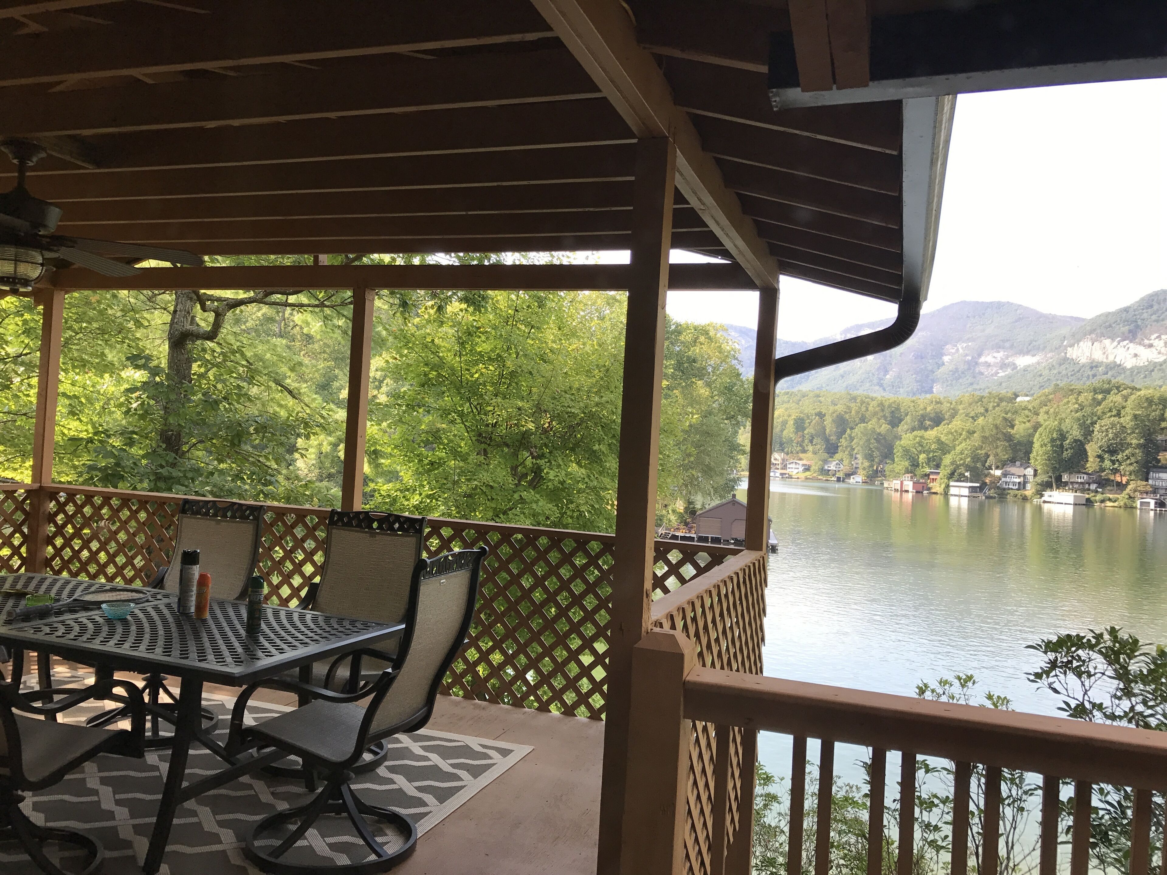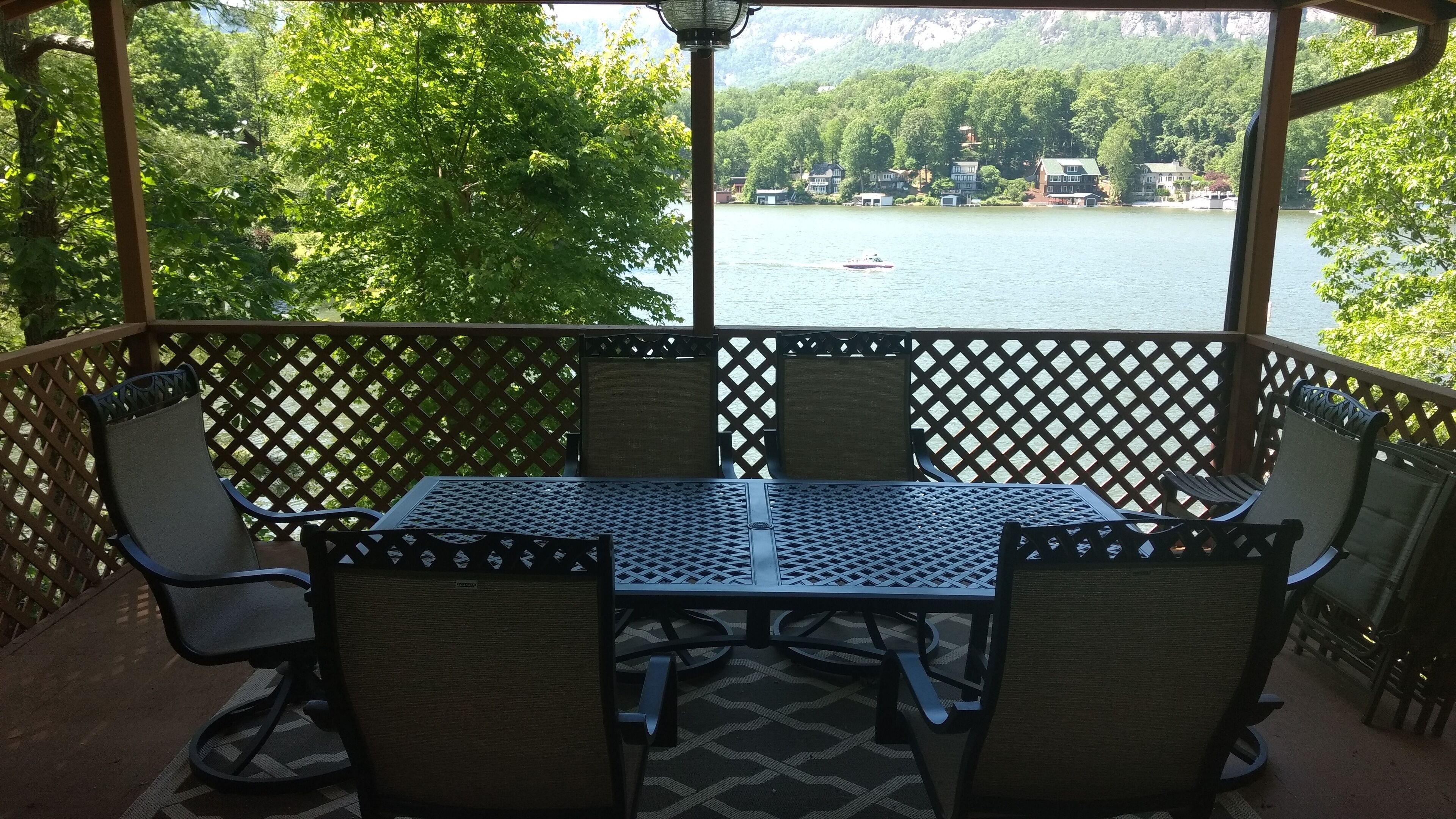 Lakefront - Cozy Cottage Directly On Beautiful Lake Lure! Beautiful Lake Lure is calling. Come make vacation memories at this fantastic property!Lake Lure will be lowered 12' Jan.1 to March 31 for maintenance and repairs. Water level at Keepers Cottage is still good for fIshing and you can explore by walking on the shore line. ** New! 2 kayaks for our guests to enjoy on beautiful Lake Lure** Keeper's Cottage is a cozy one bedroom lakefront cottage with simply superb, awe inspiring views of Rumbling Bald and Shumont mountains. One of the oldest properties on Lake Lure, this charming cottage is very private, recently remodeled, and is centrally located in a family compound 2 miles from downtown Lake Lure, Ingles grocery, and approximately 3 miles from Chimney Rock State Park. Our convenient location also provides easy access - less than 1500 feet from the main highway! The property comes with a king size bed (new mattress) and a pullout sleeper sofa to sleep a maximum of 4 people. The master bathroom has a romantic corner jacuzzi tub and shower combination, the second bathroom sports a delightful tile shower. The kitchen is fully equipped with microwave, range, dish washer, dishes, pots, pans, cutlery, toaster, coffee pot, and a gas grill is also provided for outdoor cooking. The cottage is approximately 972 square feet, with central heating and air, washer and dryer, a 4K Ultra HD TV with Dish Network, Netflix, and Hulu. Cable Internet with Wi-Fi is provided, recently upgraded to 25 Mbps. Linens and towels are provided so just come as you are! The outside covered porch area provides for a perfect dining experience while overlooking the lake and enjoying the majestic mountain views. There is a private dock for swimming and fishing with NEW STEPS for easier access. Excellent parking. Perfect for a romantic getaway or just plain relaxation!