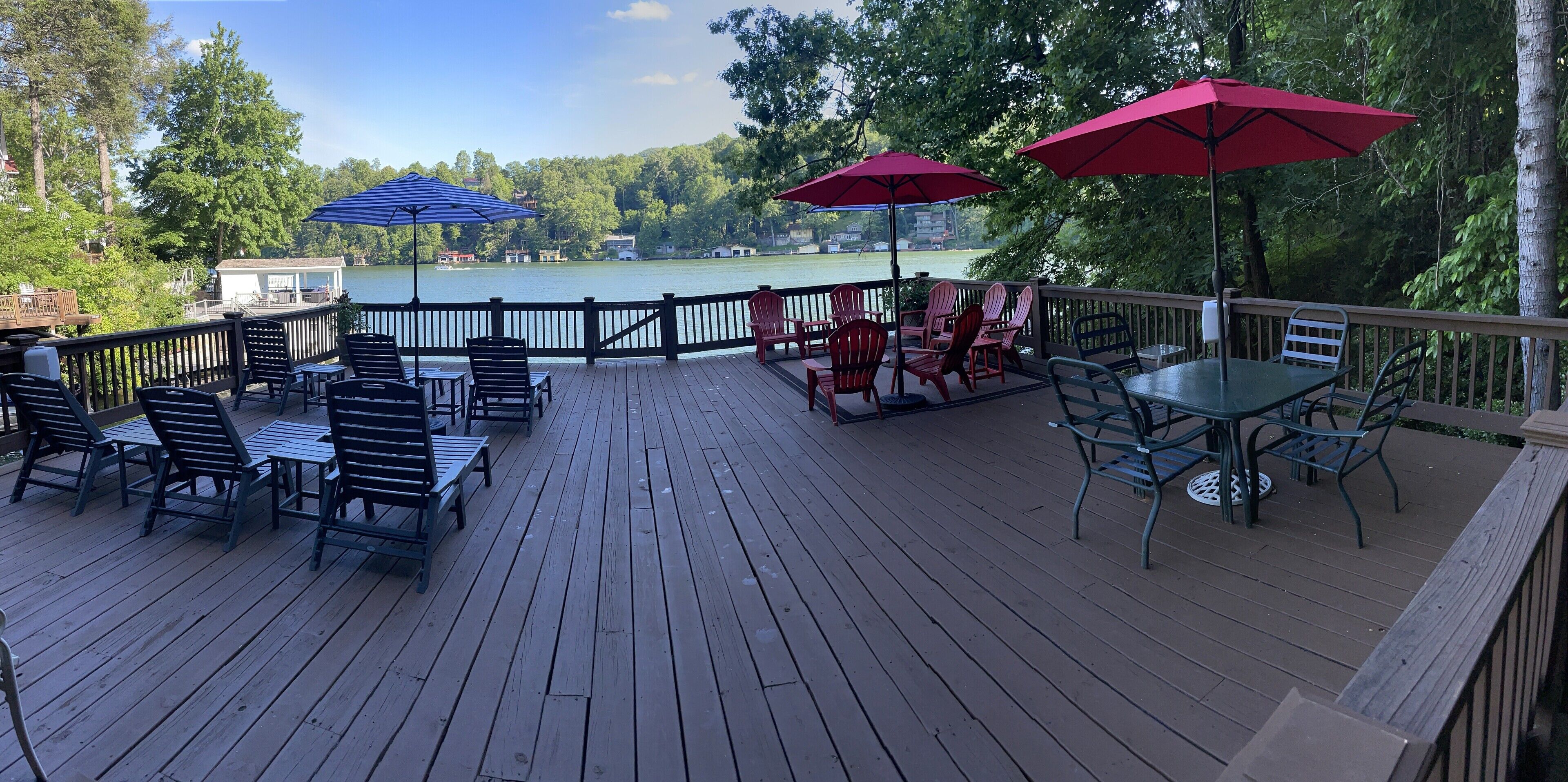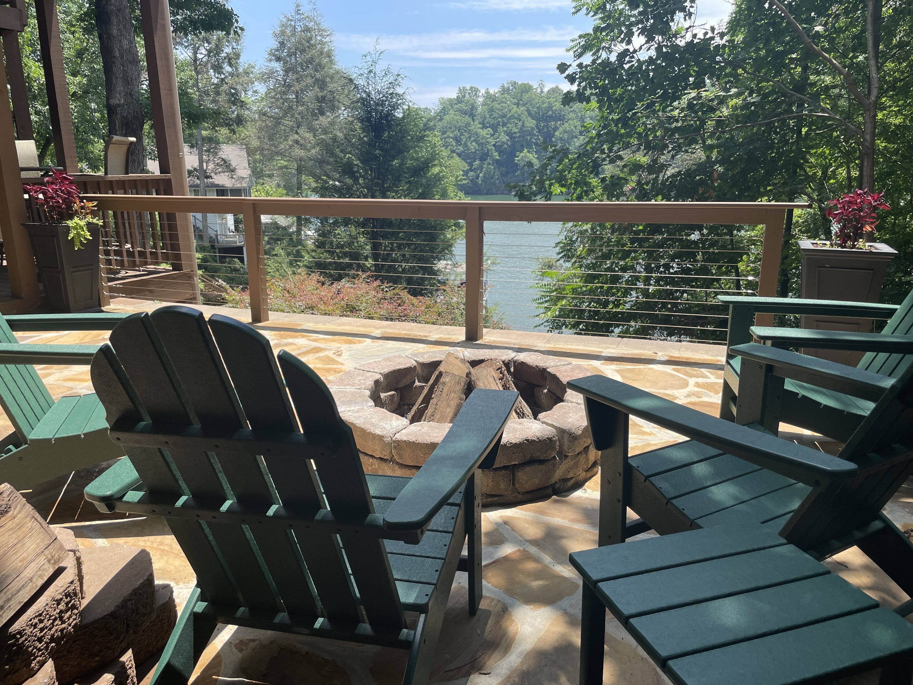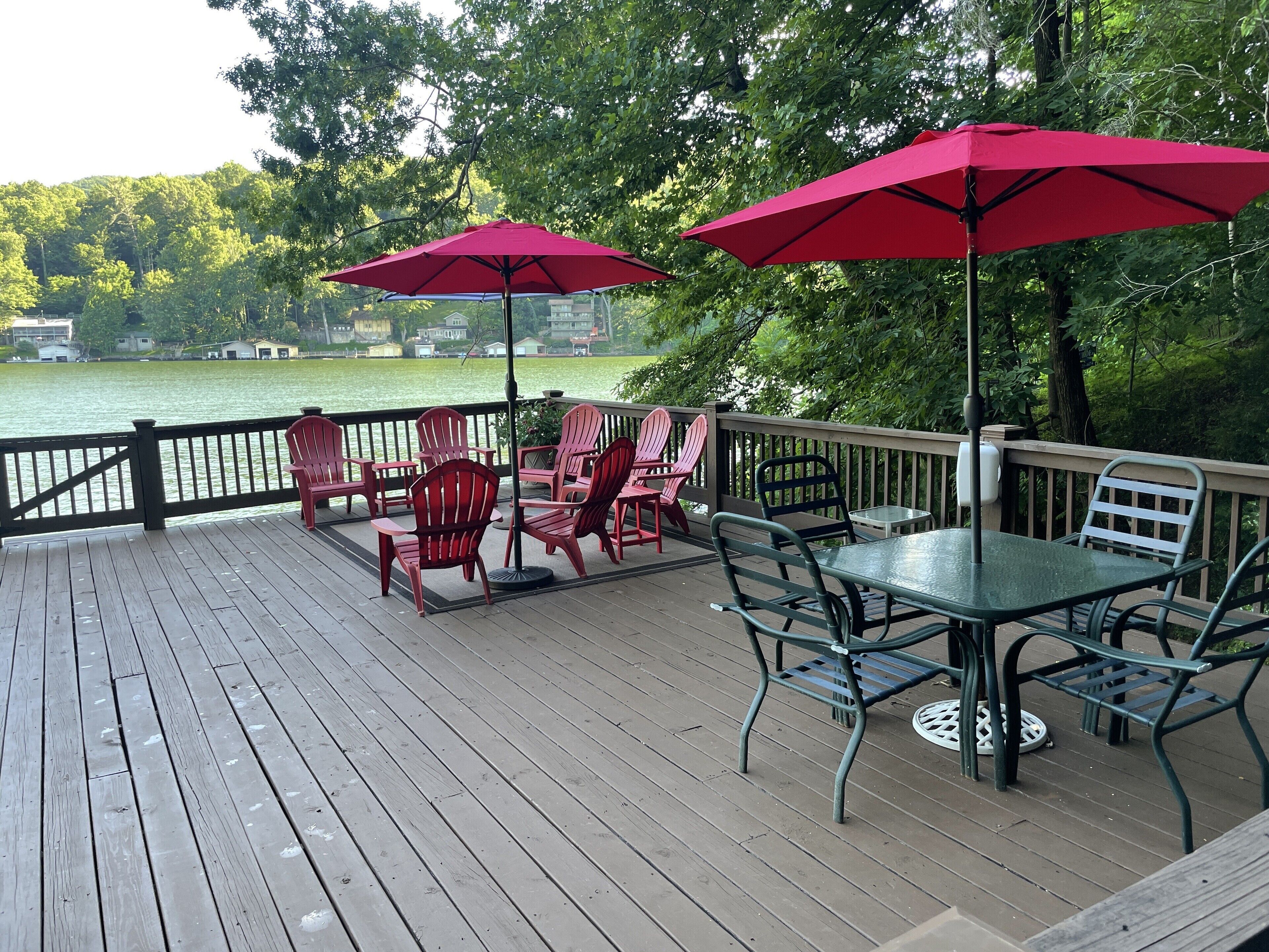 5 Br/3.5 Ba. 3 KING BEDS. LAKE FRONT. FIREPIT. GAME ROOM. MULTIPLE PORCHES. Beautiful LAKEFRONT home. This home boasts a King Suite as well as four spacious gathering decks and room to spread out. Numerous indoor as well as outdoor living areas including a billiard room. Garage has been converted into a rec room with a ping pong table, foosball, giant jinga, and TV. Enormous sun deck atop a 2 stall boathouse. 2 Kayaks and 2 paddle boards (SUP) included with rental. Inquire with owner regarding rental of 20' pontoon. Sonos sound system. 3 king beds, 2 queens, 1 single, 3 roll-away beds, and 2 pack-n-play cribs. Fully stocked kitchen. Weber gas grill and charcoal grill are available for use. Our cove is nestled back from the traffic flow of the main lake allowing a safe space for children to swim away from boat traffic. *NEW in 2022- we have just completed a stone fire pit addition to the side of our home.