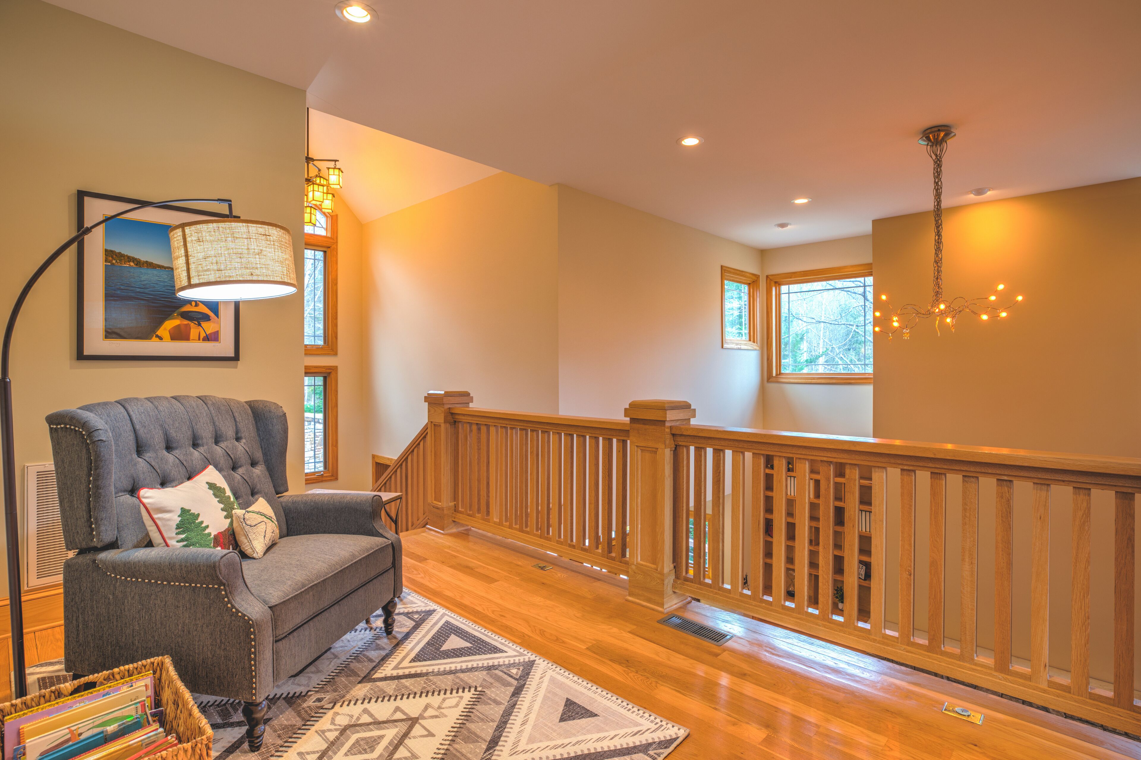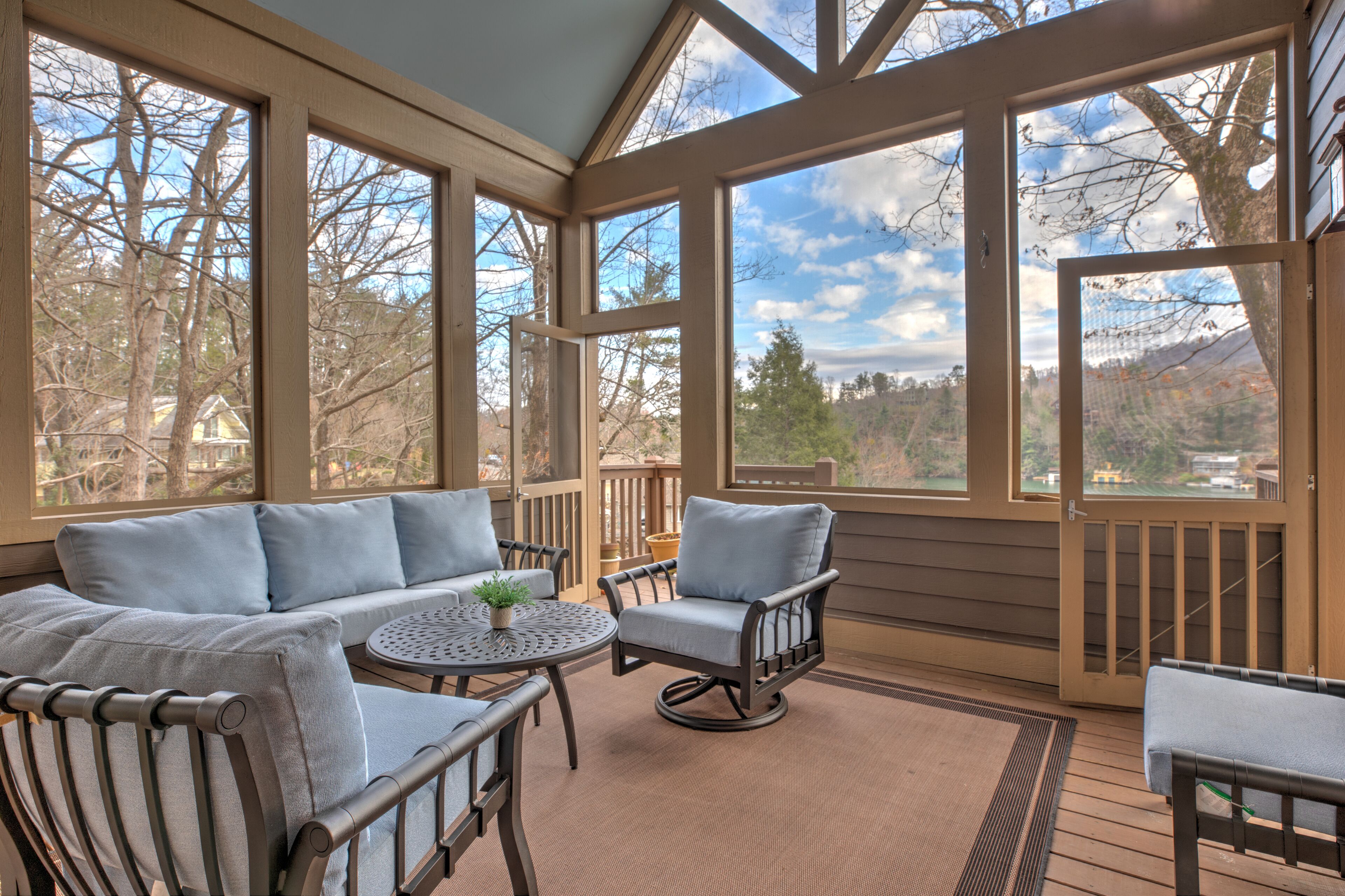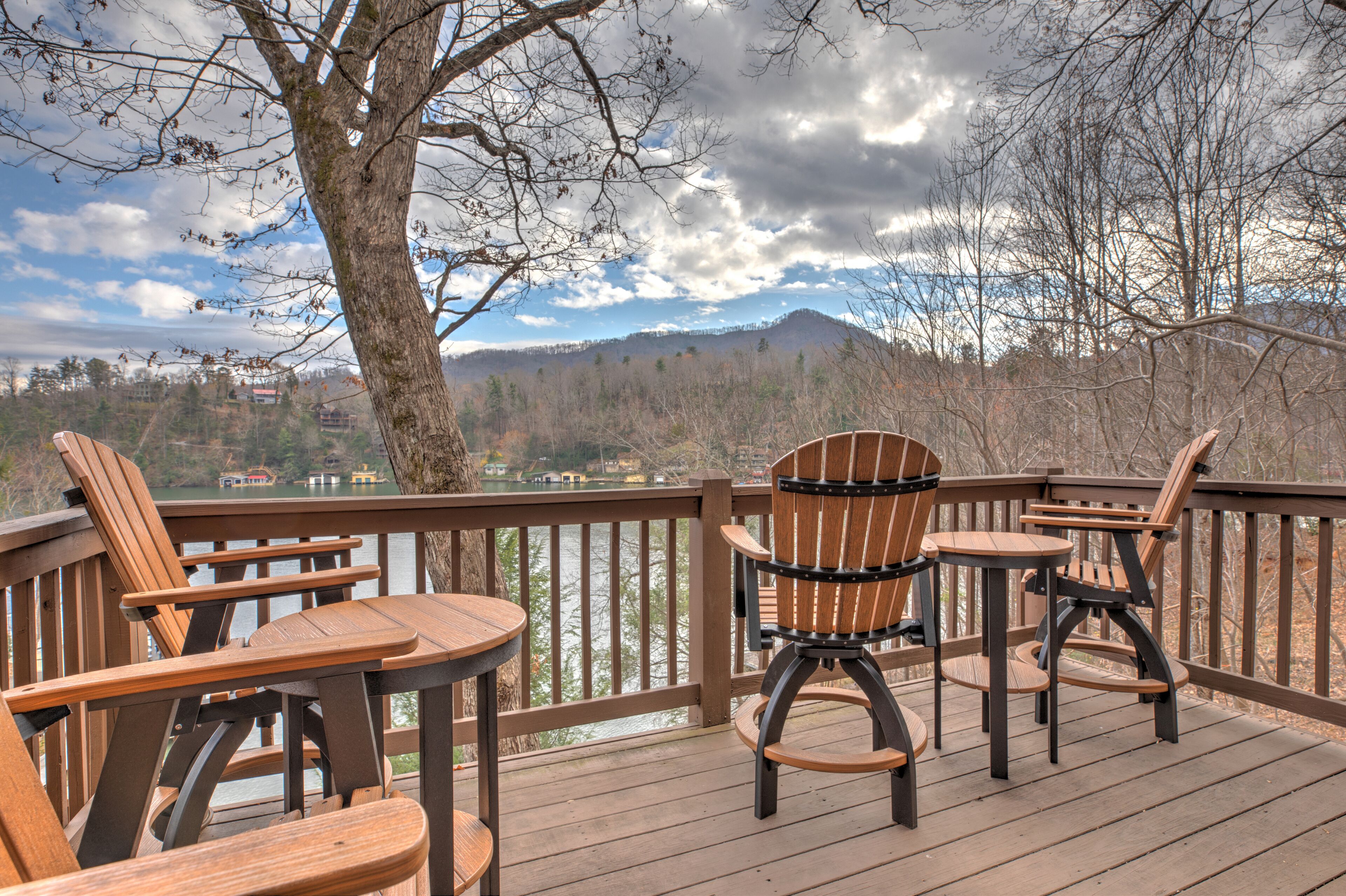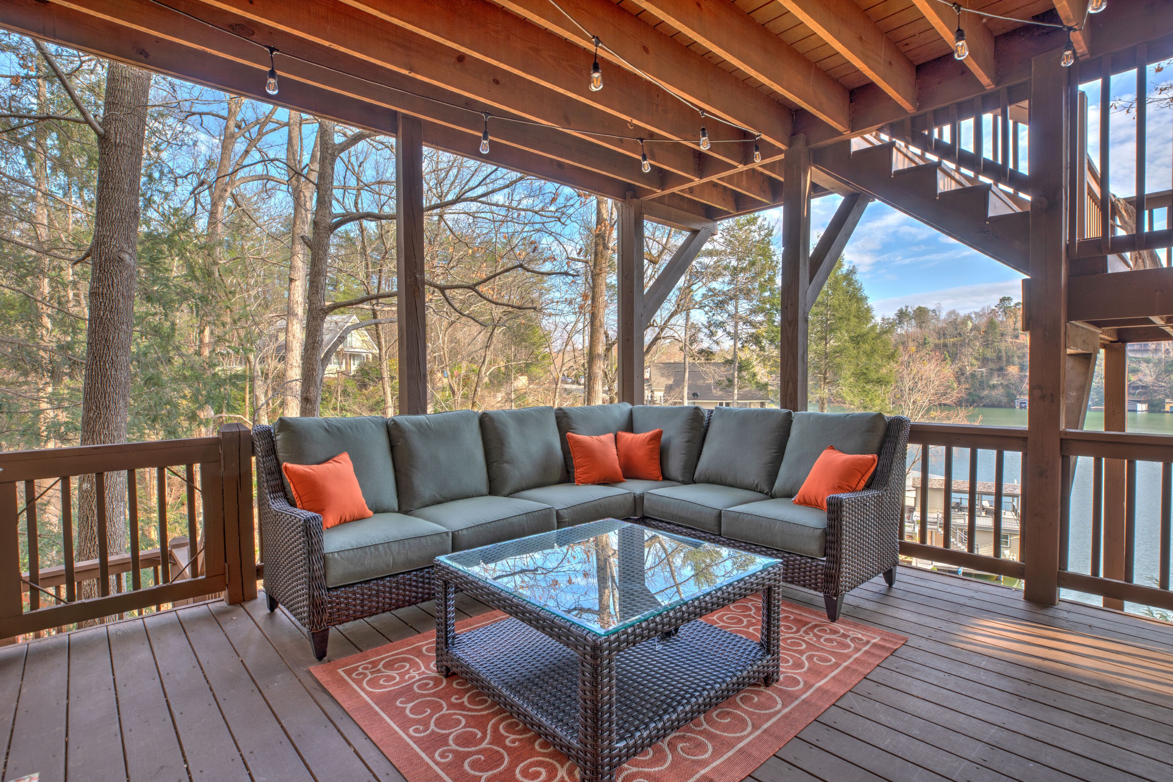 5 Br/3.5 Ba. 3 KING BEDS. LAKE FRONT. FIREPIT. GAME ROOM. MULTIPLE PORCHES. Beautiful LAKEFRONT home. This home boasts a King Suite as well as four spacious gathering decks and room to spread out. Numerous indoor as well as outdoor living areas including a billiard room. Garage has been converted into a rec room with a ping pong table, foosball, giant jinga, and TV. Enormous sun deck atop a 2 stall boathouse. 2 Kayaks and 2 paddle boards (SUP) included with rental. Inquire with owner regarding rental of 20' pontoon. Sonos sound system. 3 king beds, 2 queens, 1 single, 3 roll-away beds, and 2 pack-n-play cribs. Fully stocked kitchen. Weber gas grill and charcoal grill are available for use. Our cove is nestled back from the traffic flow of the main lake allowing a safe space for children to swim away from boat traffic. *NEW in 2022- we have just completed a stone fire pit addition to the side of our home.