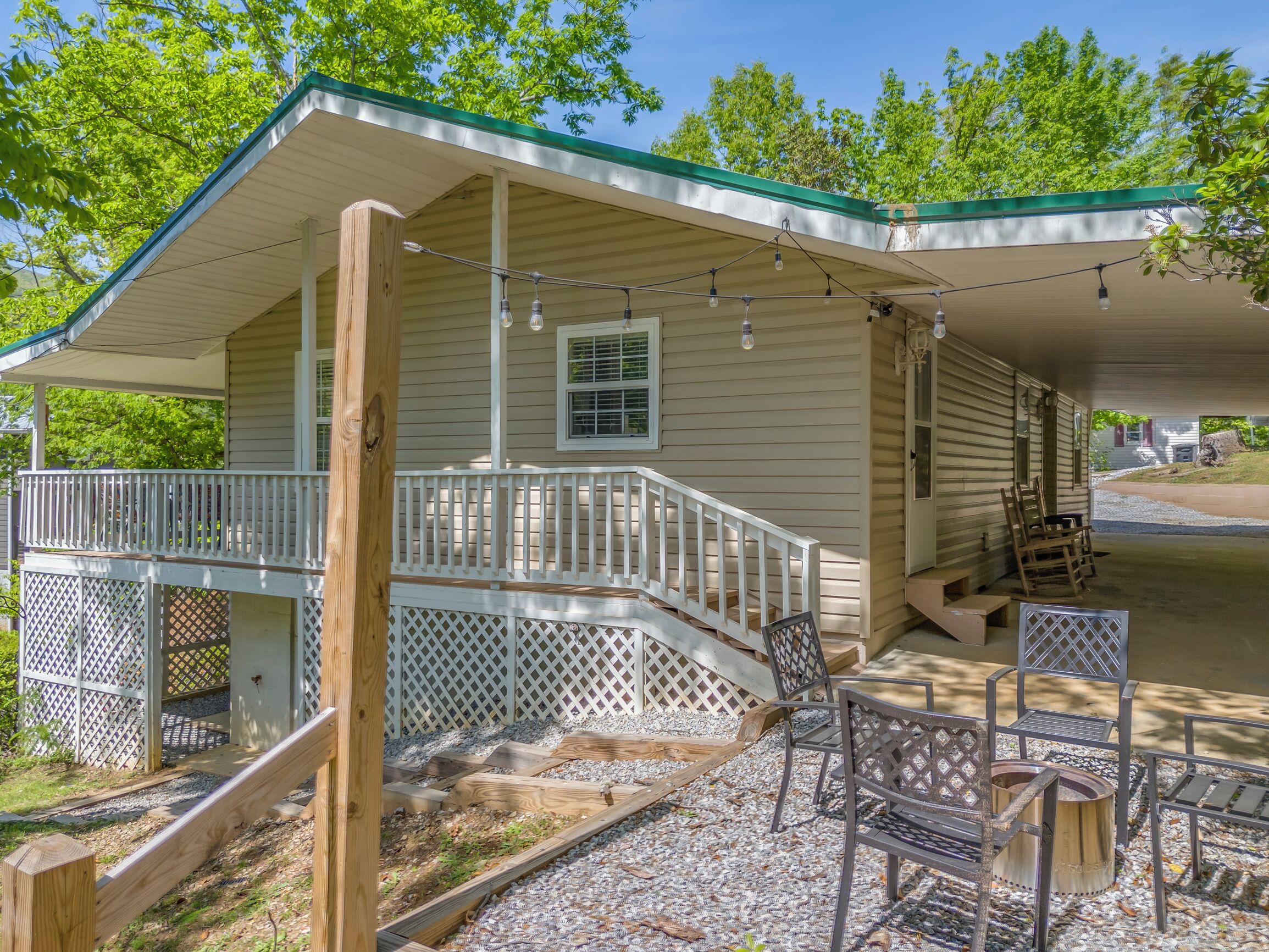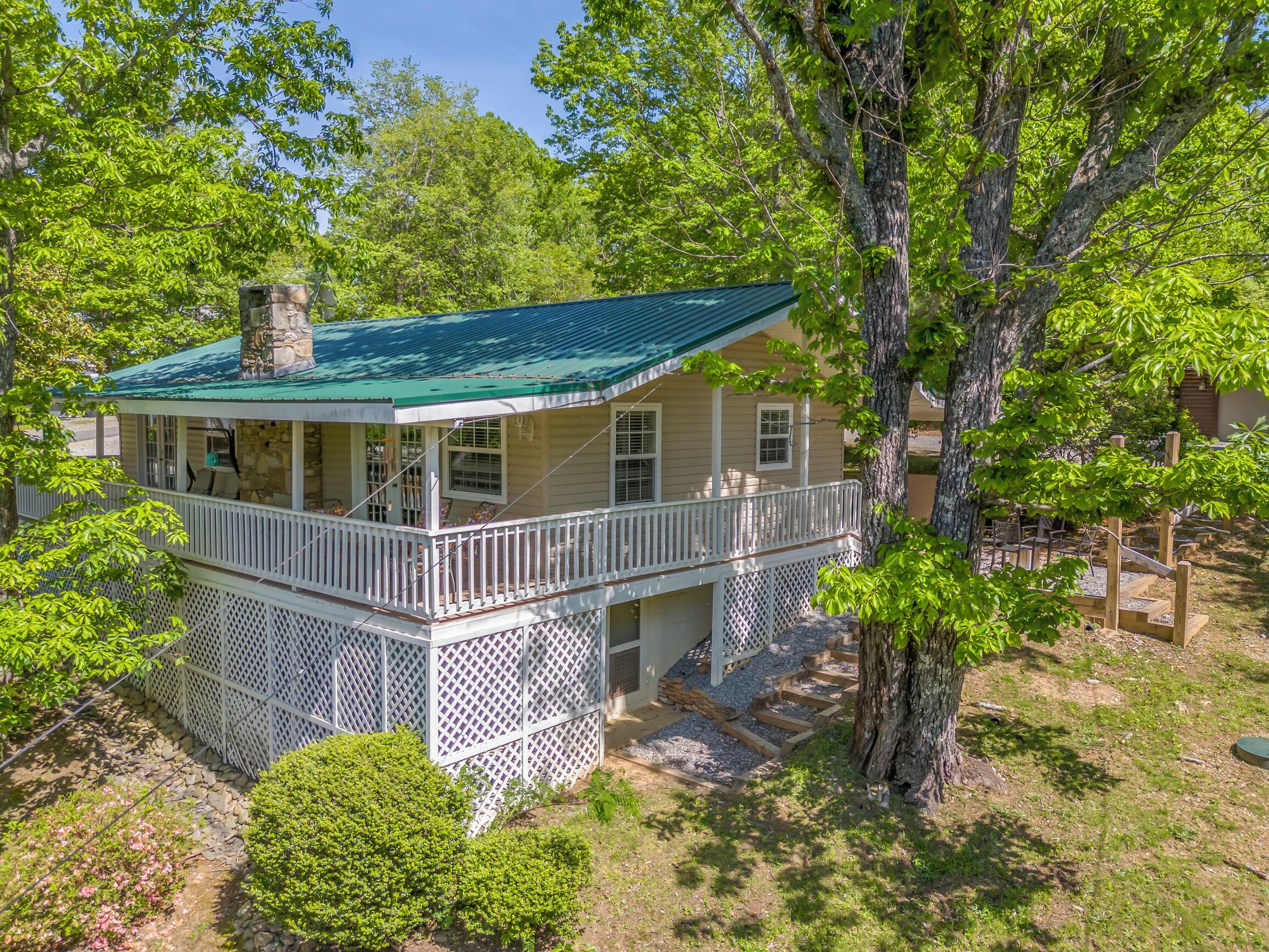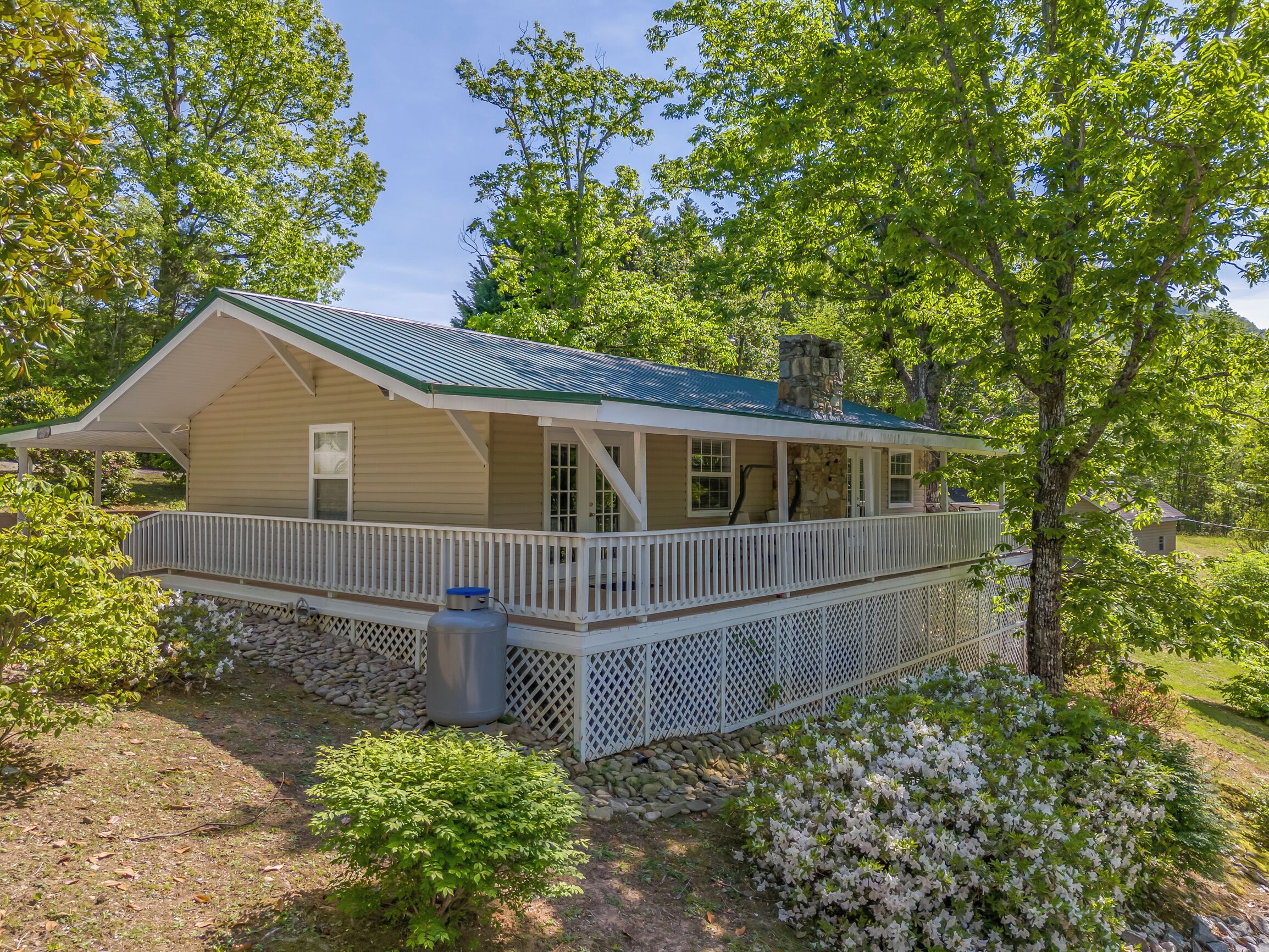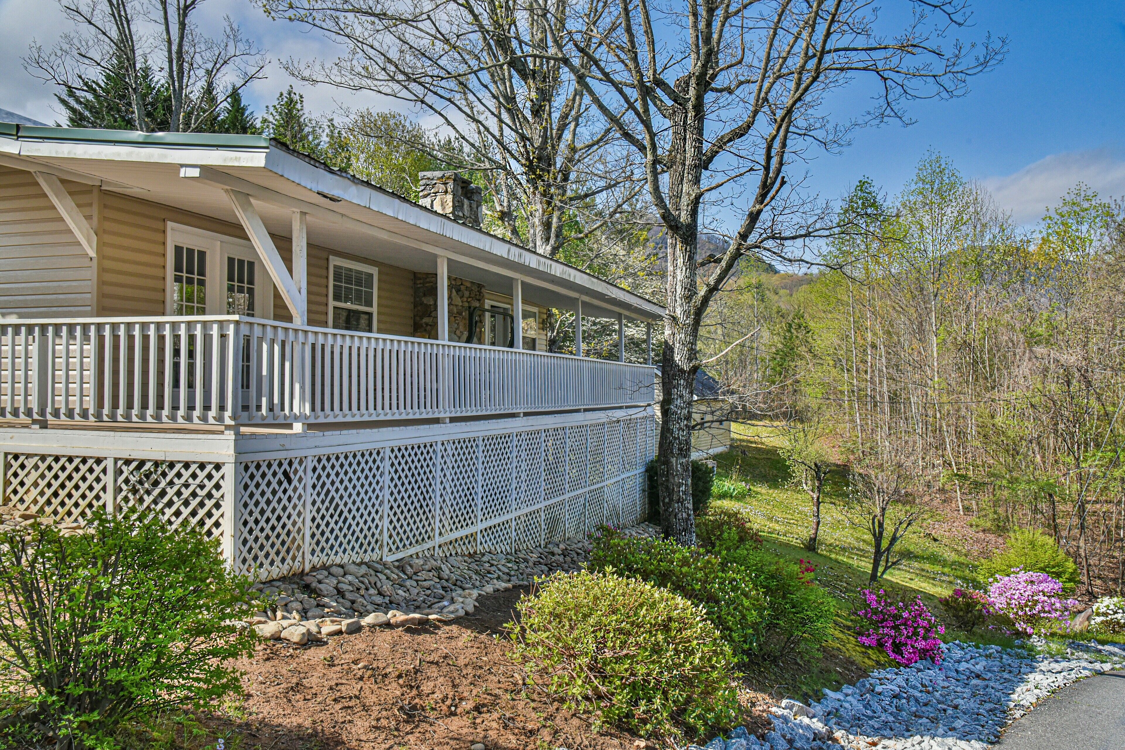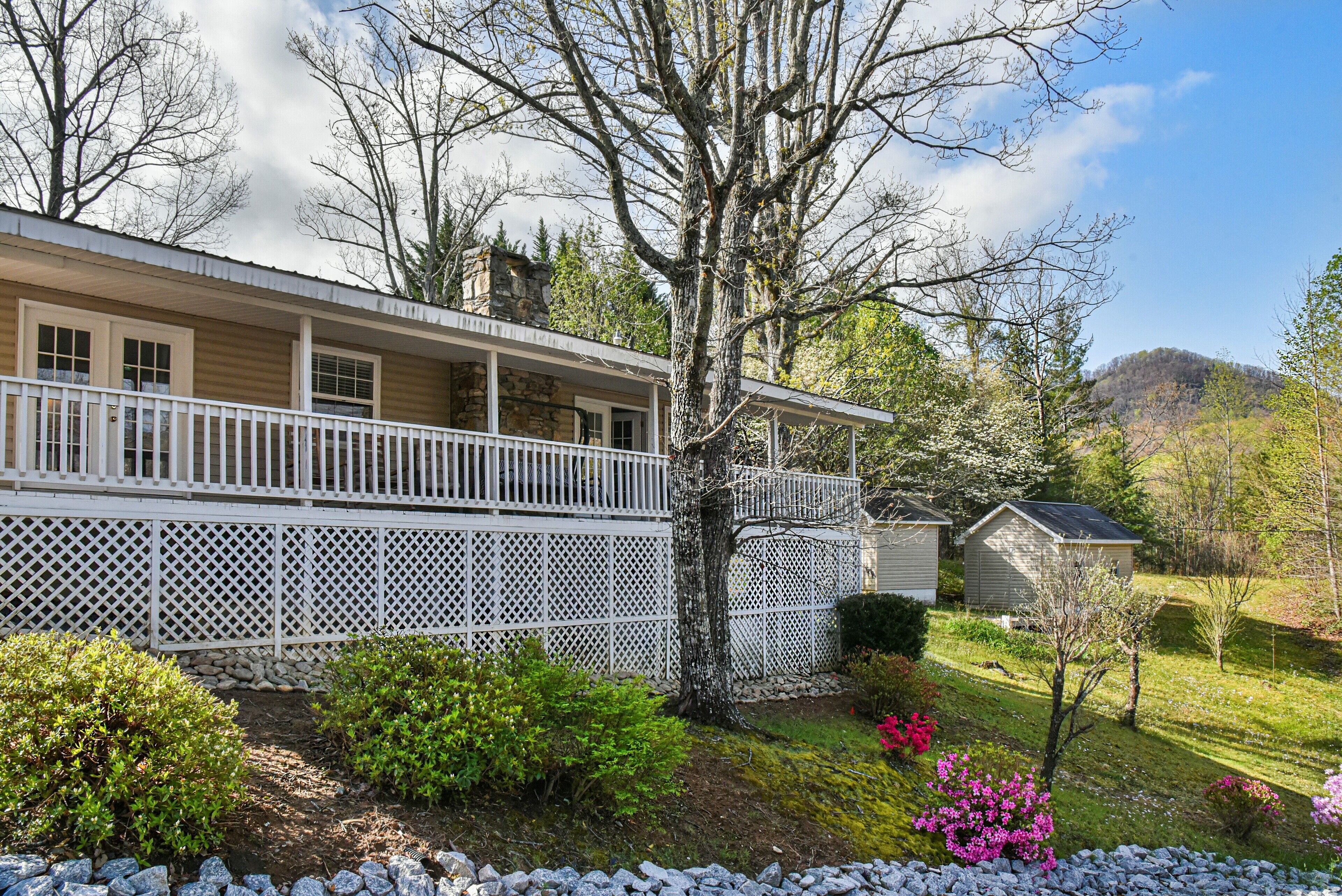 Covered front porch with mountain views close to town. Cozy home with plenty of room in living room for watching tv and enjoying conversation. Covered deck with lots of seating and beautiful mountain views. Lake views are available in fall and spring . Fire pit area in back with comfortable chairs. Also gas grill, charcoal grill, and picnic table in back yard. Covered parking for motorcycles. Also, please check out listing #2781478 Sherwood Cottage for extended family to book. 2 bedroom/2 bath just a few steps away (additional rent required to book second home).