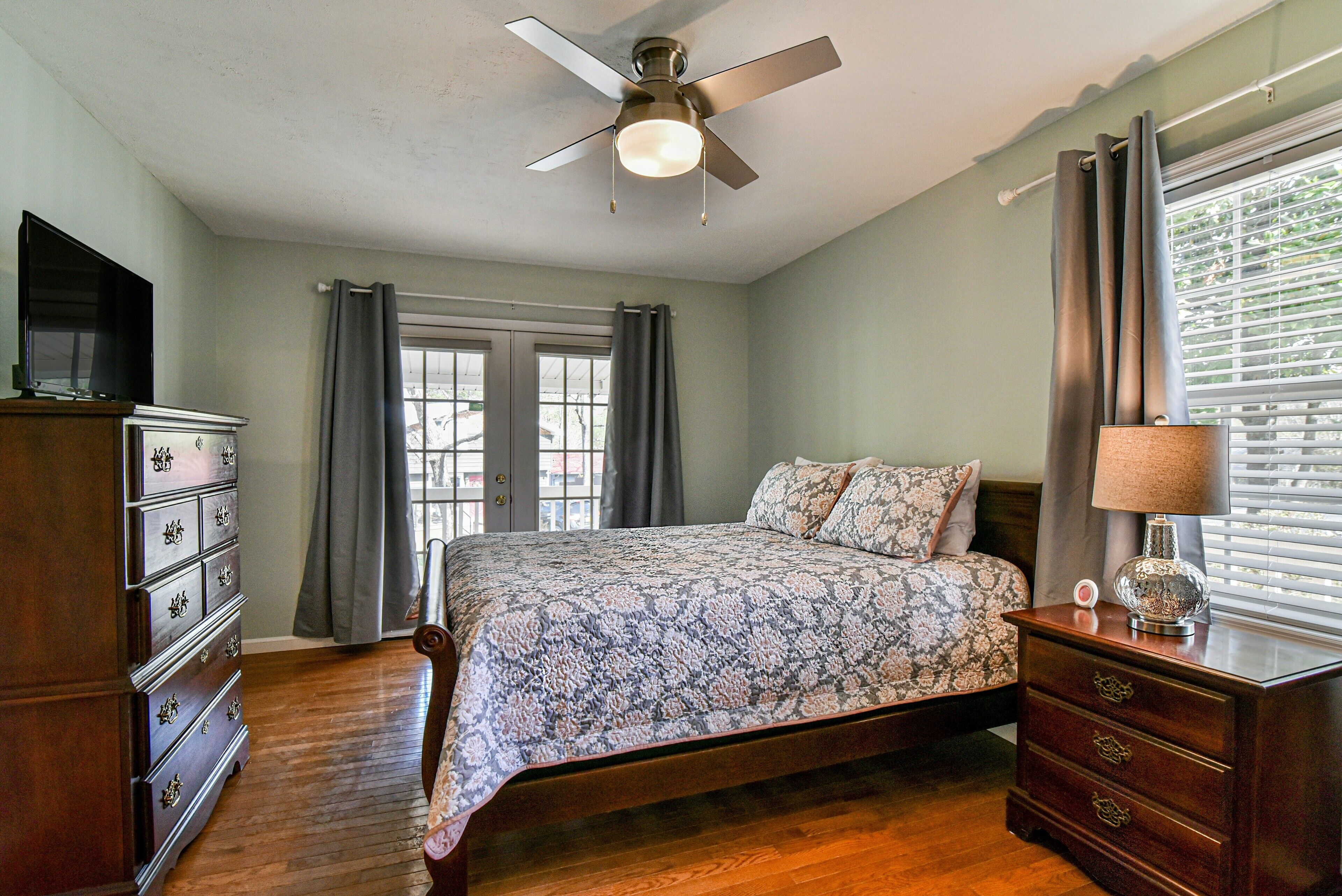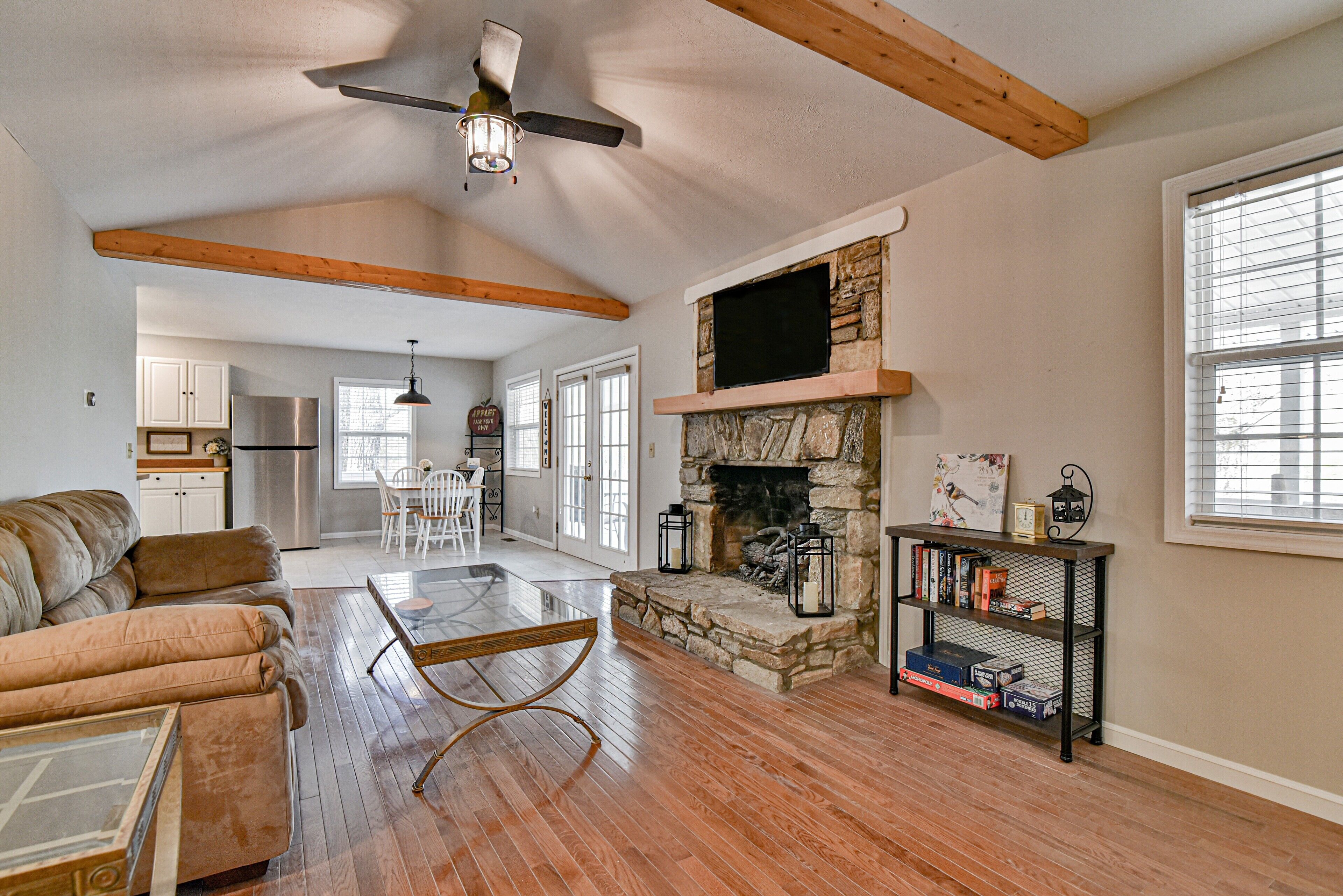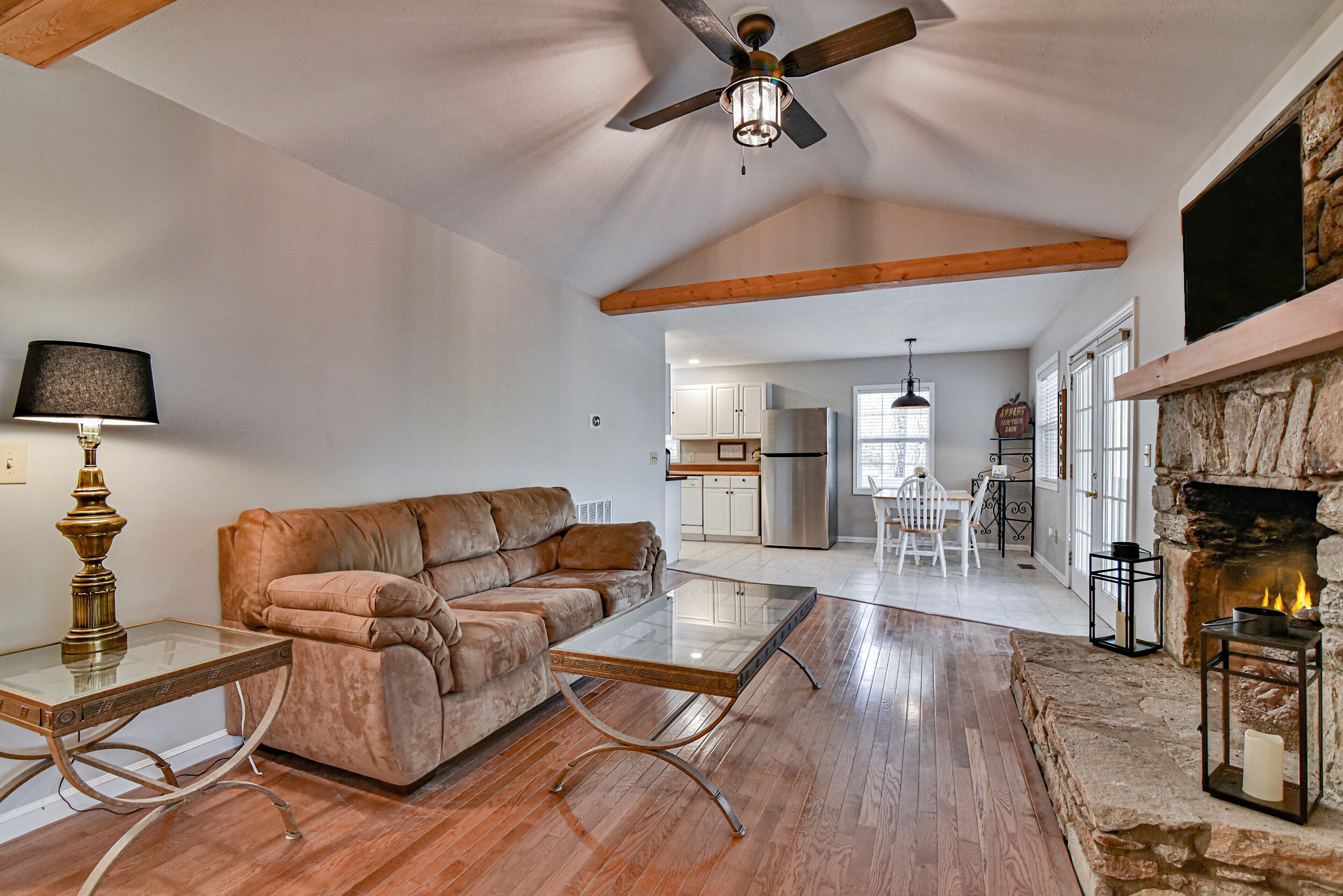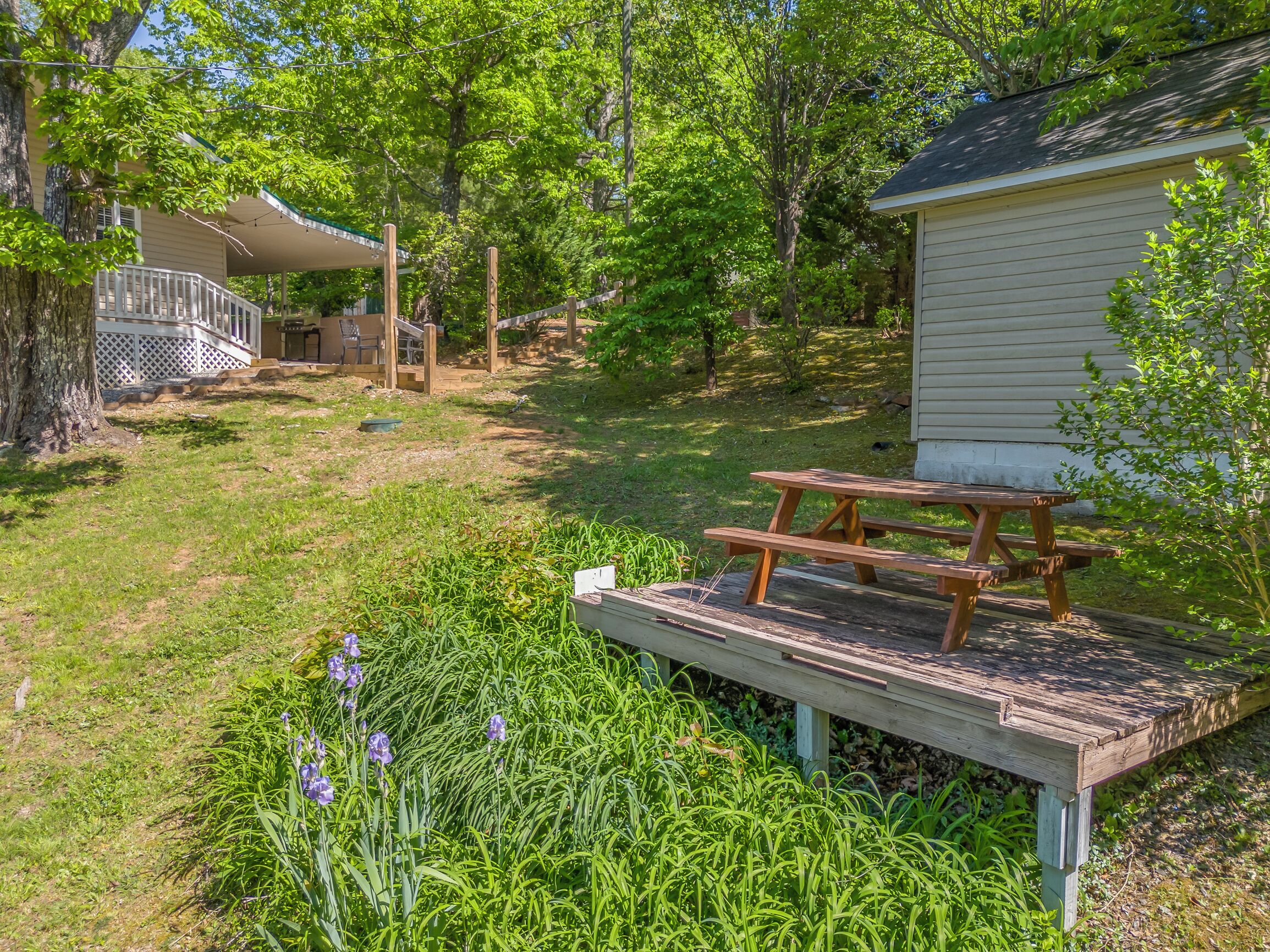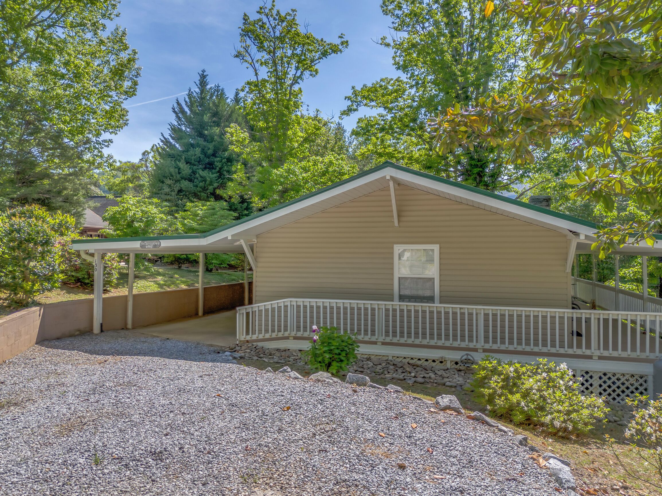 Covered front porch with mountain views close to town. Cozy home with plenty of room in living room for watching tv and enjoying conversation. Covered deck with lots of seating and beautiful mountain views. Lake views are available in fall and spring . Fire pit area in back with comfortable chairs. Also gas grill, charcoal grill, and picnic table in back yard. Covered parking for motorcycles. Also, please check out listing #2781478 Sherwood Cottage for extended family to book. 2 bedroom/2 bath just a few steps away (additional rent required to book second home).
