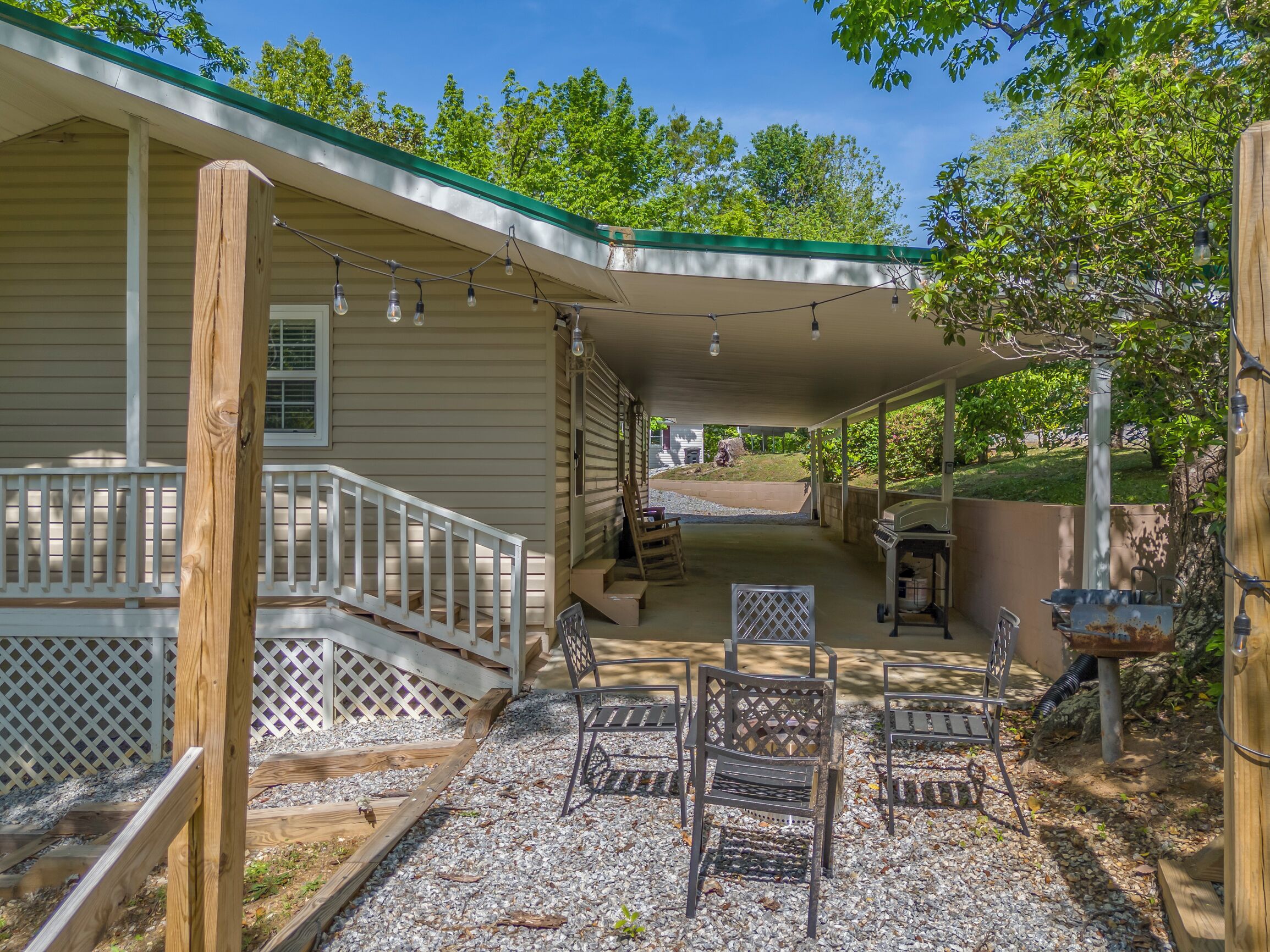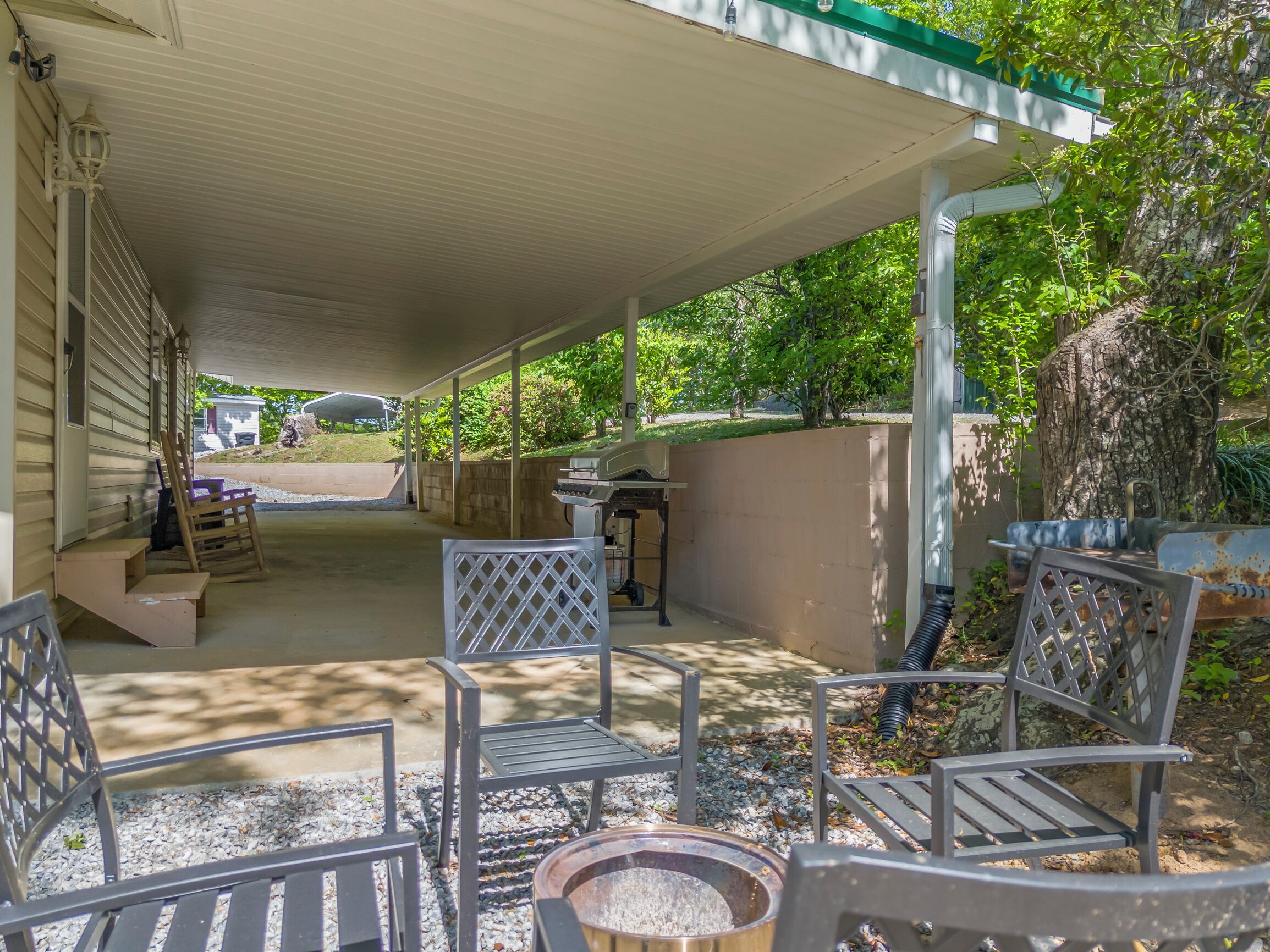 Covered front porch with mountain views close to town. Cozy home with plenty of room in living room for watching tv and enjoying conversation. Covered deck with lots of seating and beautiful mountain views. Lake views are available in fall and spring . Fire pit area in back with comfortable chairs. Also gas grill, charcoal grill, and picnic table in back yard. Covered parking for motorcycles. Als...