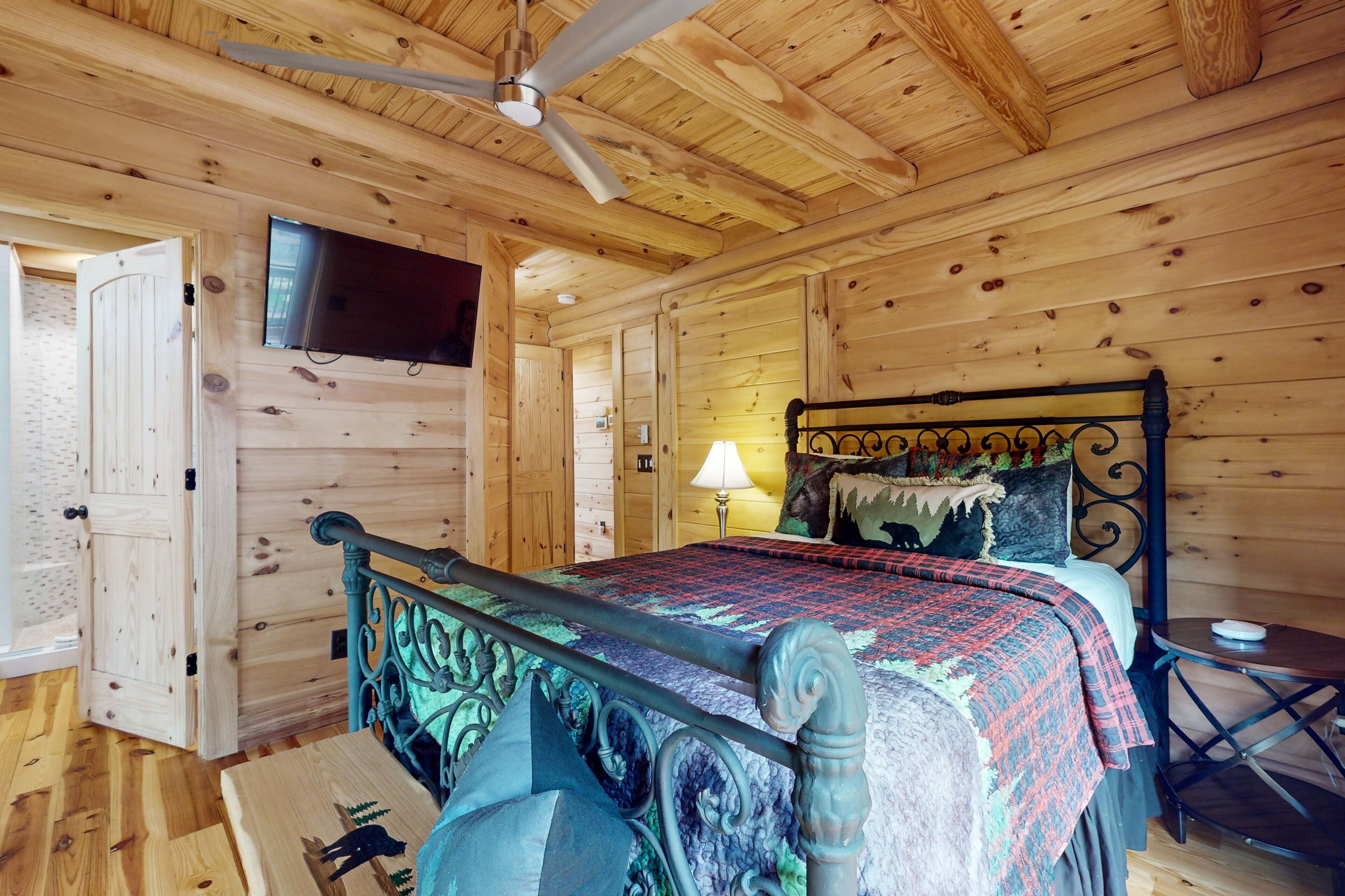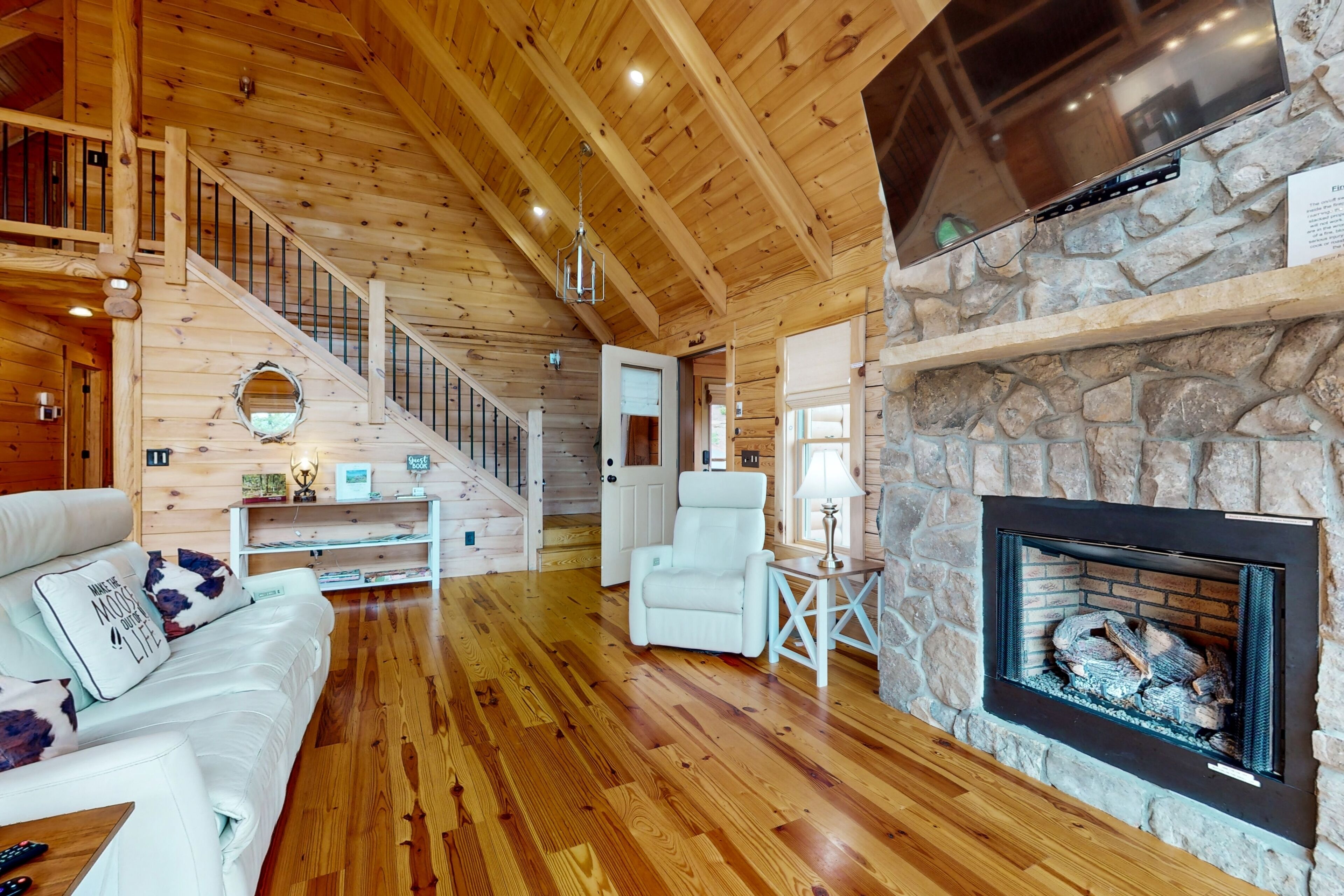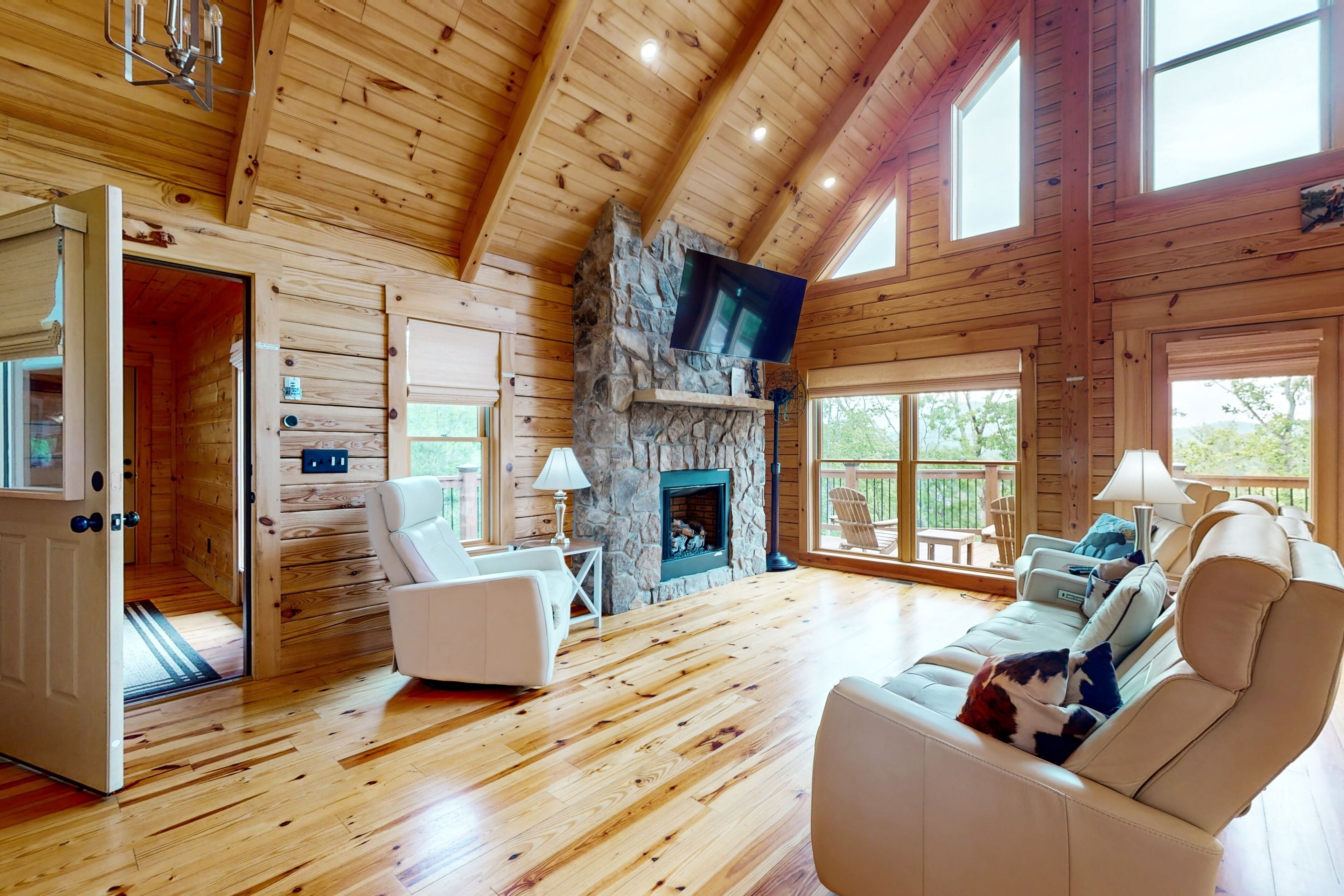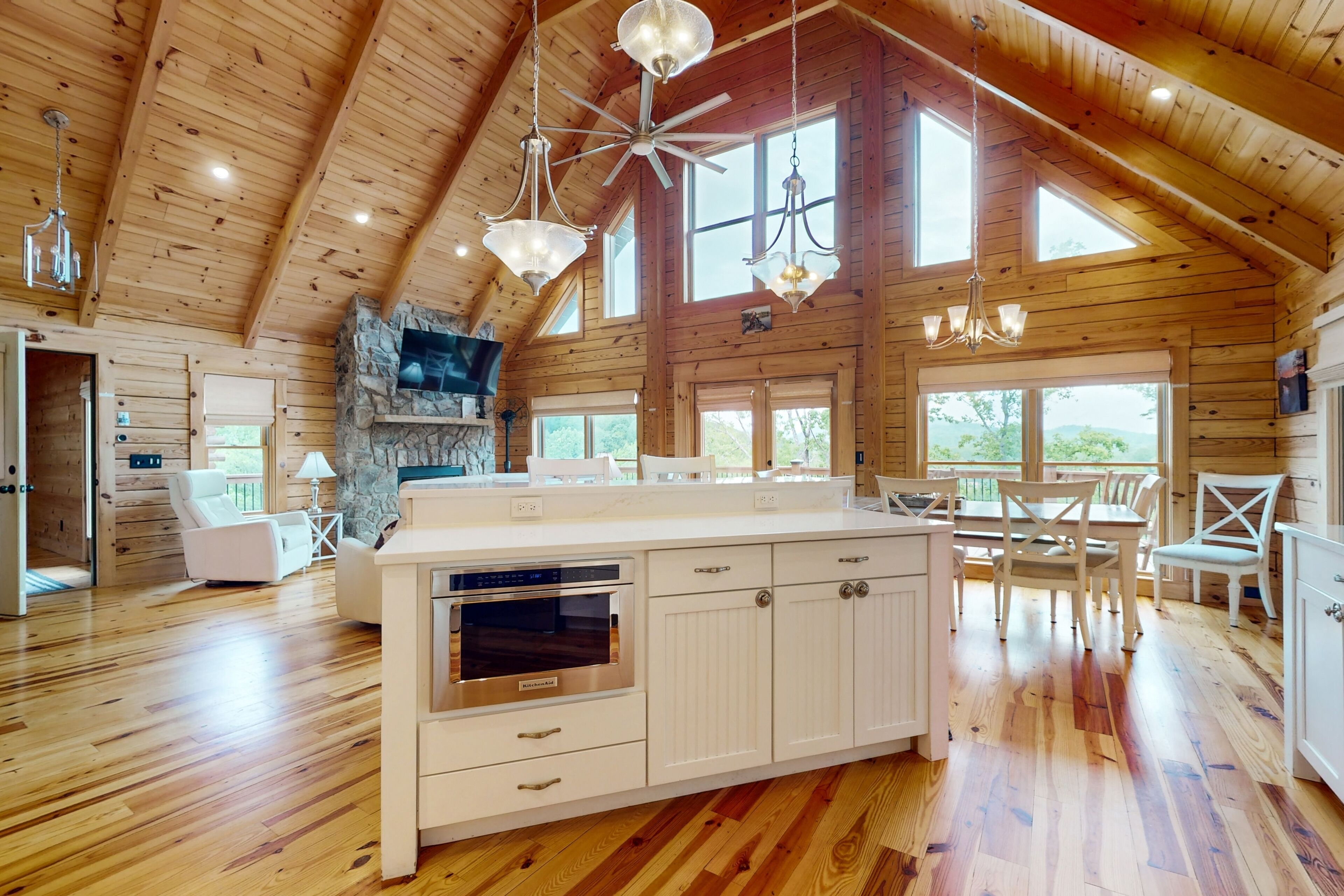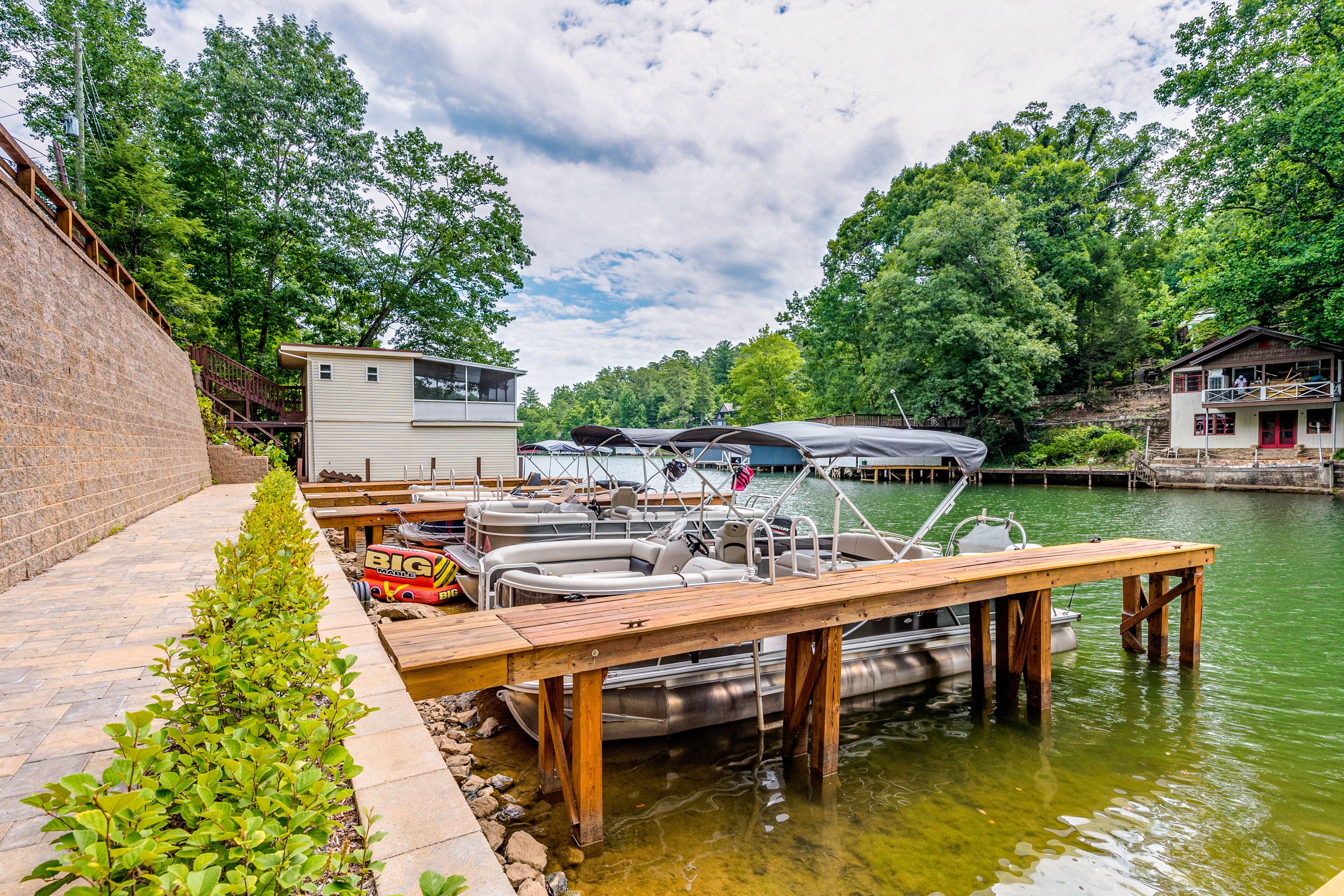 Lodge overlooking Lake Lure with hot tub, amazing deck, balcony, fast WiFi, & AC The Bentley At Lake LureOur calendar is updated in real-time & our nightly rates are accurately displayed. Simply enter your desired dates and click 'Book Now!'Offering a commanding view of Lake Lure from its expansive, wrap-around deck, this five-bedroom home is a place to experience the beauty of North Carolina - from spaces both inside and out.This log home sits on a hillside just above the lake's southwestern shores, with grounds that provide lovely views of the water and the neighboring ridgelines and treetops. It's a scene you can take in from the private hot tub and the shaded lounge and picnic areas on the garden-level patio, as you grill or relax in a rocking chair on the main floor's wrap-around deck, or as you build a fire in the stone firepit encircled by Adirondack chairs.The air-conditioned interior is a study in comfort and recreation, with natural wood details throughout and generous windows that frame the lake. The great room is a place to watch movies in the warmth of the gas fireplace, play board games around the dining room table, and lend a hand in the open kitchen with its full suite of stainless steel appliances (including a French-door refrigerator and a dishwasher). After-dinner fun awaits in the game room downstairs, which is home to a second gas fireplace, another TV, theater-style recliners, foosball and pool tables, and arcade consoles.When it's time to turn in, you'll have five bedrooms to choose from, each with cabin-like wood walls and its own TV. Additional amenities include two washer/dryers and free high-speed WiFi for your convenience. An additional perk, this home is decorated for Christmas from November 30th through January 3rd if you choose to book it for your family winter getaway.Please note that this home is listed as Handicapped Accessible, but not ADA compliant. We are happy to provide more details for those who may need more information about access.House RulesCheck-in time: 4:00 PM.Check-out time: 10:00 AM.All guests shall abide by Vacasa’s good neighbor policy and shall not engage in illegal activity. Quiet hours are from 10:00 PM to 8:00 AM.No smoking is permitted anywhere on the premises.An EV charging station is available nearby at the Lake Lure Washburn Marina.There are two washers/dryers (one set on the main floor and one set in the basement).This property is managed by Vacasa North Carolina, LLC.Parking notes: There is free parking available for 6 vehicles.Security camera details: Ring doorbell cameraDock details: Sunset Reserve Marina Dock #1Due to local laws or HOA requirements, guests must be at least 25 years of age to book. Guests under 25 must be accompanied by a parent or legal guardian for the duration of the reservation.
