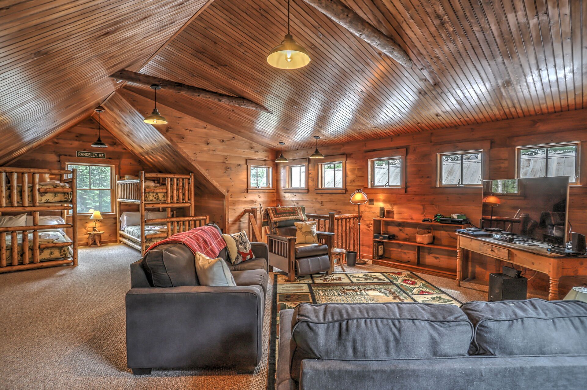 Breakwater Lodge - Gorgeous home on the Eastern Shore of Mooselookmeguntic Lake It just doesn't get better than this. "Breakwater Lodge" is a beautifully handcrafted 4-season log cabin completely renovated with addition in 2018. It sits idyllically on the eastern shore of Mooselookmeguntic Lake, the fourth largest lake in Maine, with spectacular sunsets and views of Mt. Washington in the distance. A large dock climbs up and over the breakwater and is made for jumping in the lake. The three-season porch is perfect for reading and listening to the call of the loons. A majestic stone fireplace calls for cozy fires to end the day. This home comfortably sleeps 10 in 3 bedrooms and 2 lofts and has 3 full baths. It is located a short 15-minute drive to the town of Rangeley. (Sorry, no pets.)House was featured in "Maine Home and Design" Fall 2019.Fully equipped kitchen Standard coffee makerCoffee grinderKeurig coffee makerTea kettleLobster potMicrowaveToasterBlenderWiFiSatellite TVFireplaceFire extinguisherSmoke and Carbon Monoxide detectorsFansGamesWasher and DryerBedroom 1 - Queen bedBedroom 2 - Queen bedBedroom 3 - Queen bedBedroom 4 - LOFT - 2 TwinsBedroom 5 - 2nd LOFT - bunkset - Twin over DoubleIron/ironing board3 Full bathroomsLarge Fire pitGas Grill - Available mid-May through mid-October500 Feet of private water frontage3 Season PorchDock (Does not get put in until Early June)MooringWalk-in areaOutdoor furniture5 Kayaks2 CanoesSecurity Camera OutsideNo pets allowed at any time at this property*Maximum Occupancy - 10*All properties have a three night minimum stay requirement (Spring and Fall)*Summer vacation rentals are weekly only, Sunday to Sunday*NO SMOKING*Morton & Furbish Vacation Rental Promise:We are here for you: Book with confidence knowing that the rates, images and details published on this property are up to date and accurate. We are located on Main Street in Rangeley, Maine, and are set up to offer services and answer questions at any time during your stay. Please don't hesitate to reach out before or during your stay with questions or concerns.Clean & Safe Rental Properties: Keeping our vacation homes sparkling clean is a top priority for us here at Morton & Furbish Vacation Rentals. All properties are cleaned, sanitized & disinfected before guests check-in with products proven to eliminate viruses & bacteria. All linens are laundered at an offsite facility and new linens and towels are brought in for every guest's stay. The entirety of our housekeeping processes meet and exceed all CDC cleaning guidelines. If you have any questions/concerns, please reach out to our office for more information.For your convenience: Our housekeepers will leave a check in packet with area information for you at the property. Also included at the rental are paper products, trash bags, dish soap and hand soap. Guests are asked to bring their own toiletries for their stay.