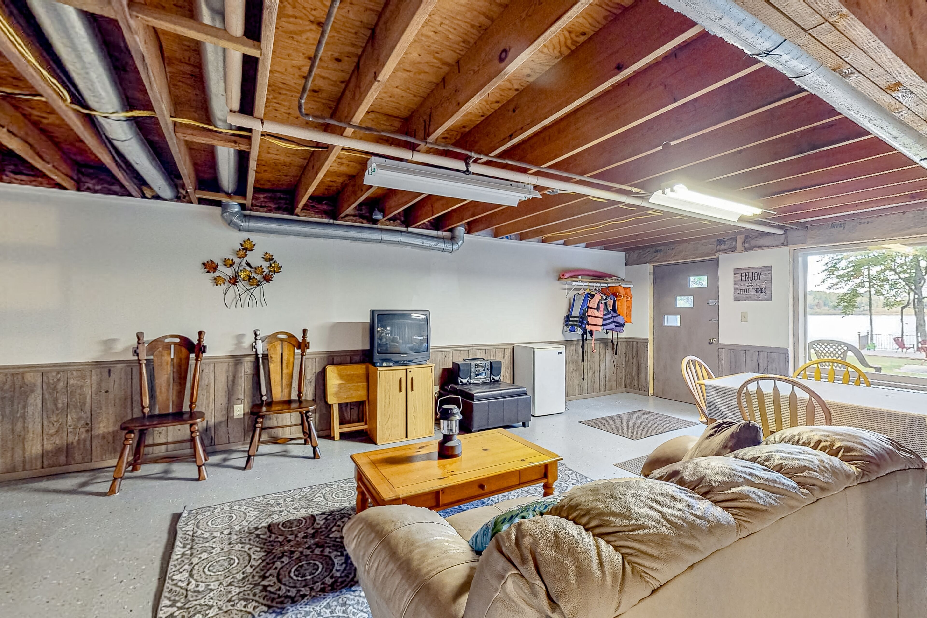 Dog-friendly lakefront home with a private beach, dock, firepit, & kayaks